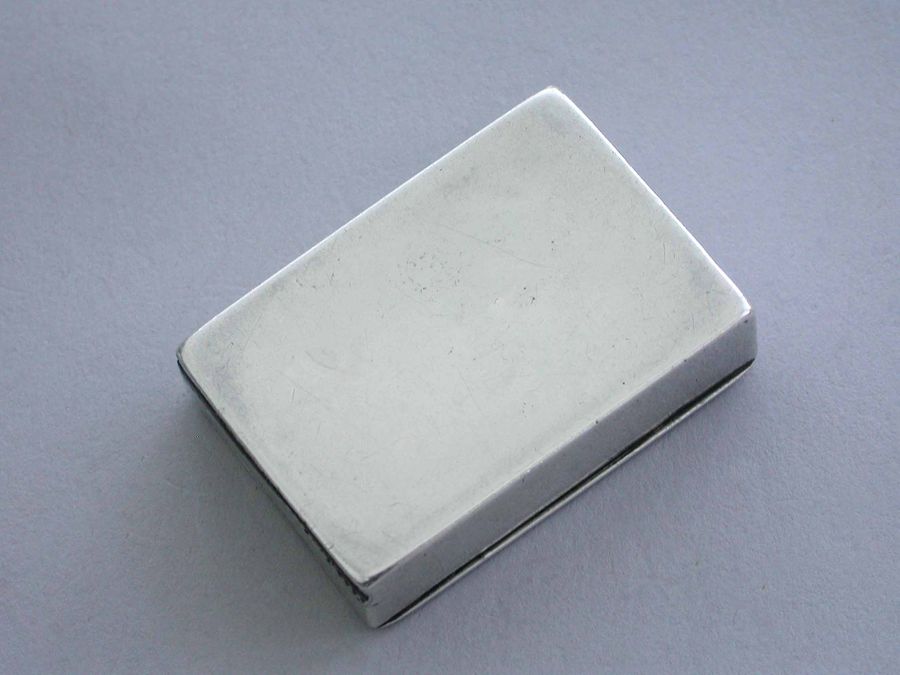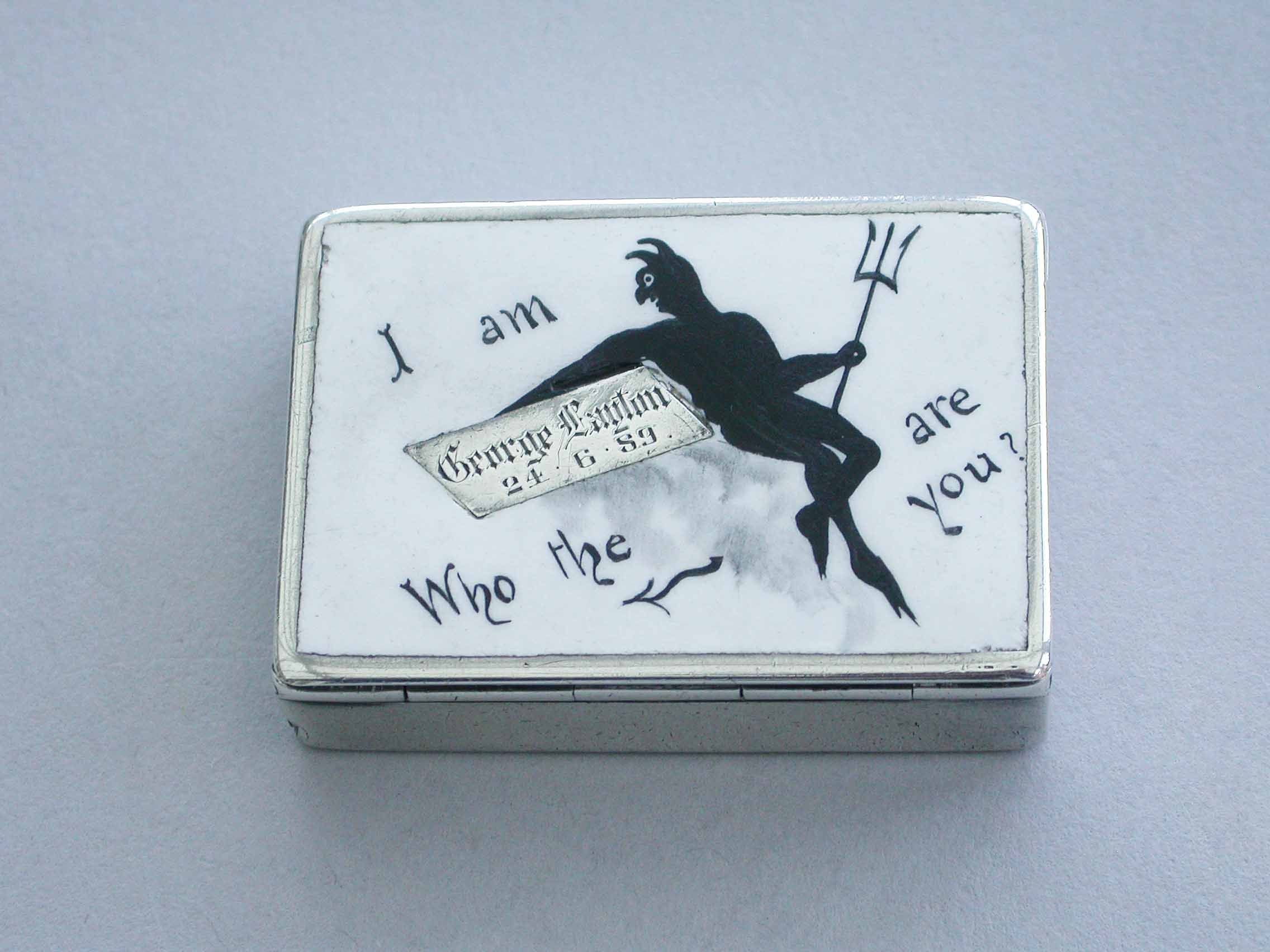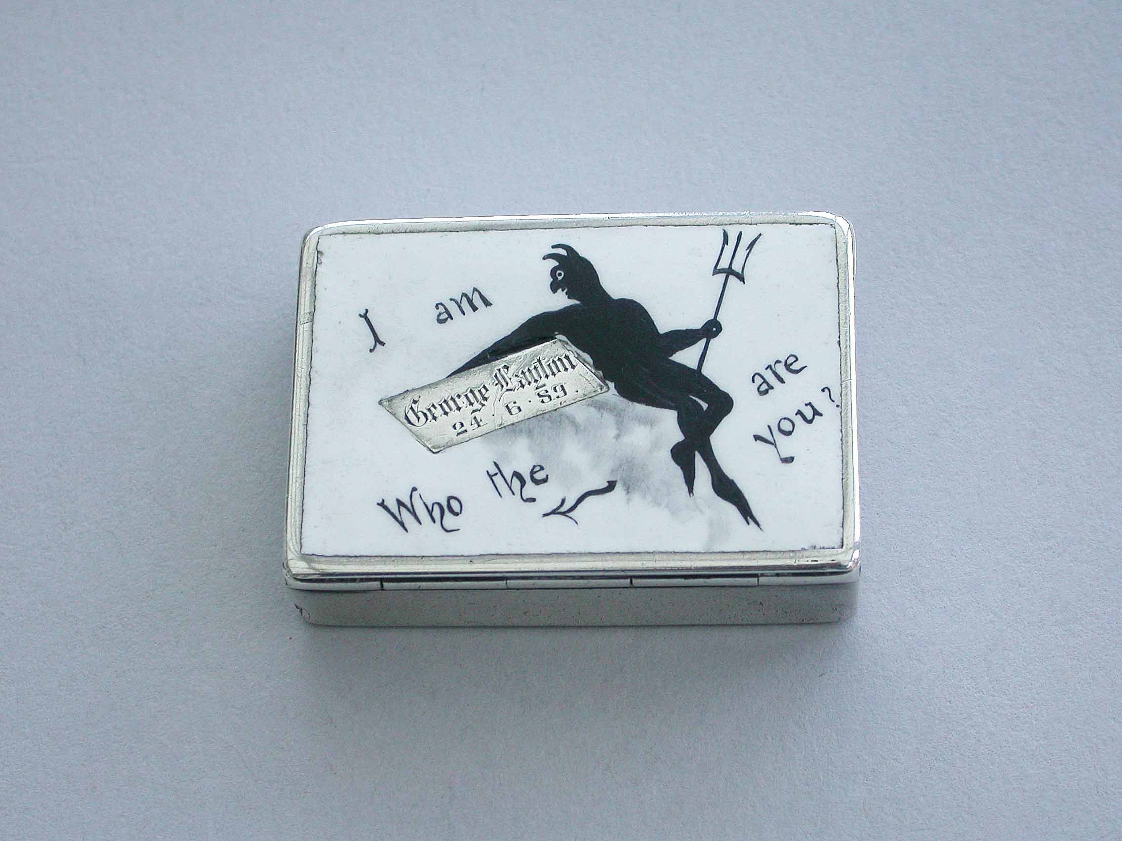 A Victorian silver Vesta Case of plain rectangular form, the hinged lid enamelled with an image of a black devil holding a trident and with the legend; "I am George Linton 24.6.89 Who the devil are you".