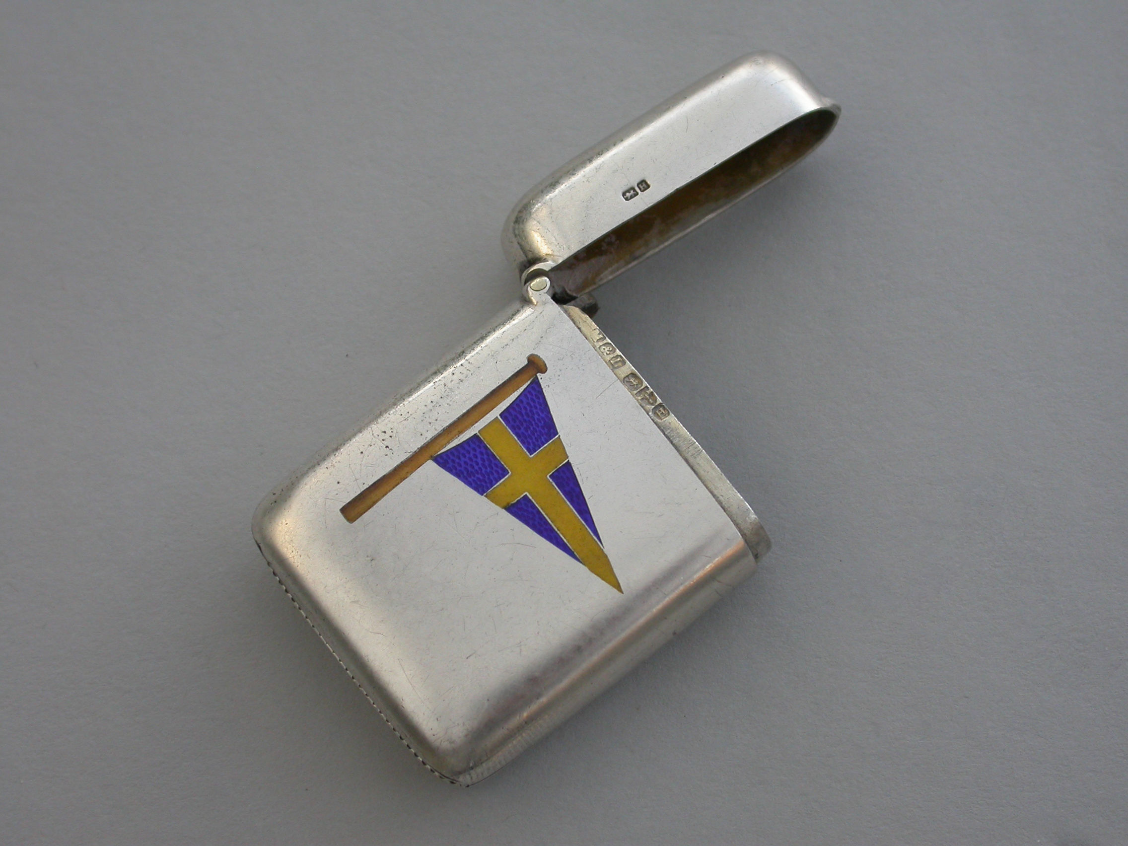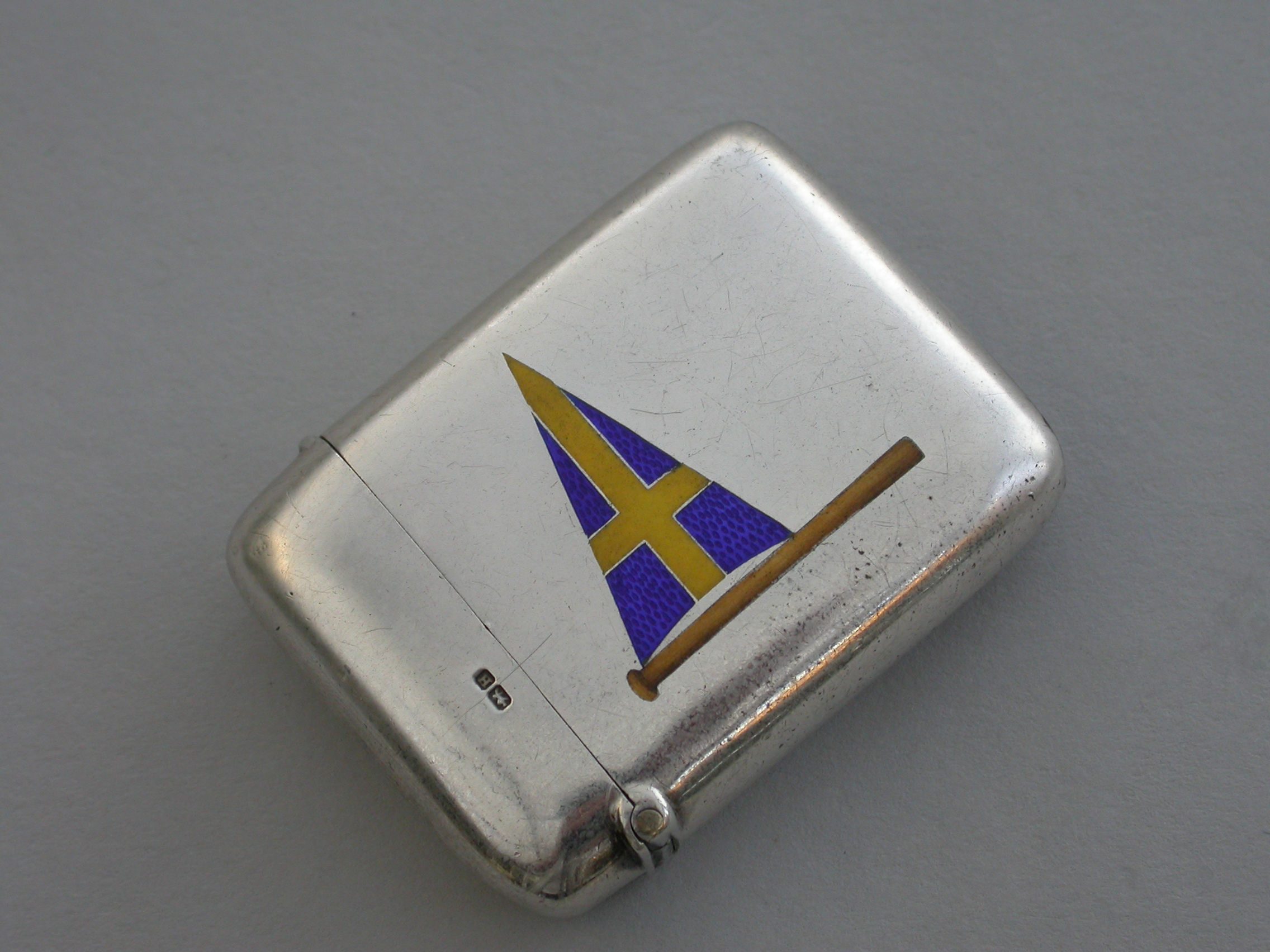 A good Victorian silver and enamel Vesta Case of rounded rectangular form with hinged flip top lid, the face enamelled with the Burgee of the Yare Sailing Club in Norfolk.