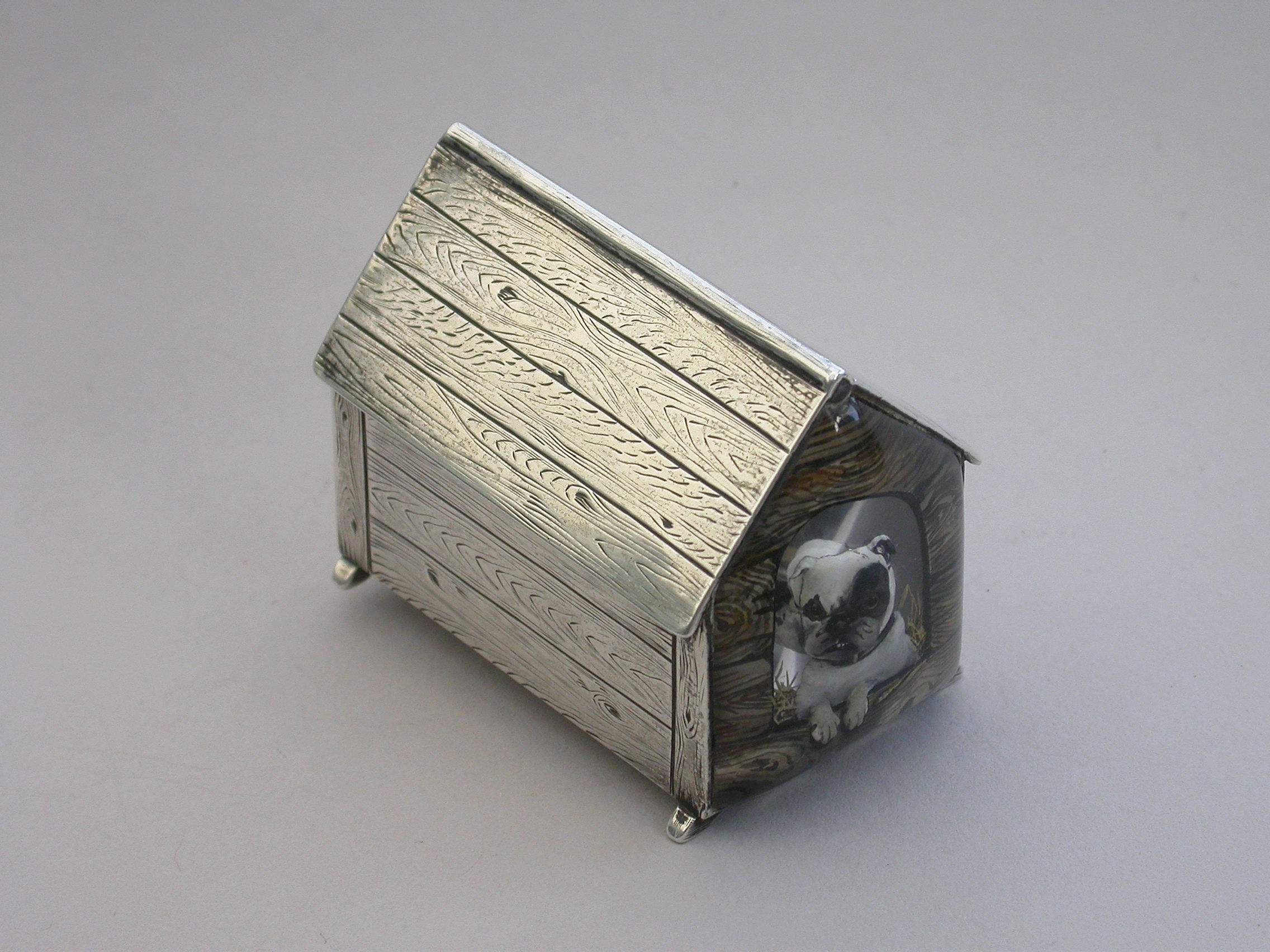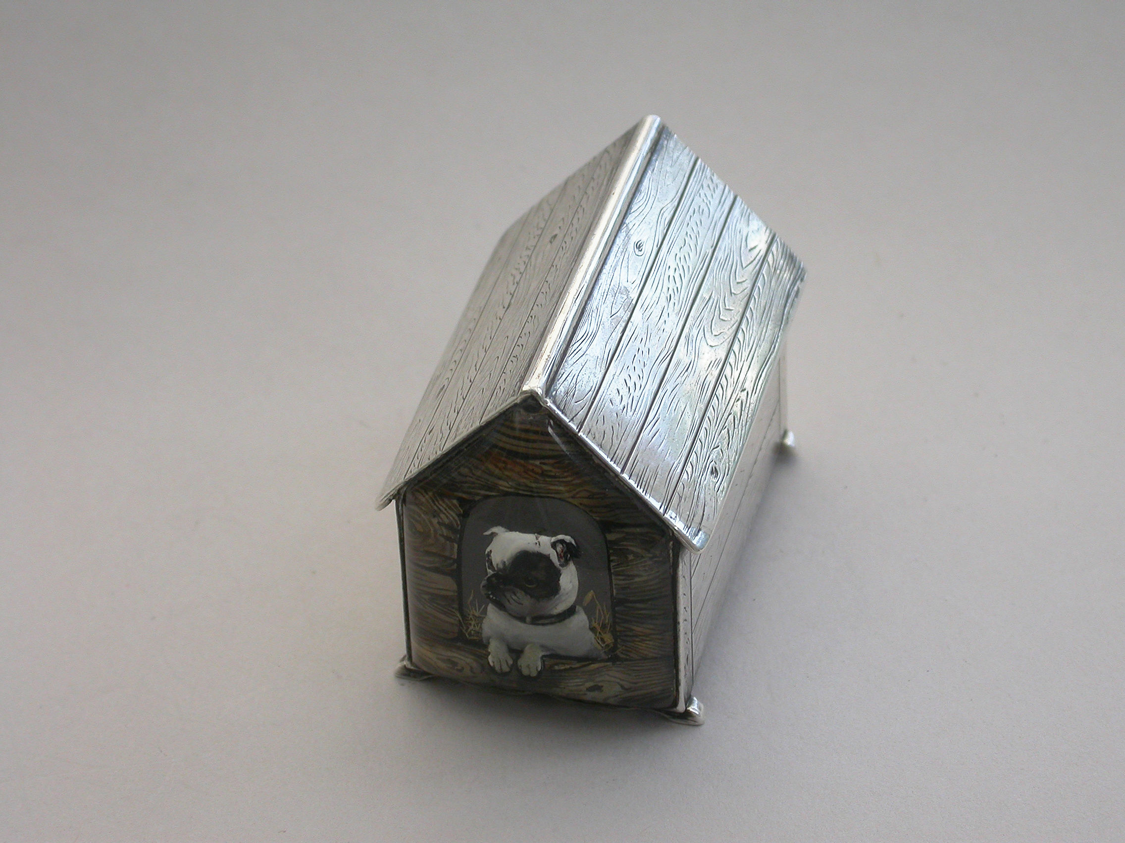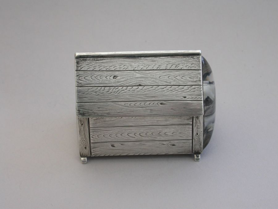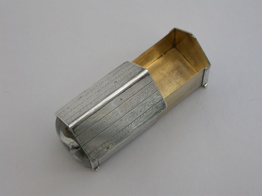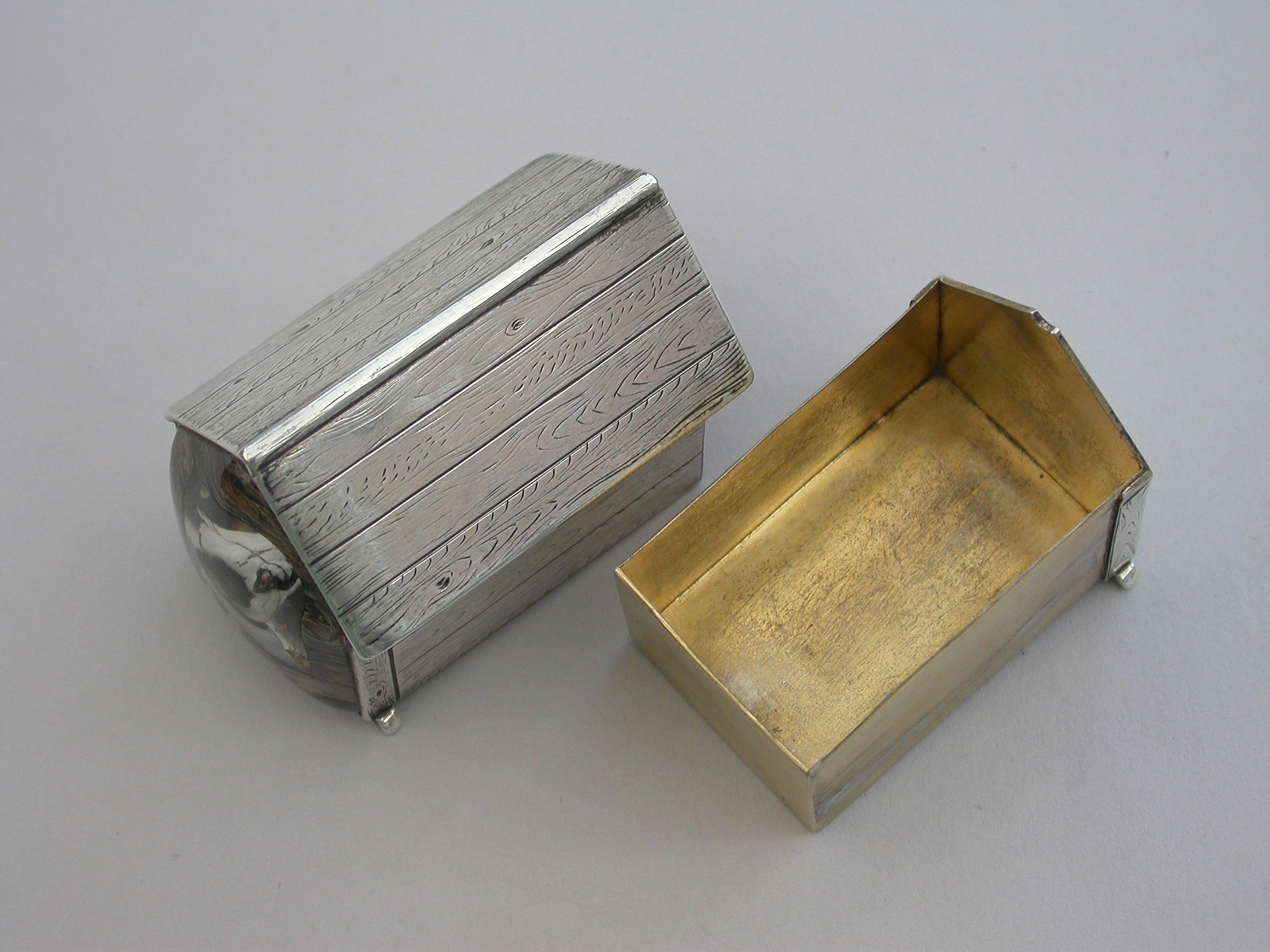 A very fine Victorian novelty silver and Essex rock crystal Vesta Case/Box, modelled as a slatted wooden kennel, the front with an applied Essex rock crystal panel depicting a bull dog, the back drawer with silver gilt interior and striking panel to one side.