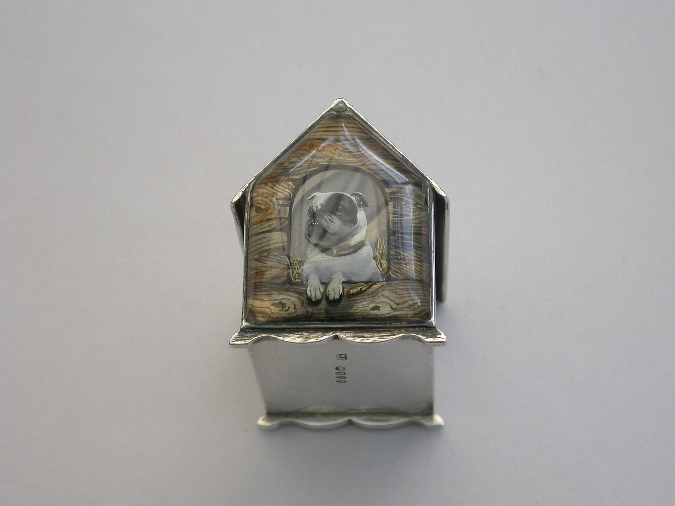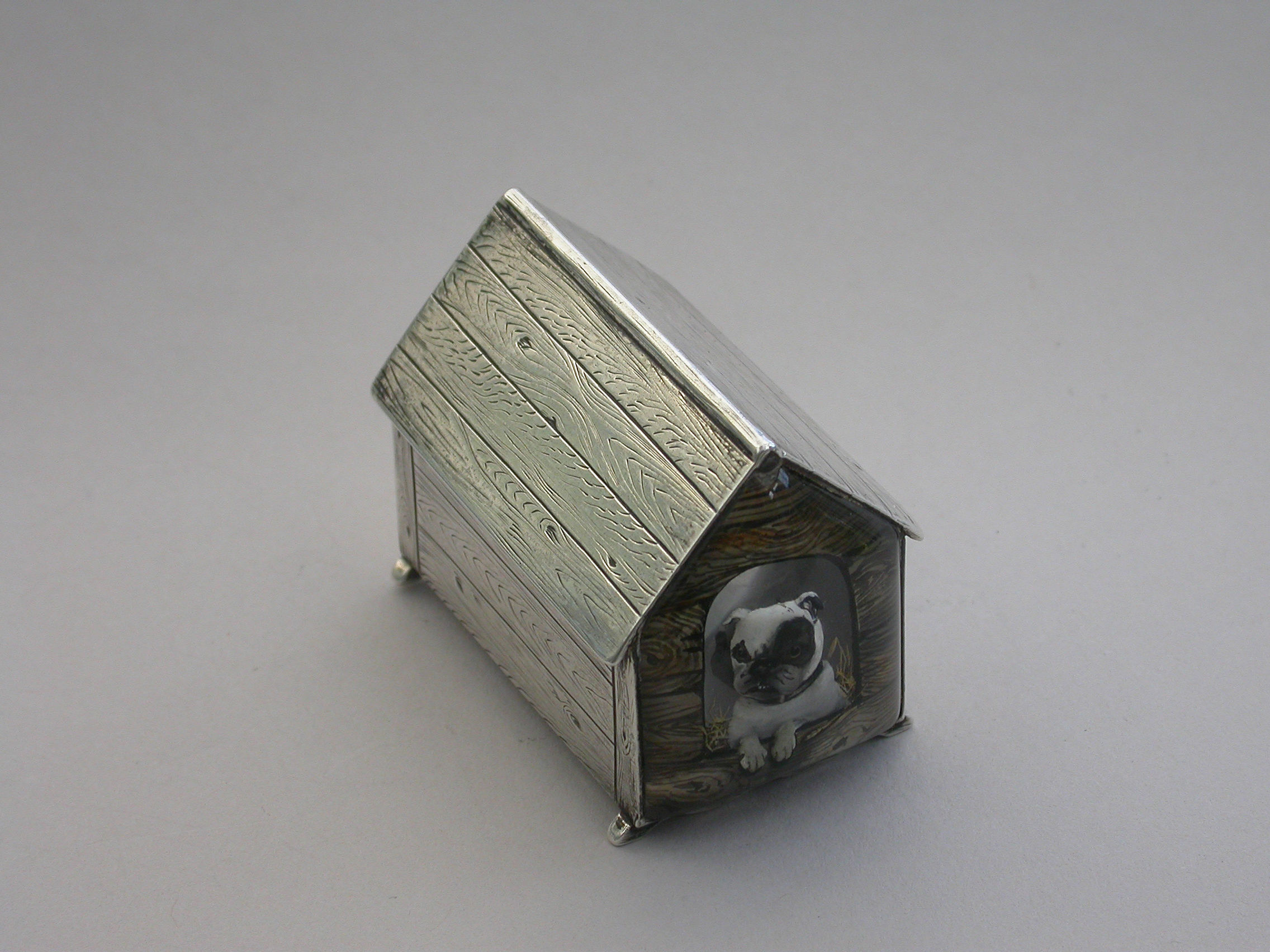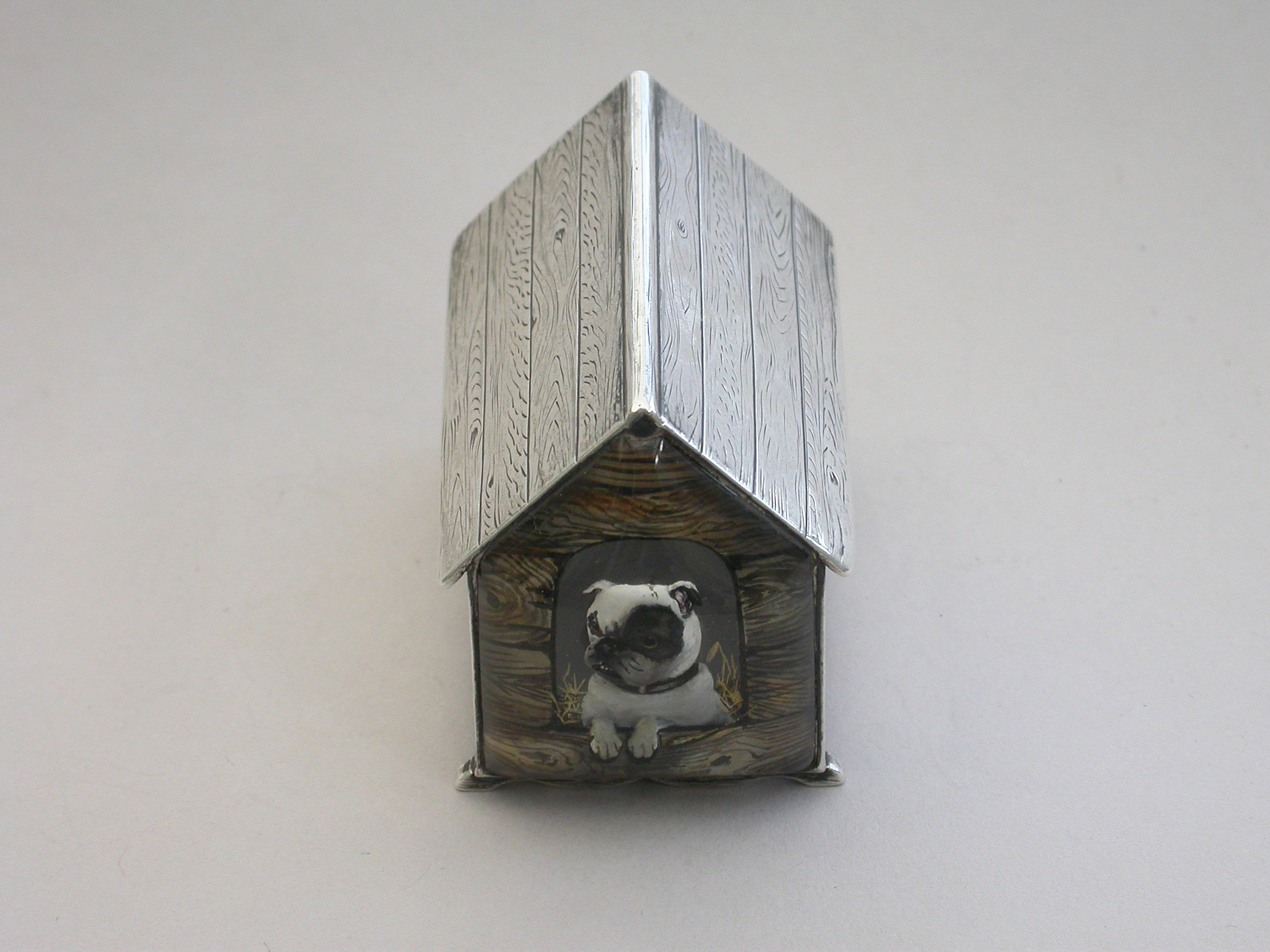 A very fine Victorian novelty silver and Essex rock crystal Vesta Case/Box, modelled as a slatted wooden kennel, the front with an applied Essex rock crystal panel depicting a bull dog, the back drawer with silver gilt interior and striking panel to one side.