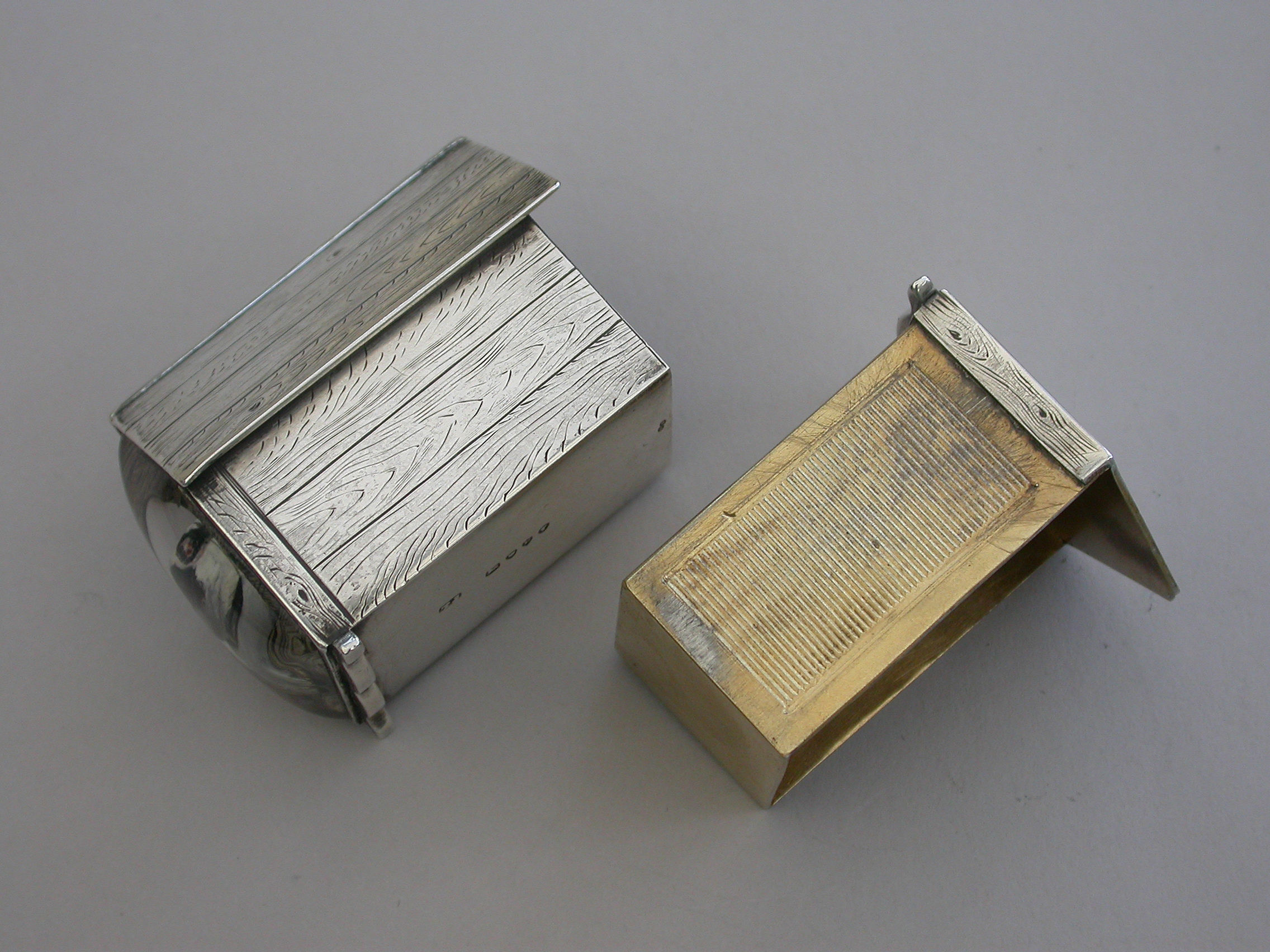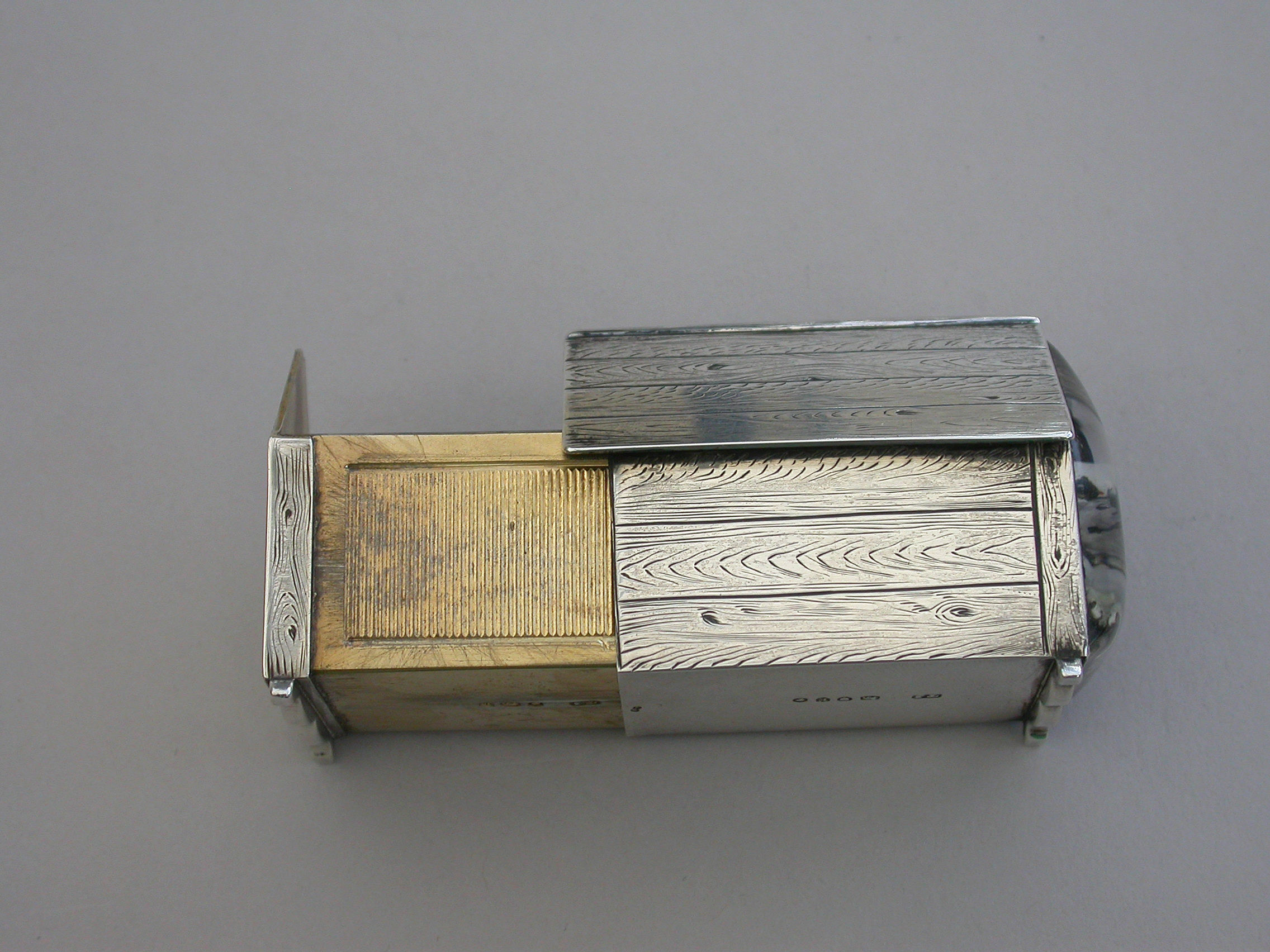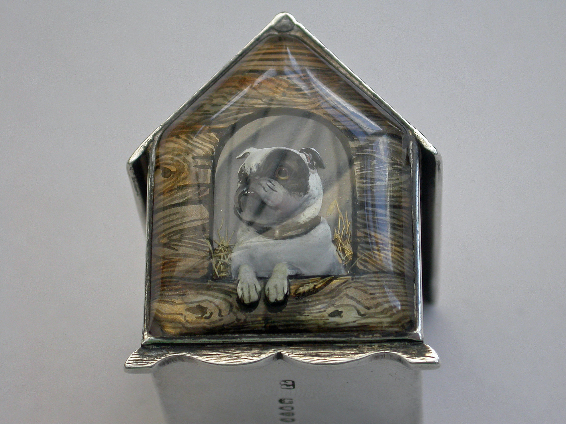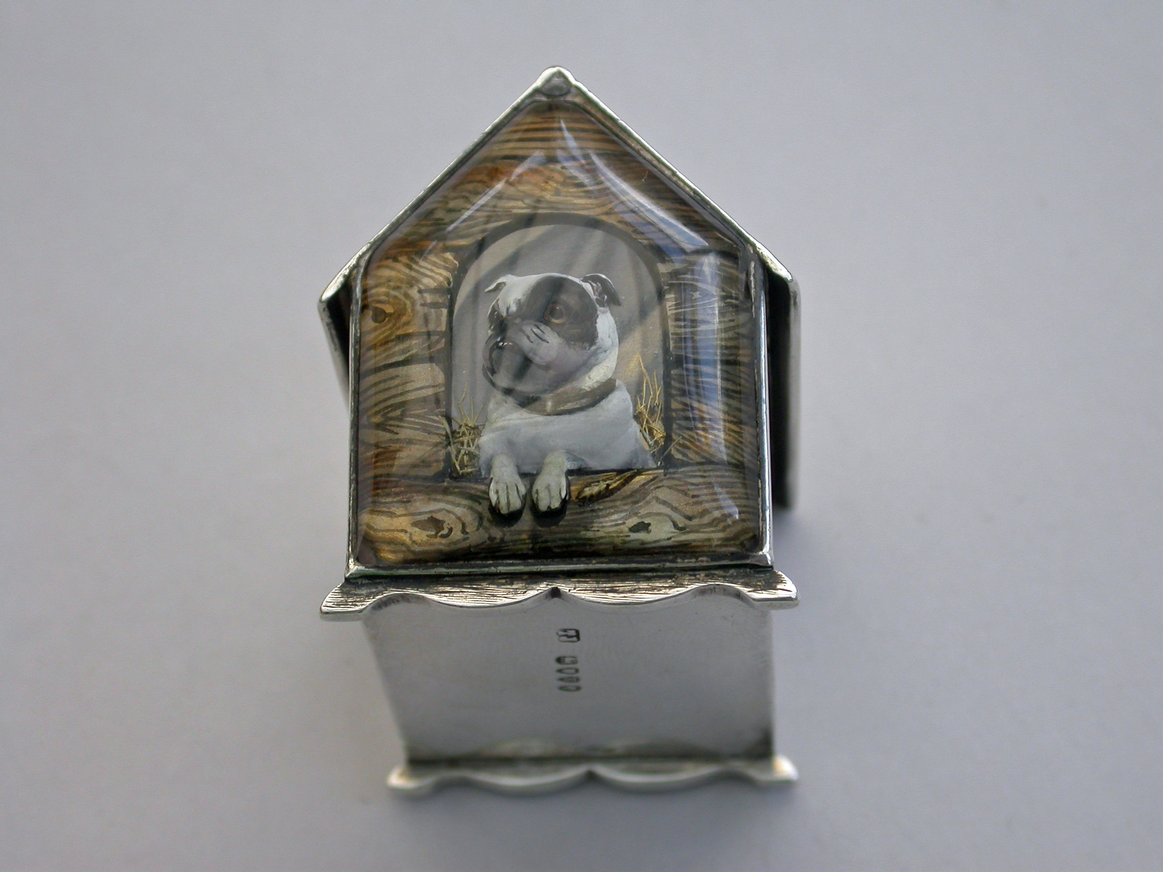 A very fine Victorian novelty silver and Essex rock crystal Vesta Case/Box, modelled as a slatted wooden kennel, the front with an applied Essex rock crystal panel depicting a bull dog, the back drawer with silver gilt interior and striking panel to one side.