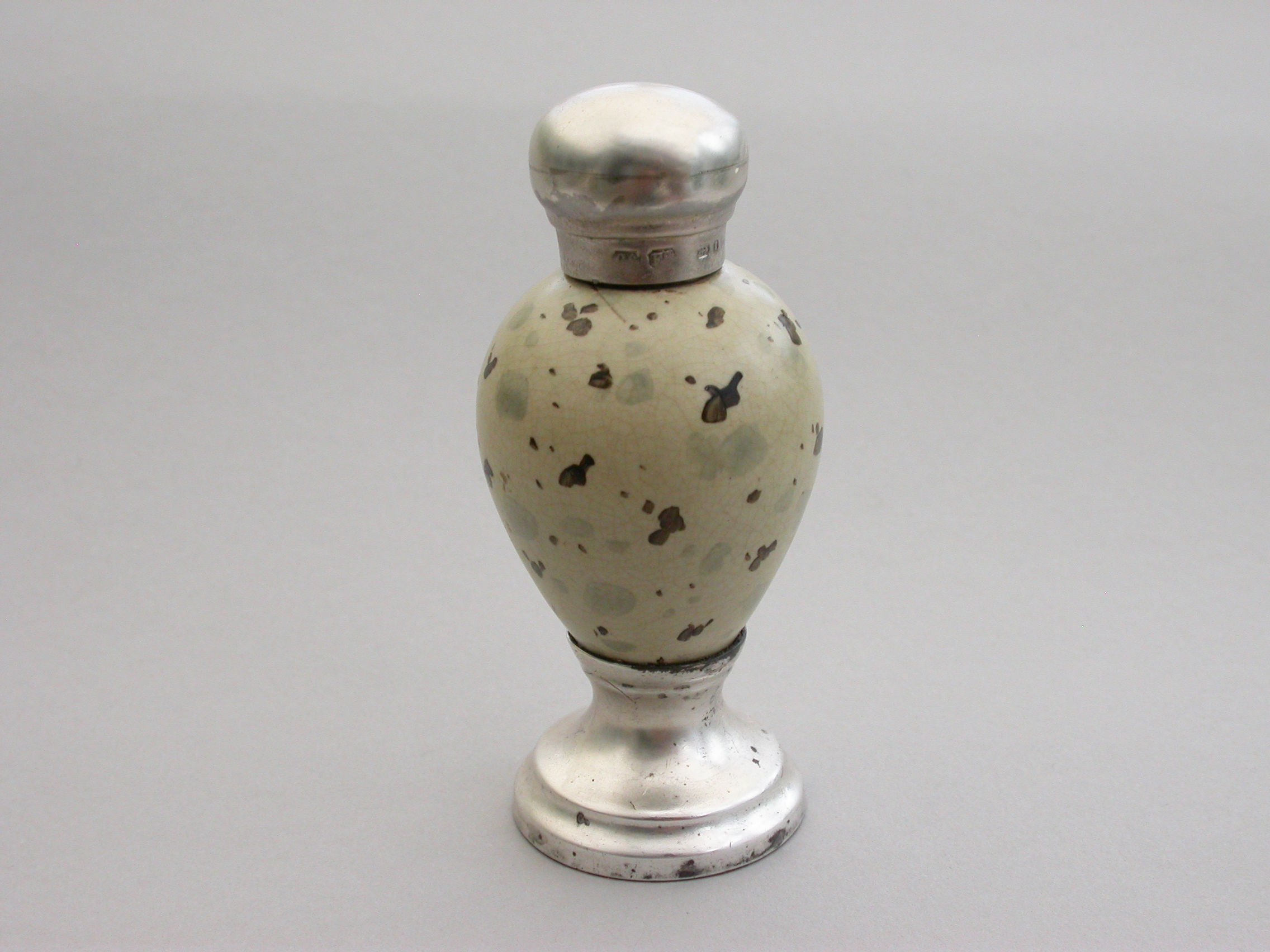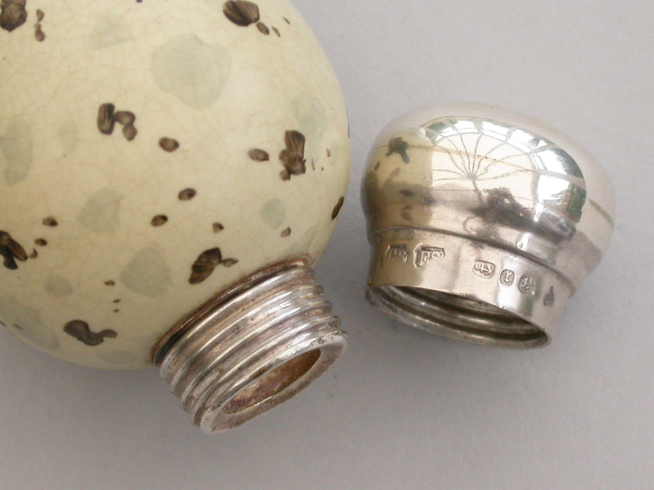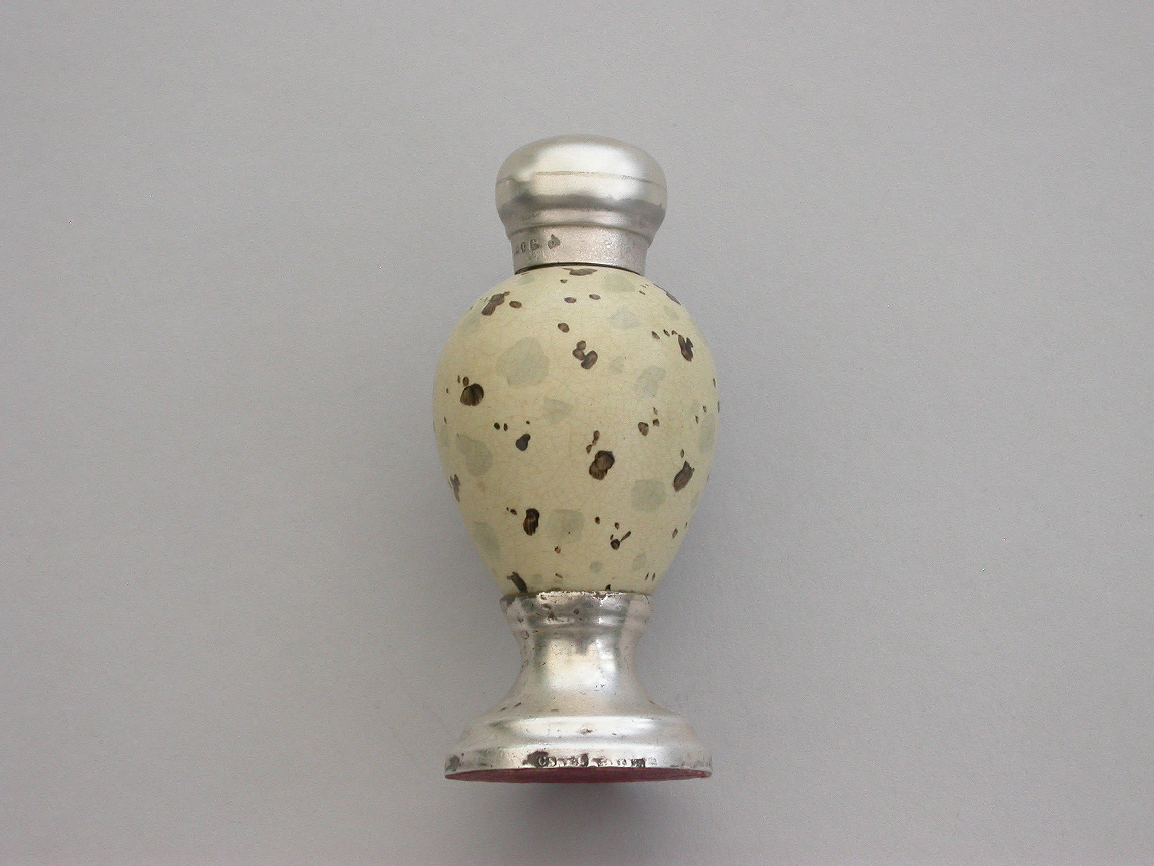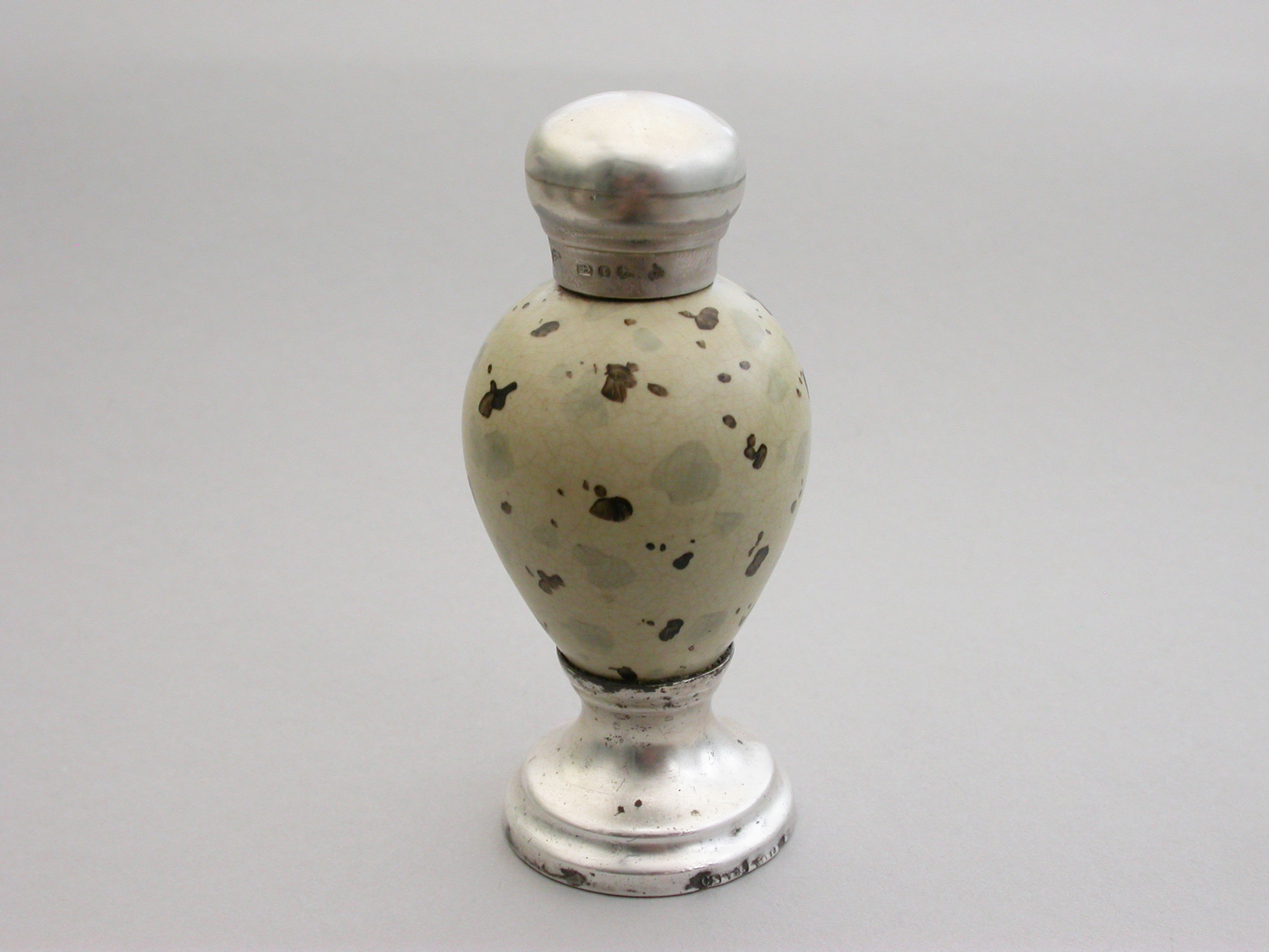 A rare Victorian novelty silver and MacIntyre ceramic Scent Bottle made in the form of a Kittiwake or Gulls Egg, with screw-off top and unusually set on a silver stepped pedestal base.