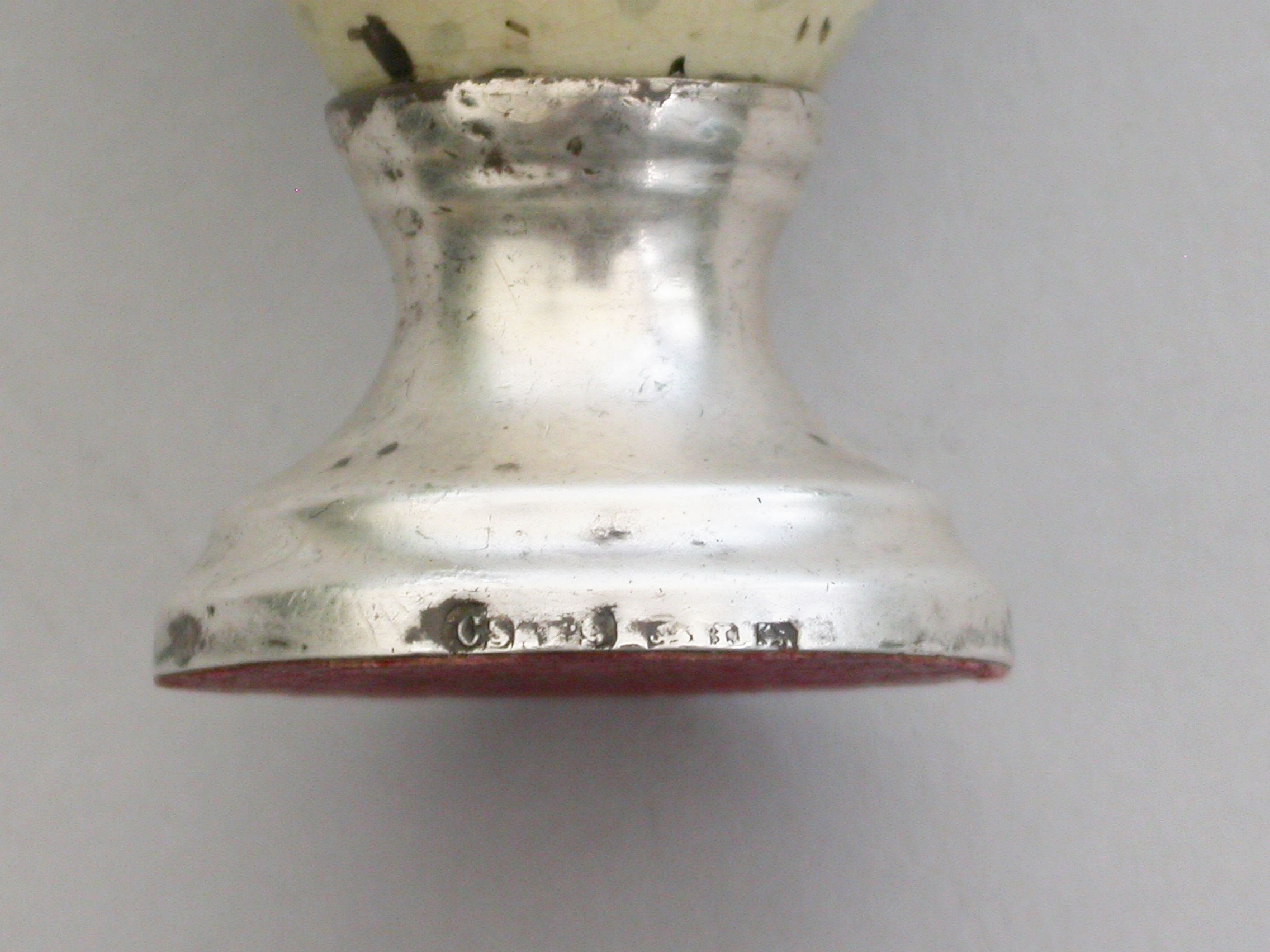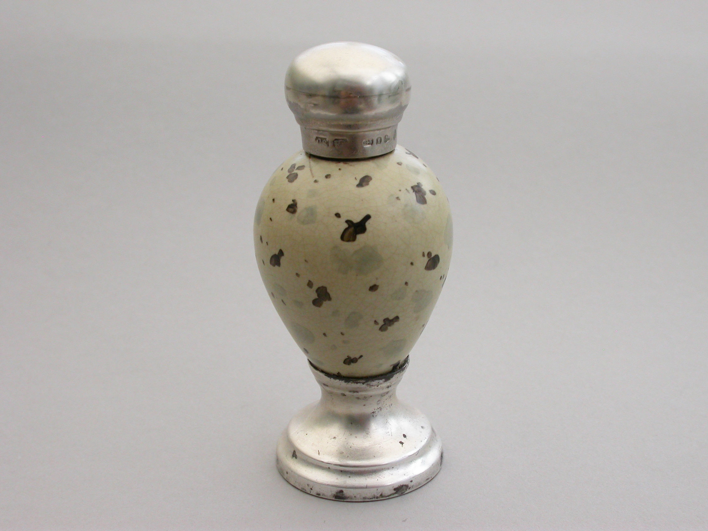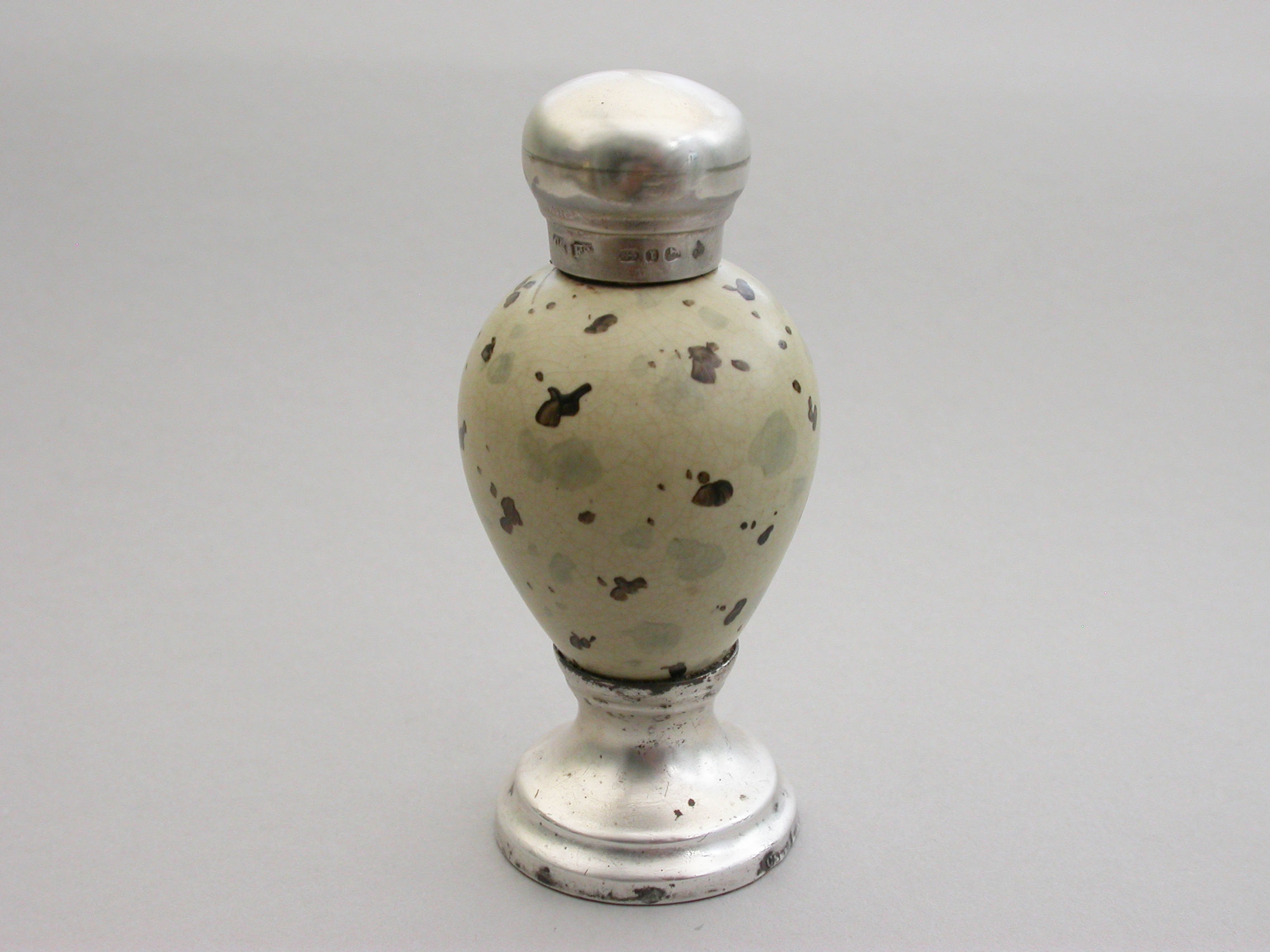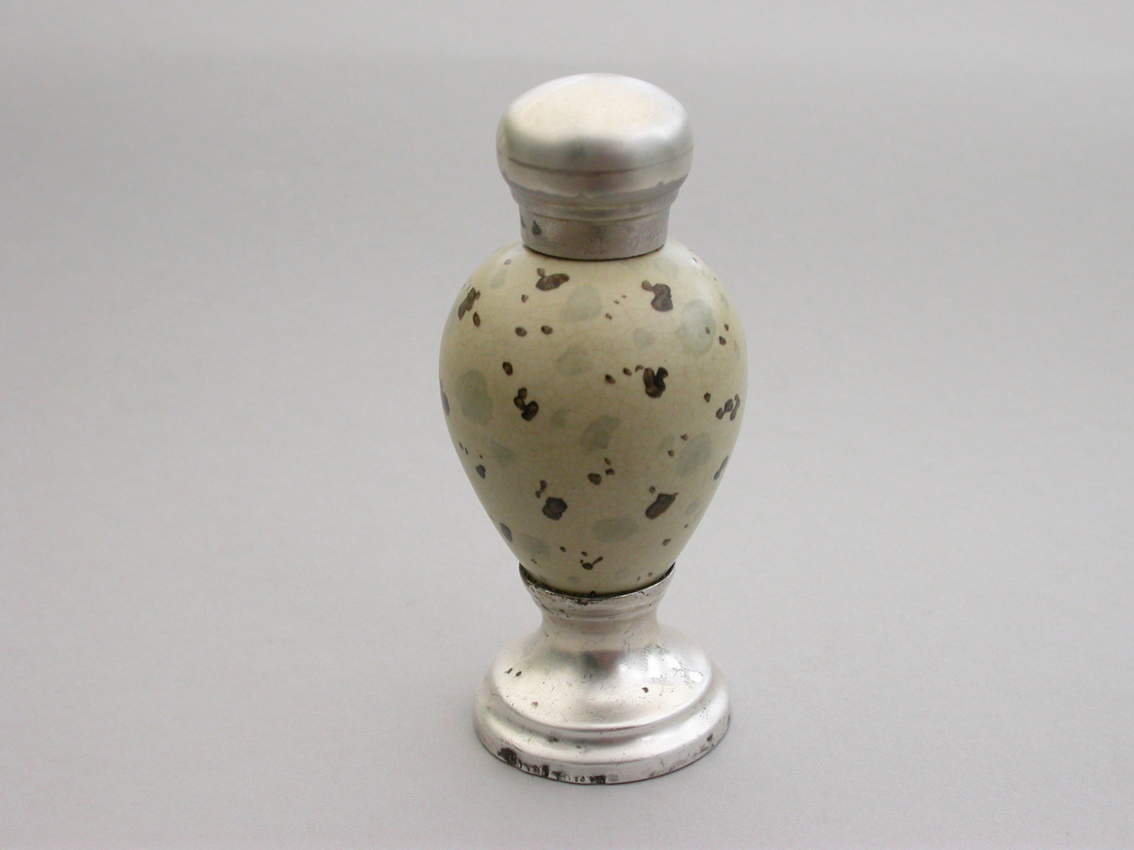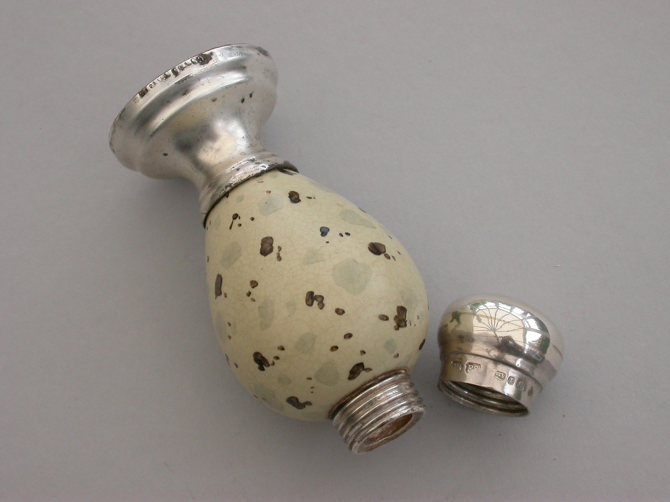 A rare Victorian novelty silver and MacIntyre ceramic Scent Bottle made in the form of a Kittiwake or Gulls Egg, with screw-off top and unusually set on a silver stepped pedestal base.
