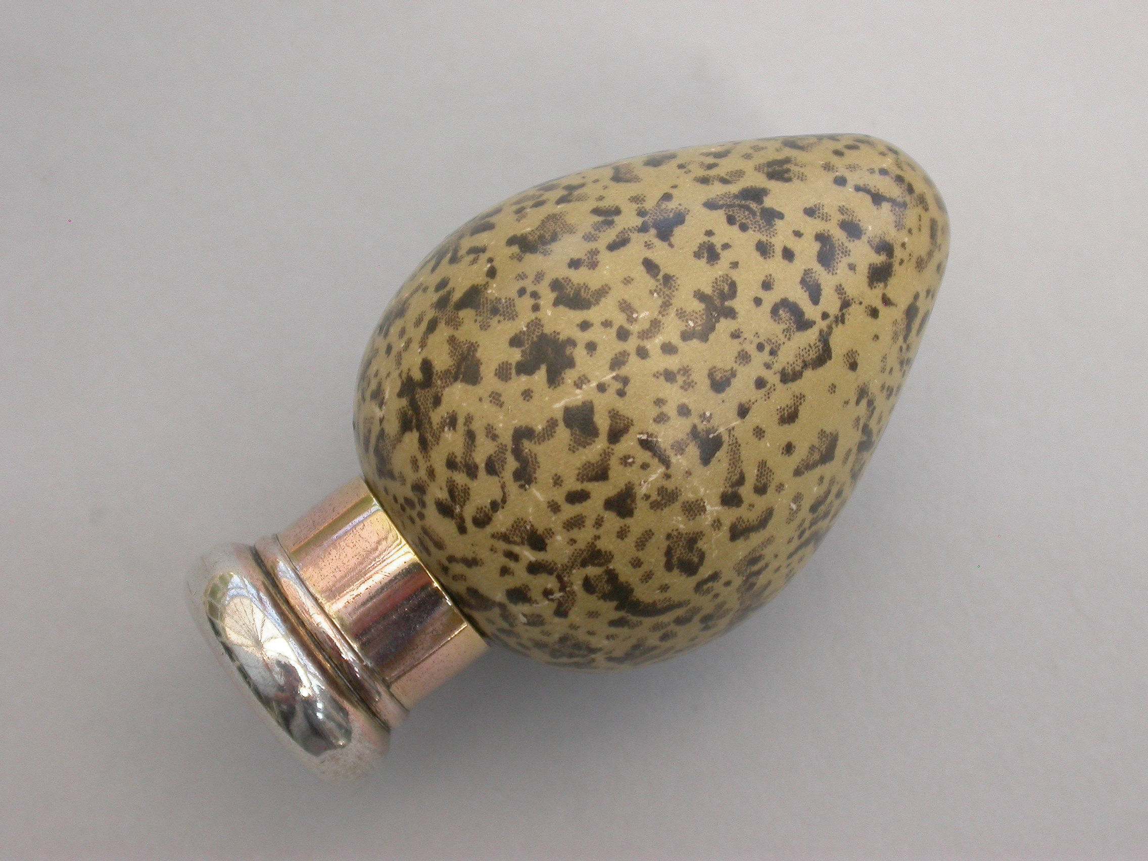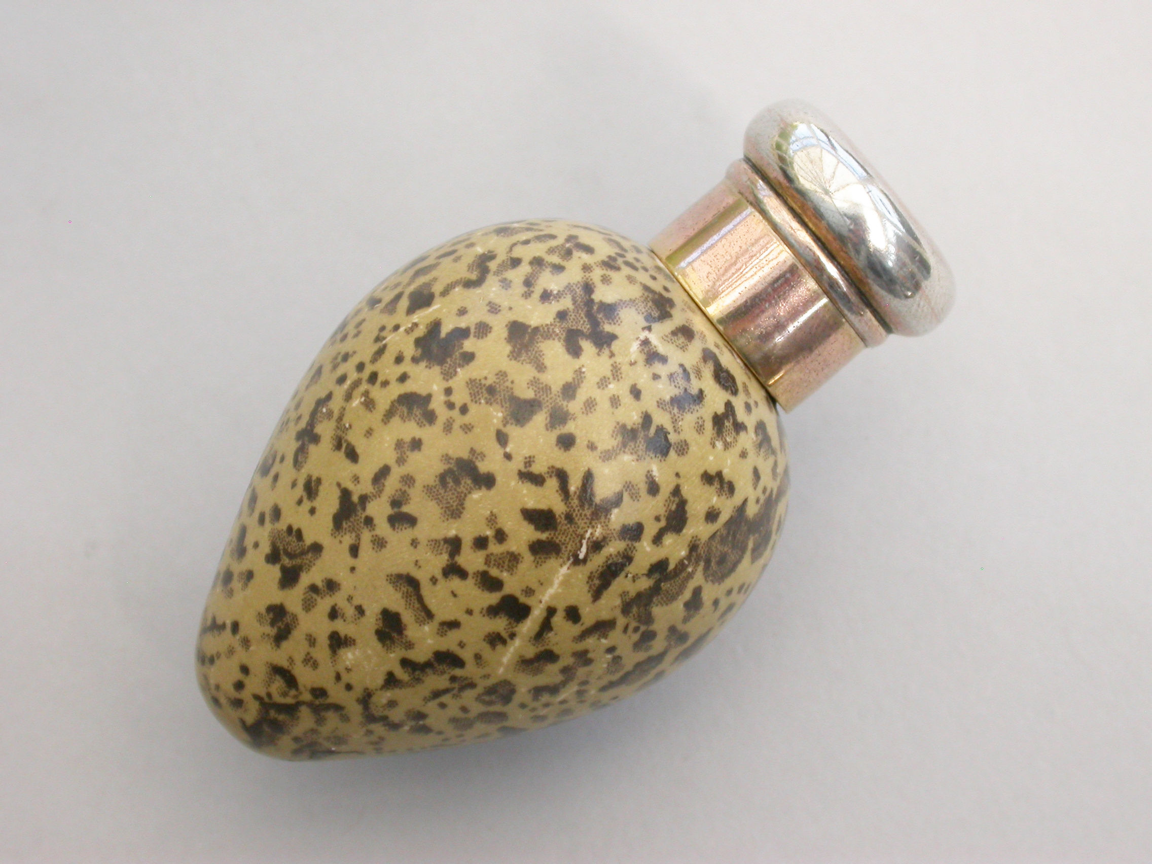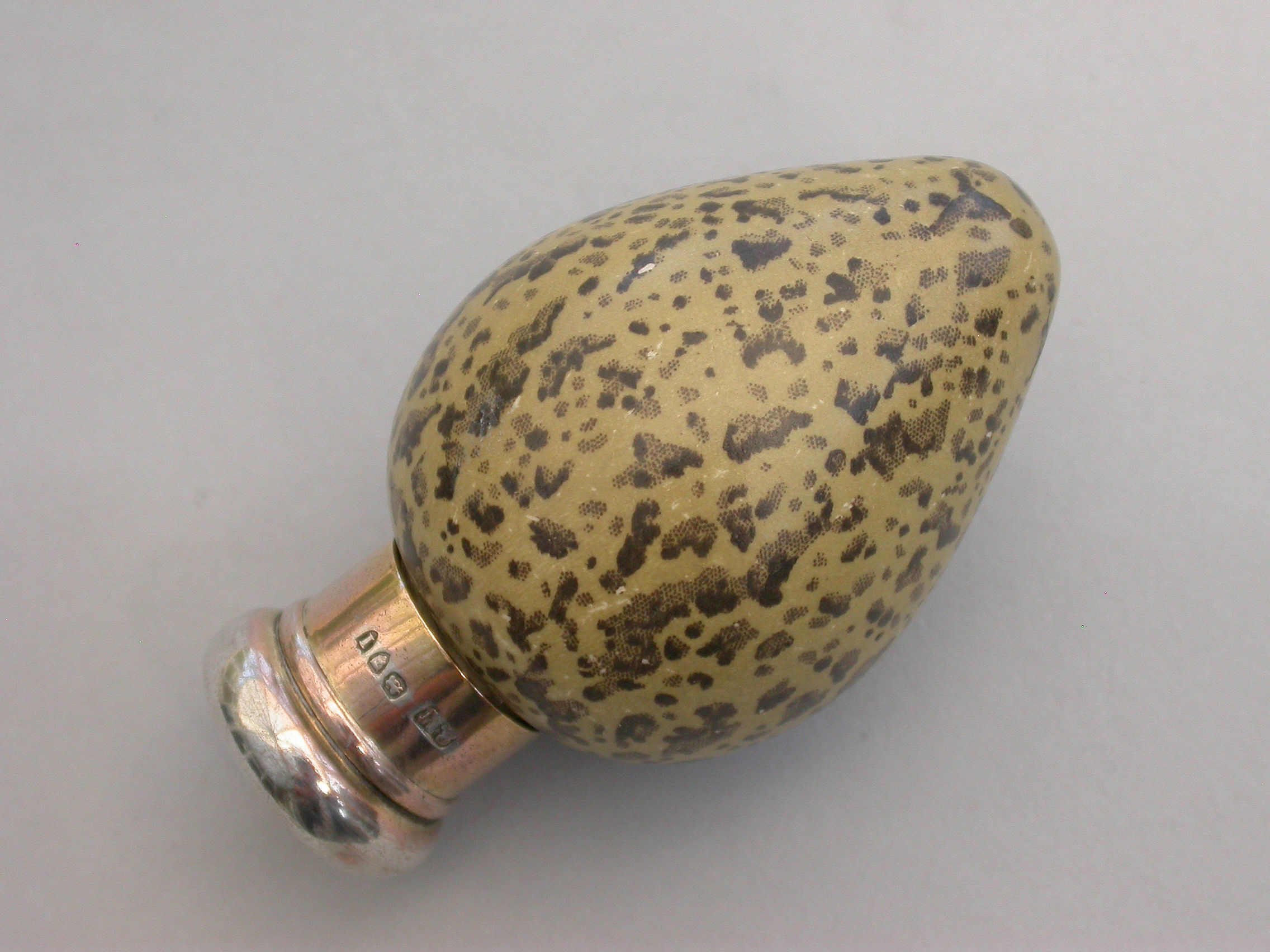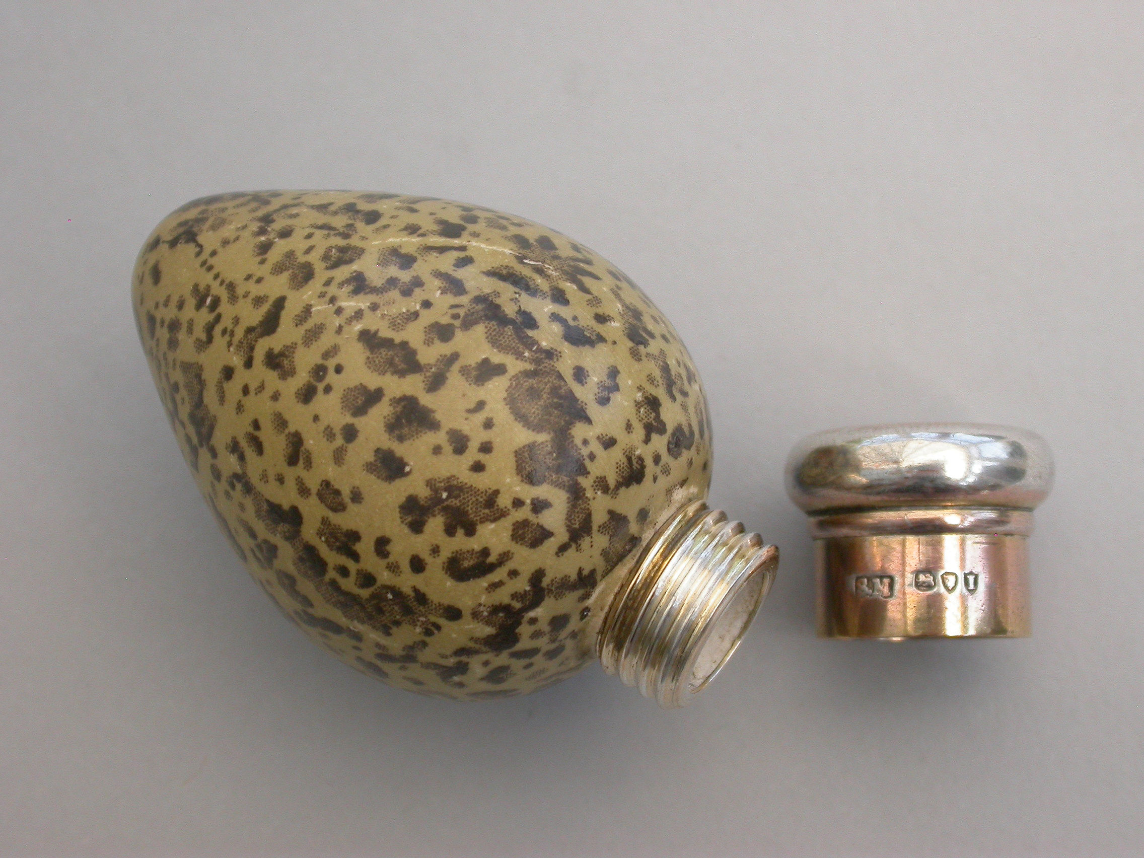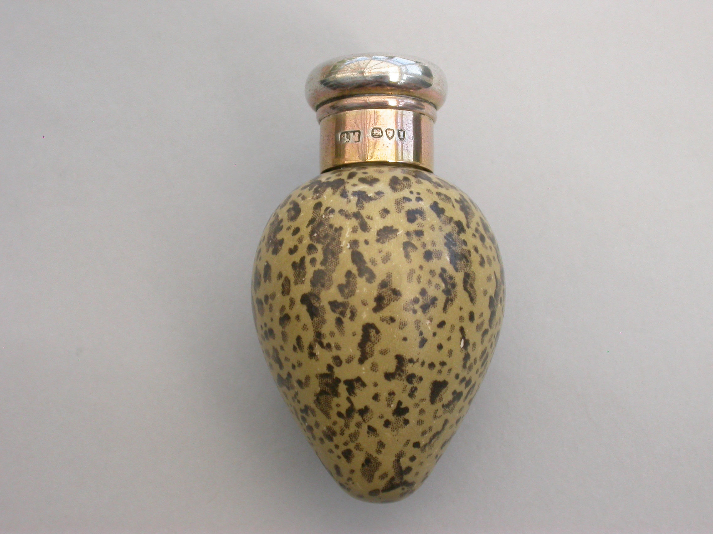 A good Victorian novelty silver and MacIntyre ceramic Scent Bottle made in the form of a Black Headed Gulls egg with silver gilt screw-off top.