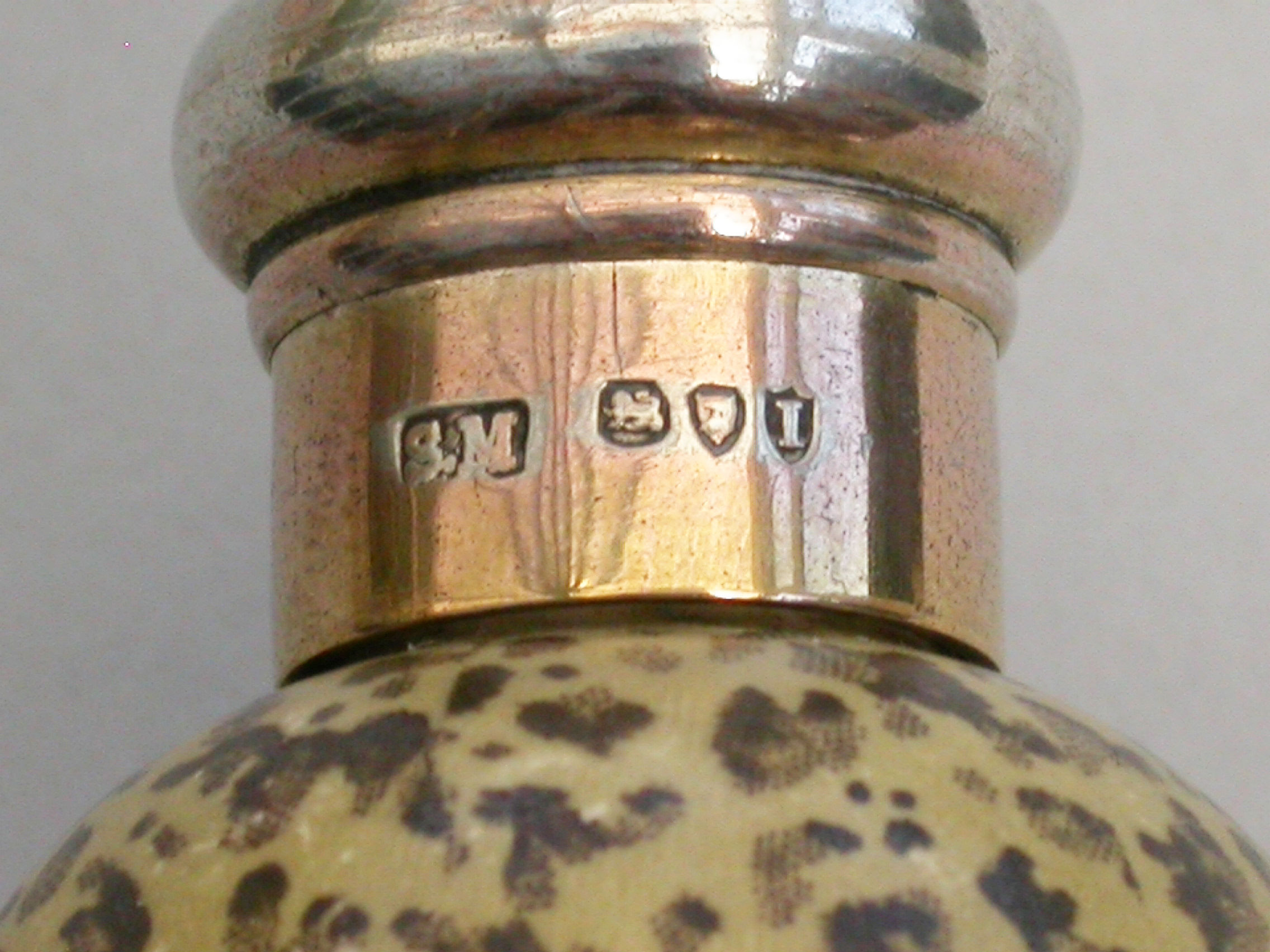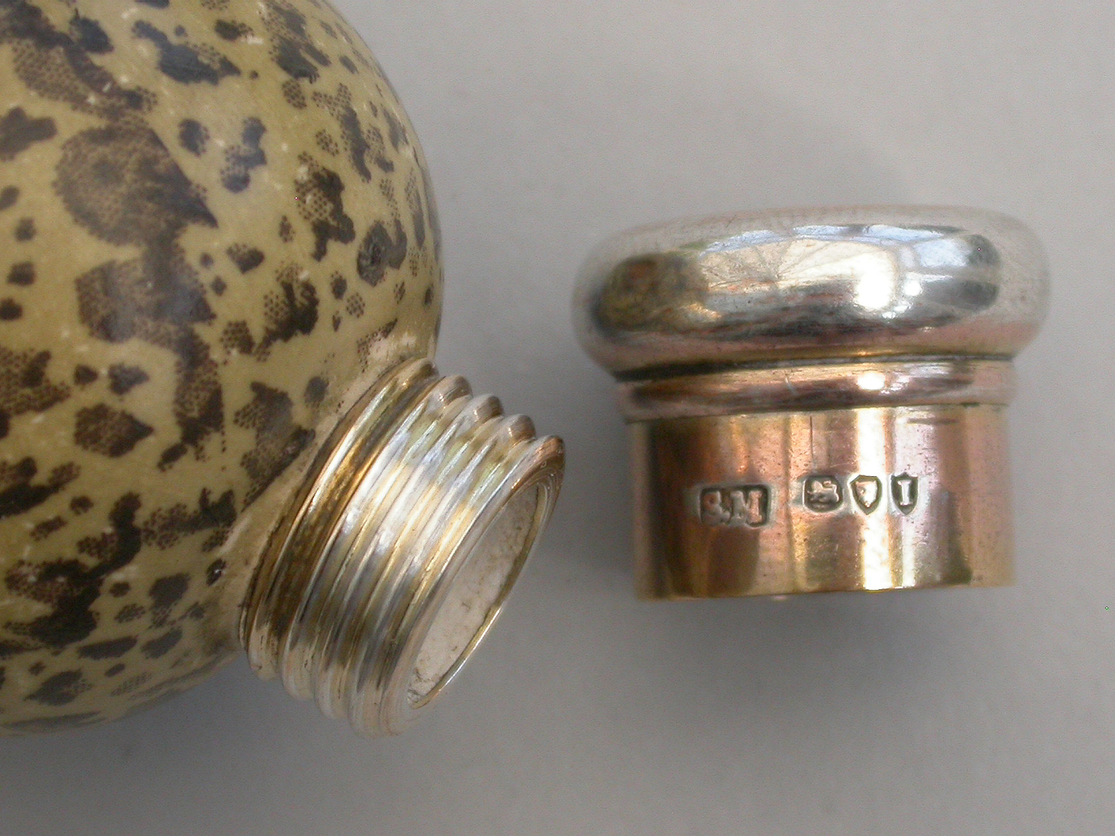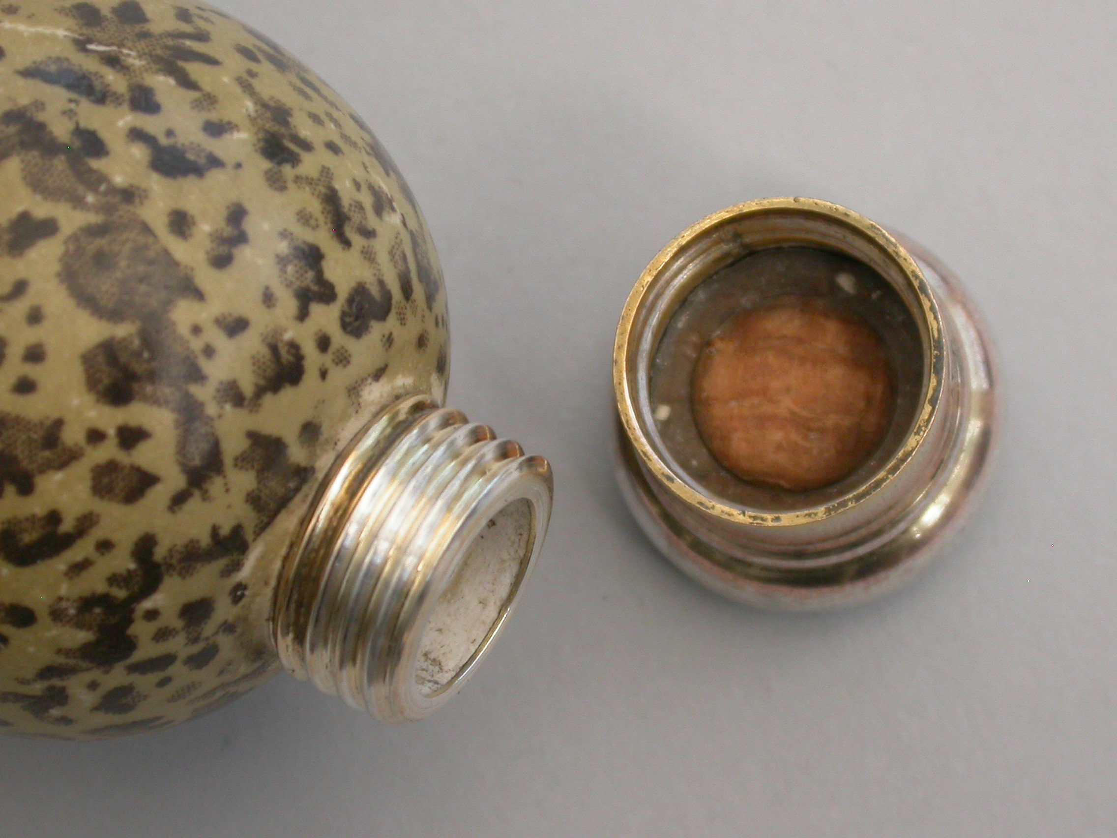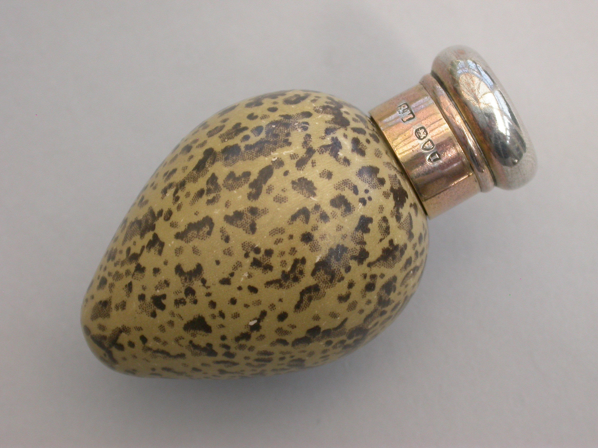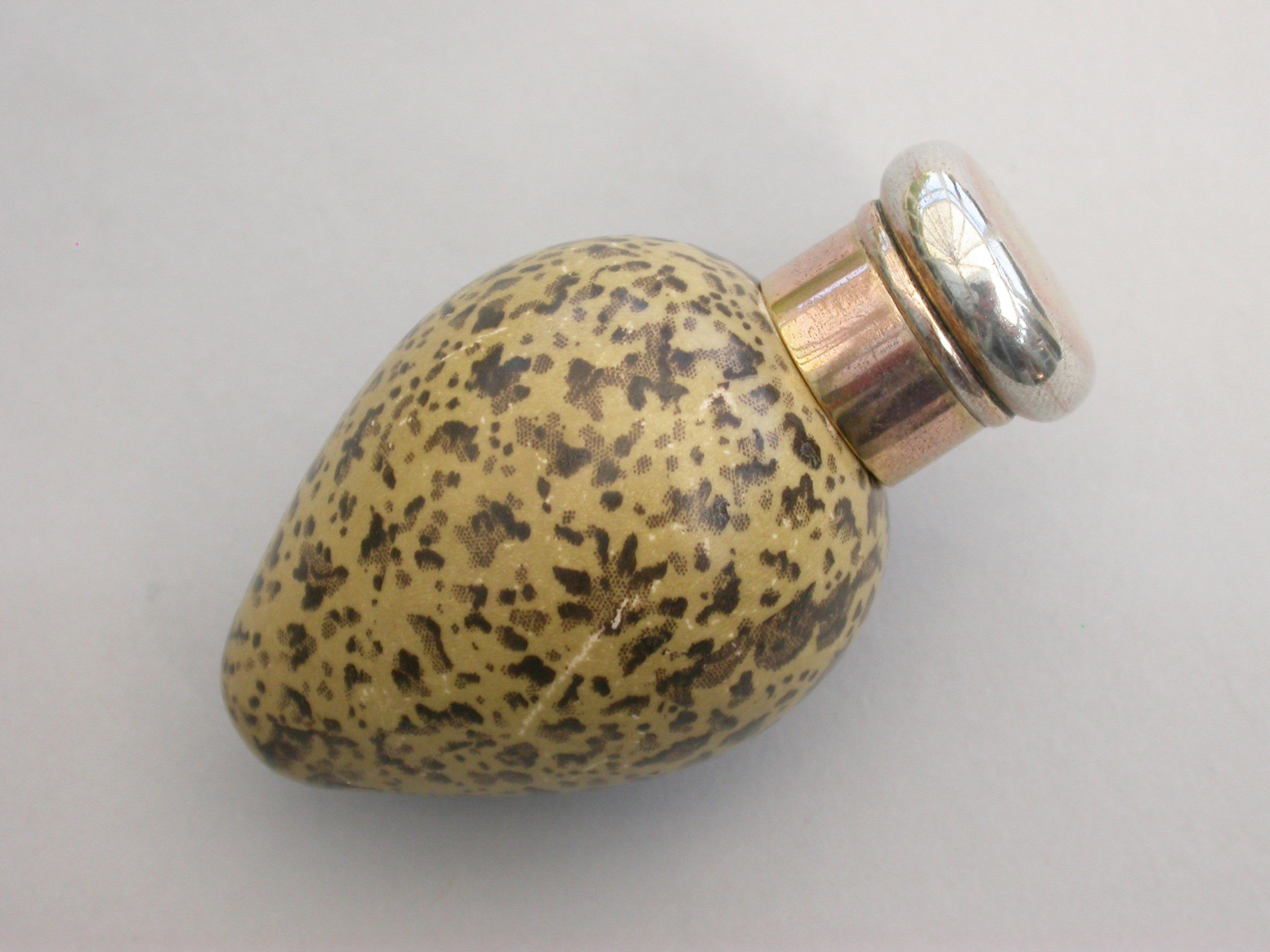 A good Victorian novelty silver and MacIntyre ceramic Scent Bottle made in the form of a Black Headed Gulls egg with silver gilt screw-off top.