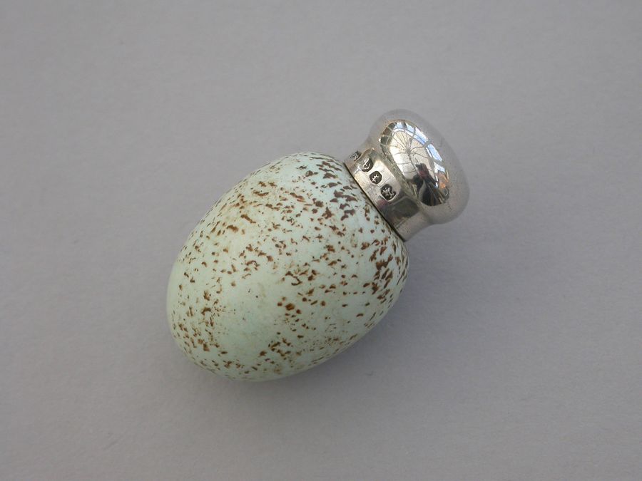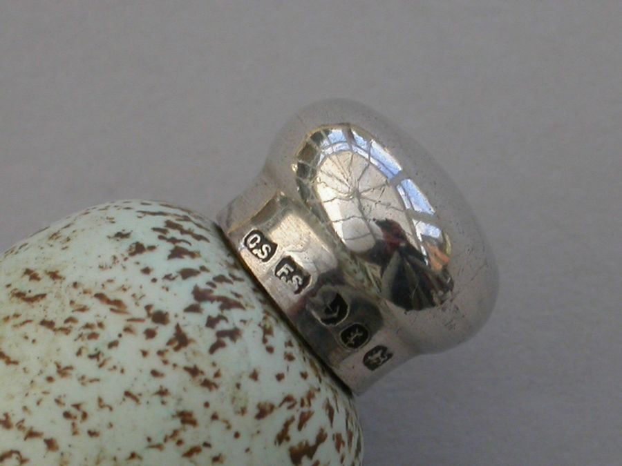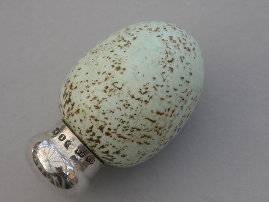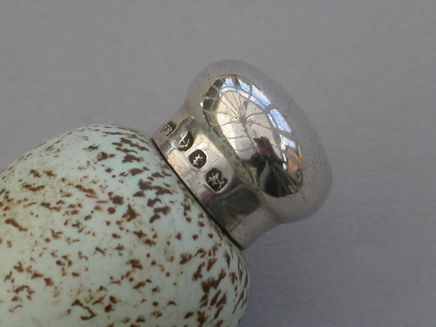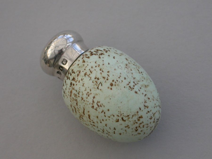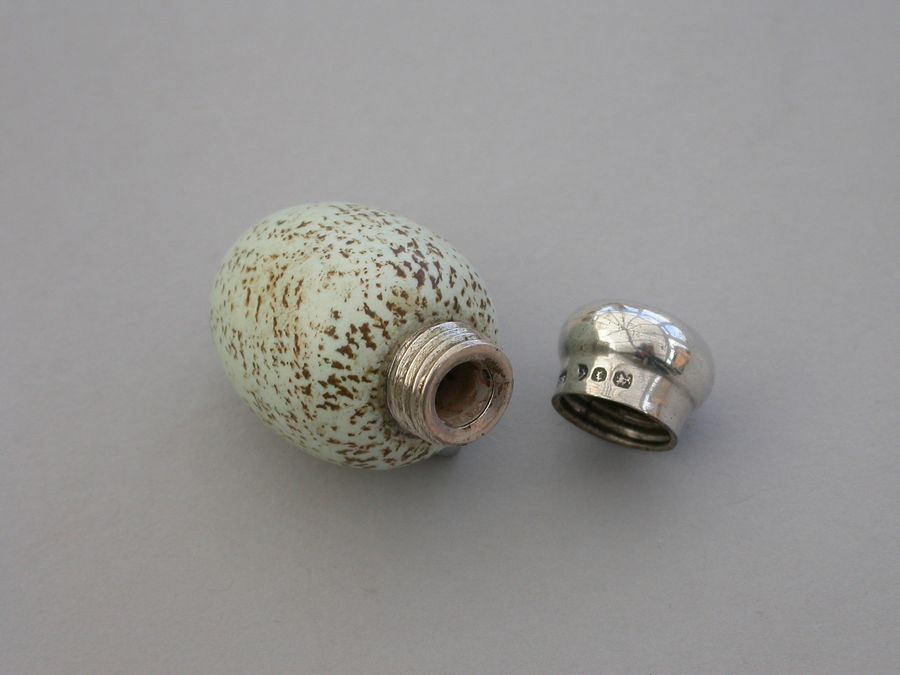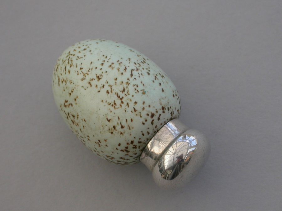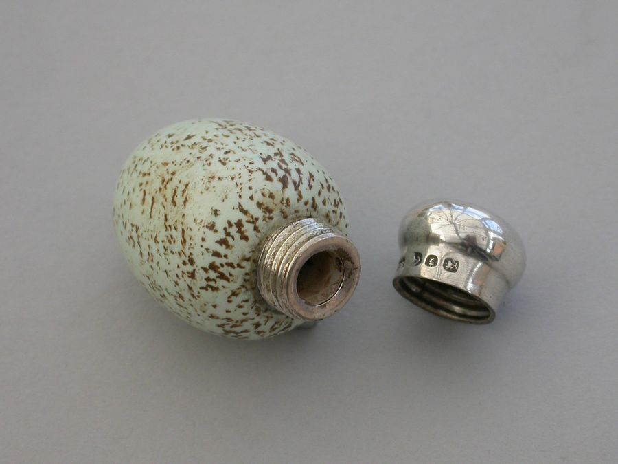 A good Victorian novelty silver and MacIntyre ceramic Scent Bottle made in the form of a Blackbird's egg, with screw-off silver top.