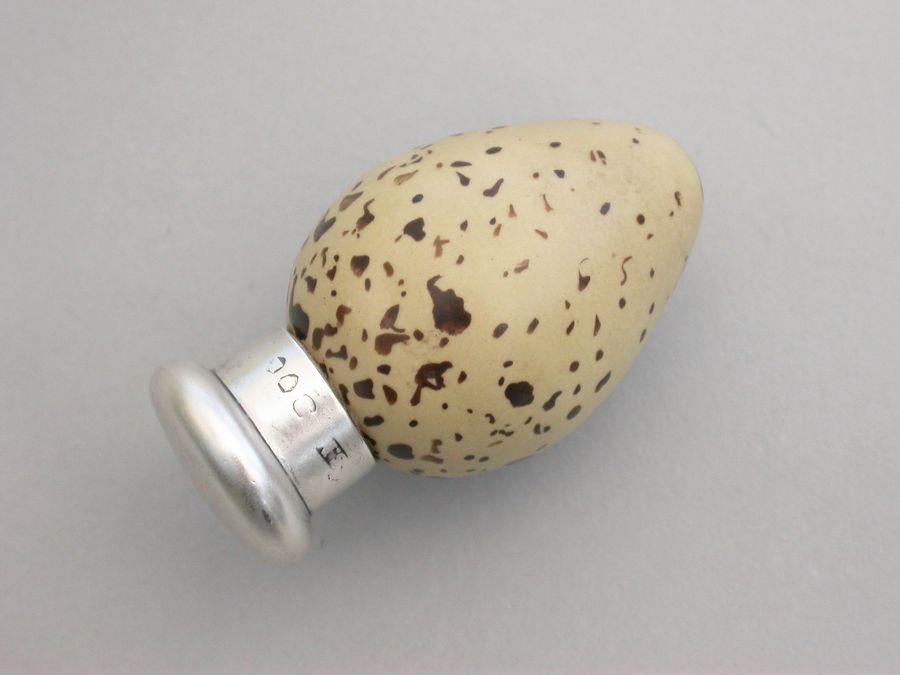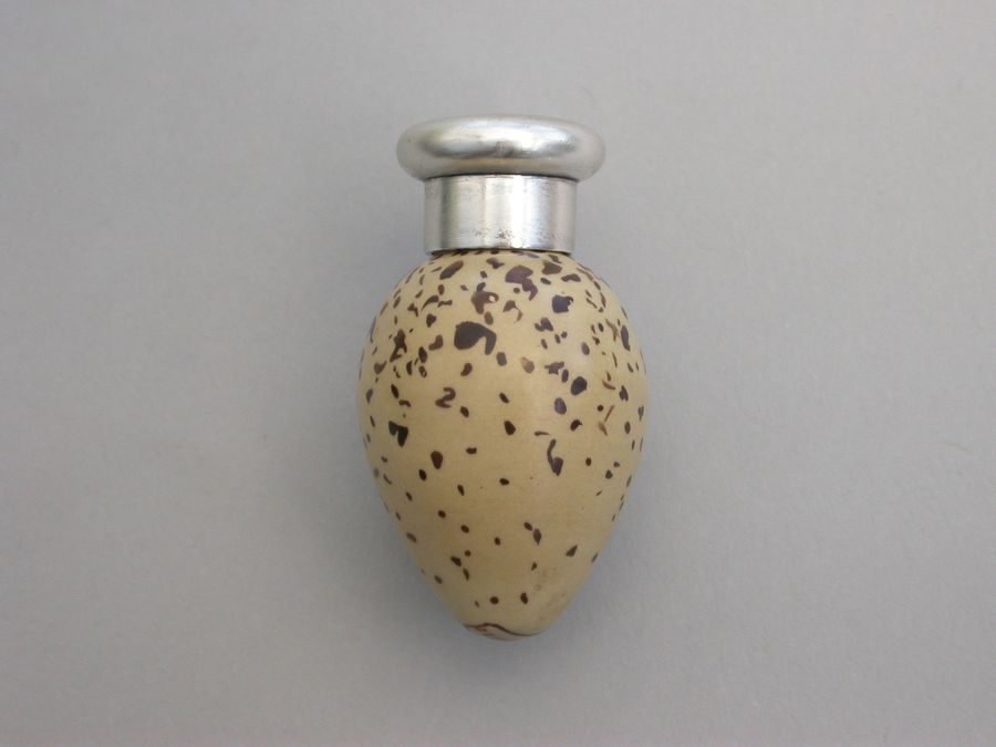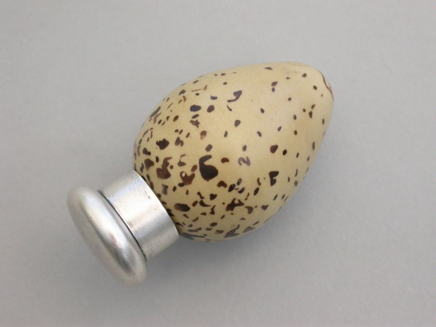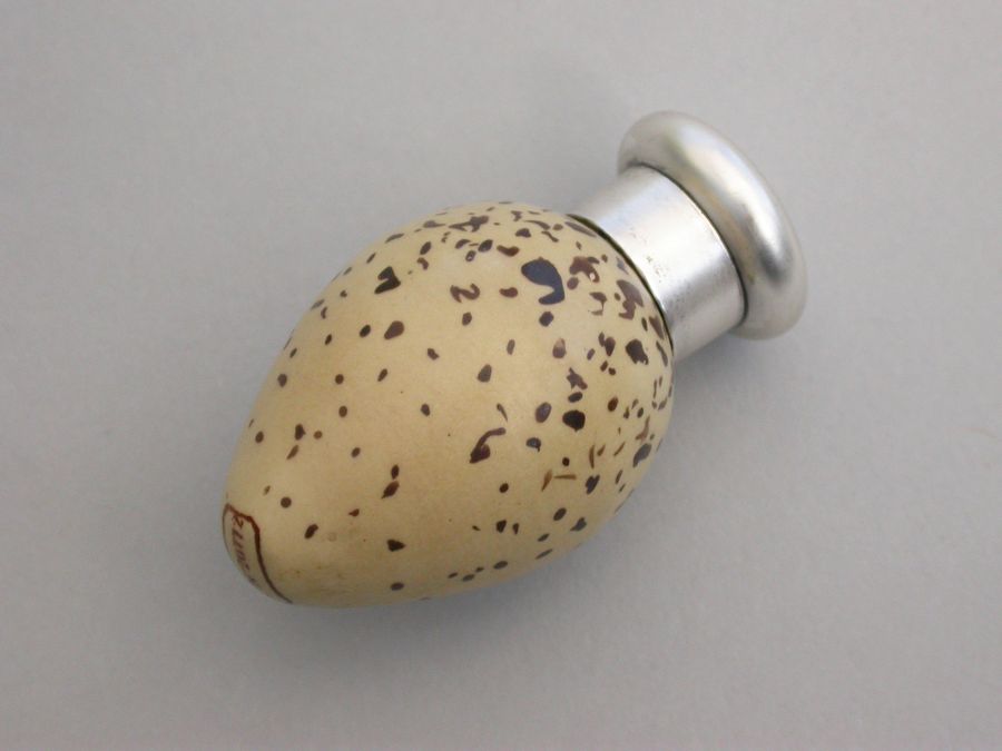 A good Victorian novelty silver and MacIntyre ceramic Scent Bottle made in the form of a Common Terns egg with screw-off top.