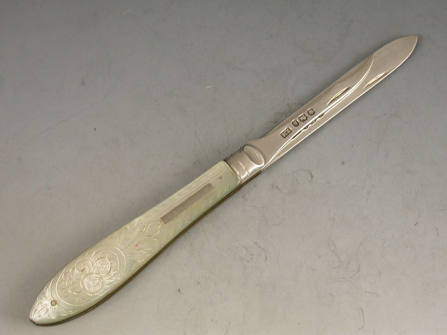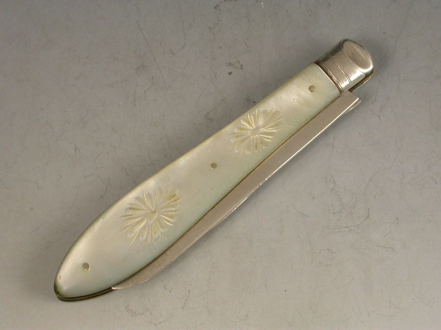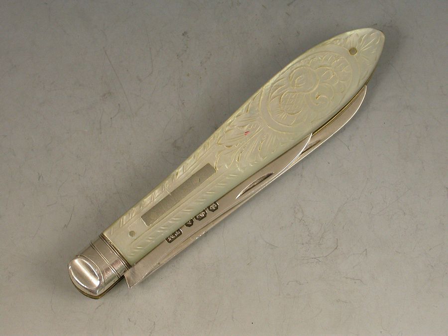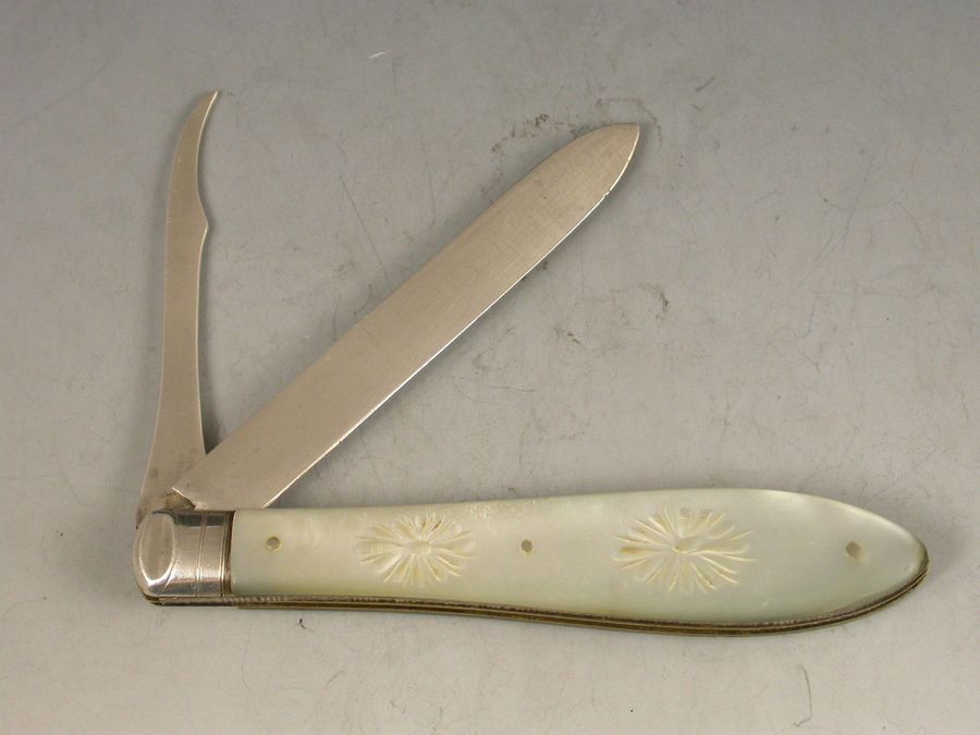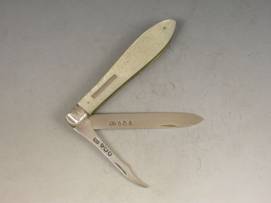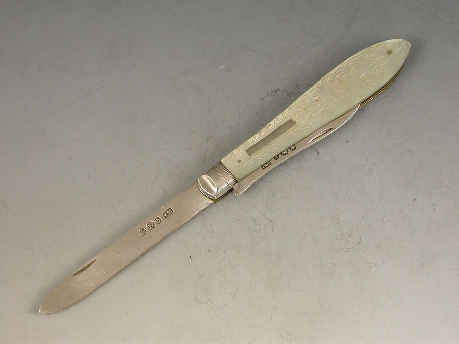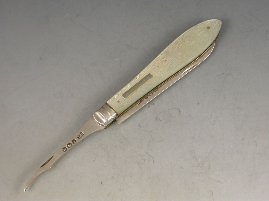 A rare Victorian silver and mother of pearl Folding Fruit Knife, the mother of pearl handles engraved with fruit and foliage, the piece also containing a pointed silver seed pip pick for removing pips from fruit.