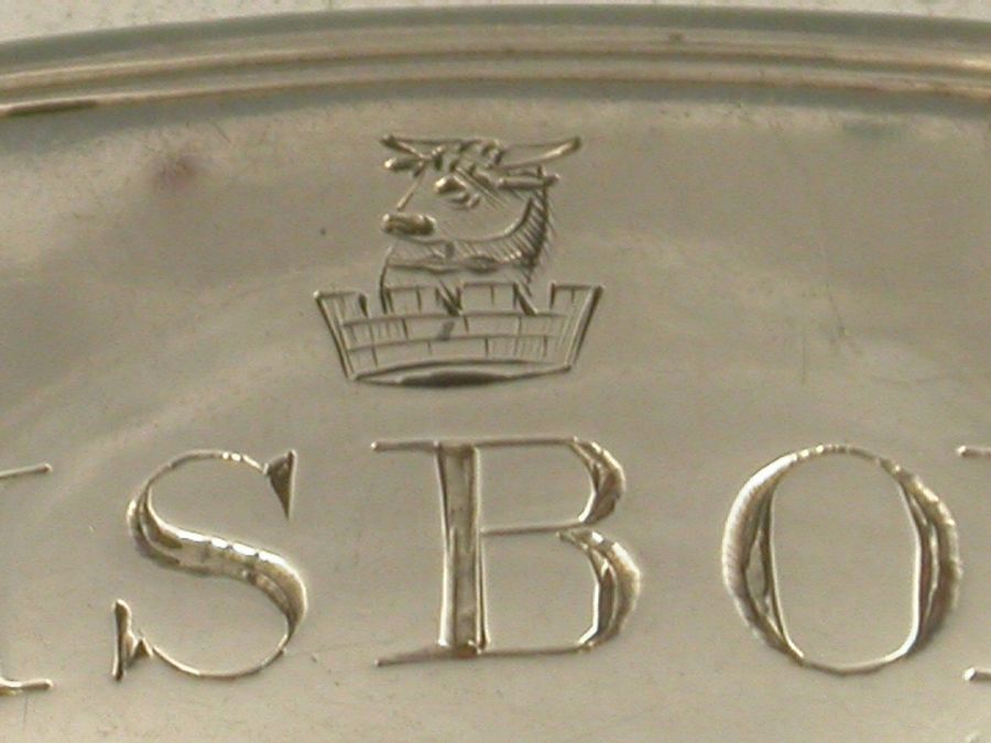 A Victorian silver Wine Label of broad rectangualr form with double reeded border, incised for Lisbon below a crest depicting a bulls head issuing out of a Mural Coronet (that of several families).