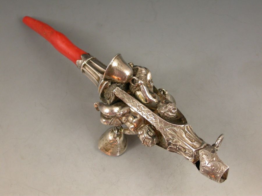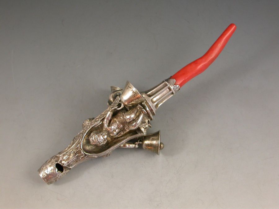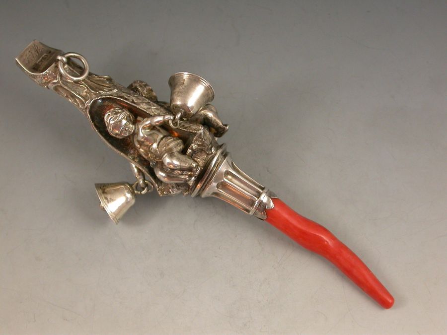 A very unusual Victorian silver Baby’s Rattle, the whistle with chased acanthus leaf decoration above three recessed arched alcoves inset with figures of naked putti each holding a pendant bell above a fluted column, terminating in coral stick teether.