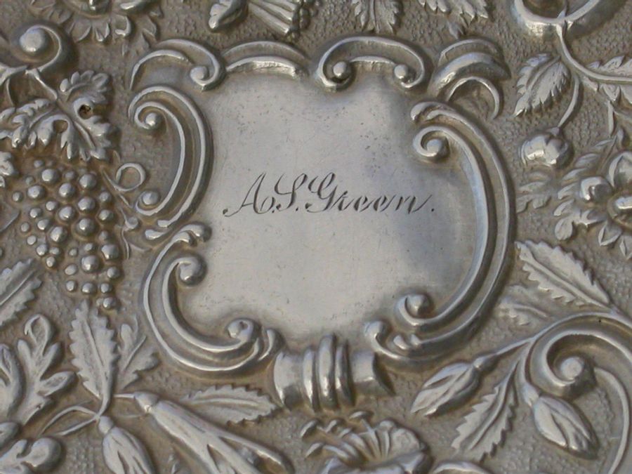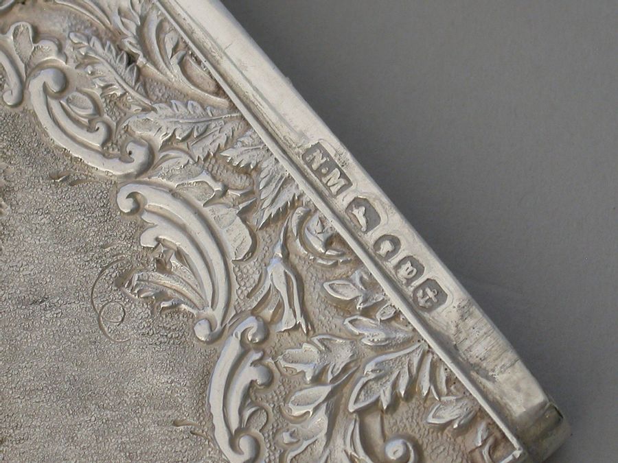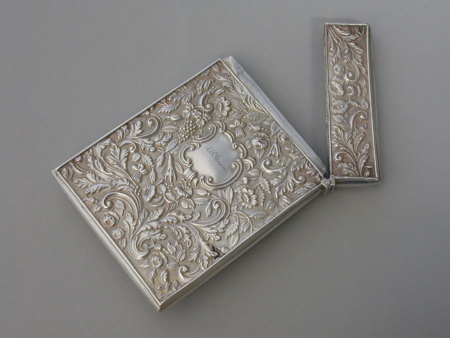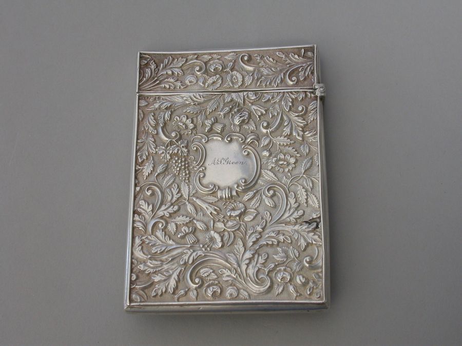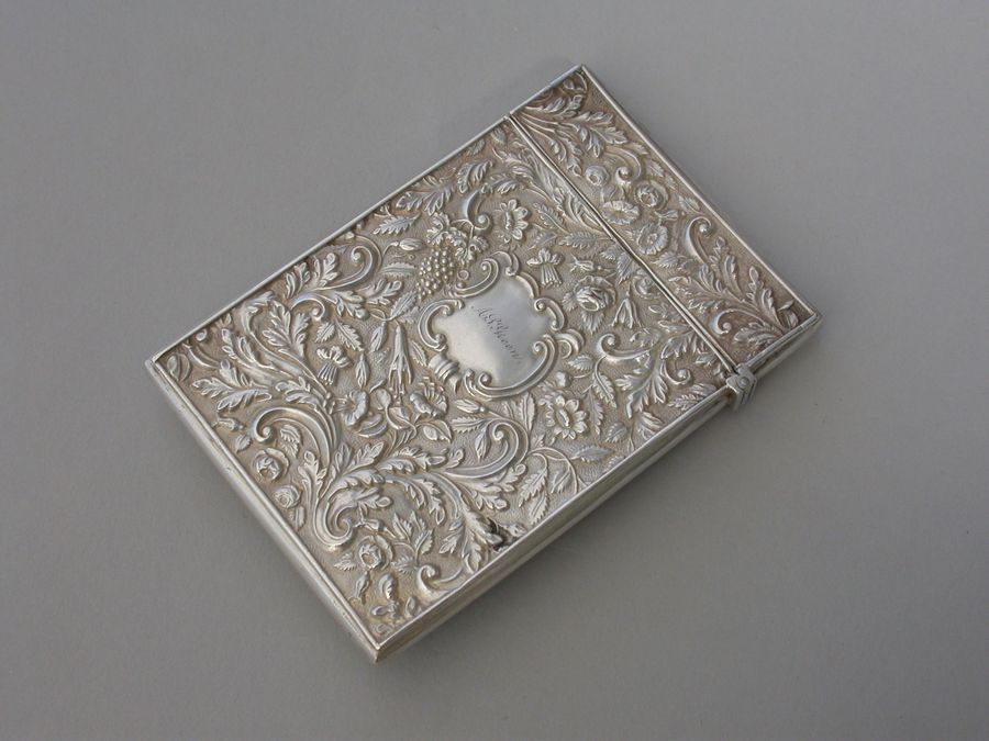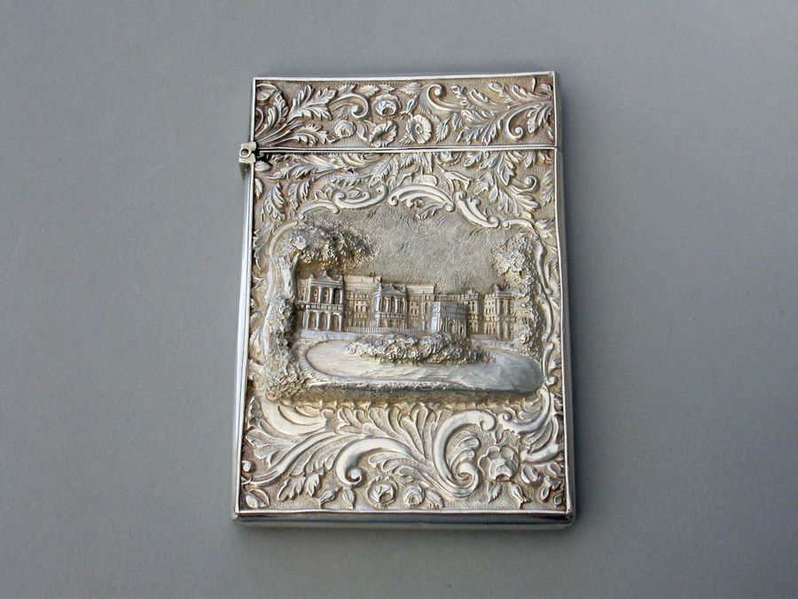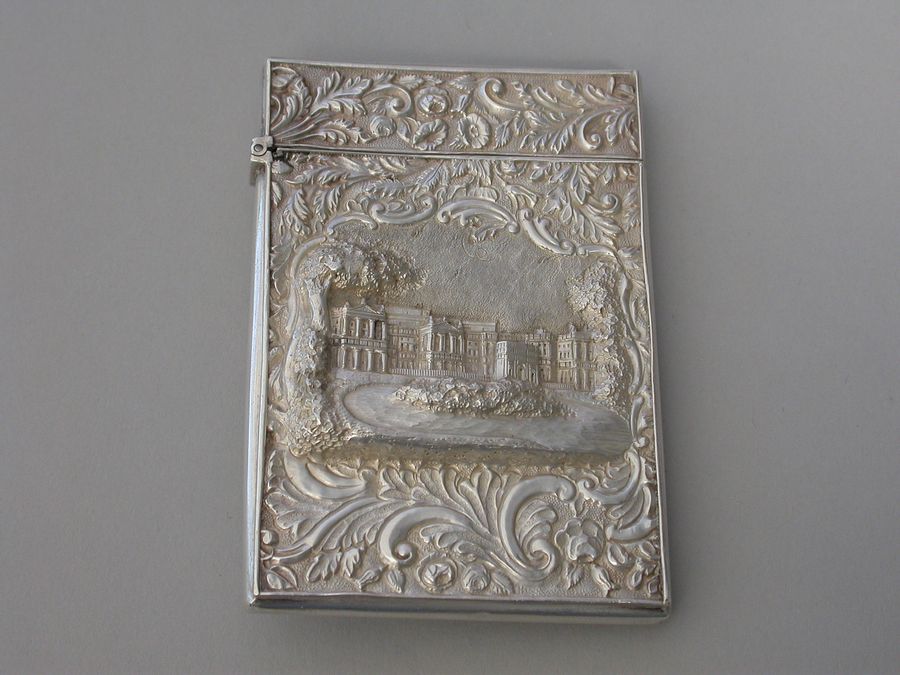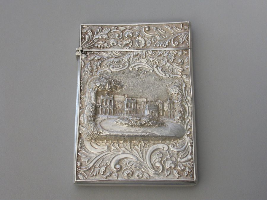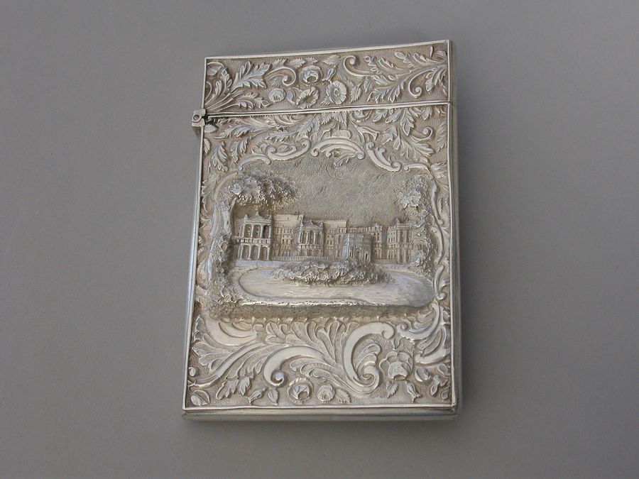 A rare Victorian silver castle-top Card Case of rectangular form, the body chased and embossed with foliate scroll decoration, the reverse with a shaped cartouche engraved with the owners name - ""A.S.Green"", the front chased and embossed with a raised scene depicting Buckingham Palace in 1847, showing the Marble Arch in the centre of the forecourt, prior to Edward Blore's alterations completed in 1850.