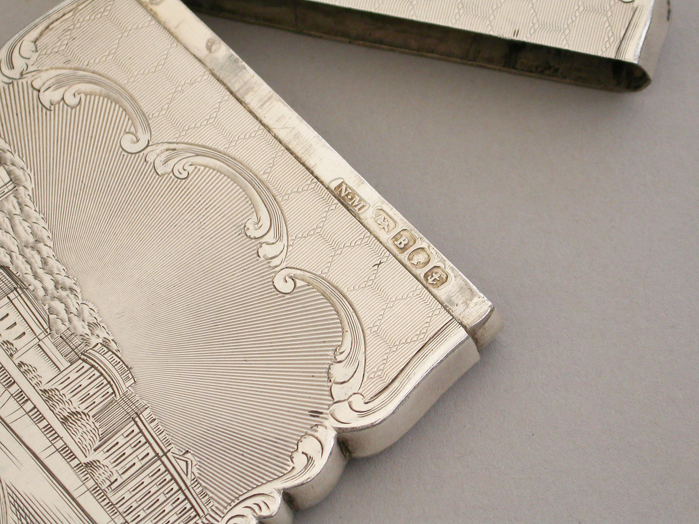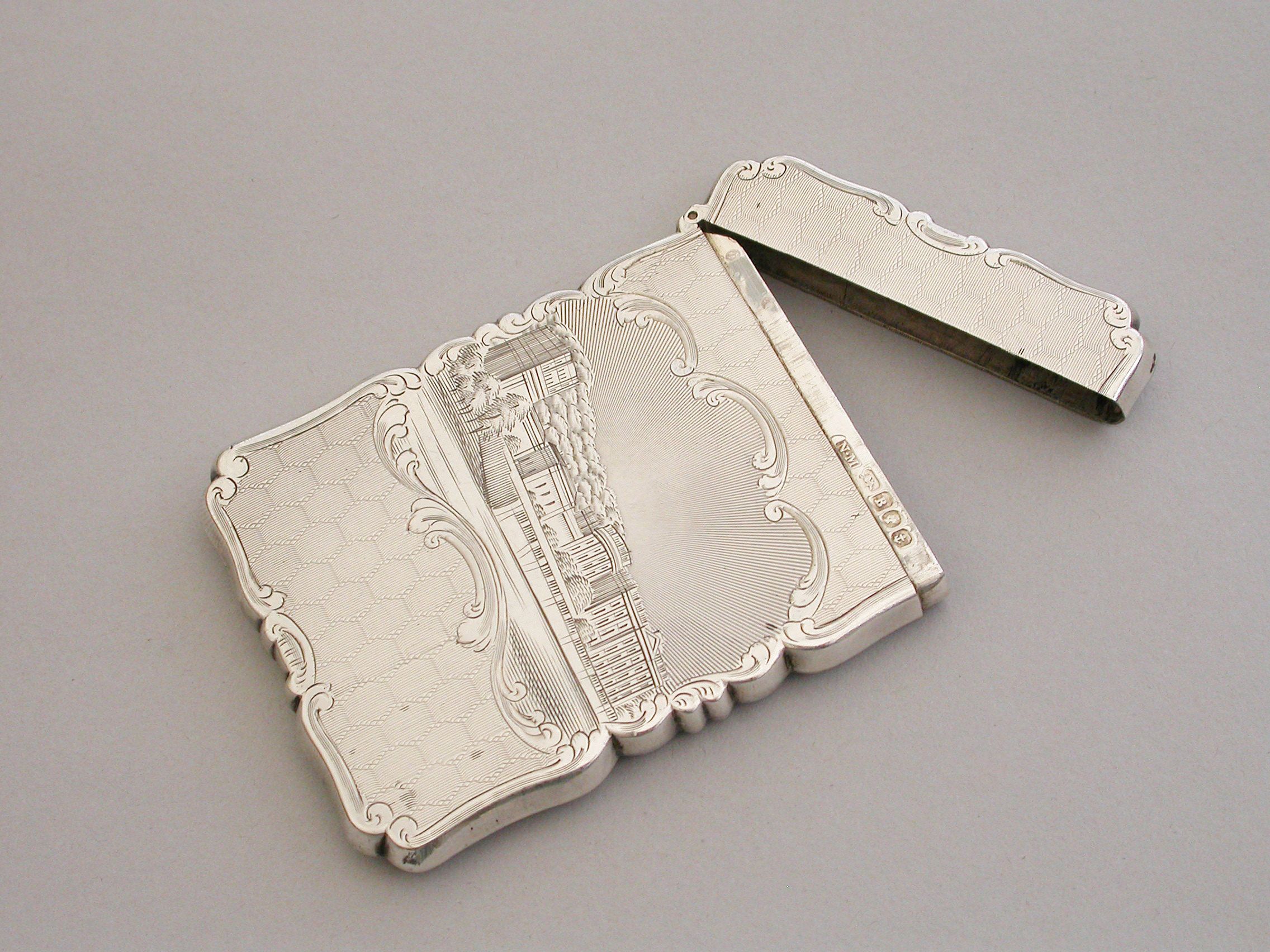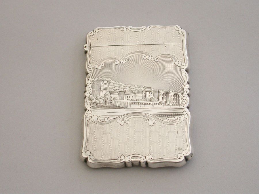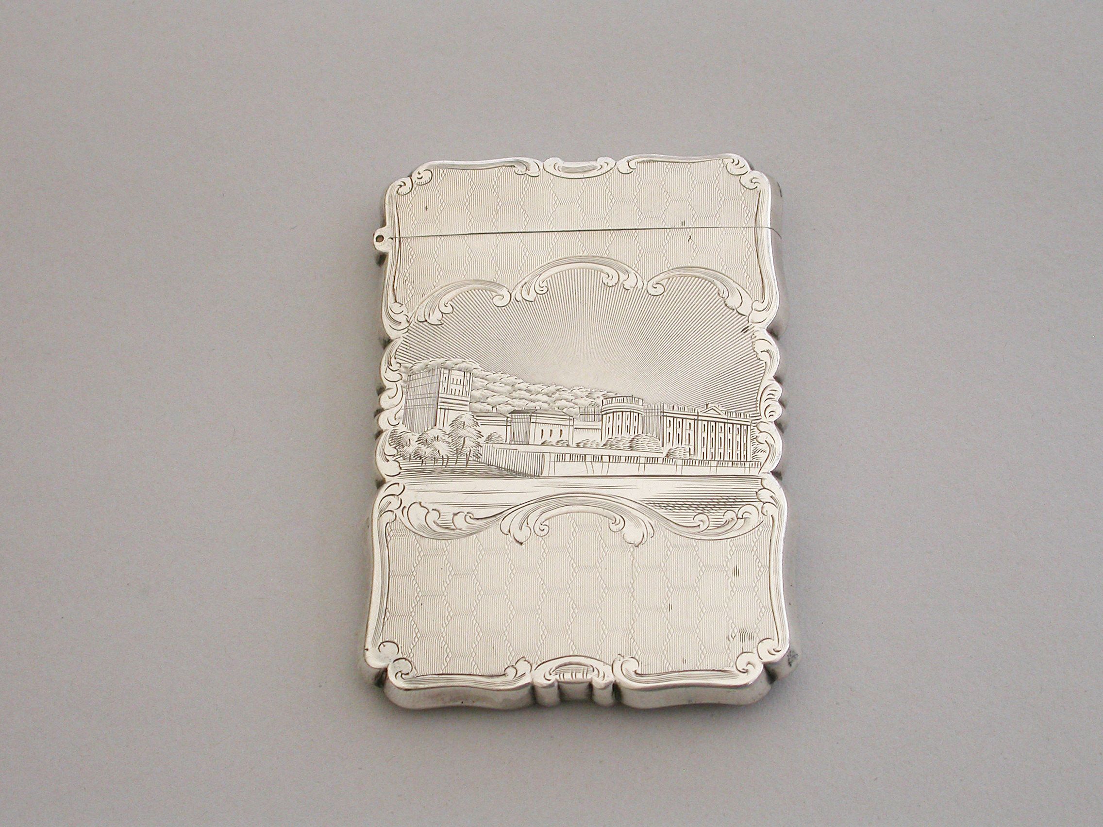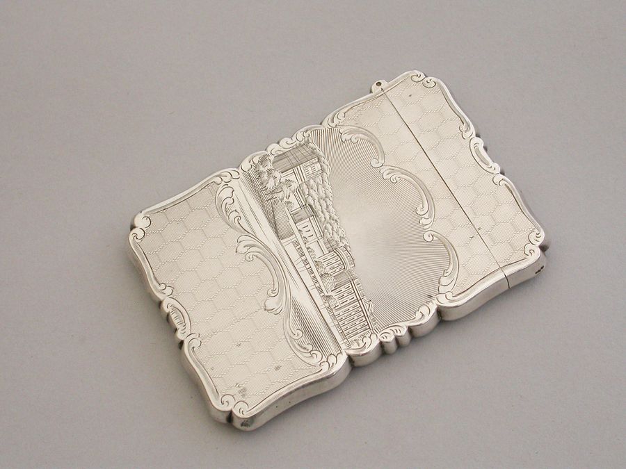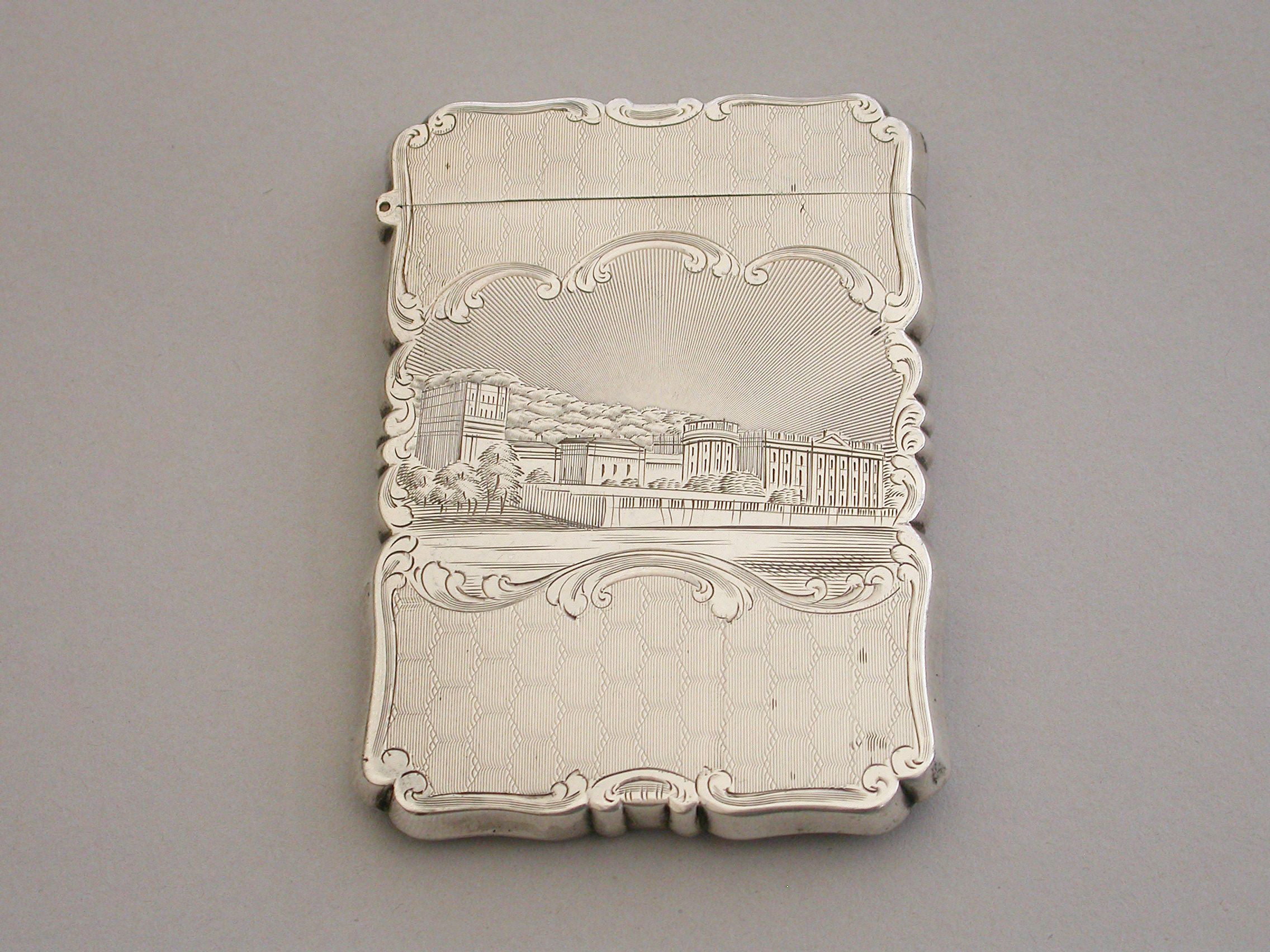 A rare Victorian silver castle-top Card Case of shaped rectangular form with hinged lid, the back and front with engine turned 'crocodile skin' decoration, the face with a shaped vignette engraved with a view of Chatsworth House in Derbyshire. The reverse with a shaped cartouche engraved with contemporary script initials.