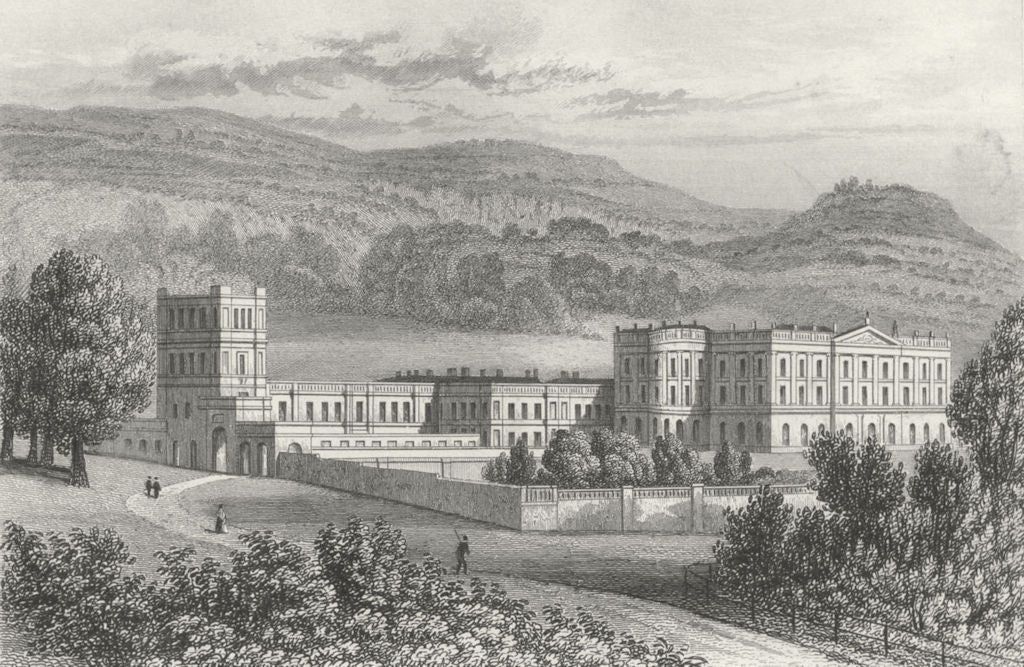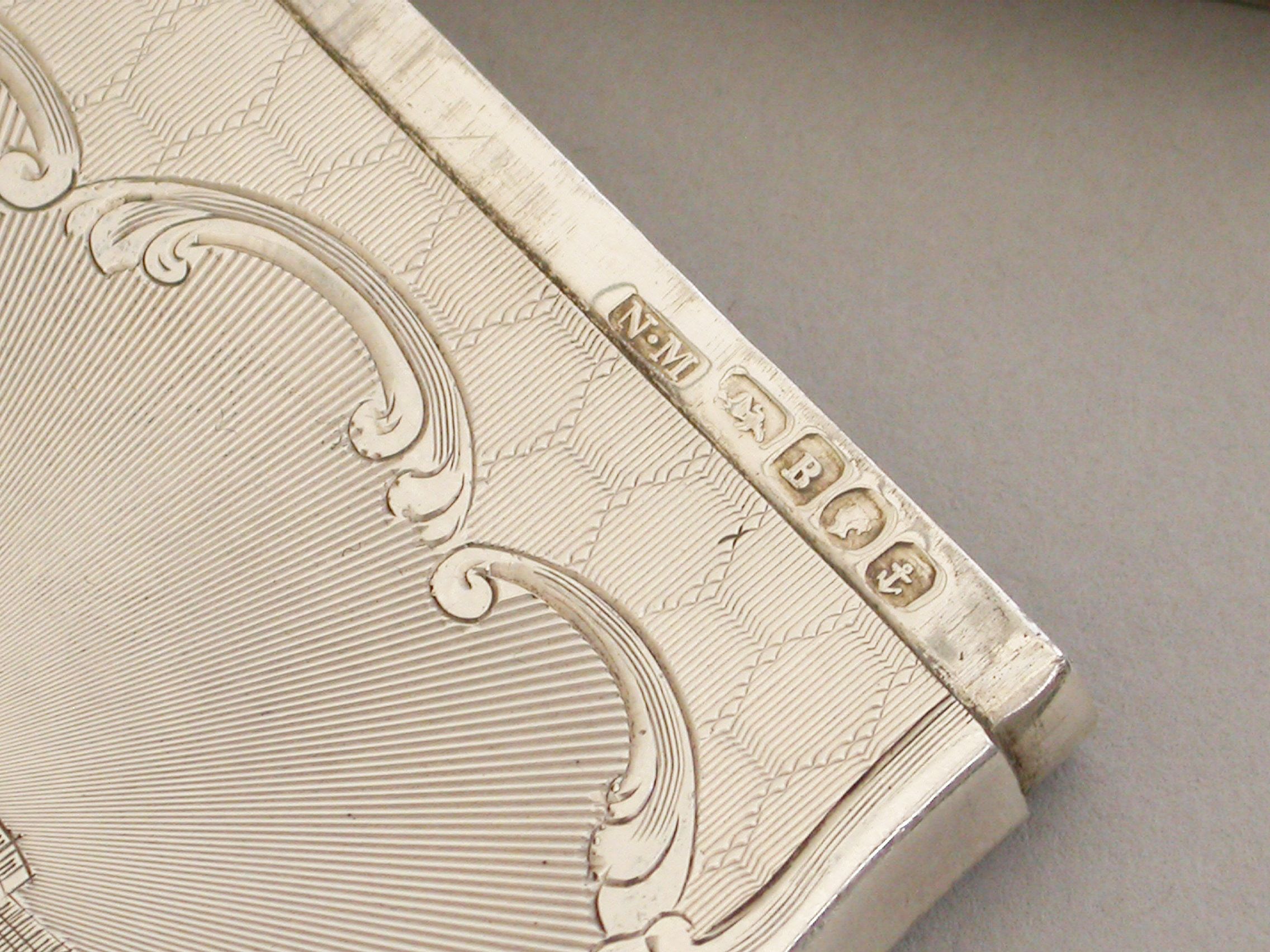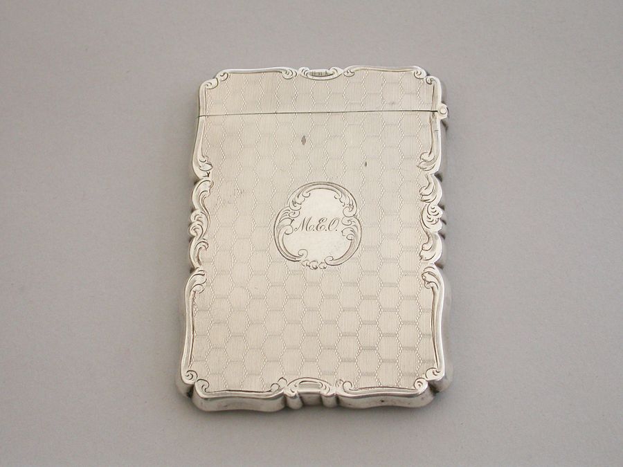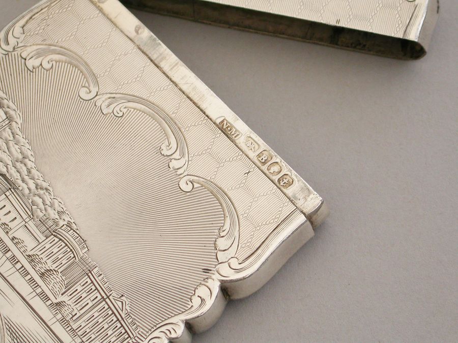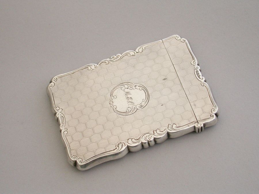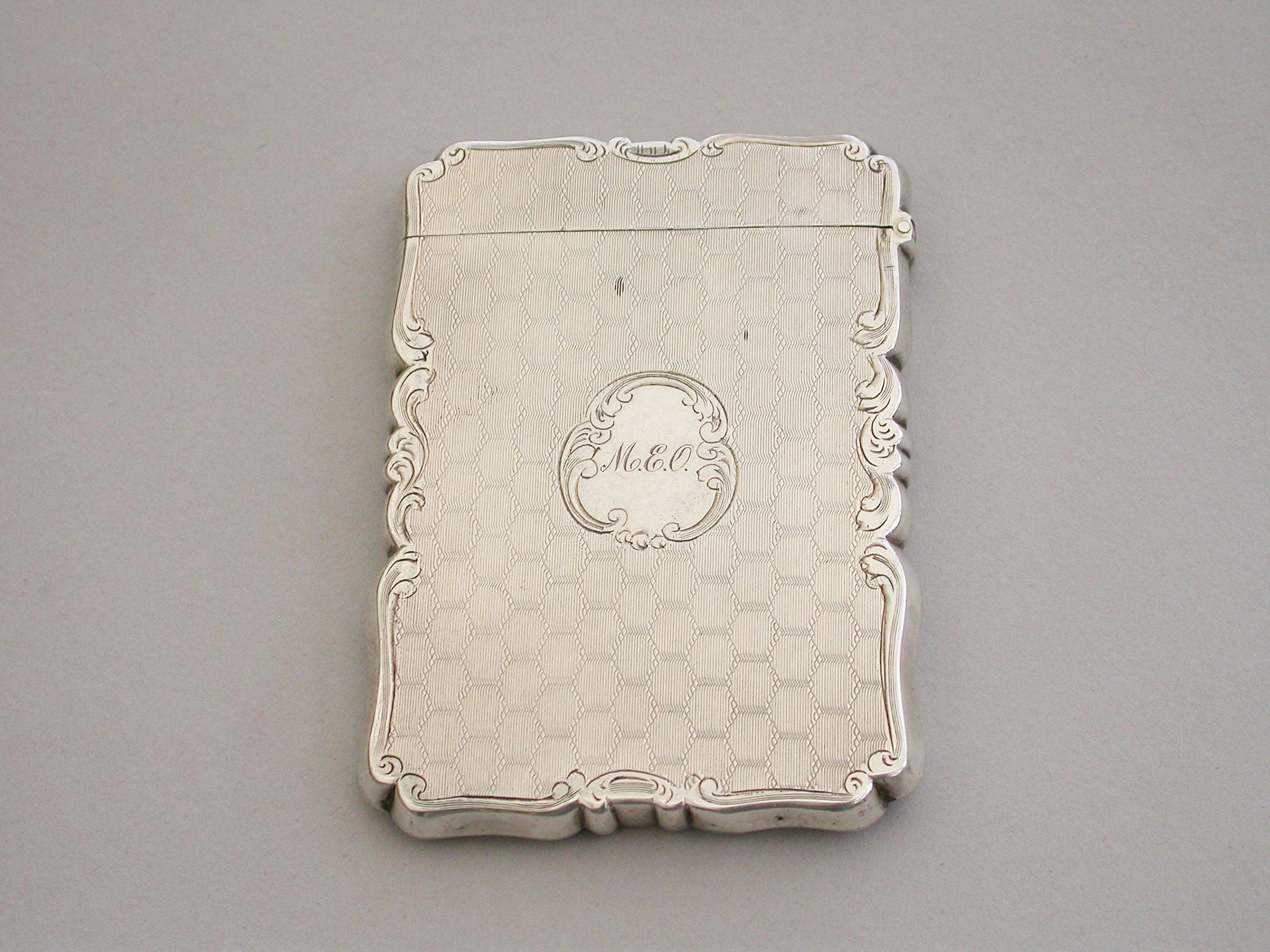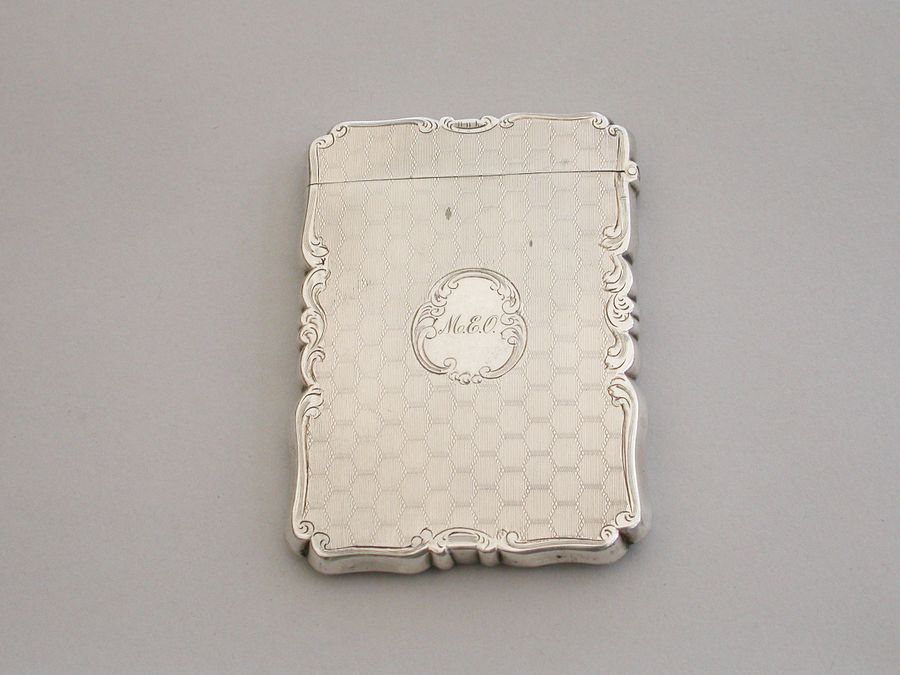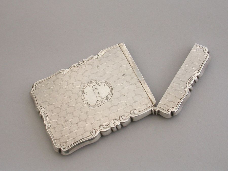A rare Victorian silver castle-top Card Case of shaped rectangular form with hinged lid, the back and front with engine turned 'crocodile skin' decoration, the face with a shaped vignette engraved with a view of Chatsworth House in Derbyshire. The reverse with a shaped cartouche engraved with contemporary script initials.