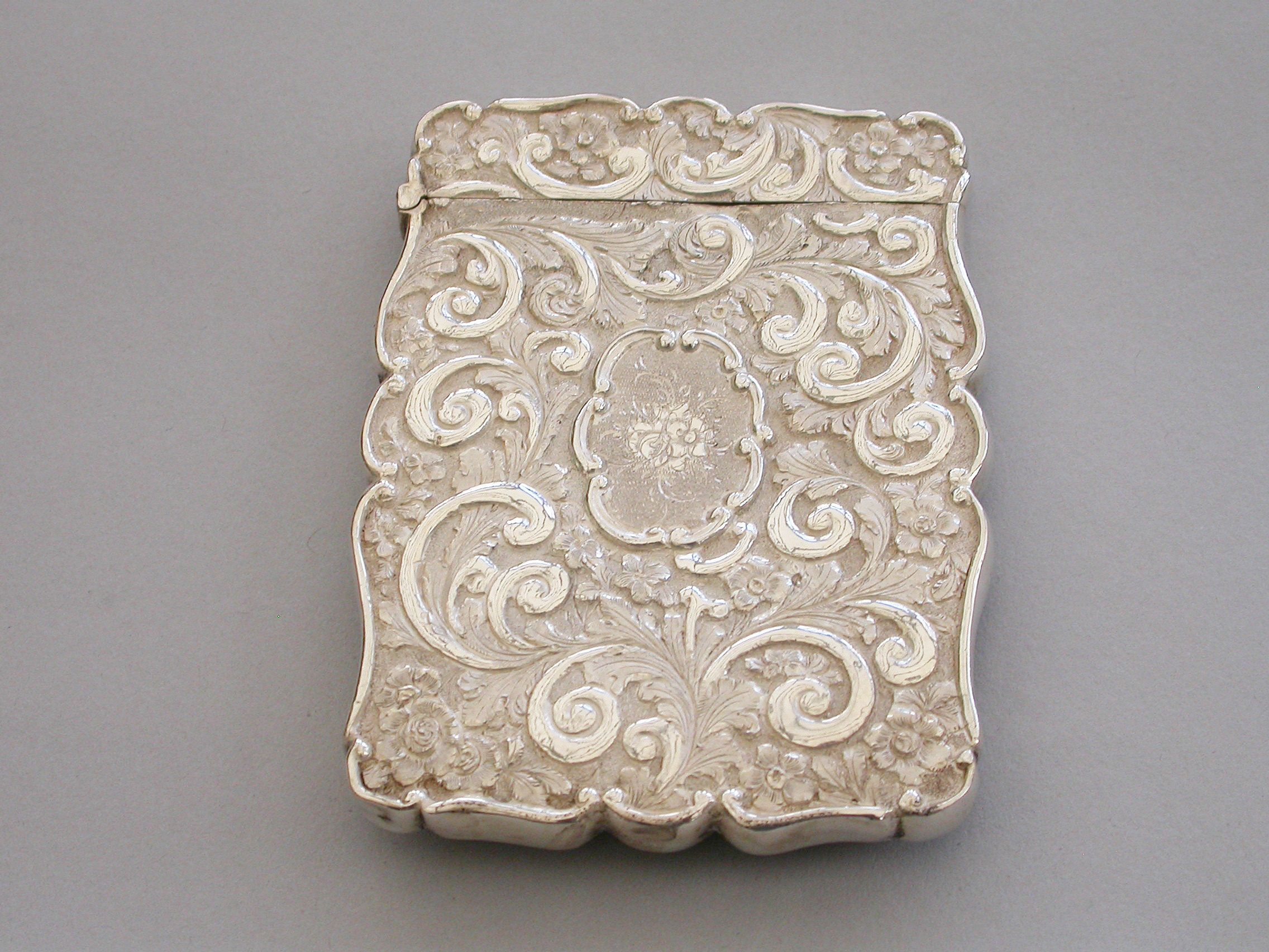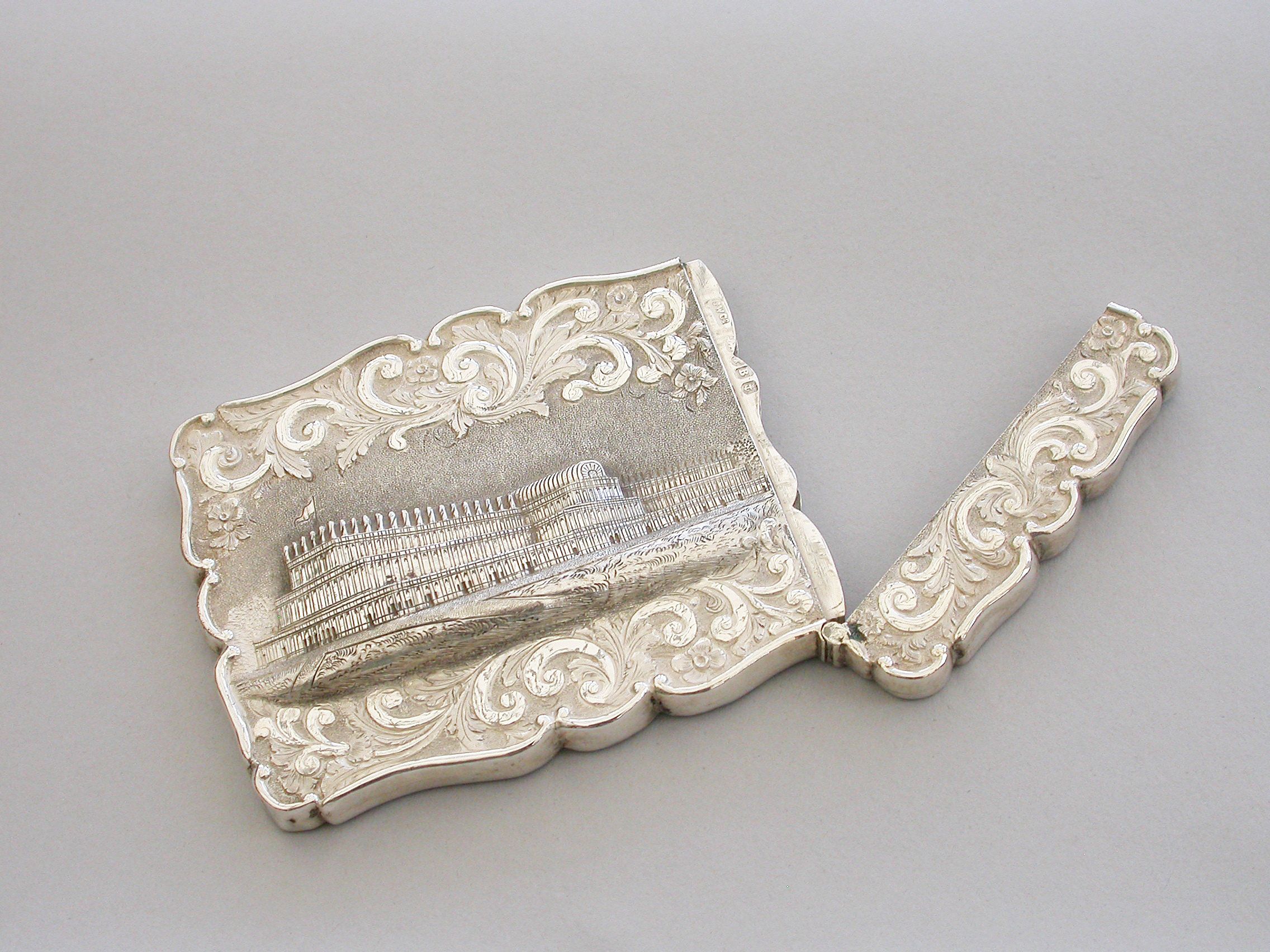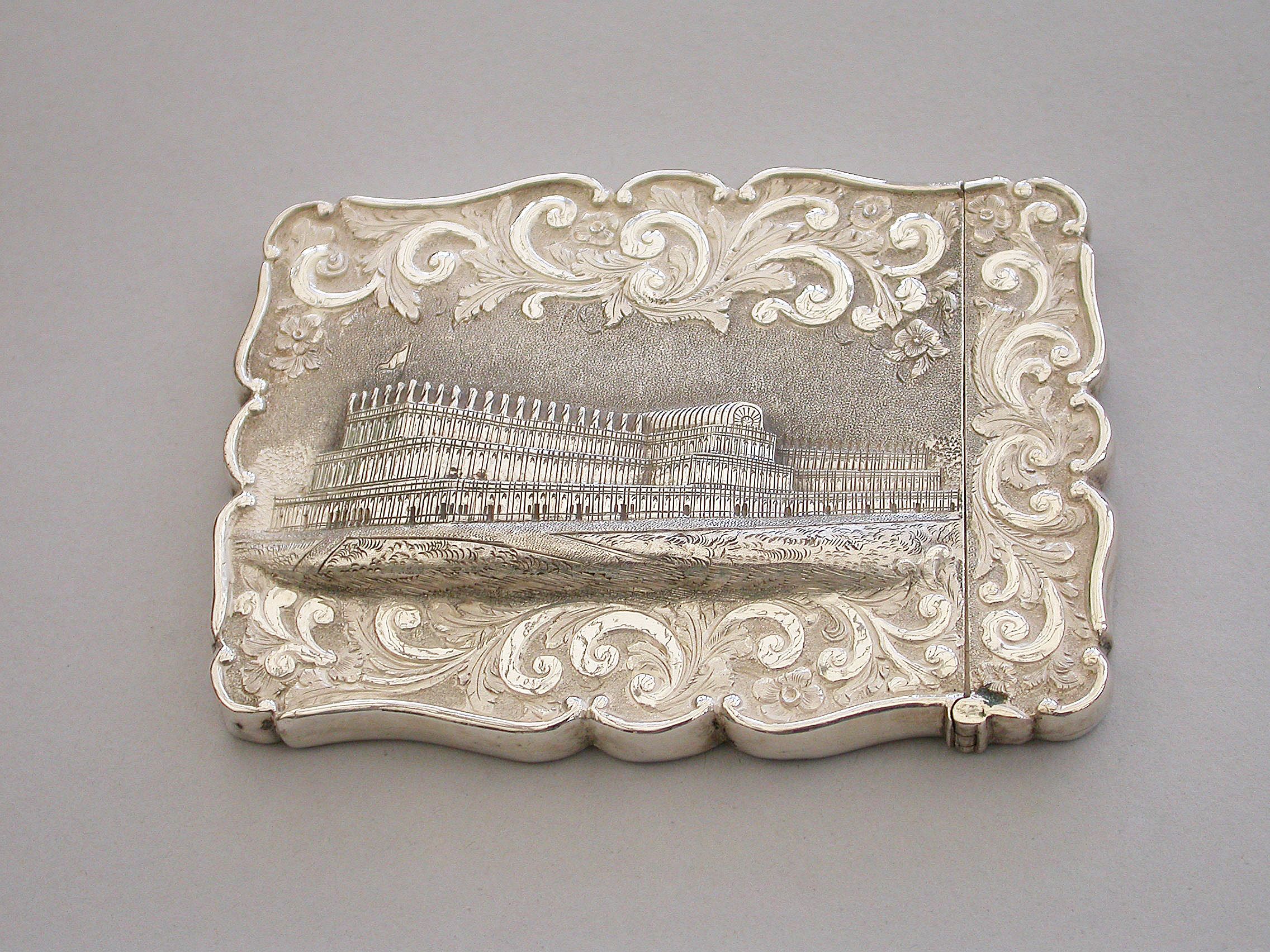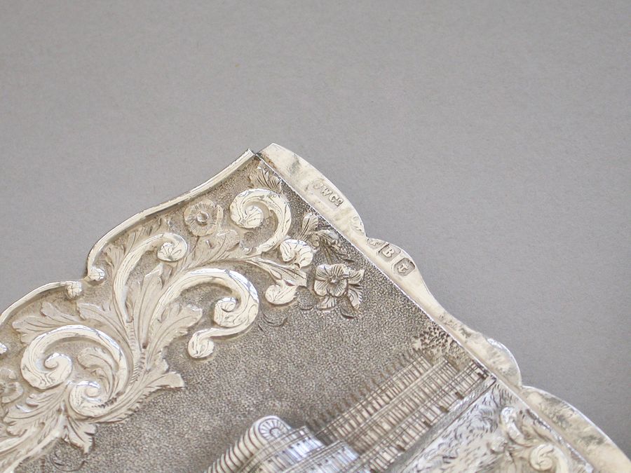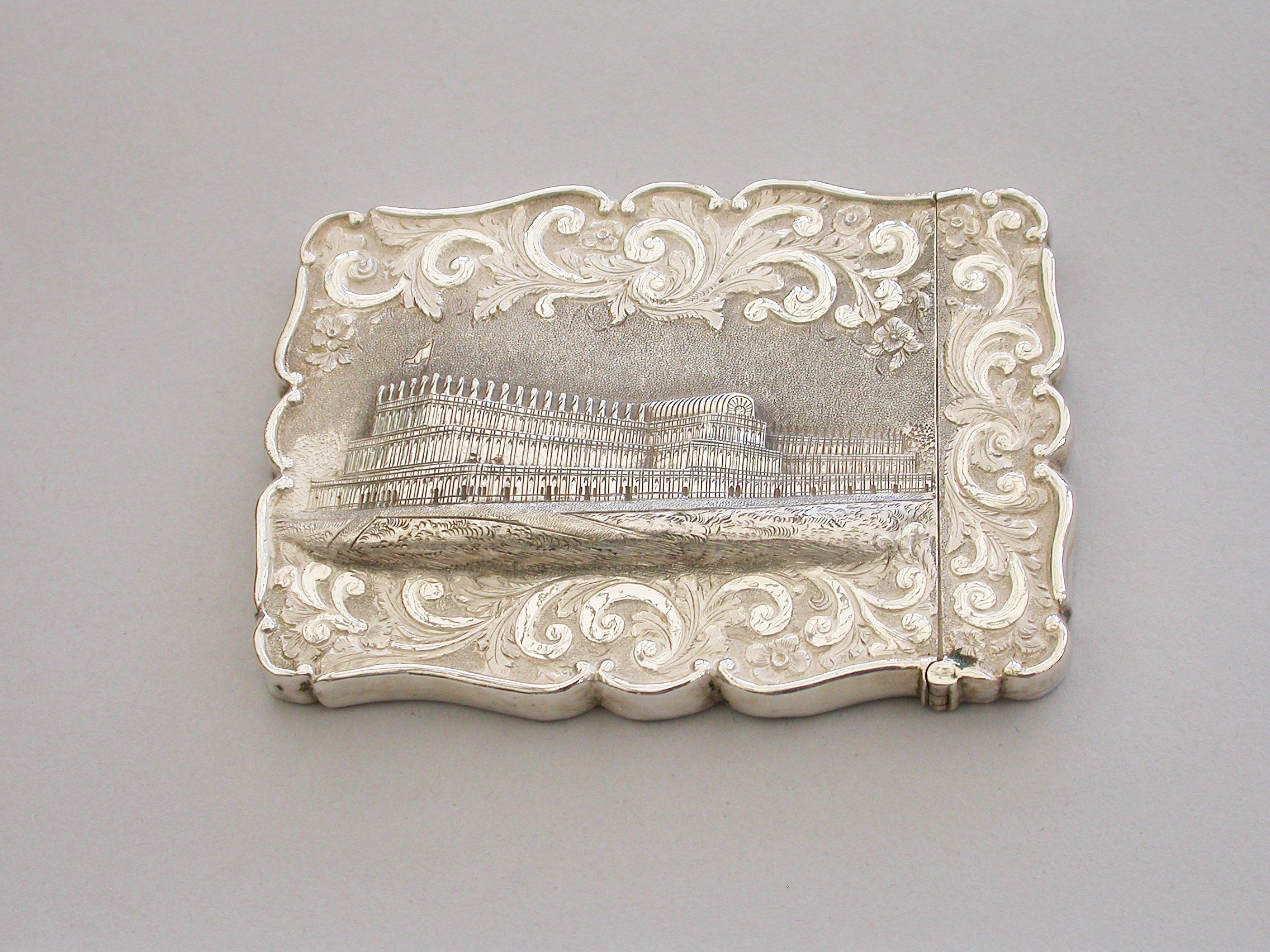 A fine quality Victorian silver castle-top Card Case of shaped rectangular form with hinged lid, chased and embossed with foliate scroll decoration to both sides, the front embossed with a scene depicting Crystal Palace in high relief and in landscape rather than portrait format.