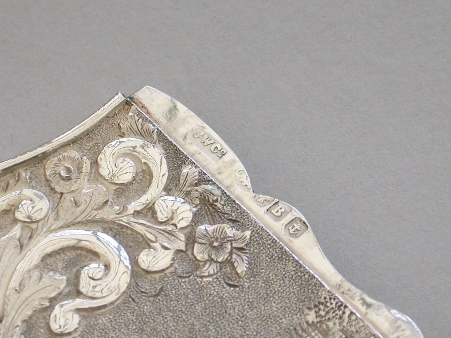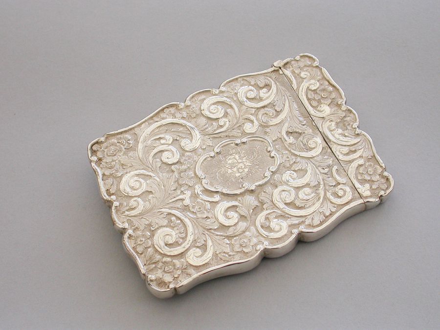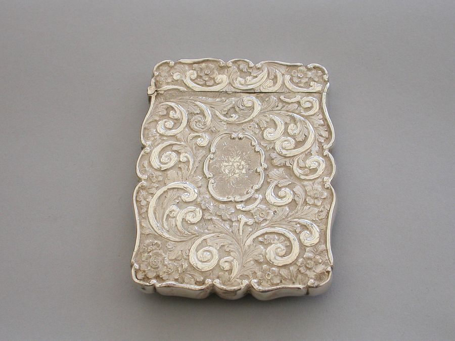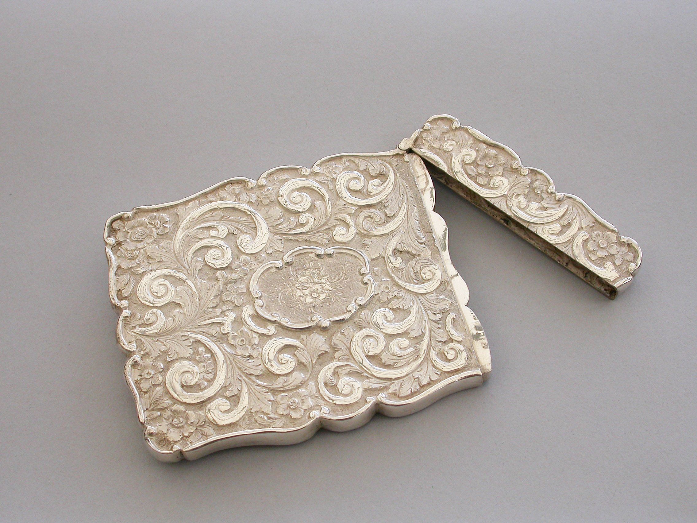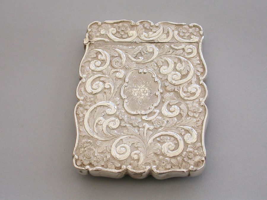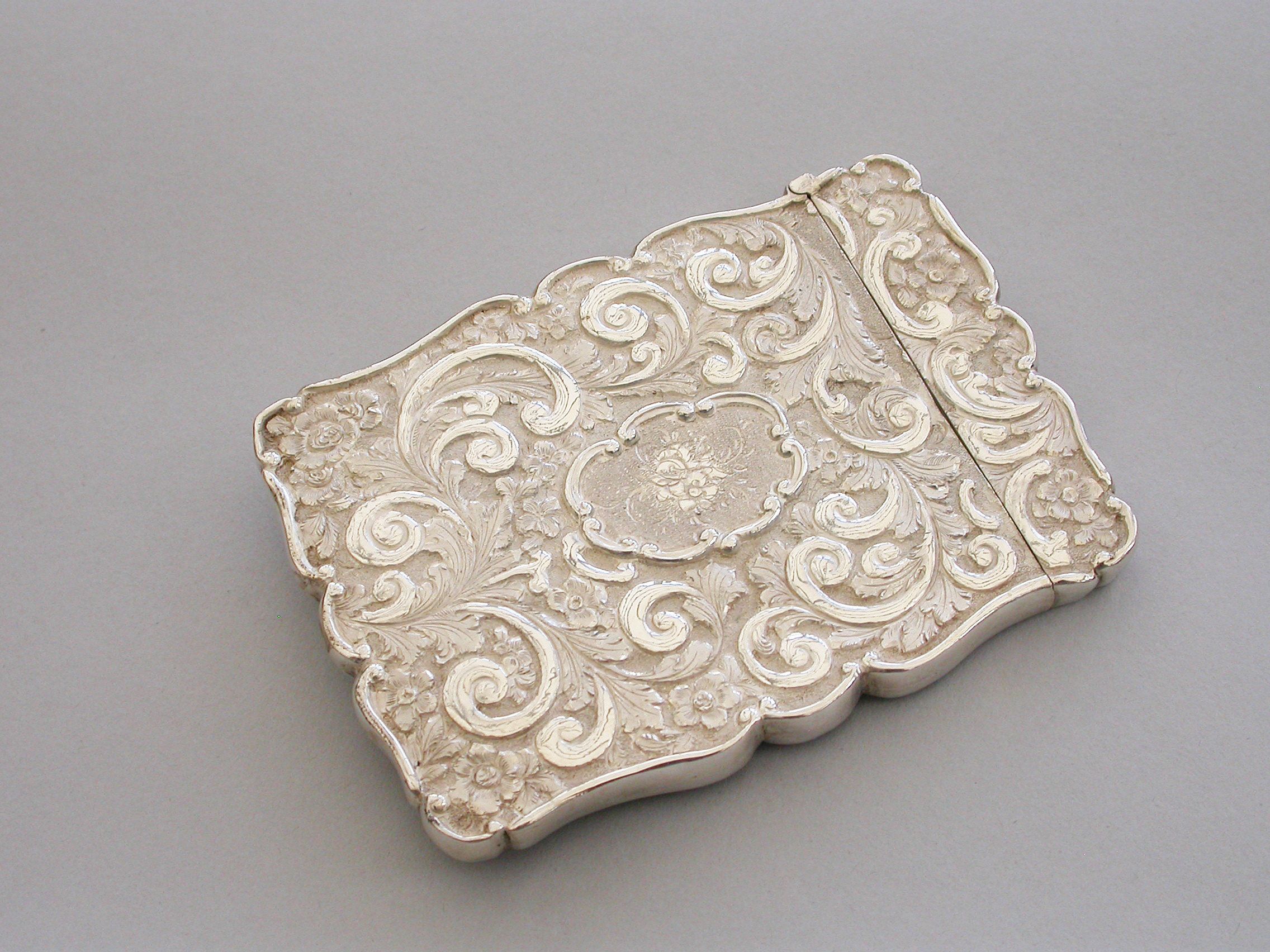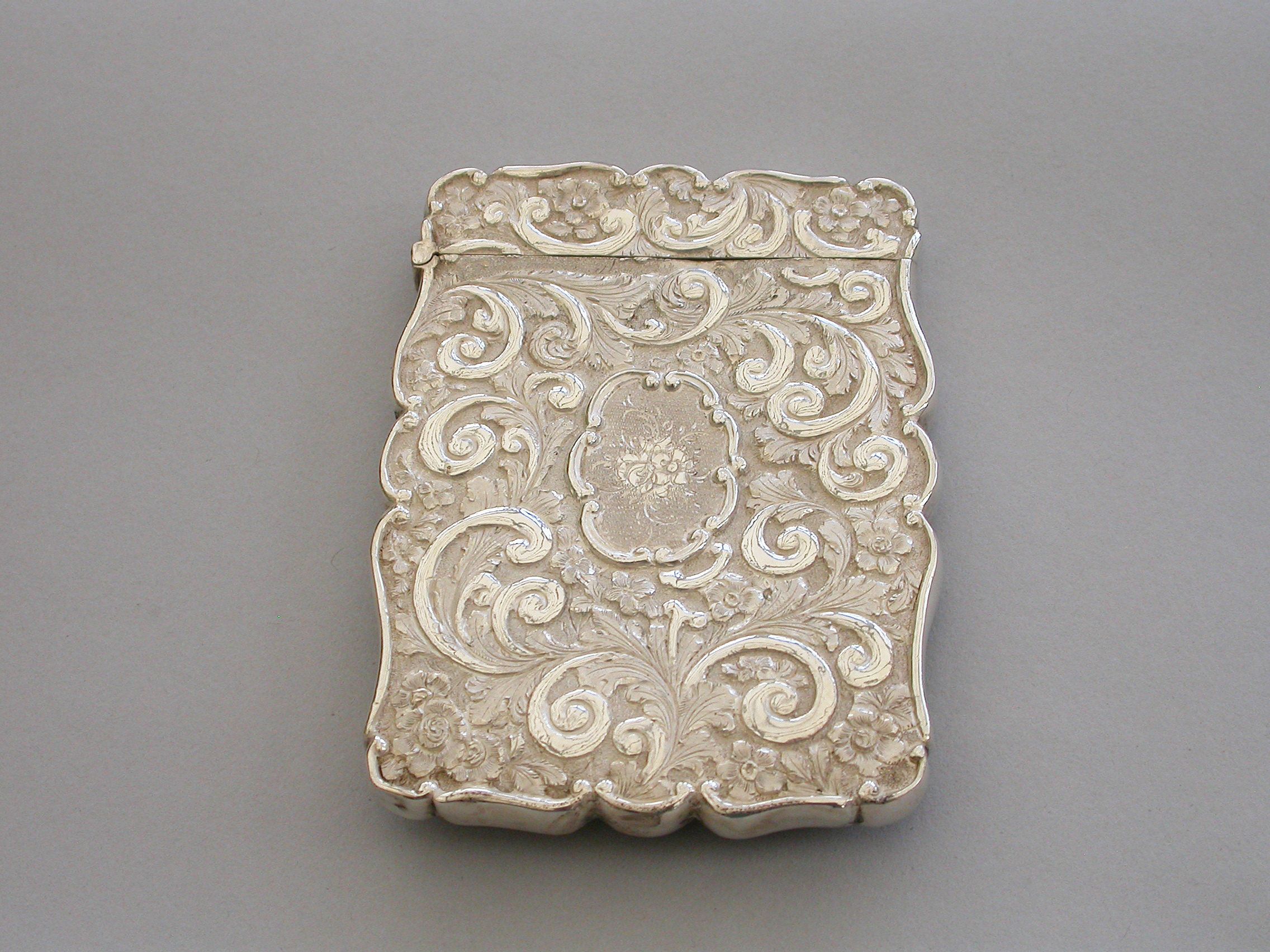 A fine quality Victorian silver castle-top Card Case of shaped rectangular form with hinged lid, chased and embossed with foliate scroll decoration to both sides, the front embossed with a scene depicting Crystal Palace in high relief and in landscape rather than portrait format.