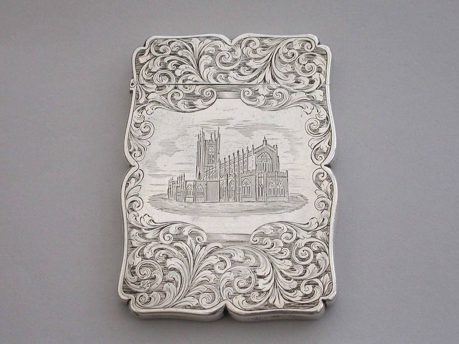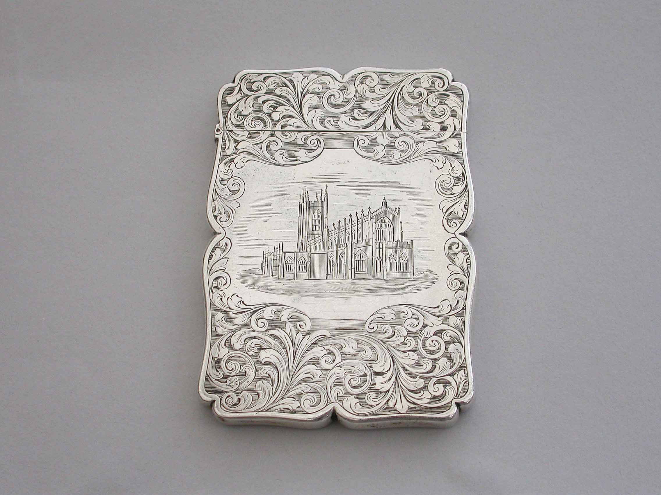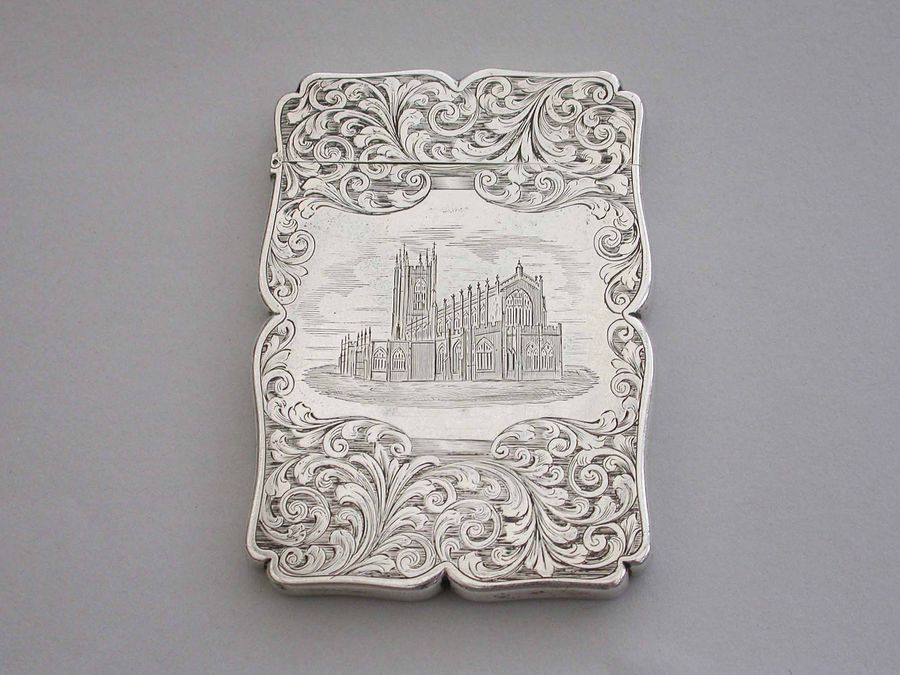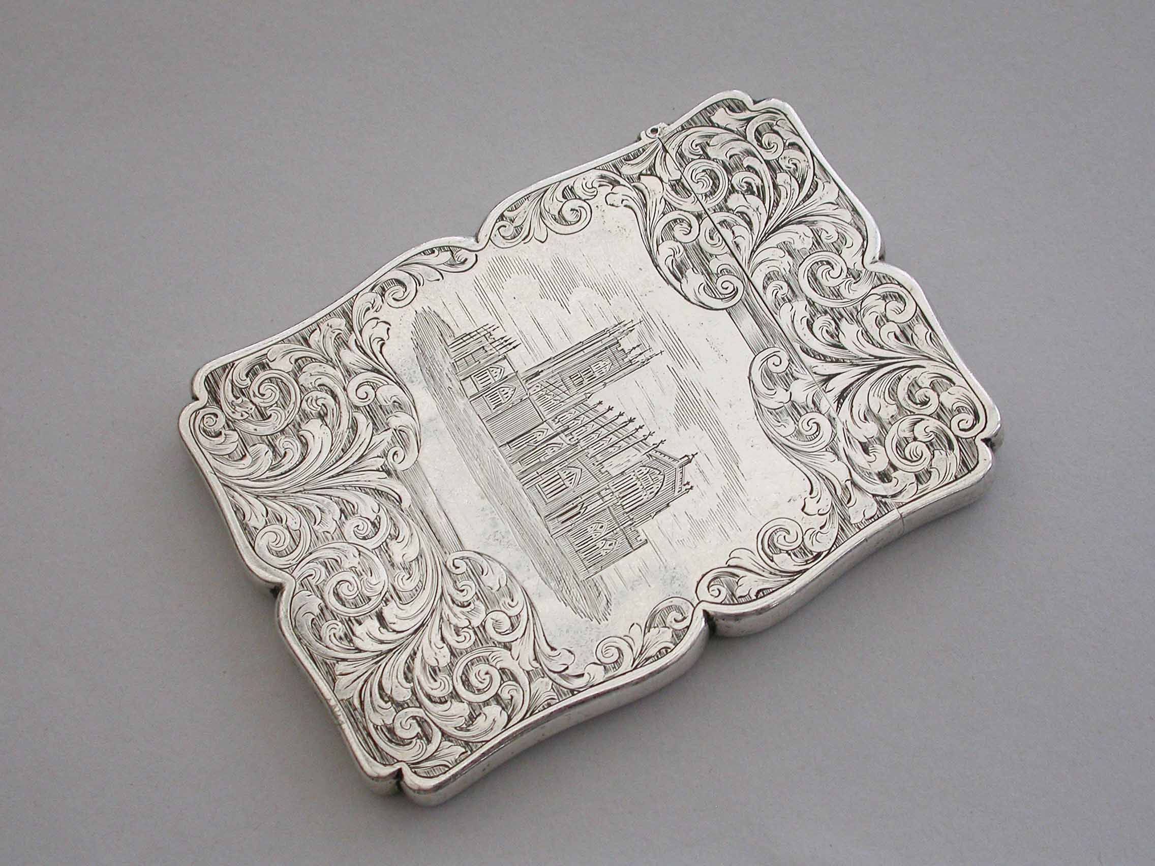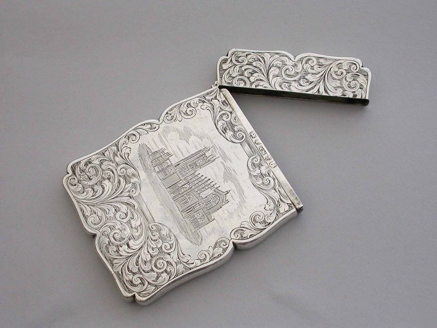 An extremely rare Victorian silver “Castle Top” Card Case, of shaped rectangular form with engraved foliate scroll decoration and a vacant shield shaped cartouche to the reverse, the front with an engraved scene depicting the Collegiate Church in Manchester, before it became Manchester Cathedral in 1847.