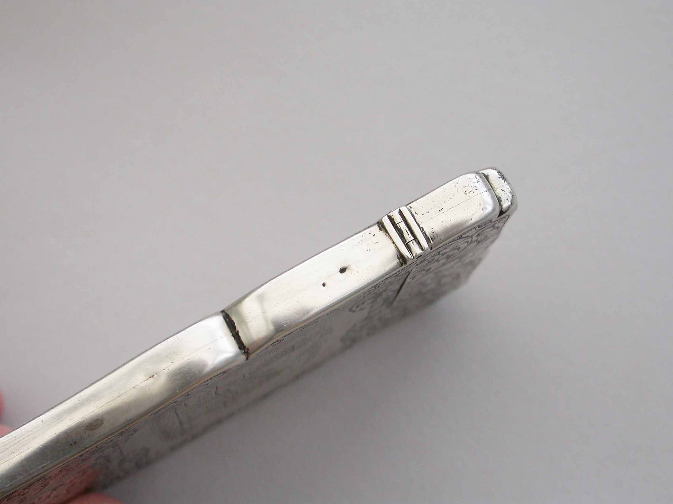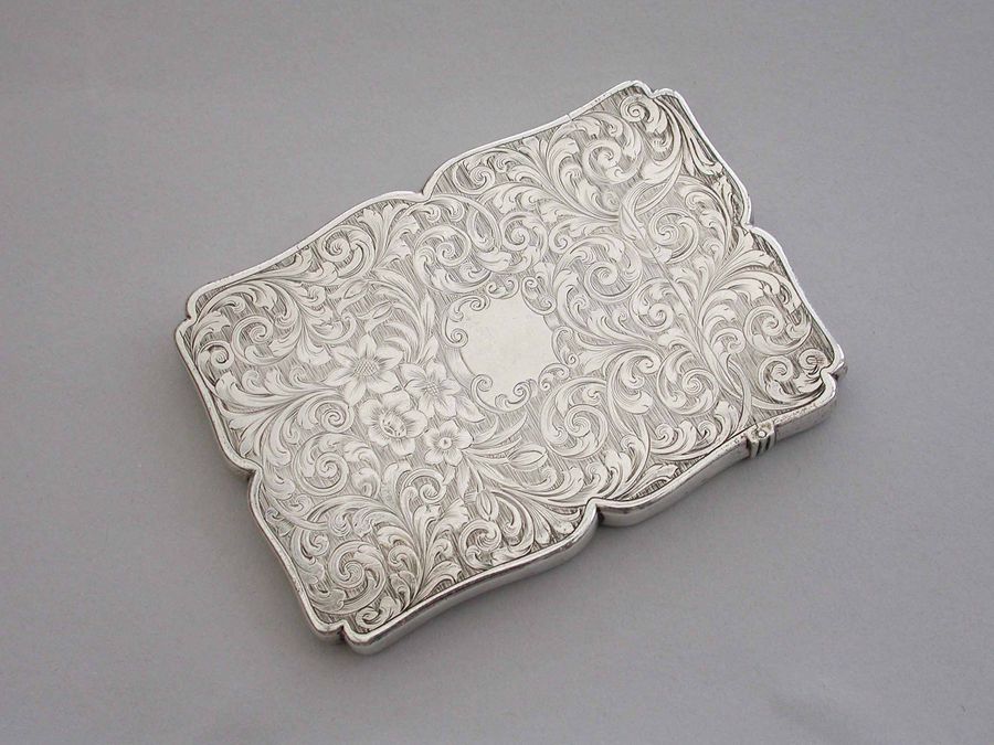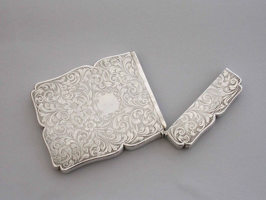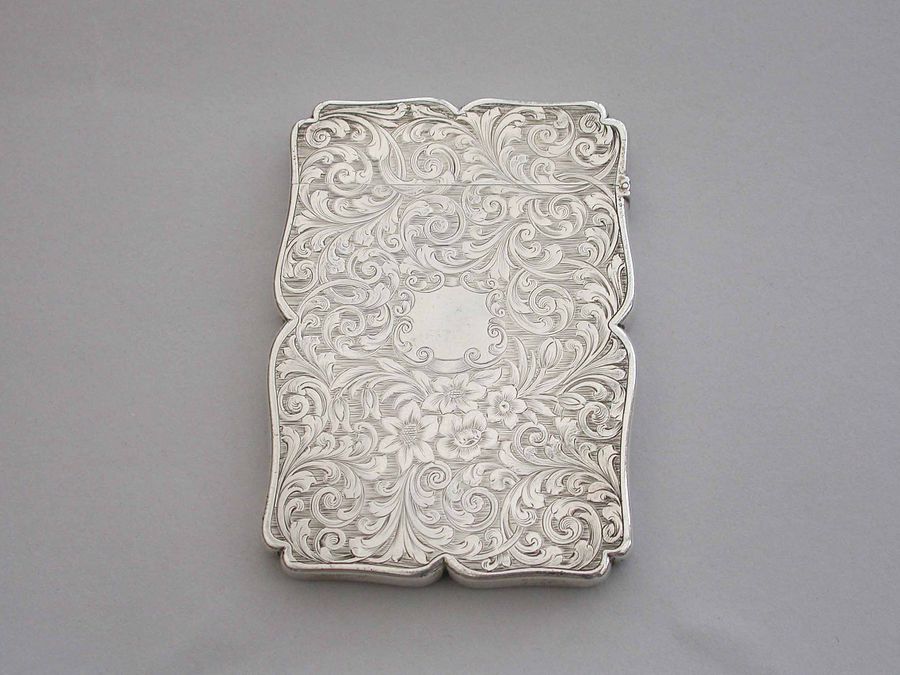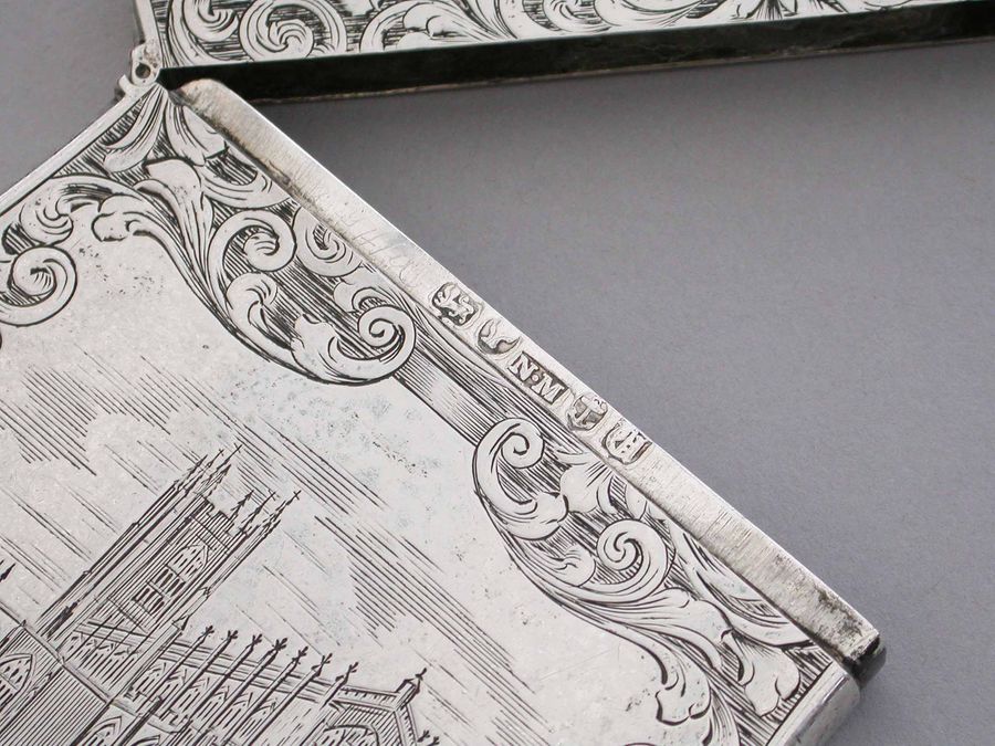 An extremely rare Victorian silver “Castle Top” Card Case, of shaped rectangular form with engraved foliate scroll decoration and a vacant shield shaped cartouche to the reverse, the front with an engraved scene depicting the Collegiate Church in Manchester, before it became Manchester Cathedral in 1847.