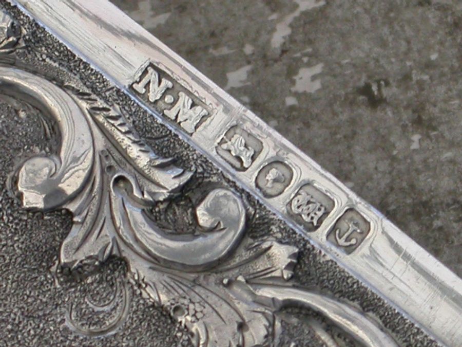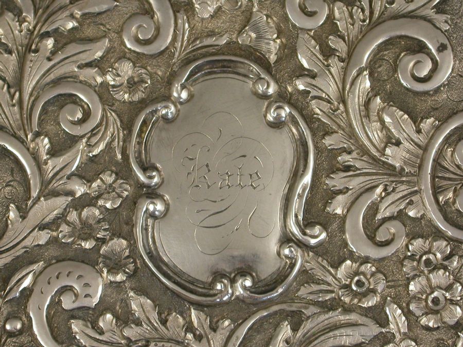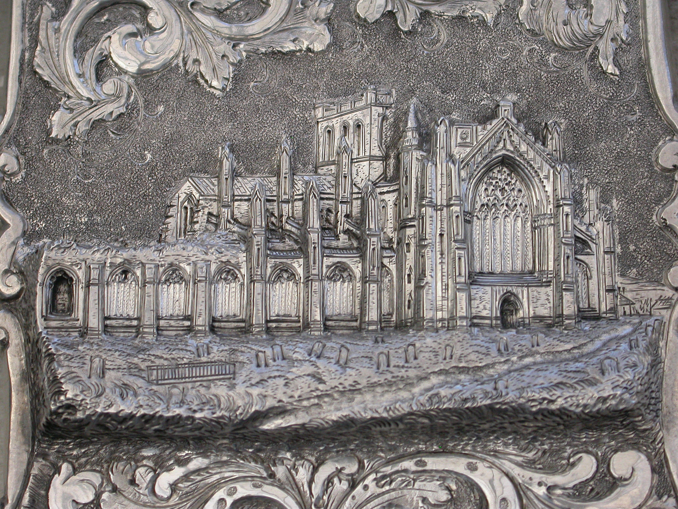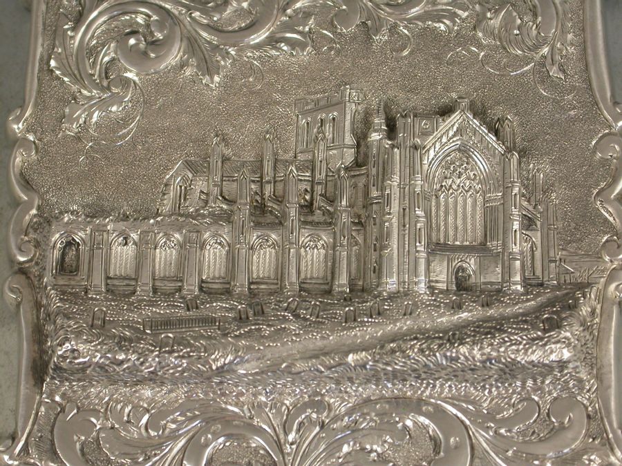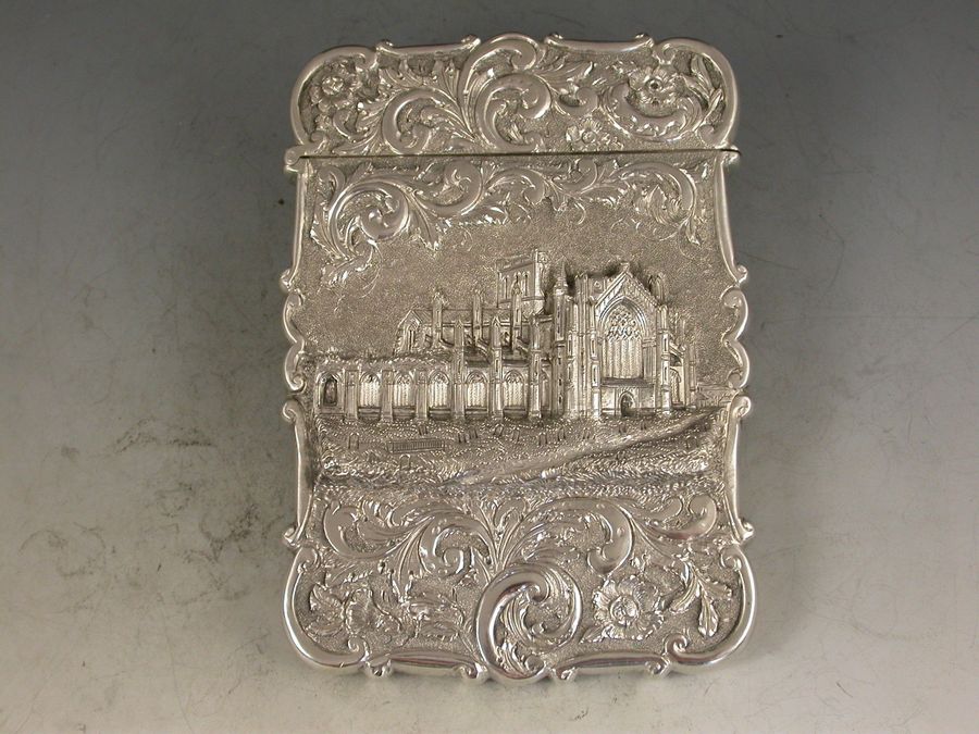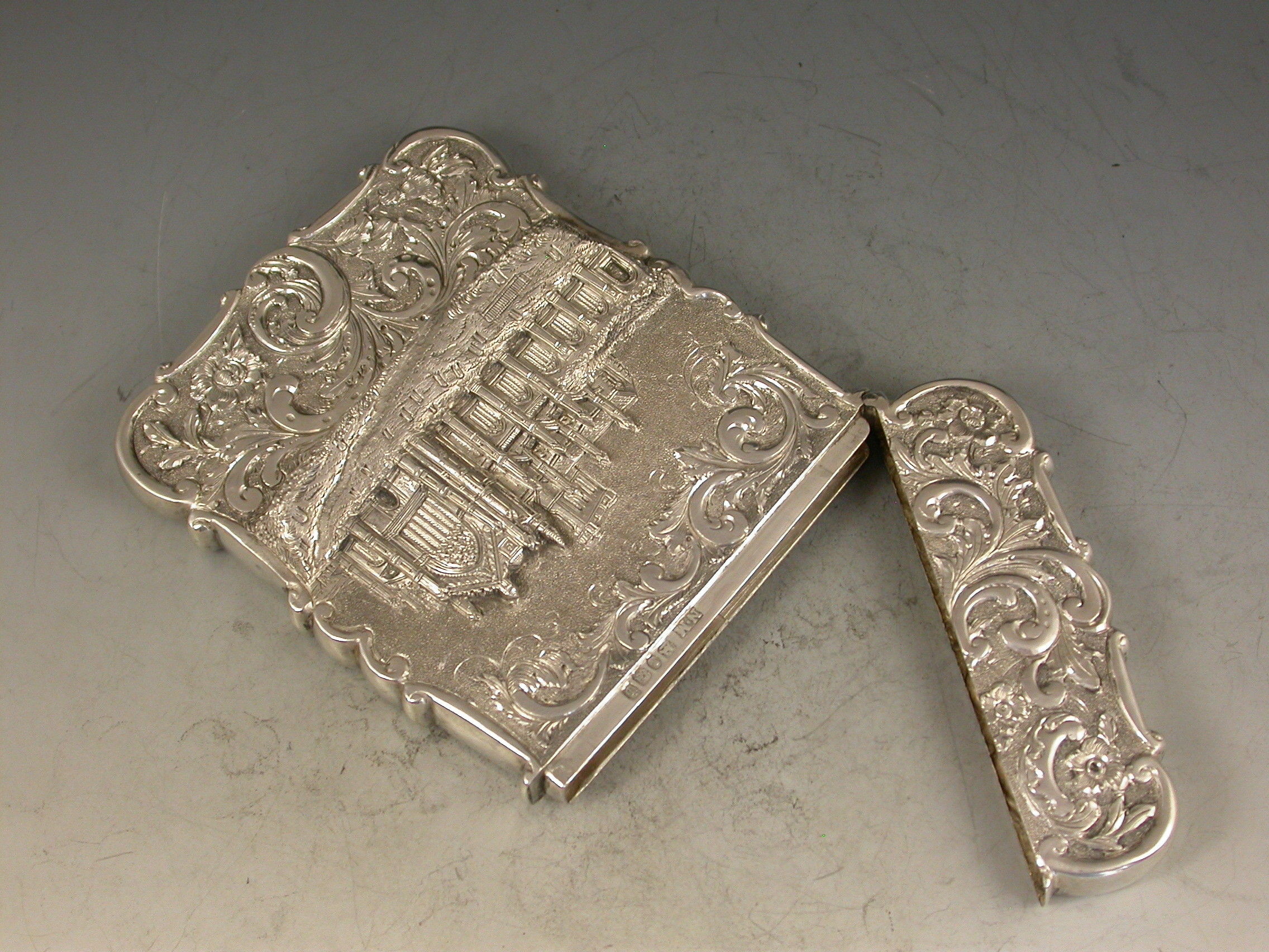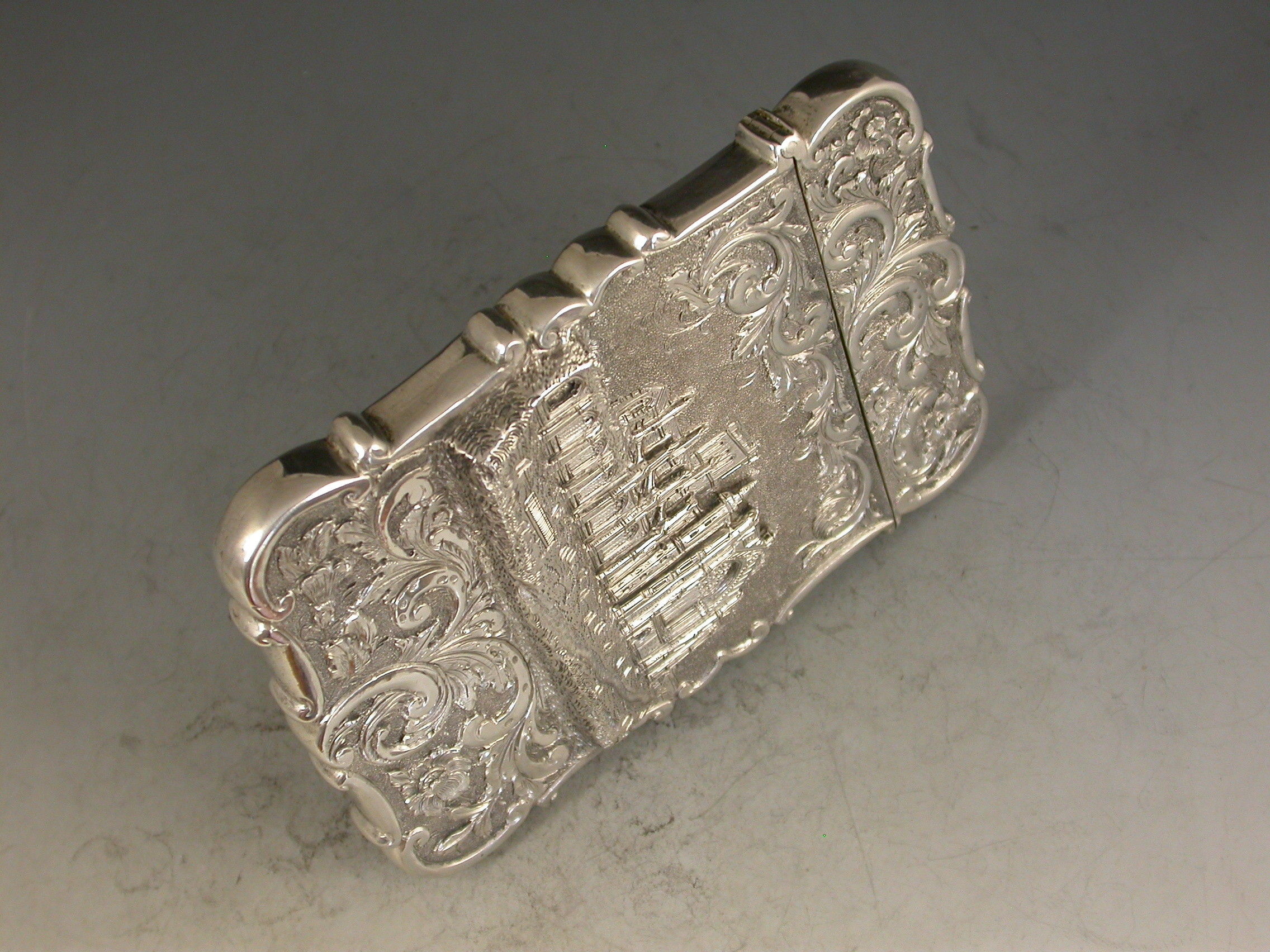 An extremely fine and rare Victorian silver 'Castle Top' Card Case, chased with a view of Melrose Abbey in Roxburghshire, Scotland, in high relief, surrounded by foliate scroll decoration on a matt background to the back and the front. A cartouche to the reverse engraved with a contemporary inscription ""Kate"".