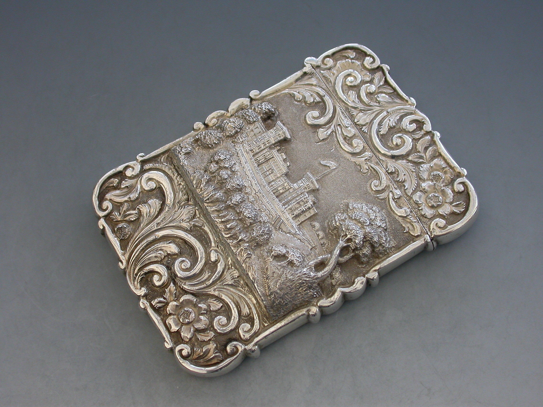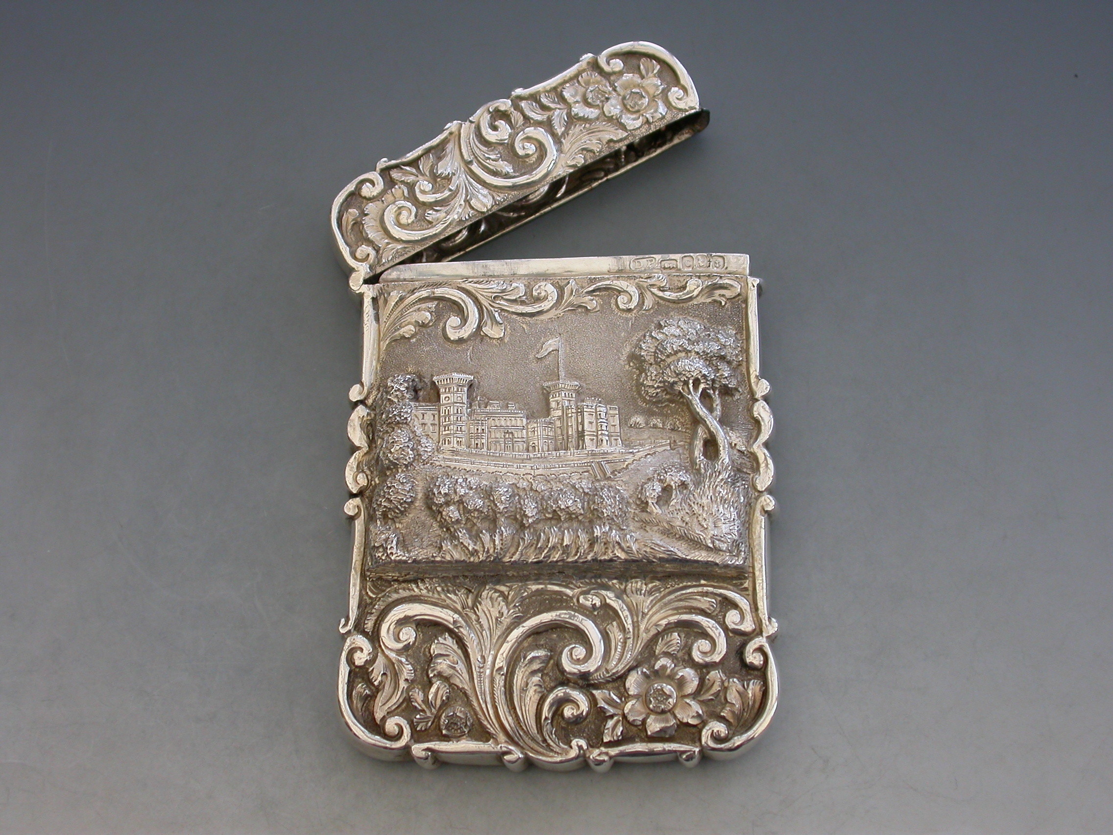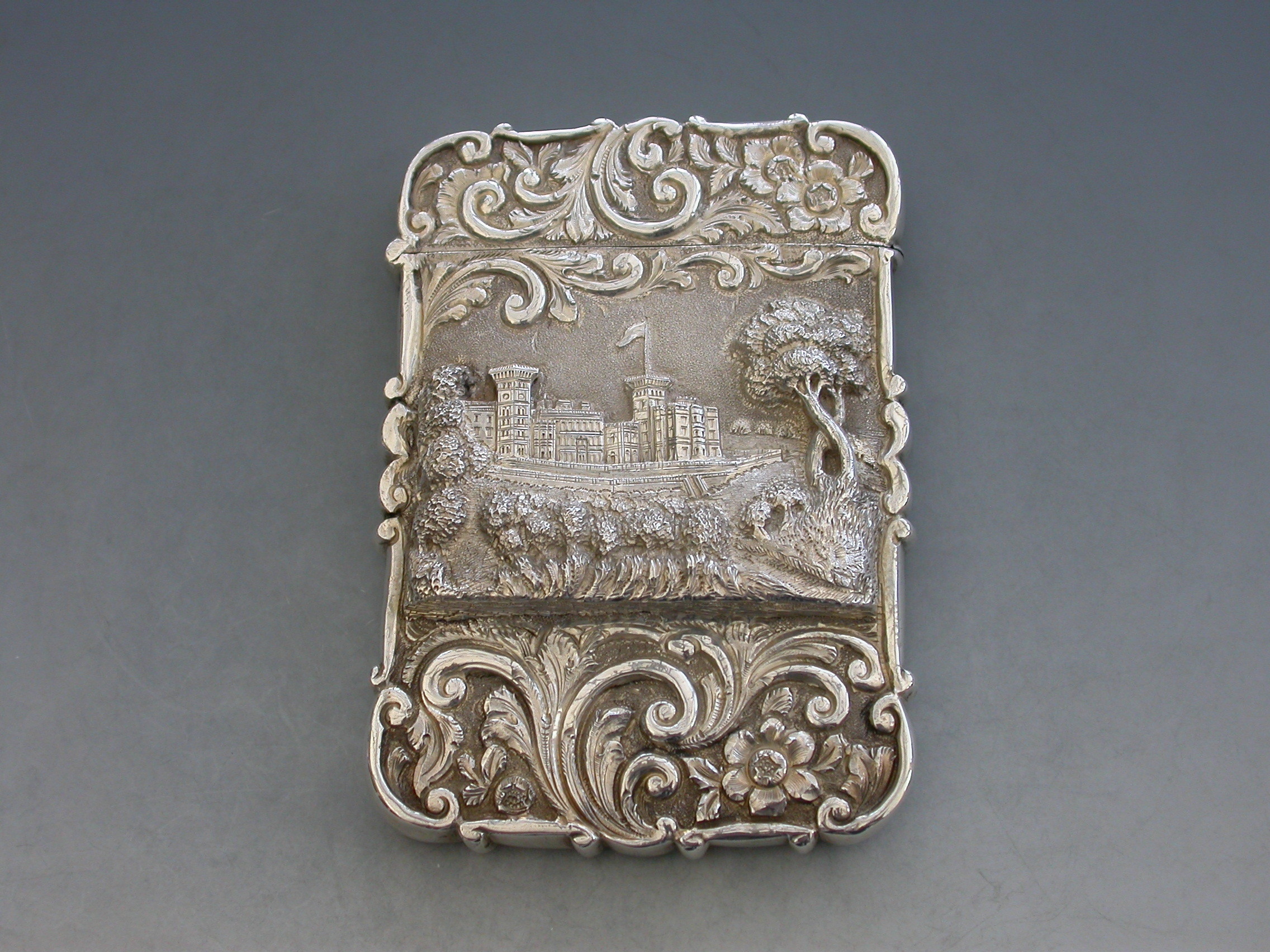 An extremely rare Victorian Castle-Top Card Case of shaped rectangular form with chased and embossed foliate scroll decoration, the front with a scene depicting an unusual view of Osborne House from the Shrubbery in high relief. The reverse with a vacant shaped cartouche.