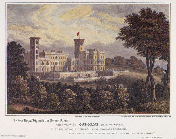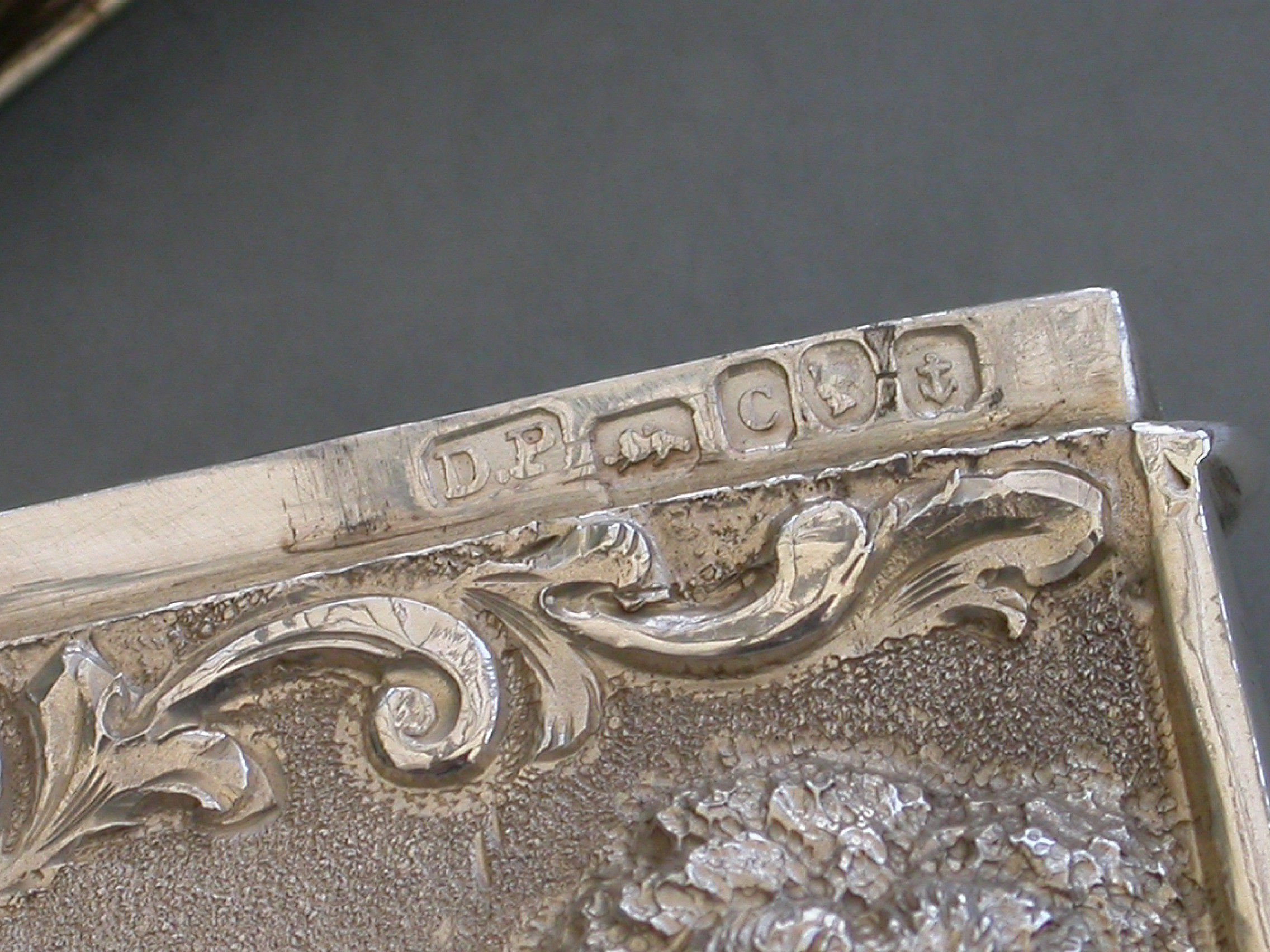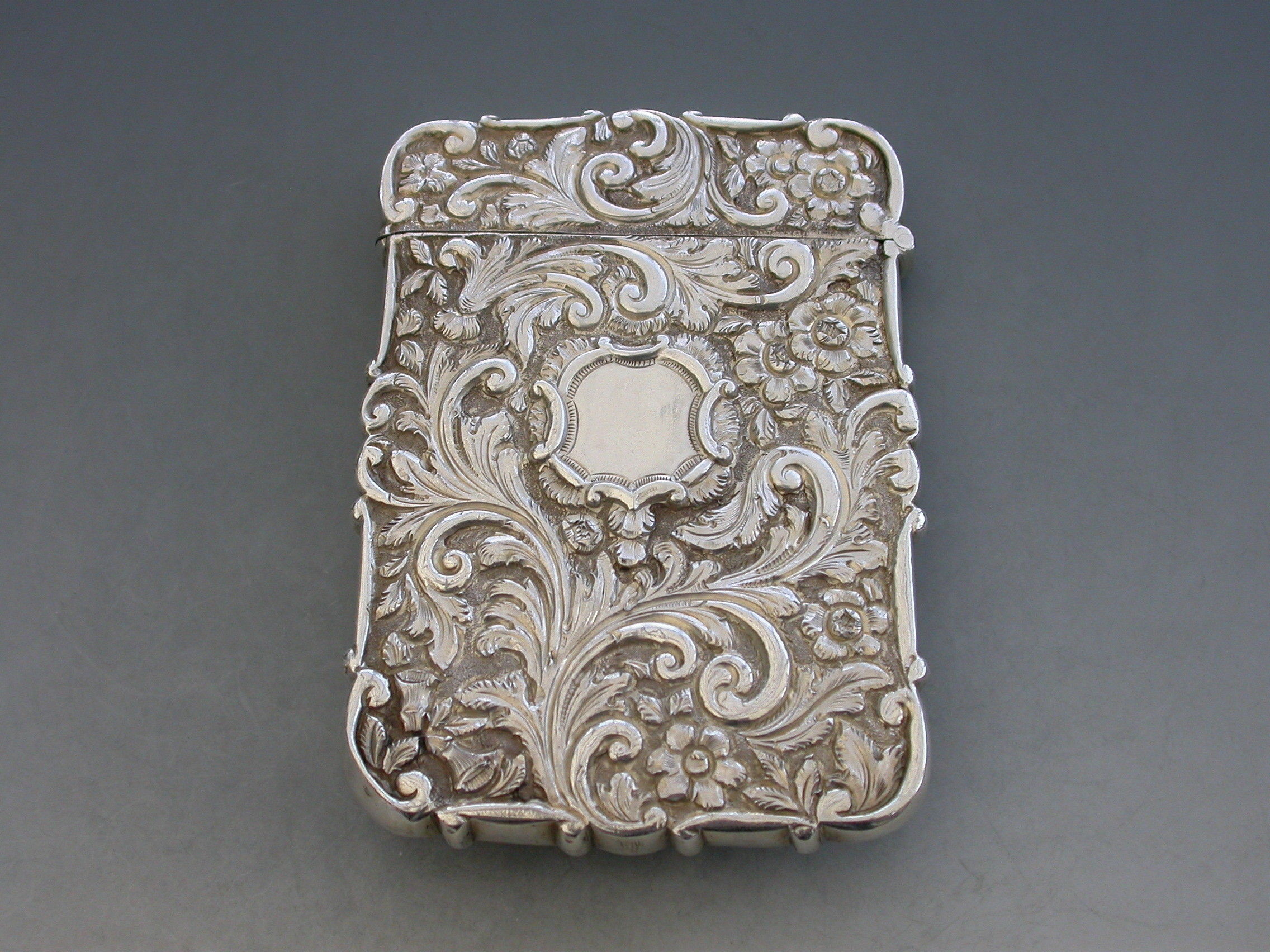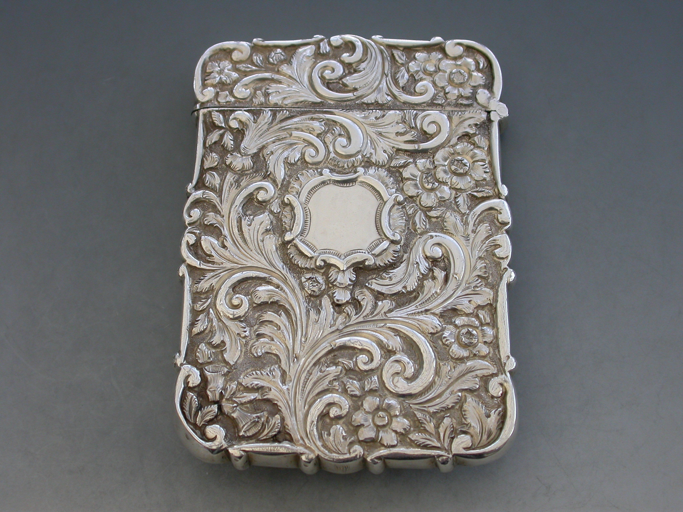 An extremely rare Victorian Castle-Top Card Case of shaped rectangular form with chased and embossed foliate scroll decoration, the front with a scene depicting an unusual view of Osborne House from the Shrubbery in high relief. The reverse with a vacant shaped cartouche.