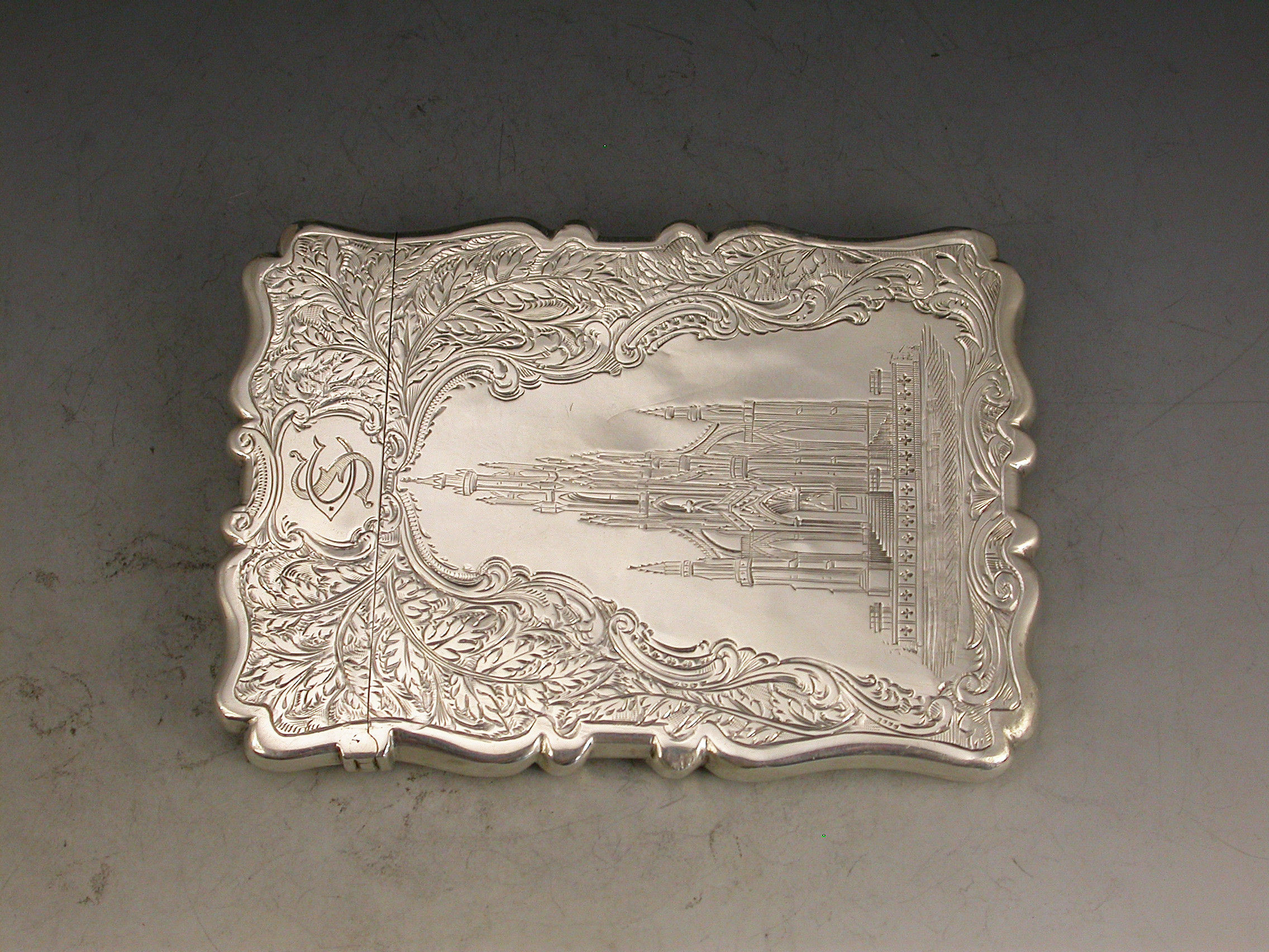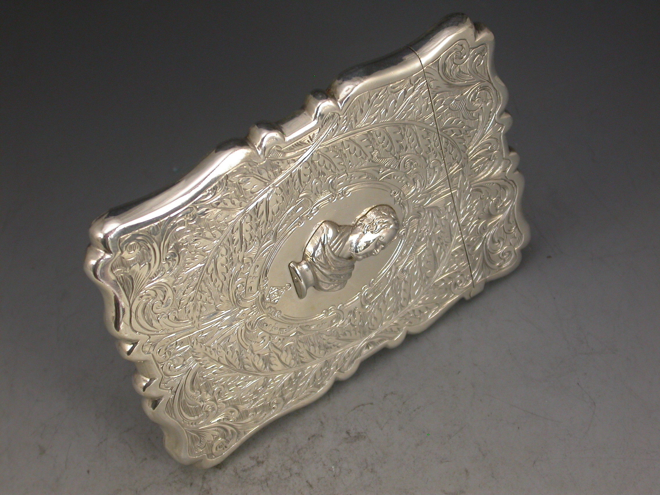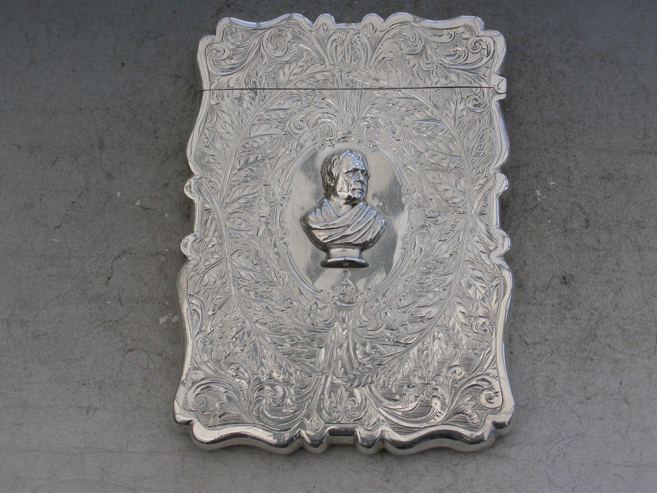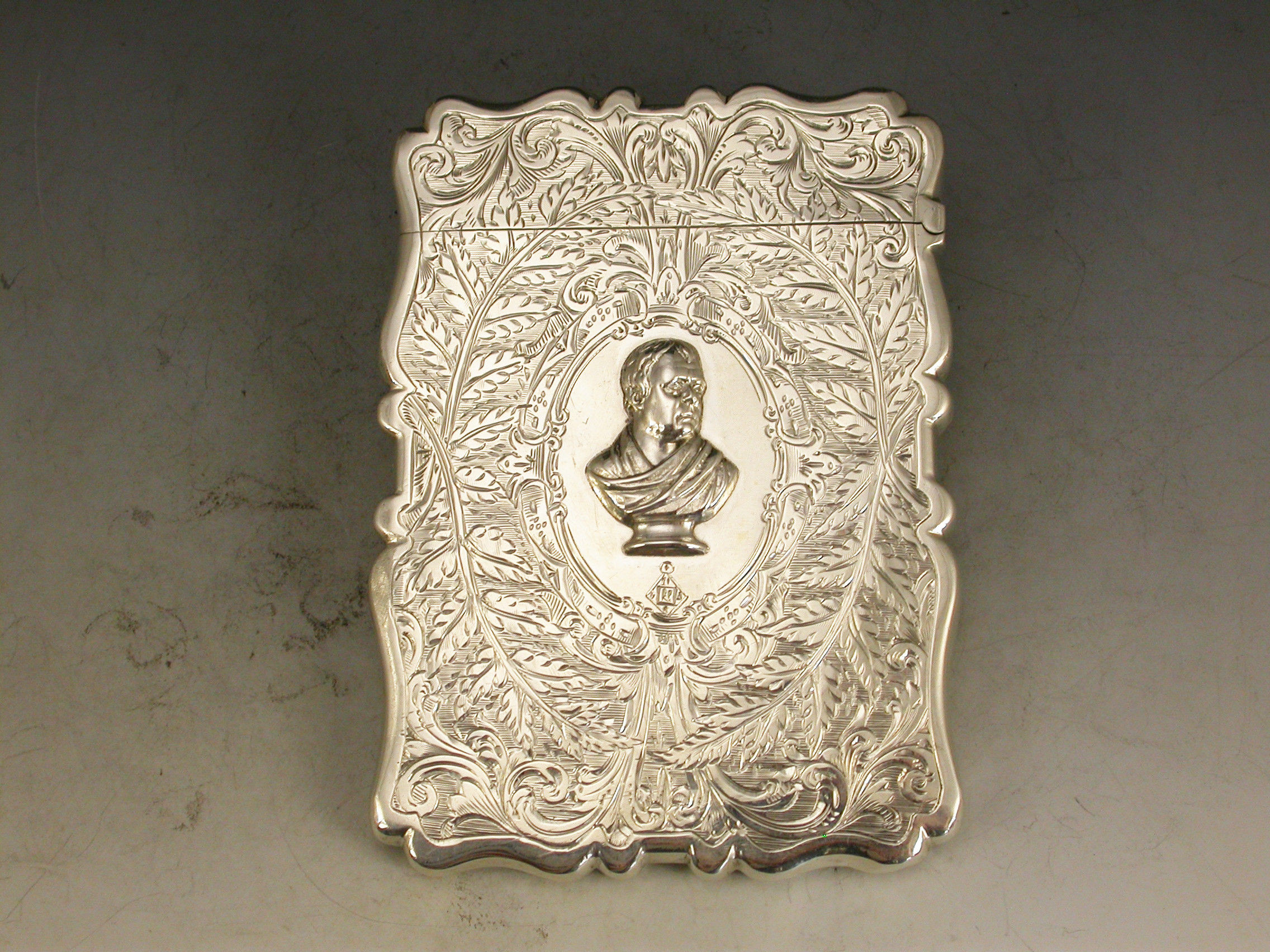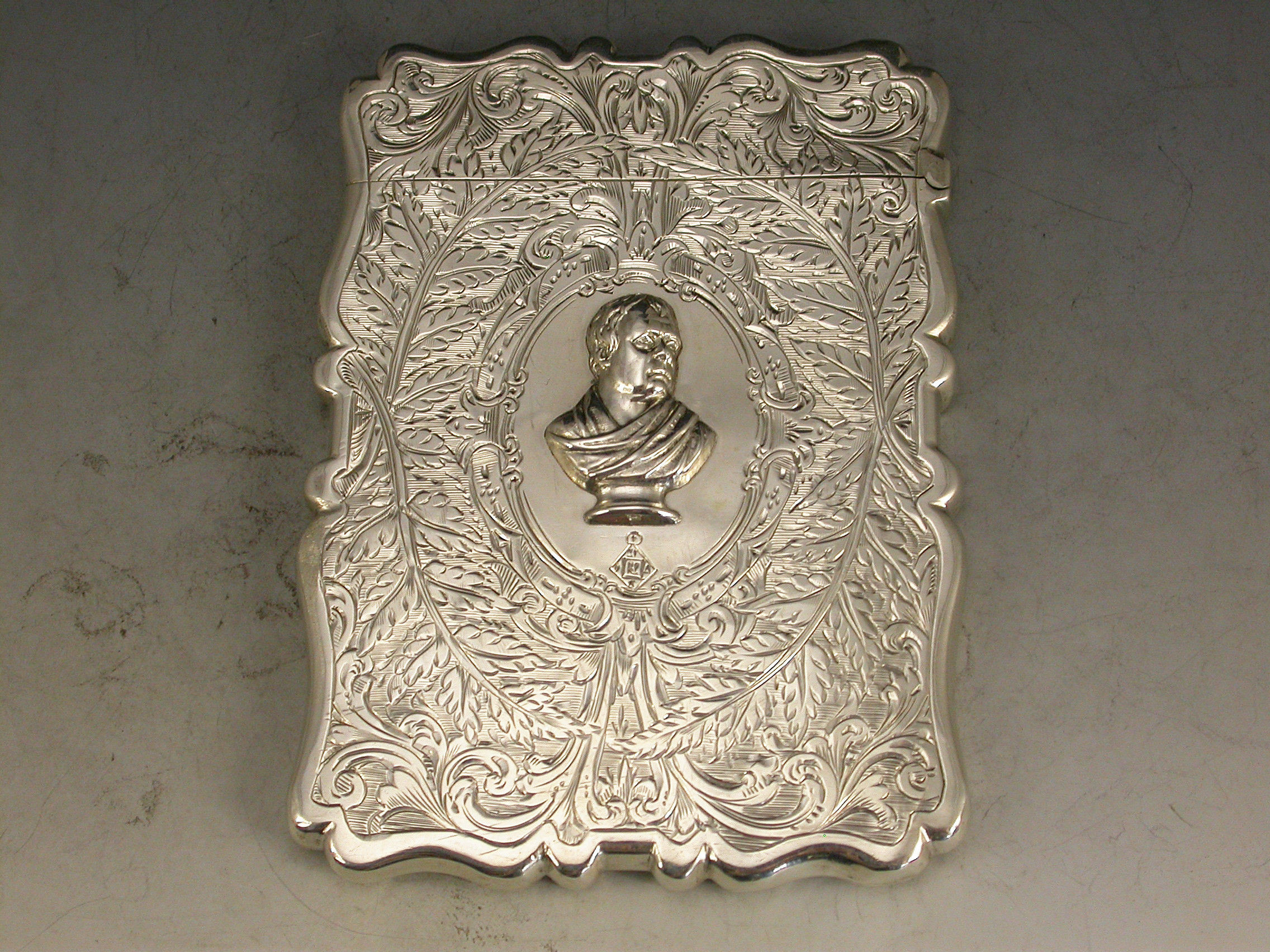 A good Victorian silver Card Case of shaped rectangular form, the face engraved with Scott Memorial, the reverse with an applied bust of Sir Walter Scott to the central oval cartouche, also engraved with a diamond registration mark.