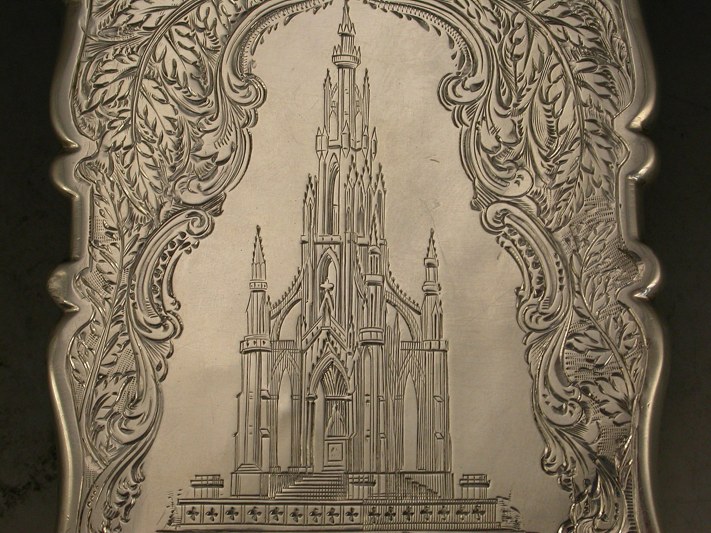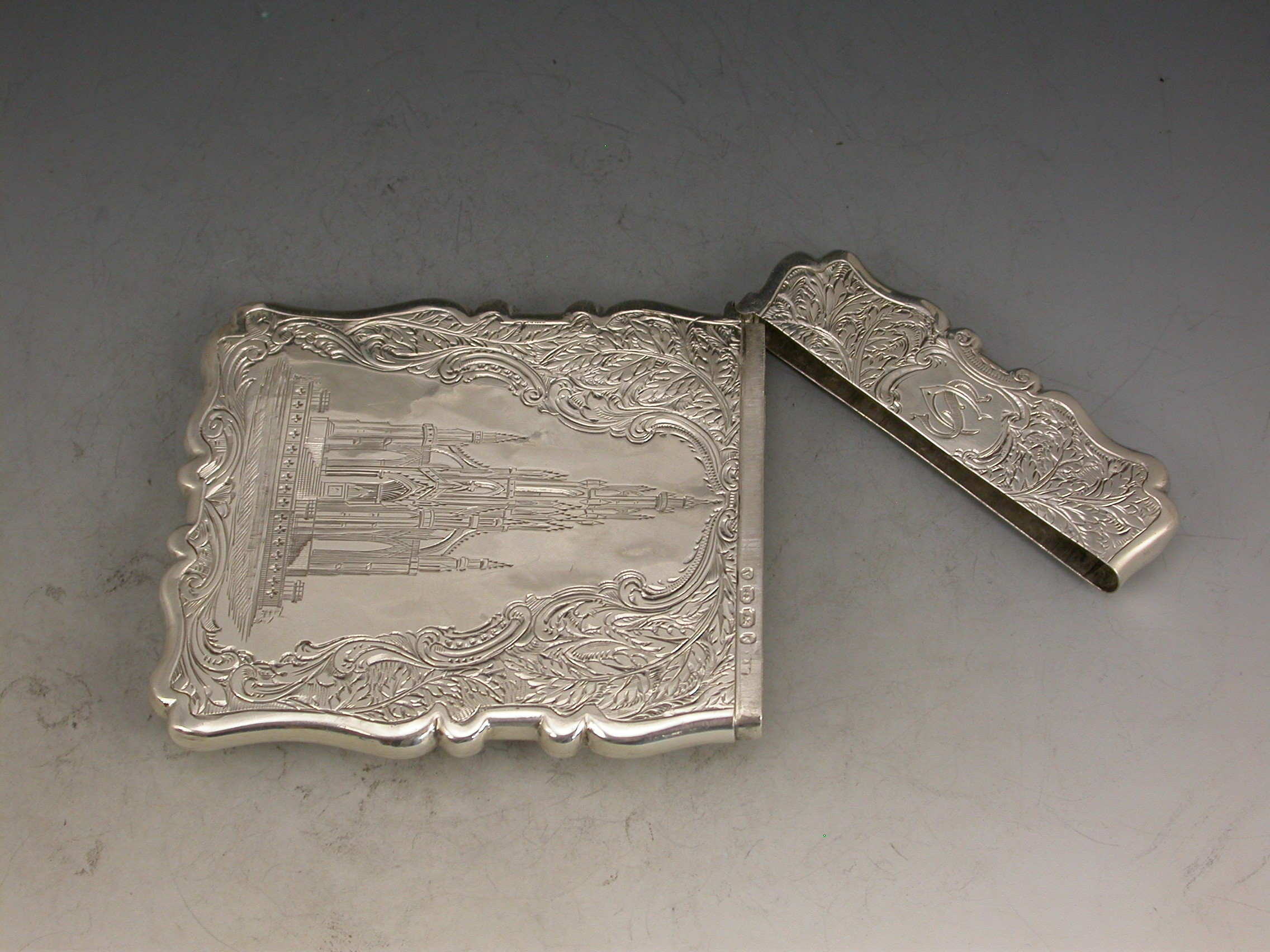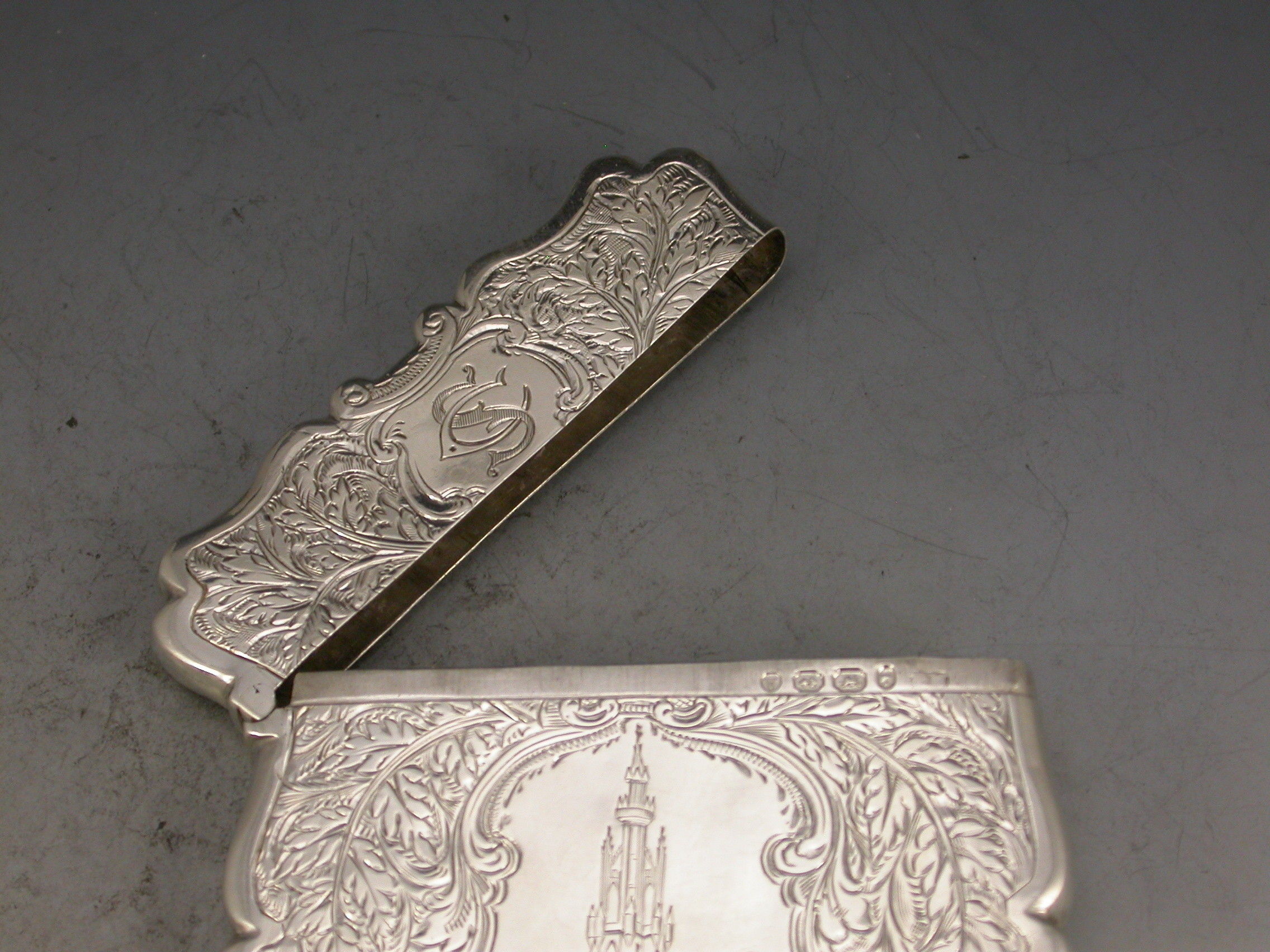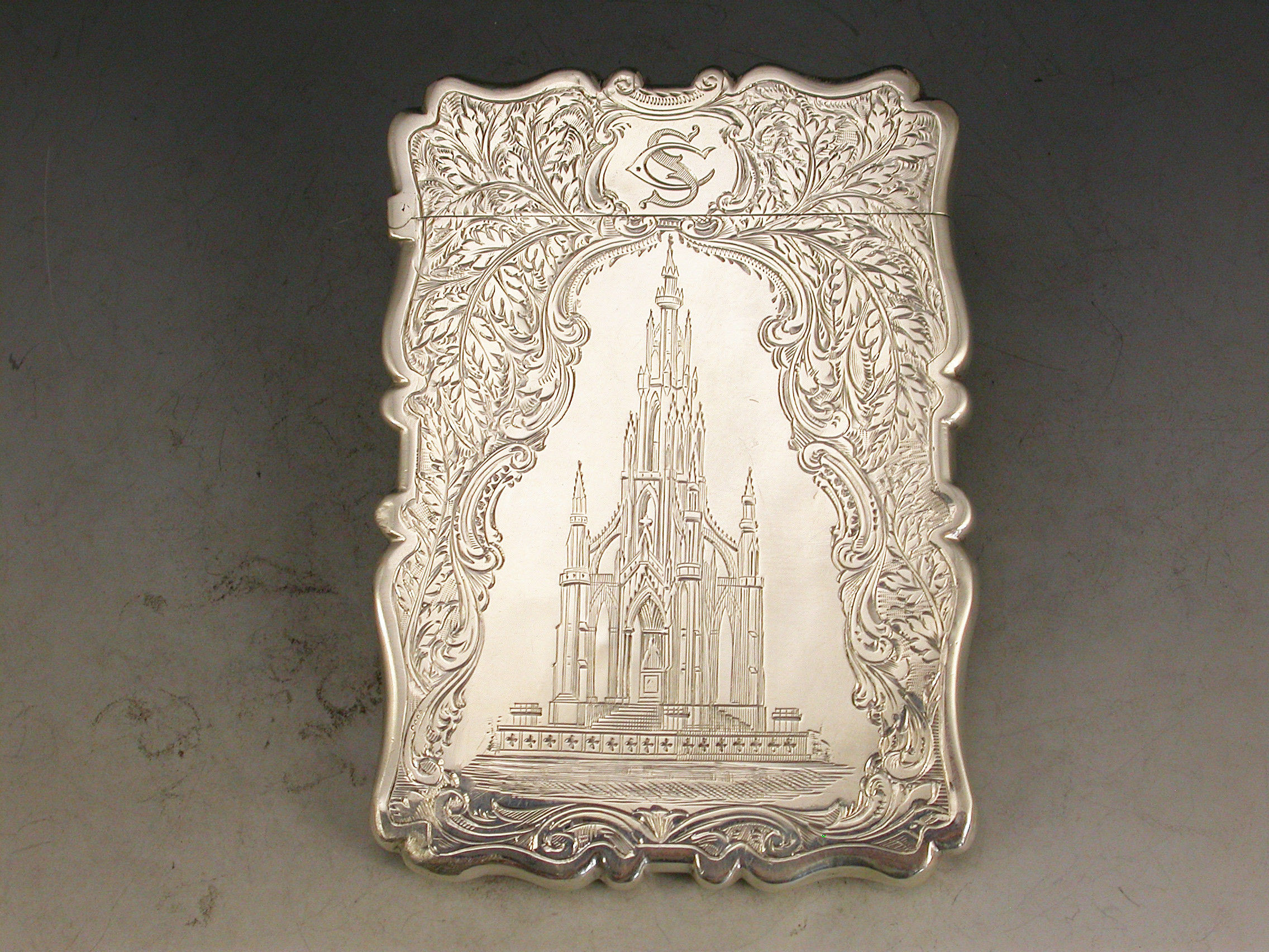 Victorian Silver Castle Top Card Case Scott Memorial with Bust of Sir Walter Scott