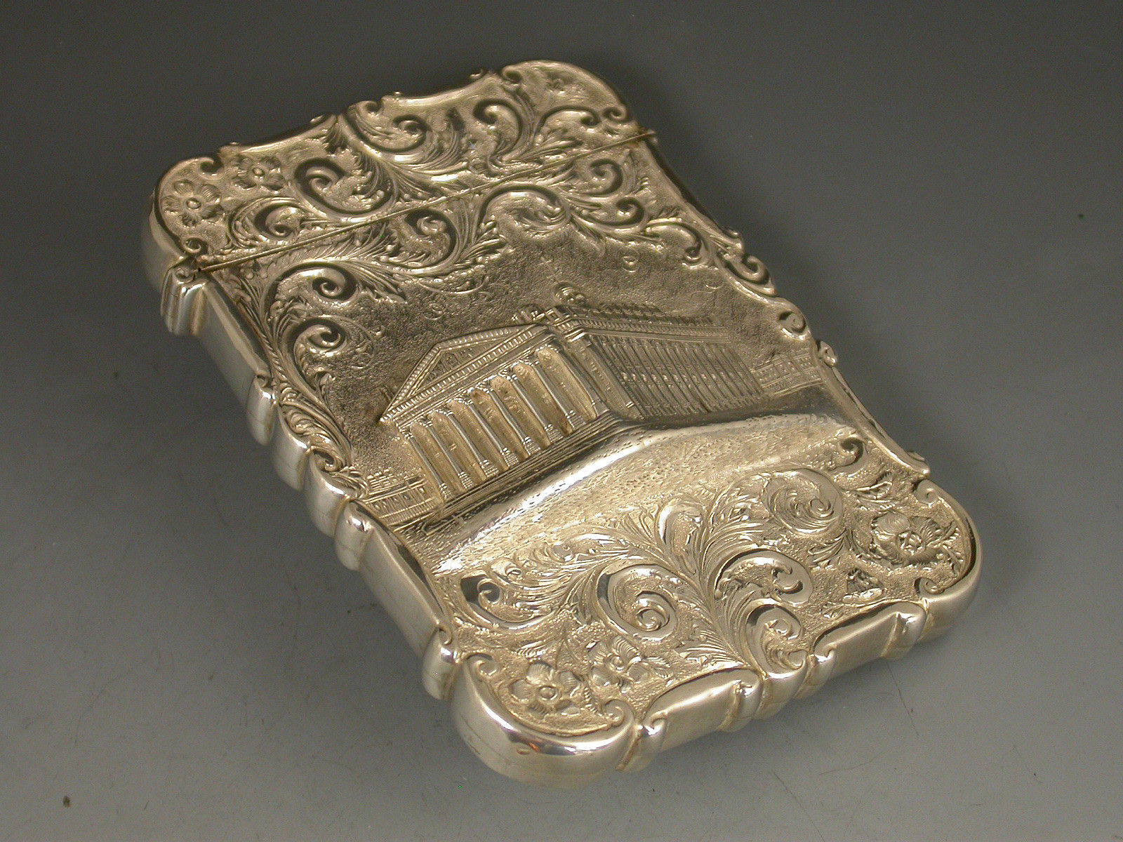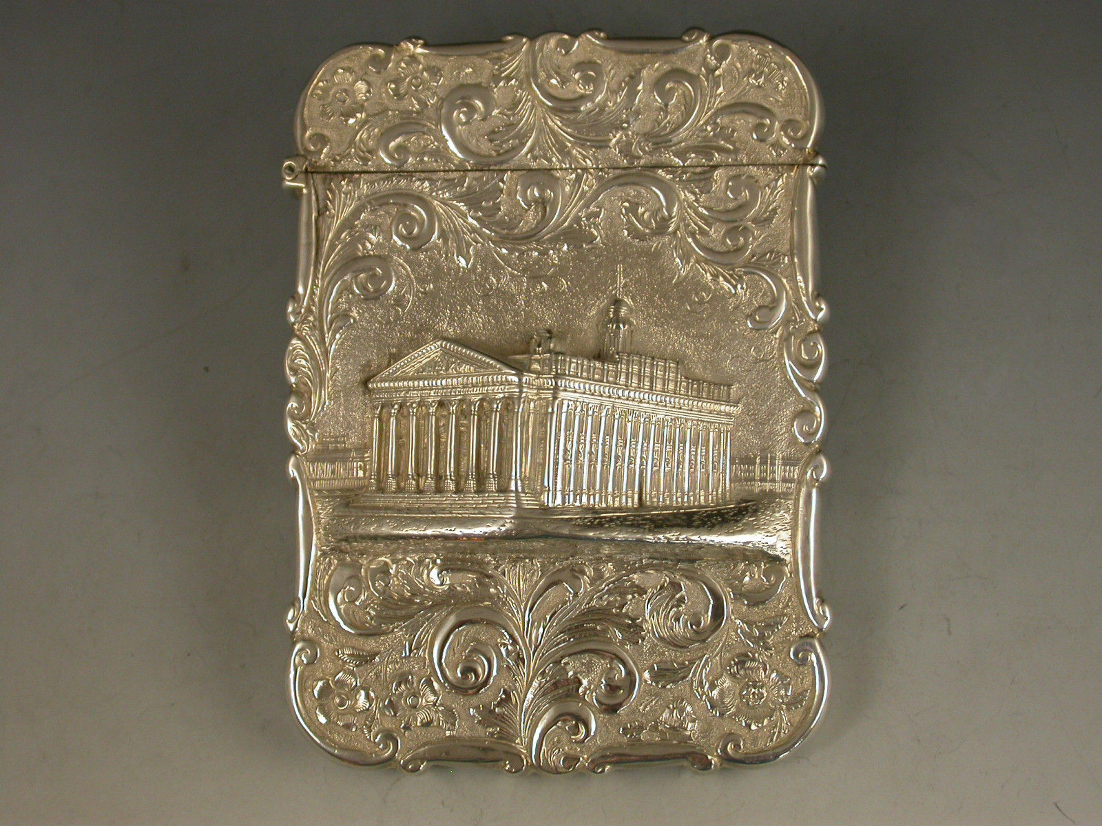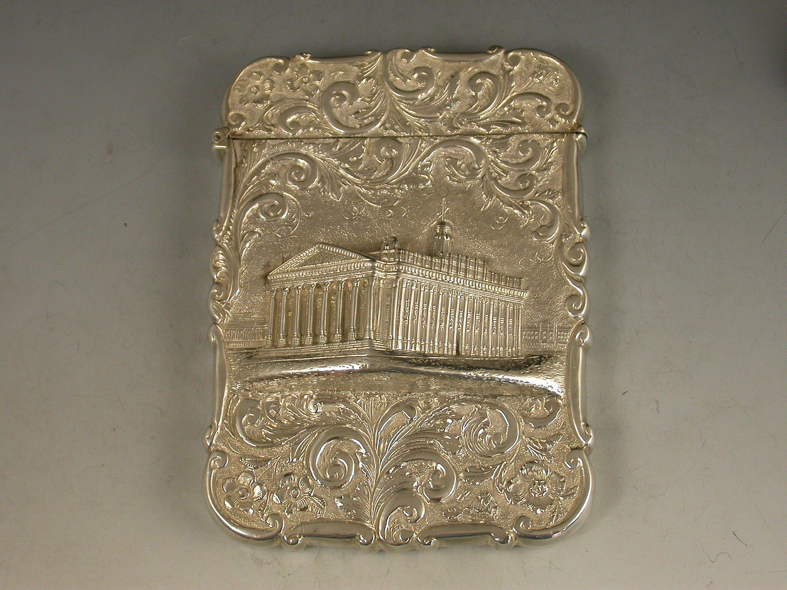 A very fine Victorian silver 'Castle Top' Card Case of shaped rectangular form with hinged flip-top lid, chased and embossed foliate scroll decoration to the front and back on a matt background, the face with a view depicting The Royal Exchange in high relief. The back with a shaped cartouche engraved with contemporary initials.