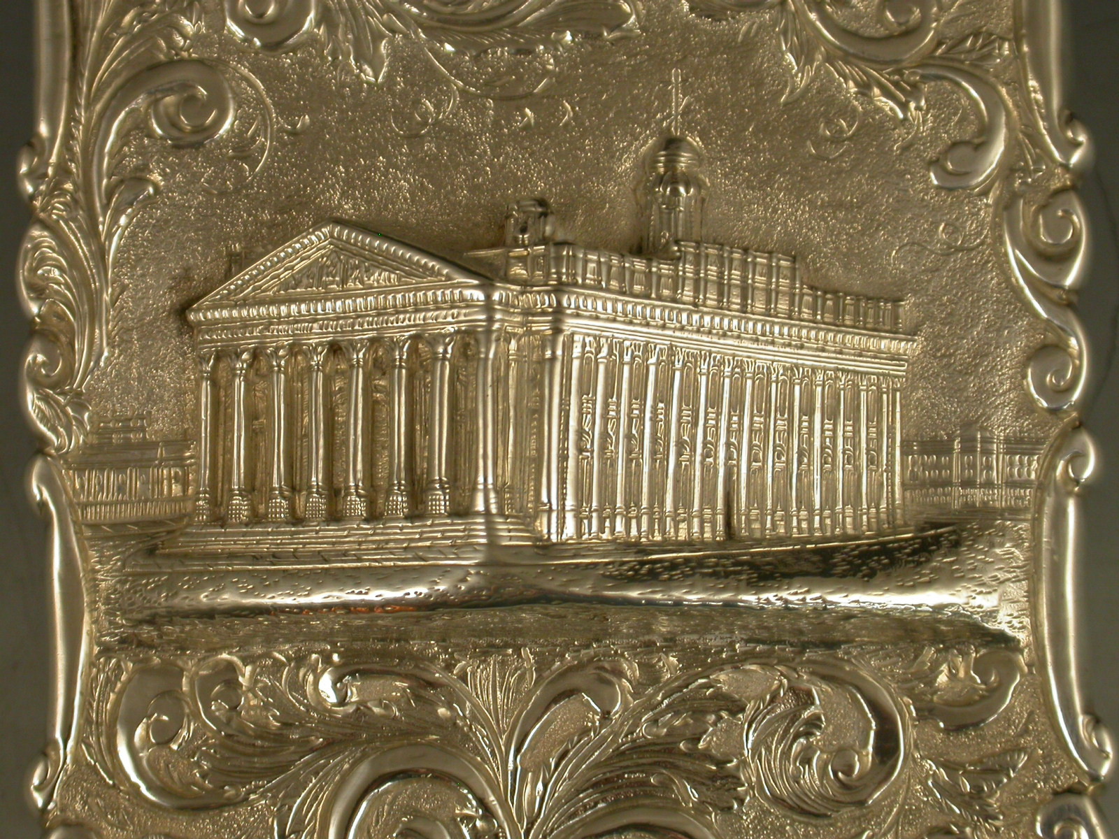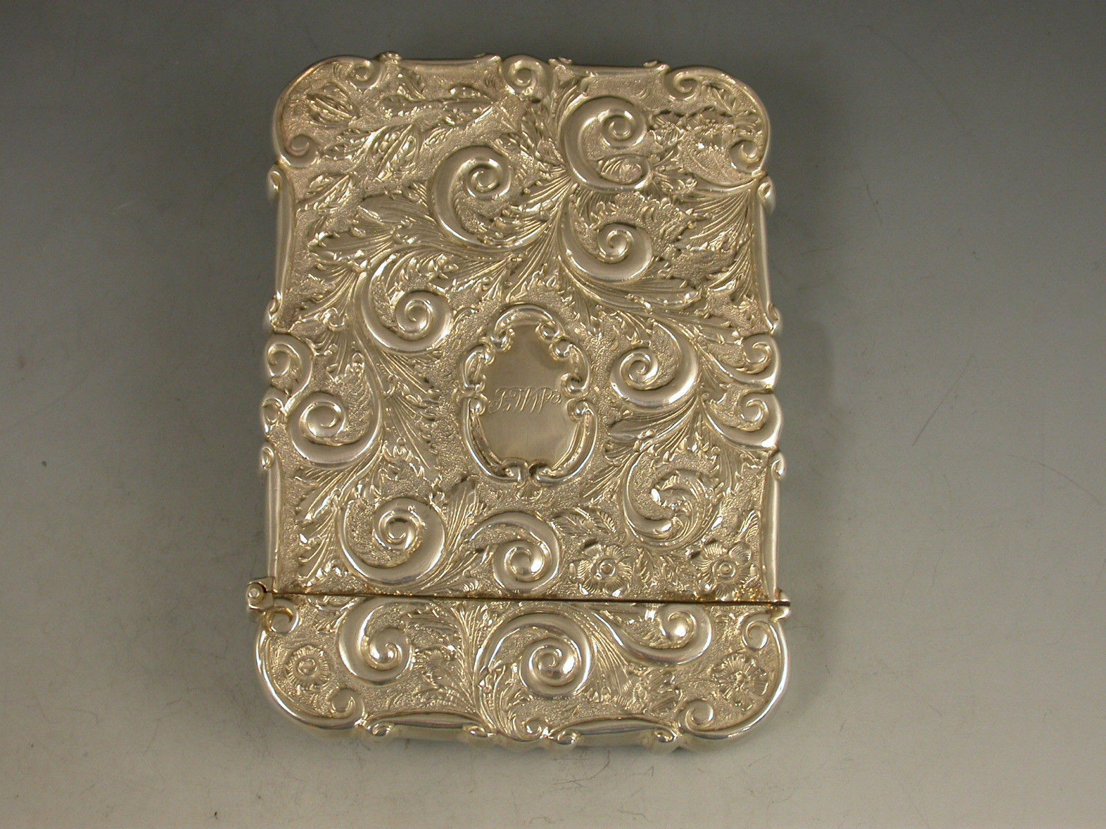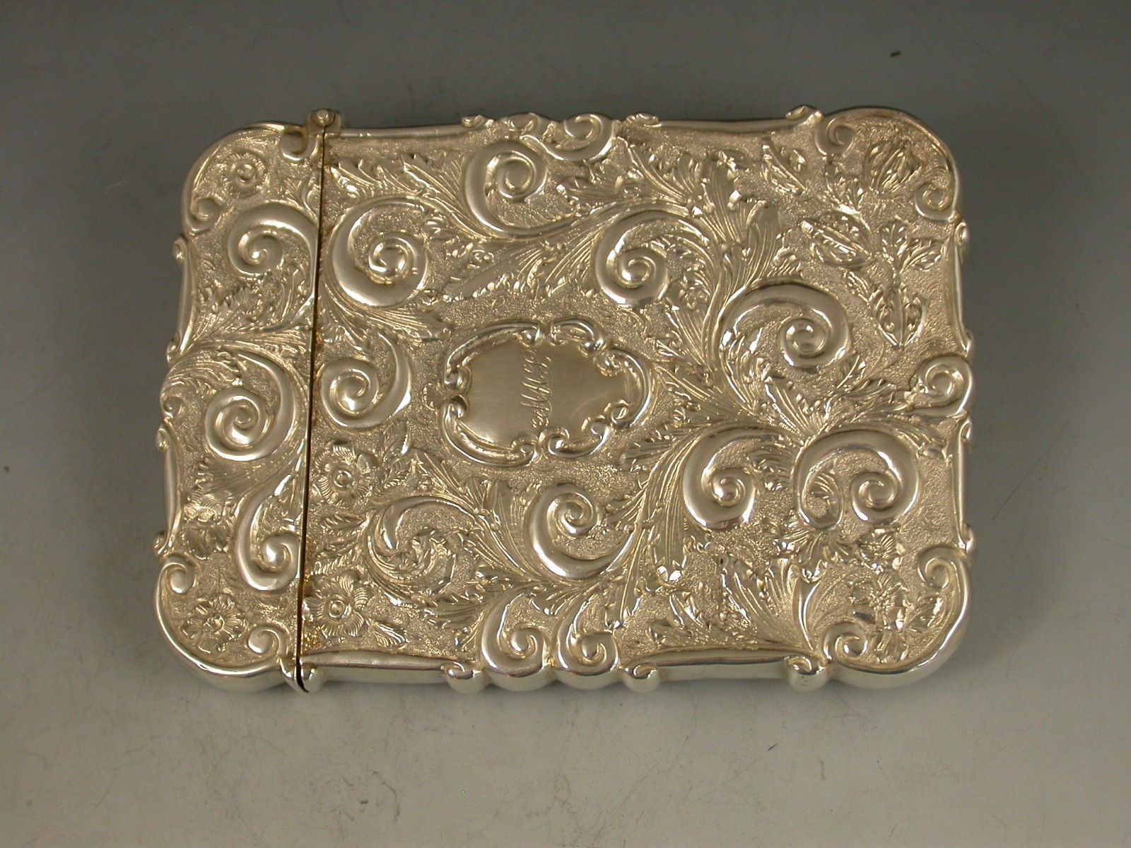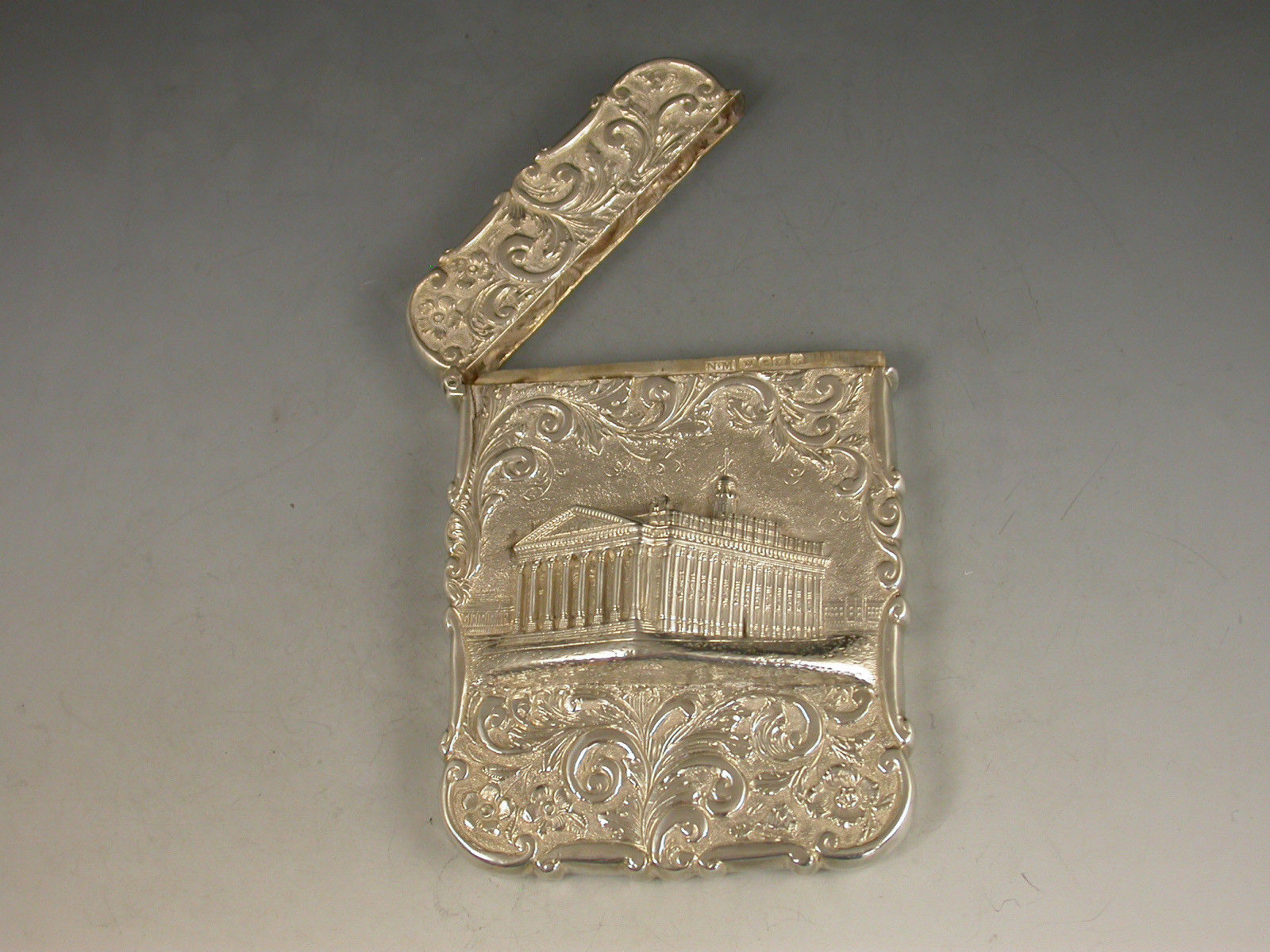 A very fine Victorian silver 'Castle Top' Card Case of shaped rectangular form with hinged flip-top lid, chased and embossed foliate scroll decoration to the front and back on a matt background, the face with a view depicting The Royal Exchange in high relief. The back with a shaped cartouche engraved with contemporary initials.