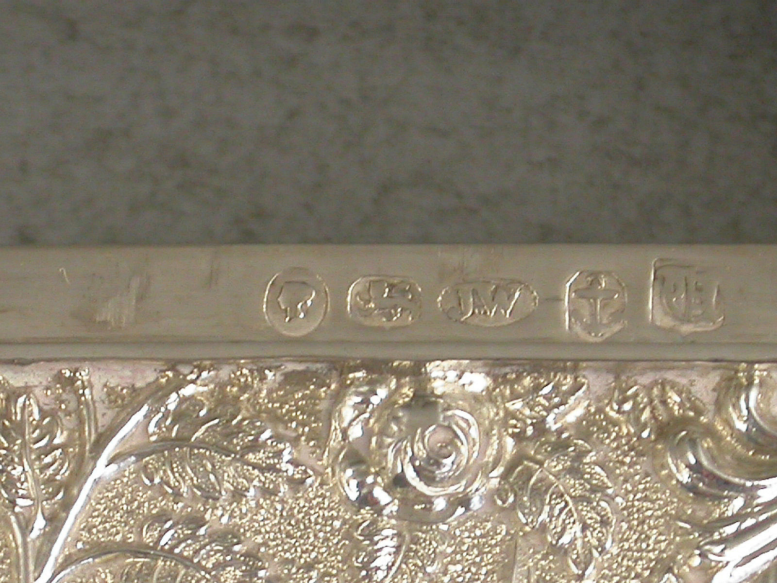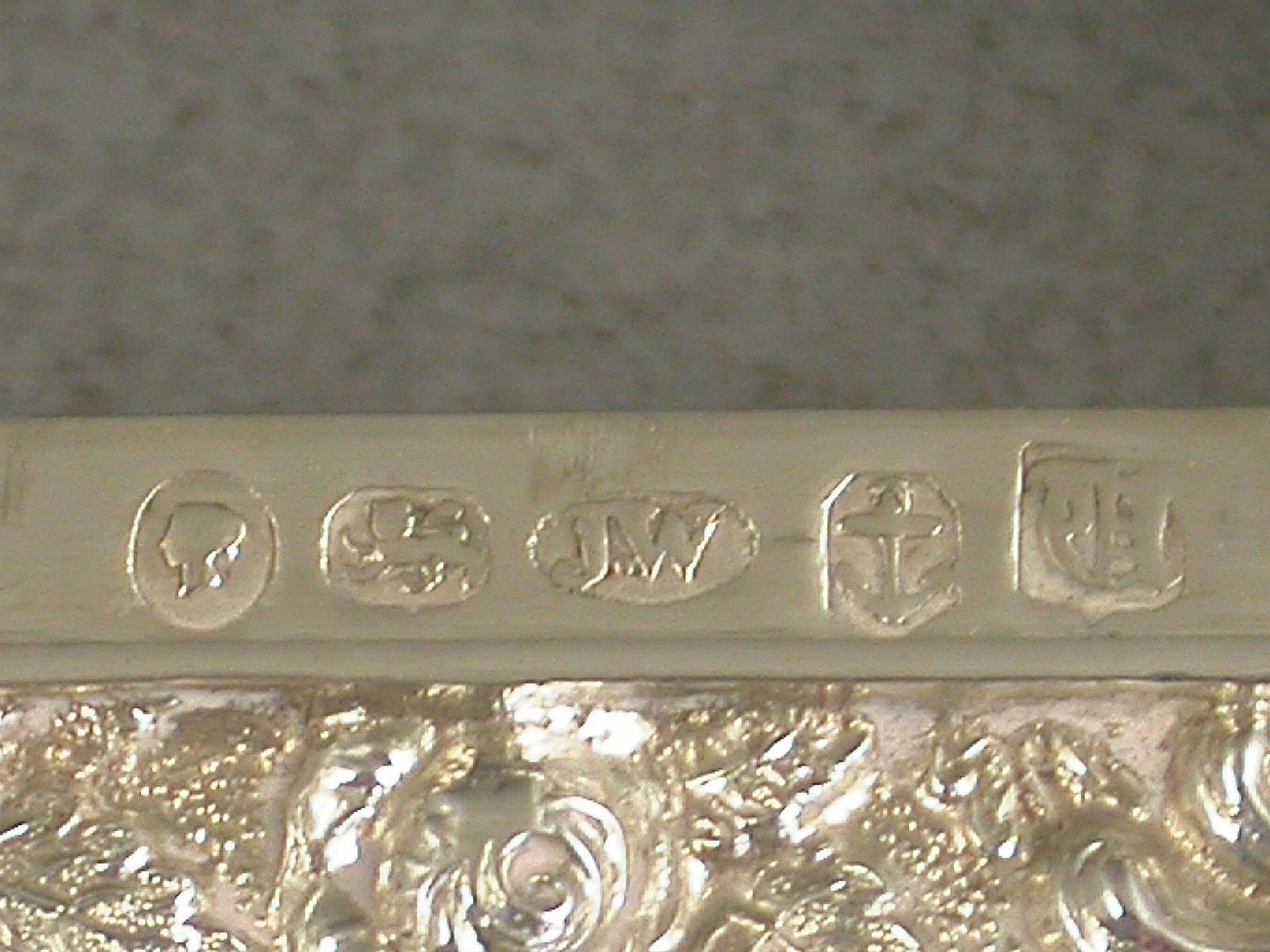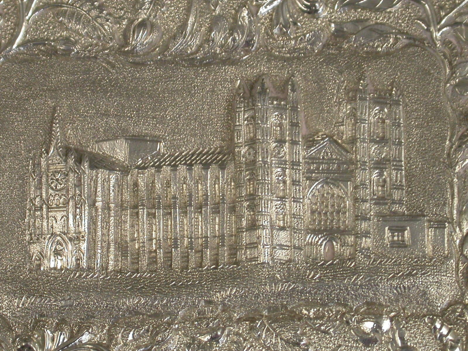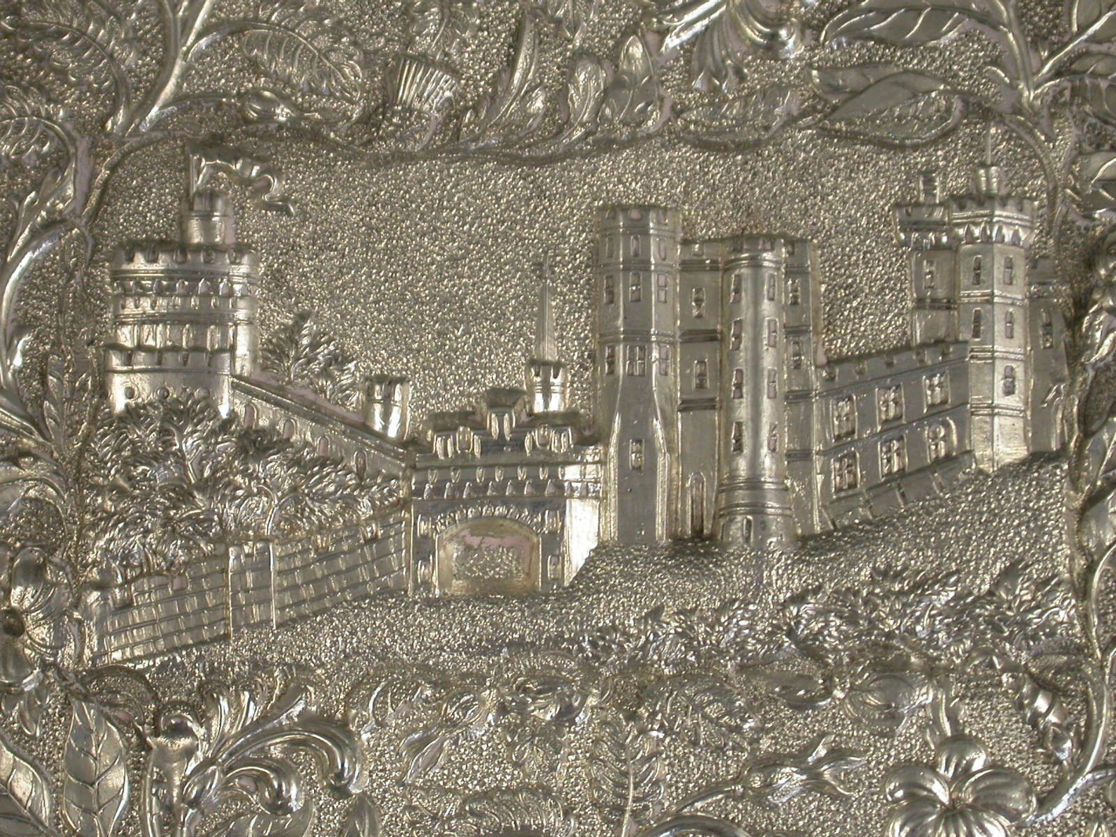 A fine quality Victorian silver castle-top Card Case chased with views of Windsor Castle from the south-west and Westminster Abbey, surrounded by fruit, flowers, and foliage on a matt background.
