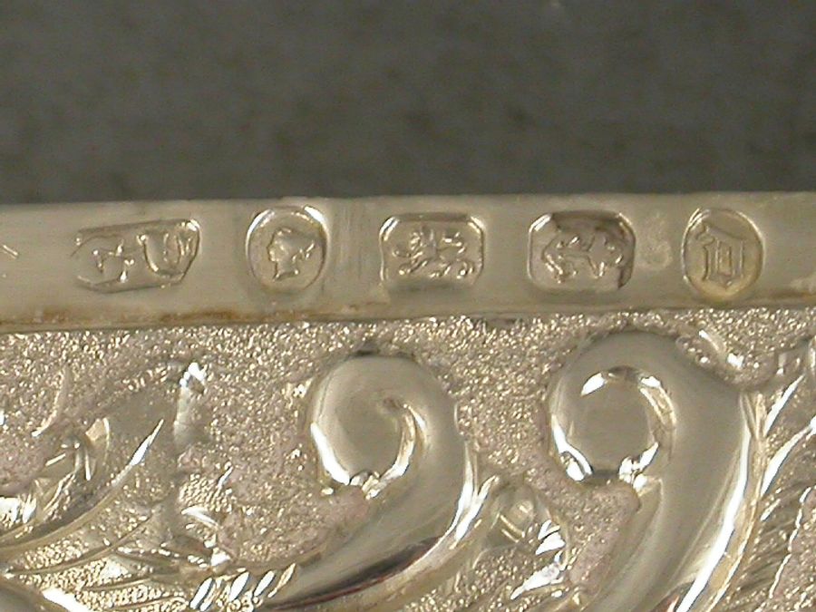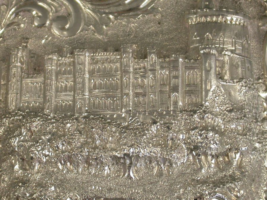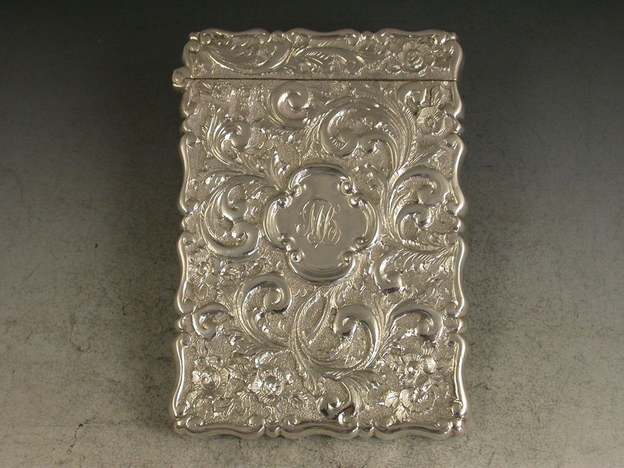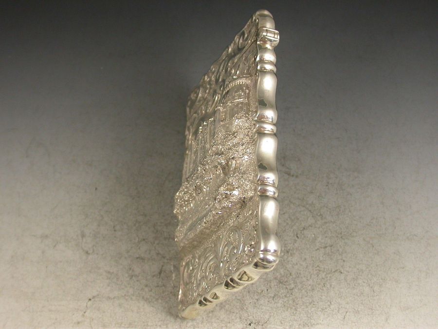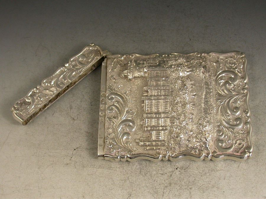 A good Victorian silver castle-top Card Case chased with a view of Windsor Castle from the north-east in unusually high relief, the reverse chased with foliate scroll work and with initialled cartouche.