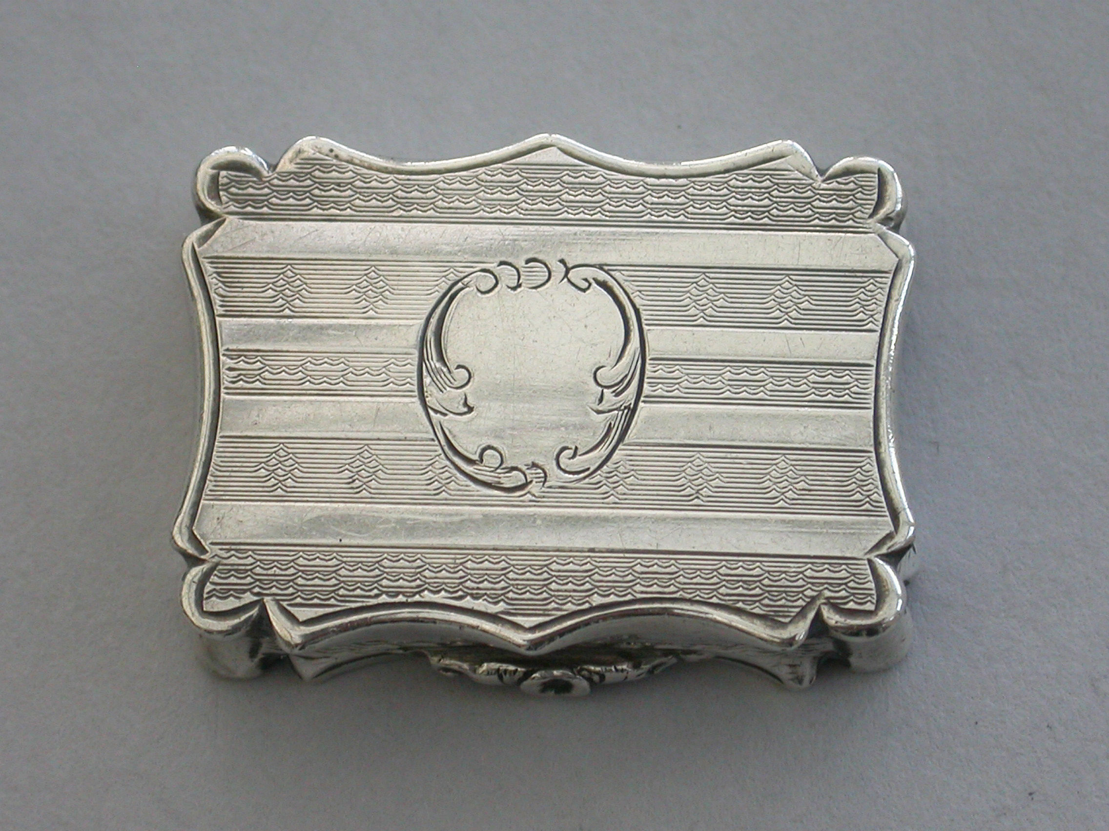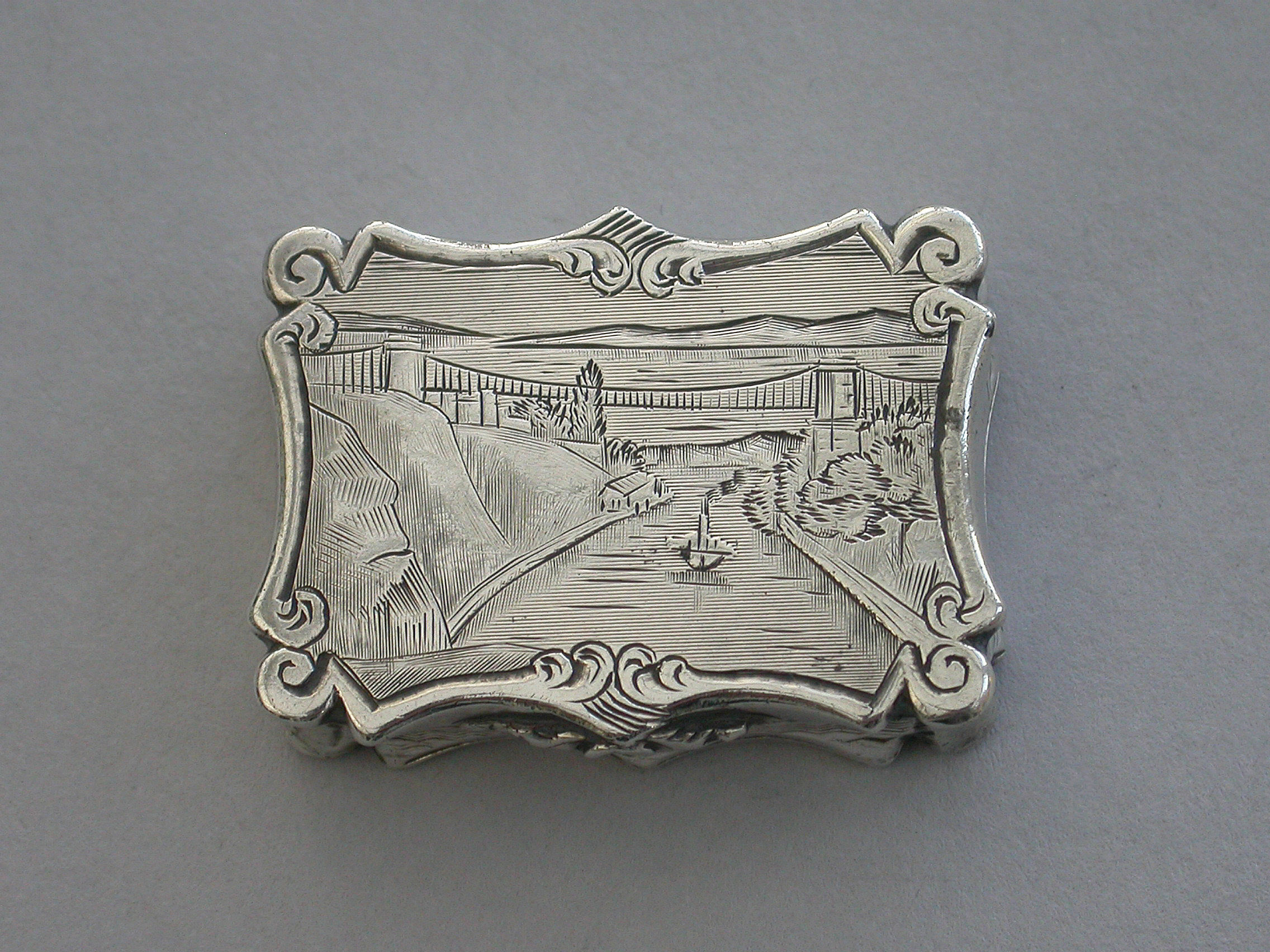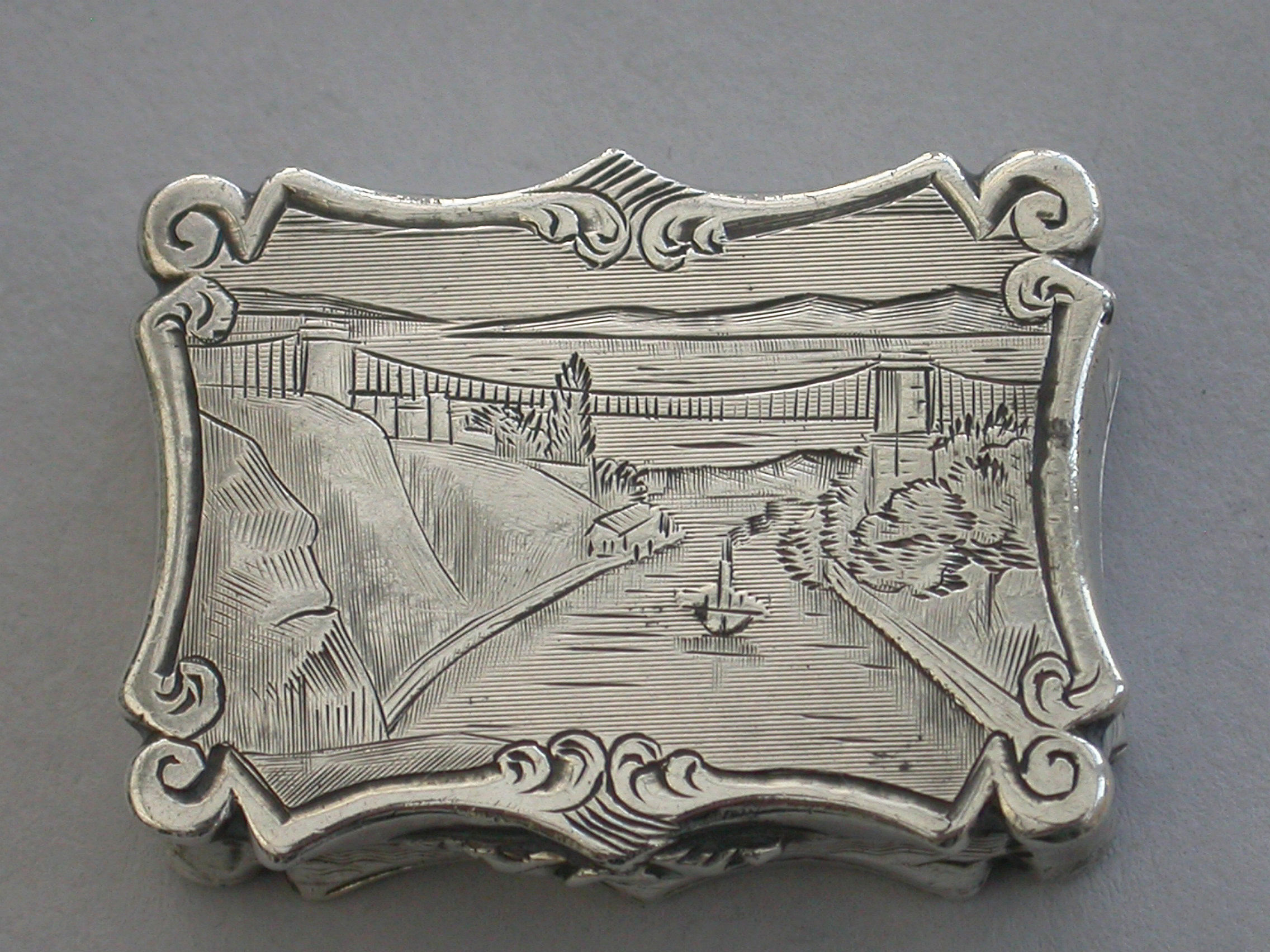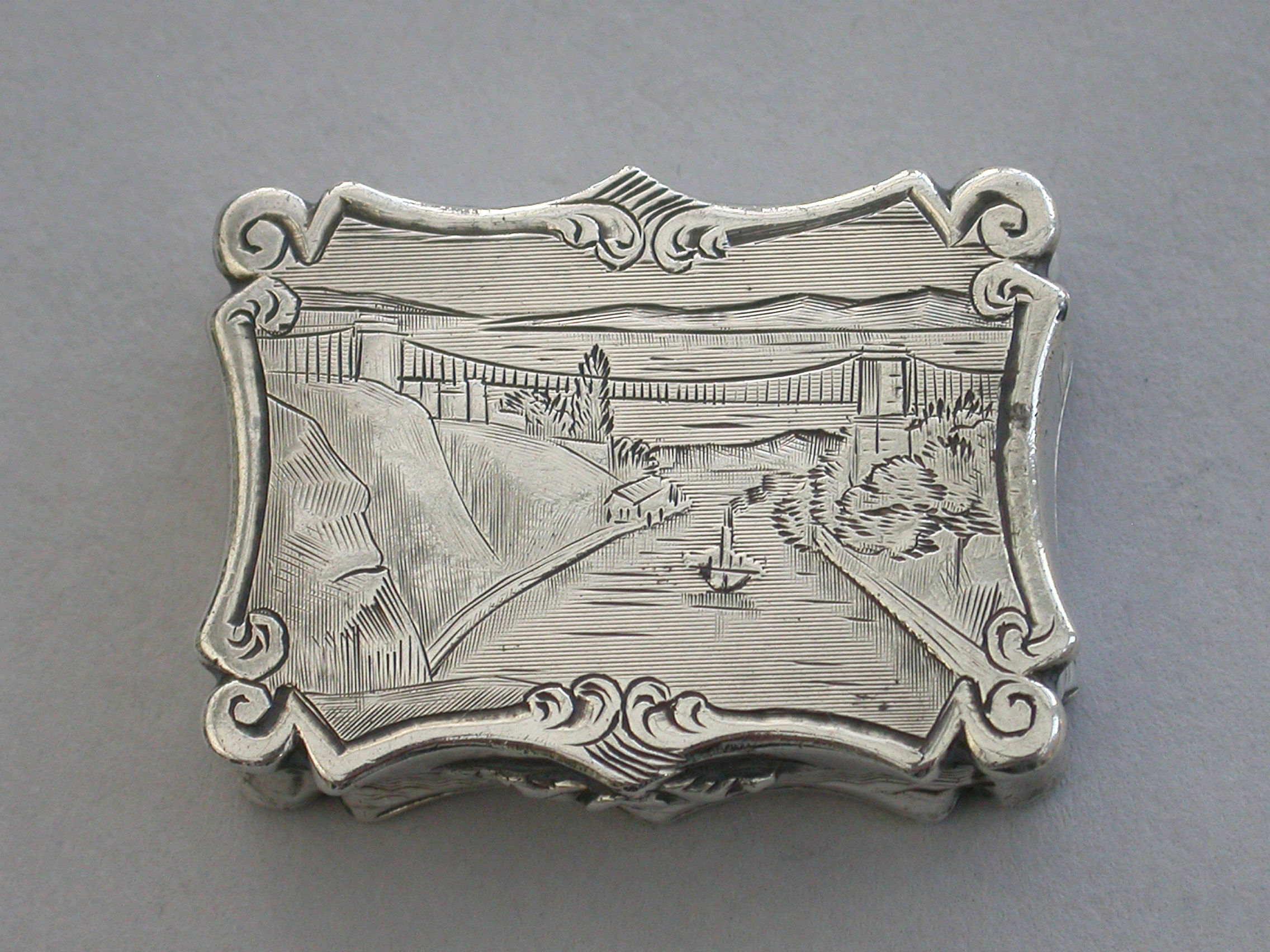 An extremely rare Victorian silver Vinaigrette of shaped rectangular form, the base and sides with bands of engine turned decoration and a vacant shaped cartouche. The lid engraved with a scene depicting Clifton Suspension Bridge. The silver gilt interior with hinged foliate scroll pierced grille.