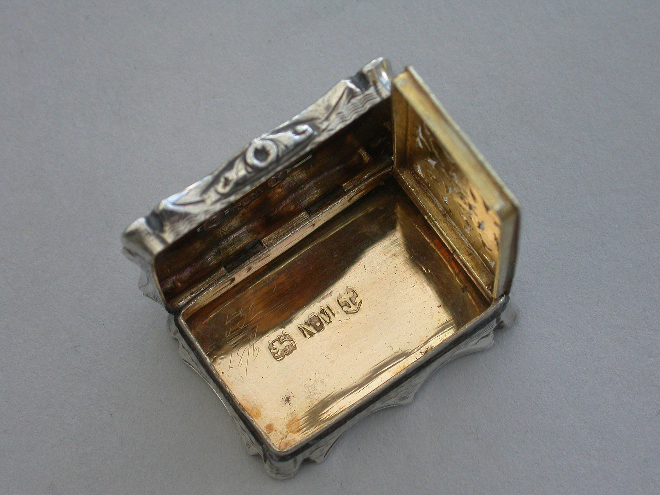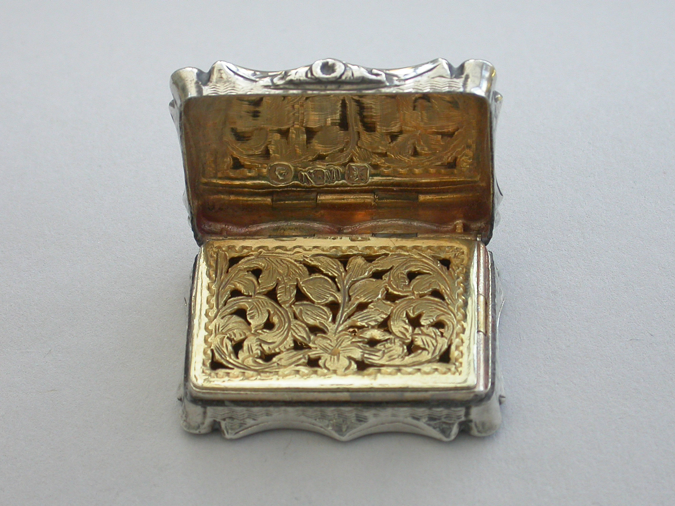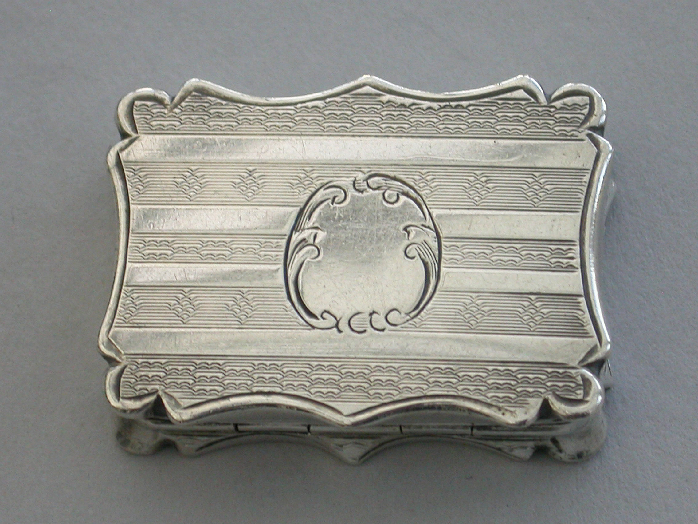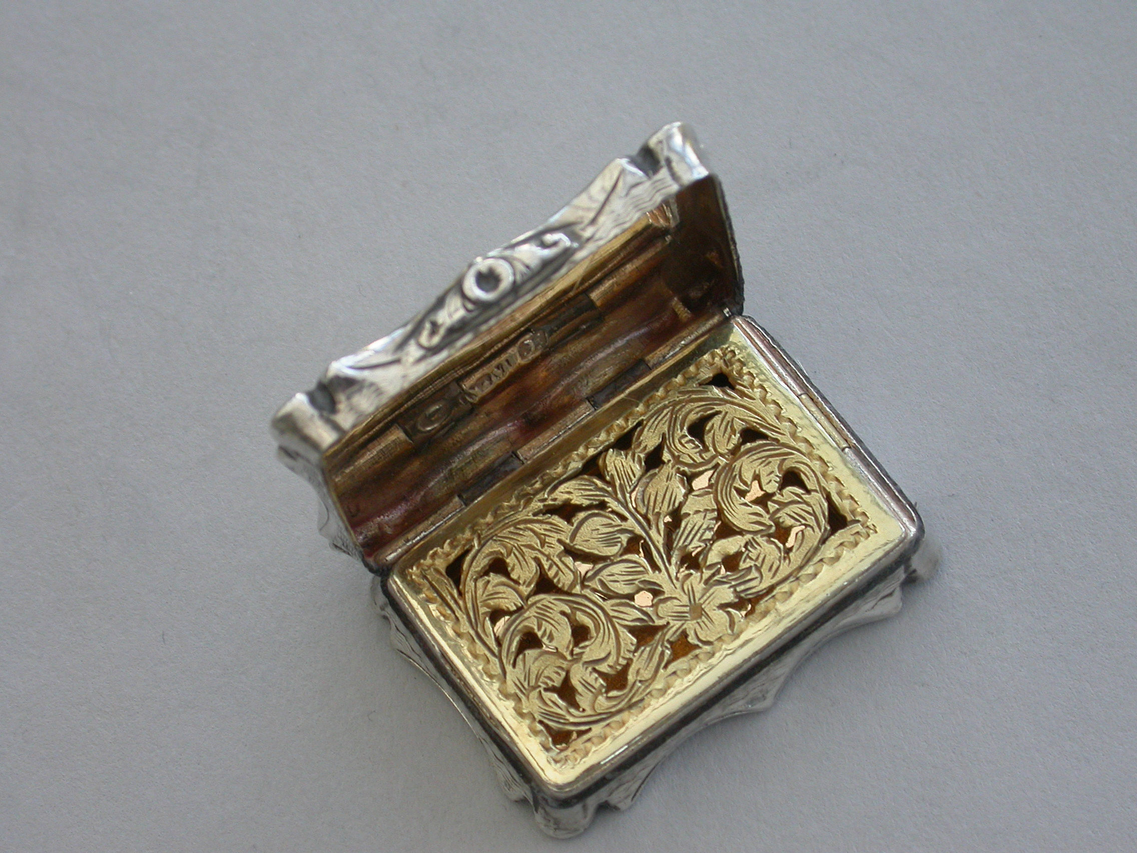 An extremely rare Victorian silver Vinaigrette of shaped rectangular form, the base and sides with bands of engine turned decoration and a vacant shaped cartouche. The lid engraved with a scene depicting Clifton Suspension Bridge. The silver gilt interior with hinged foliate scroll pierced grille.