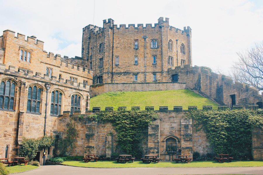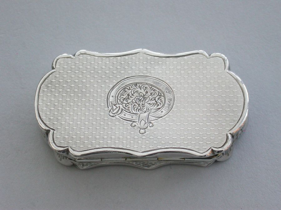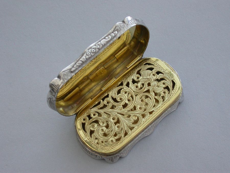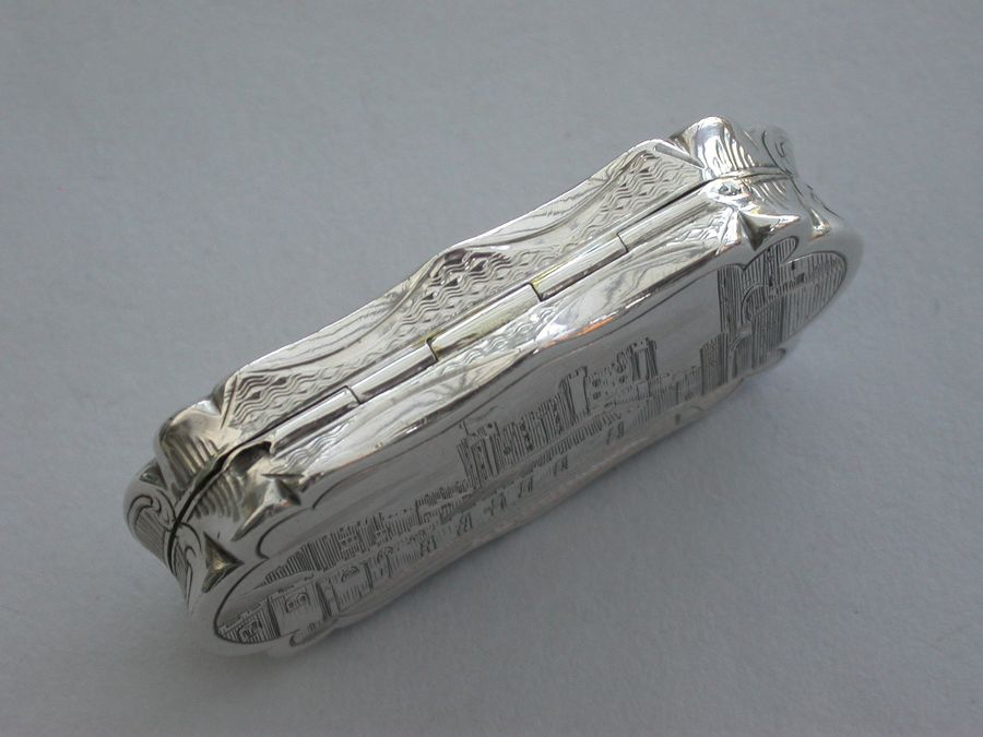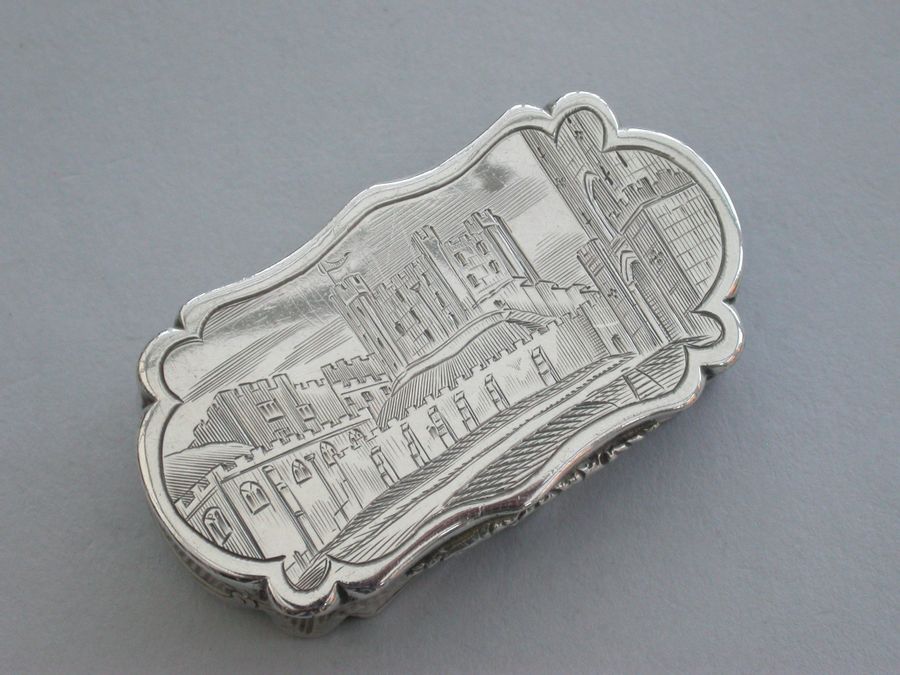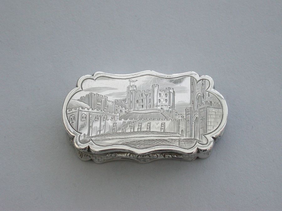 An extremely rare Victorian silver castle-top Vinaigrette of shaped oblong form, the base with engine turned decoration and a patera within a garter, the cover engraved with a scene depicting Durham Castle Keep and Quadrangle within a border. The silver gilt grille pierced with folaite scrolls.