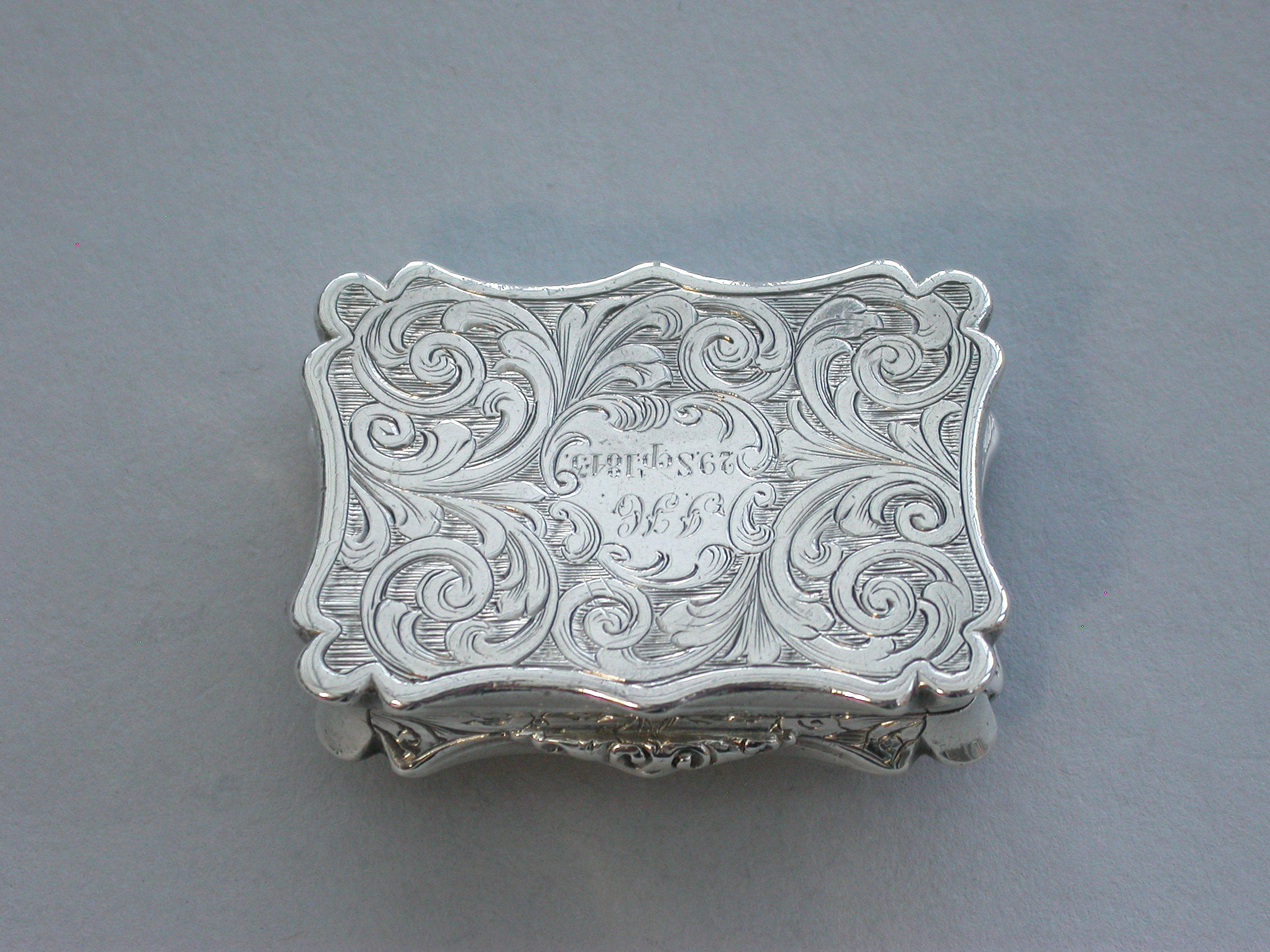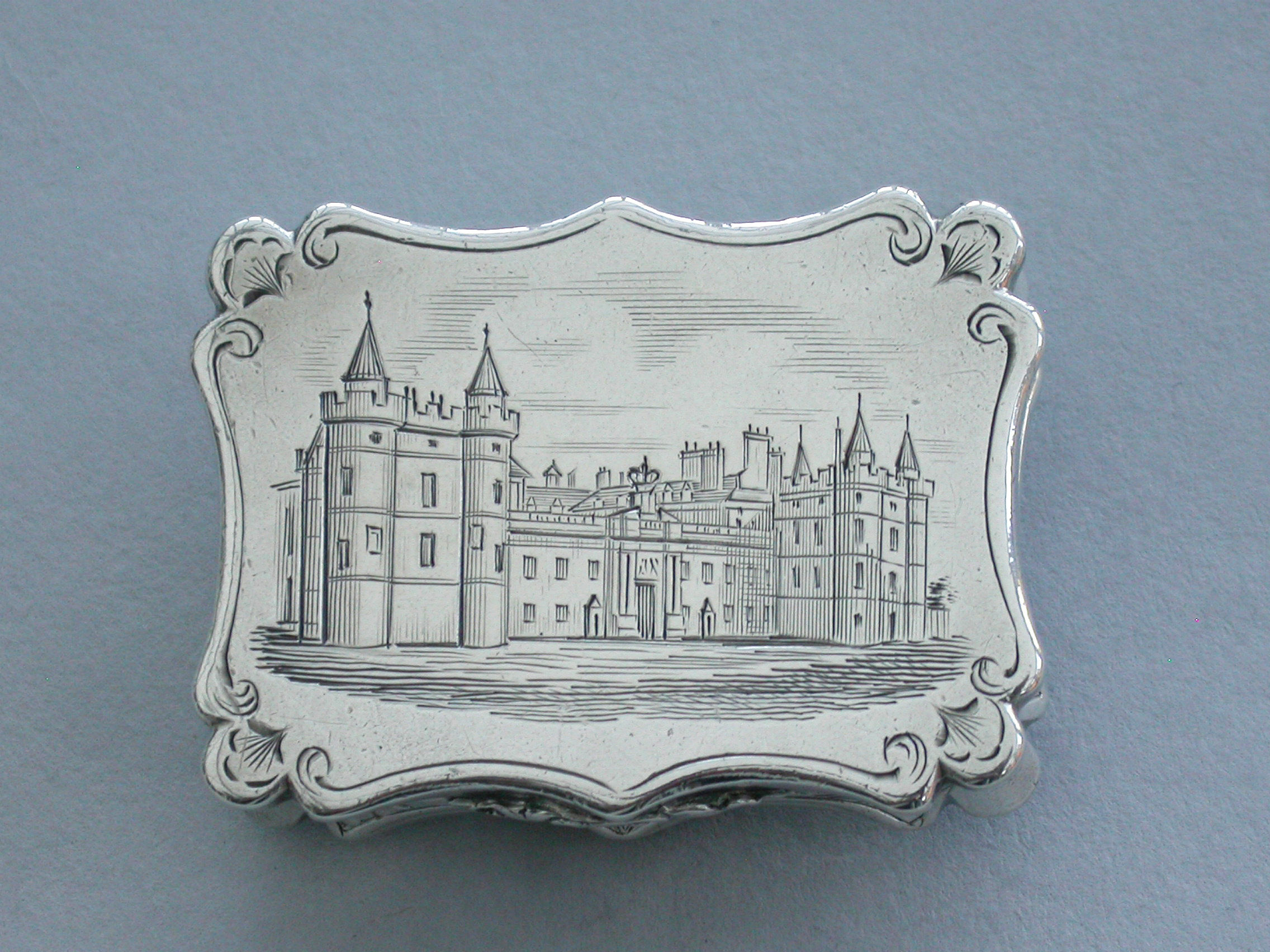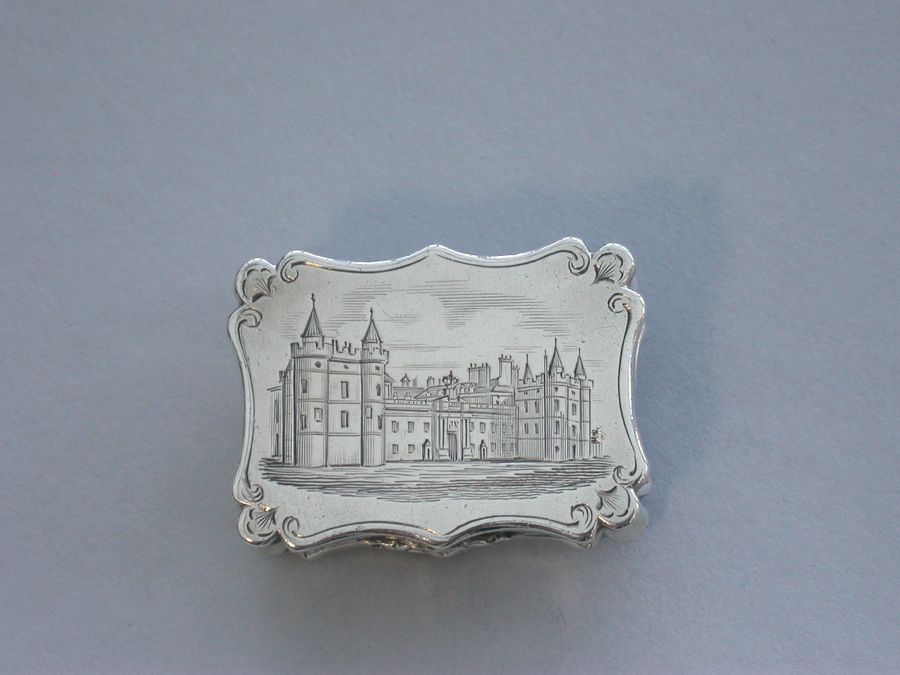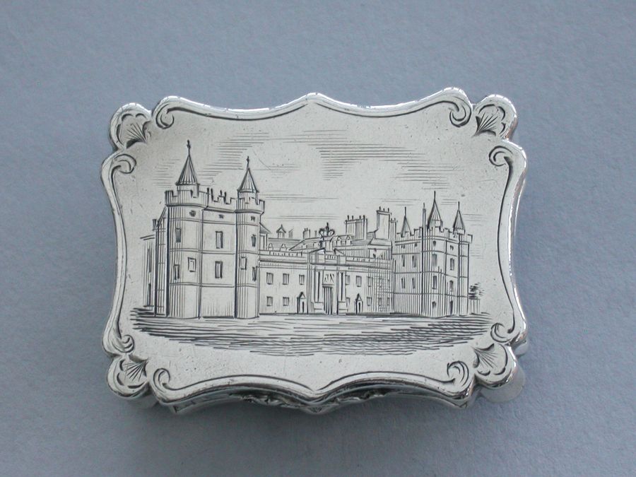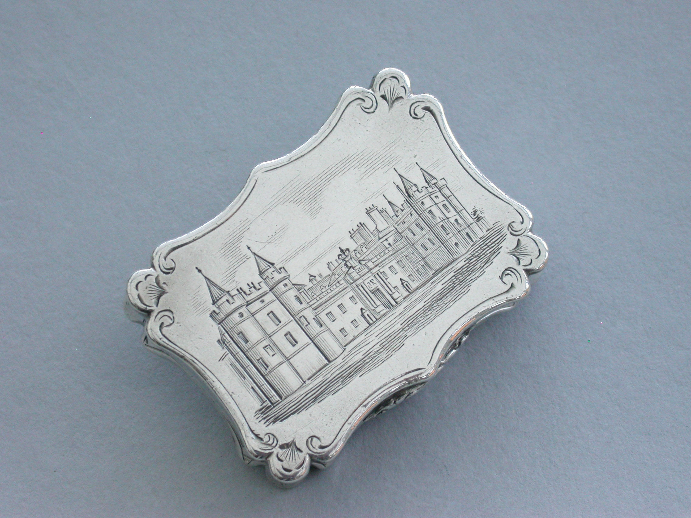 A rare Victorian silver castle-top Vinaigrette of shaped rectangular form, the base and sides engraved with foliate scrolls surrounding a shaped cartouche engraved with a contemporary inscription, the cover engraved with a scene depicting the Palace of Holyrood within a border with stylised leaves at each corner. The silver gilt grille pierced with scrolls and a flower head.