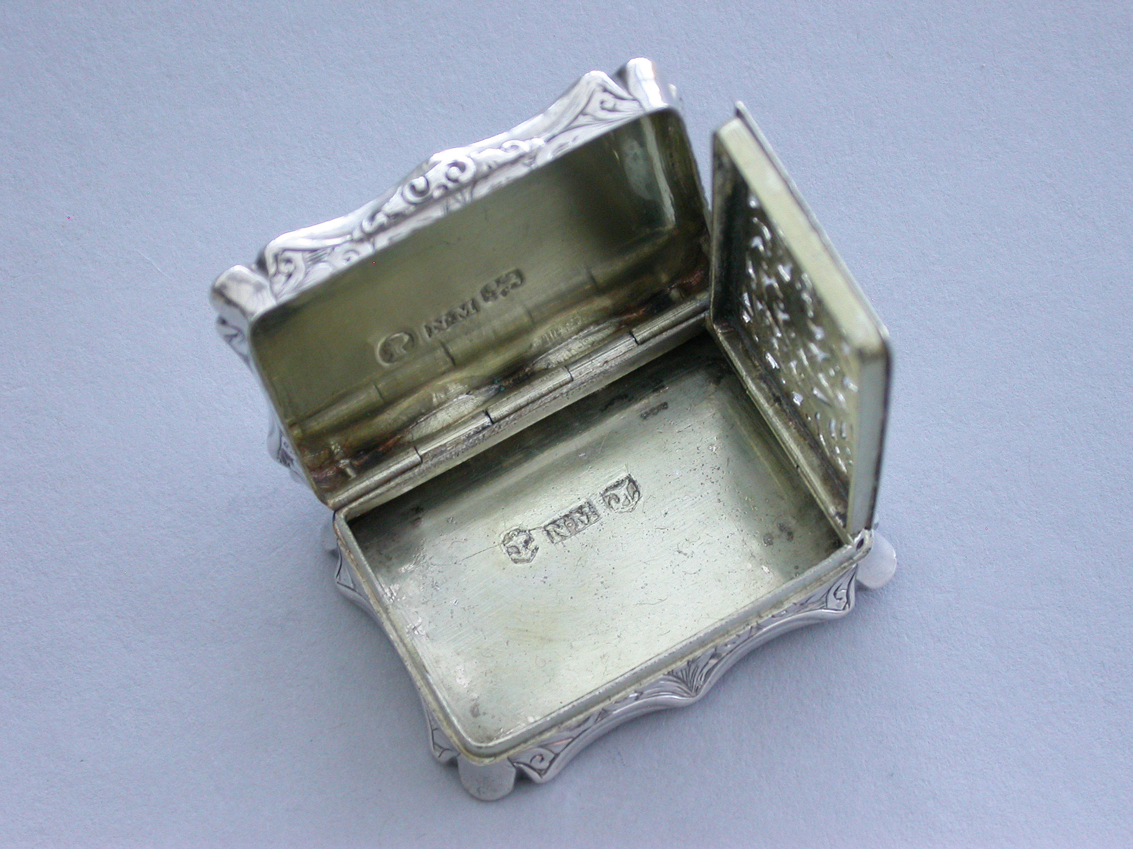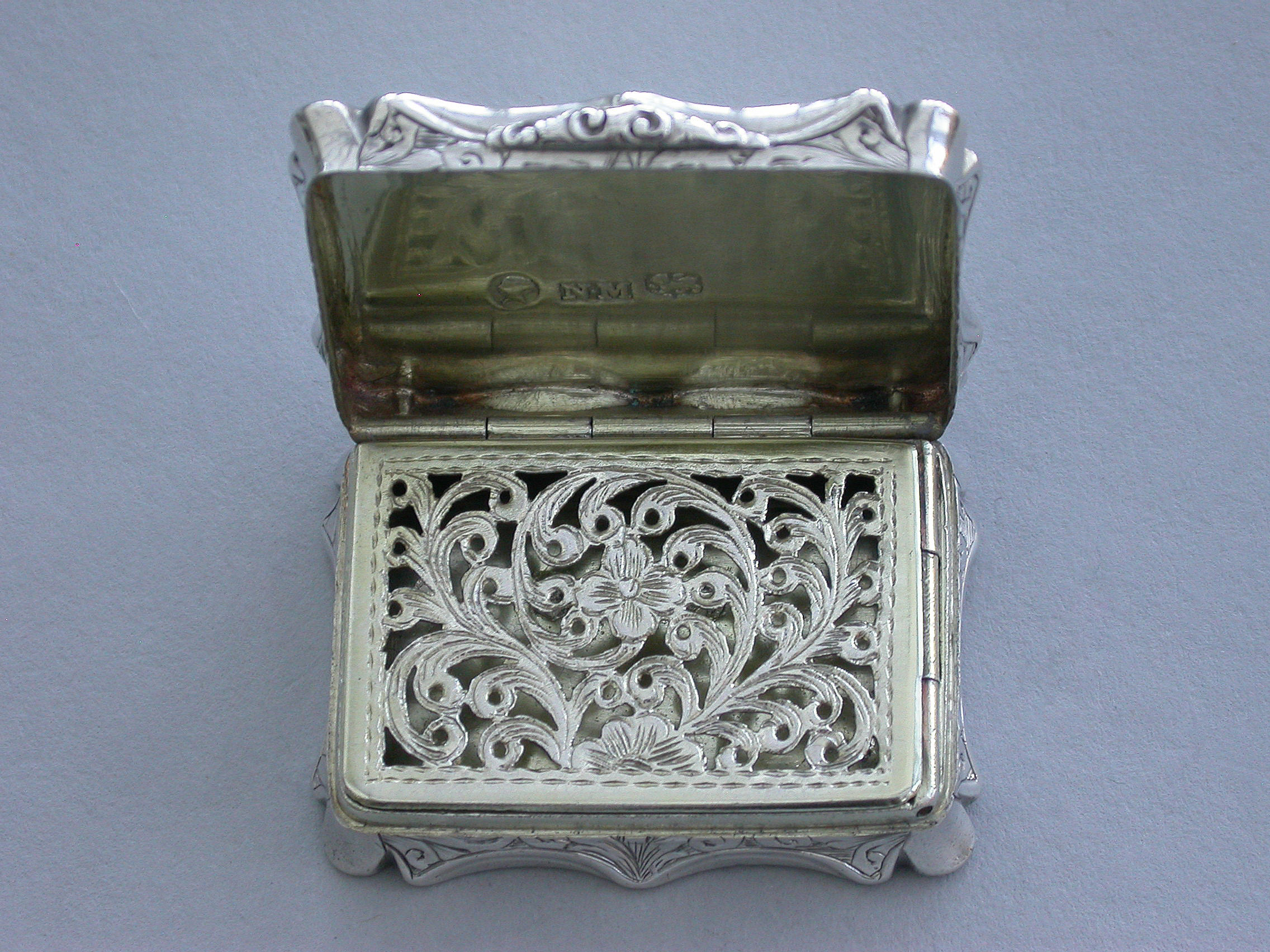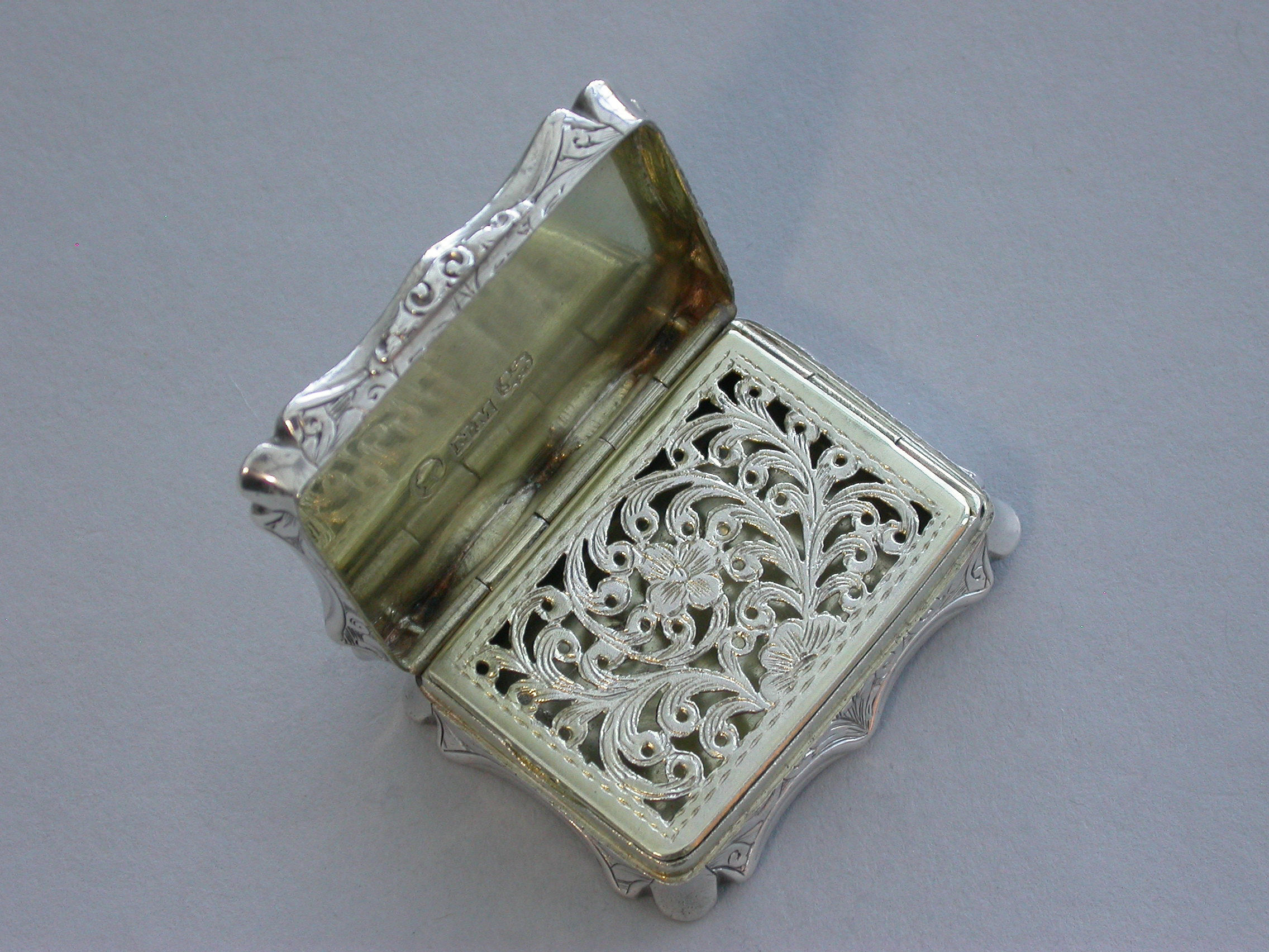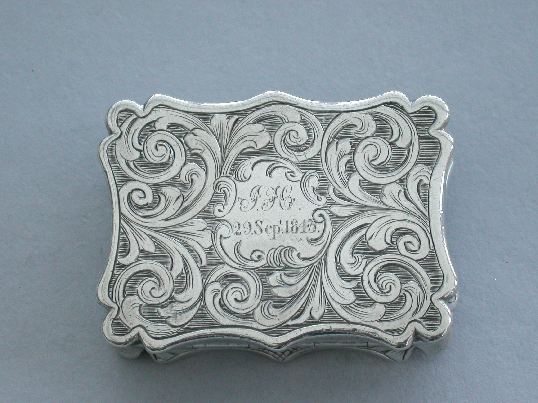 A rare Victorian silver castle-top Vinaigrette of shaped rectangular form, the base and sides engraved with foliate scrolls surrounding a shaped cartouche engraved with a contemporary inscription, the cover engraved with a scene depicting the Palace of Holyrood within a border with stylised leaves at each corner. The silver gilt grille pierced with scrolls and a flower head.