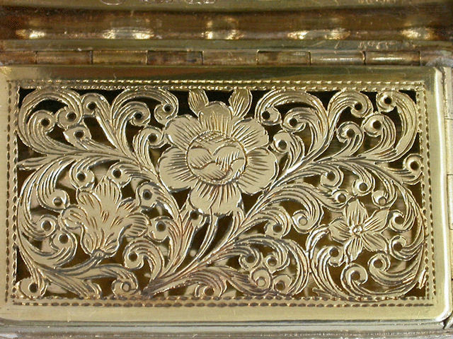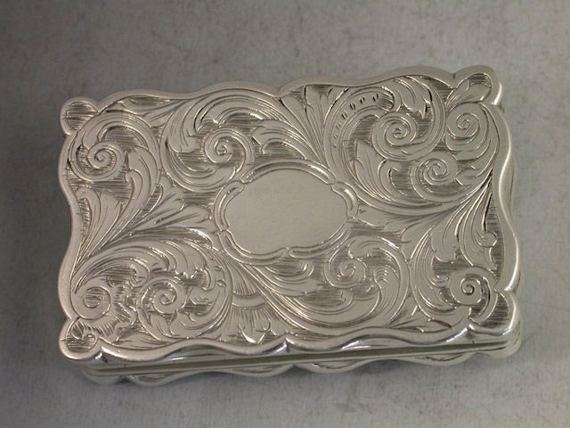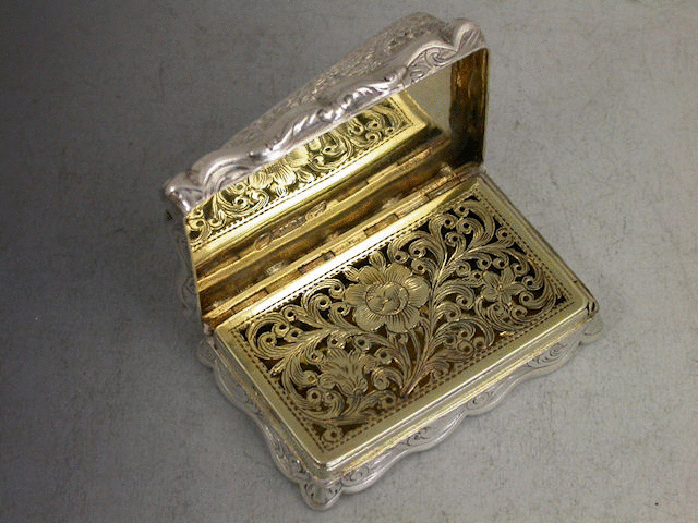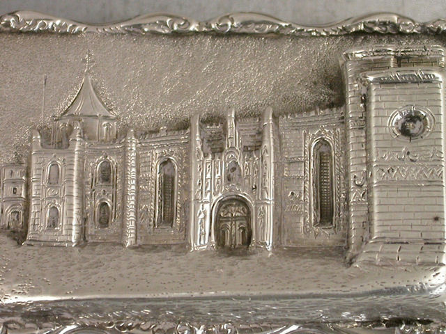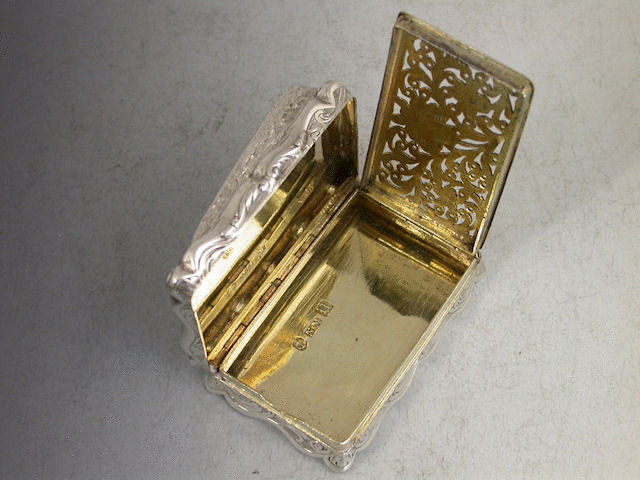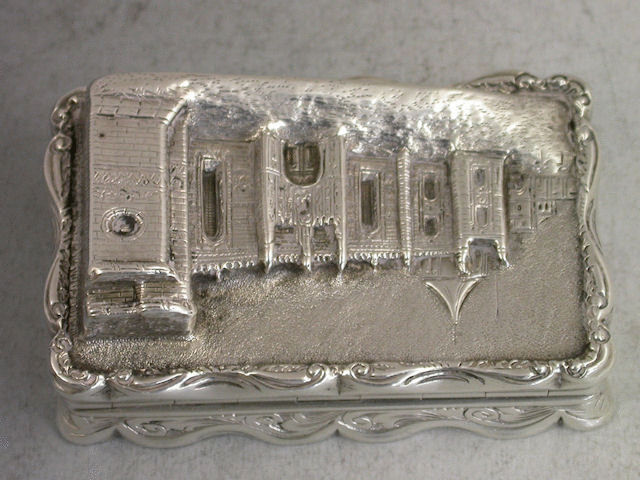 An extremely fine and currently unique large Victorian silver “Castle Top” Vinaigrette of shaped rectangular form, the base and sides with foliate scroll engraving and a vacant cartouch, the lid with chased and engraved raised scene depicting the Jeronimos Monastery in Lisbon, Portugal, in very high relief. The silver gilt interior with finely pierced foliate scroll grille with a flowerhead.