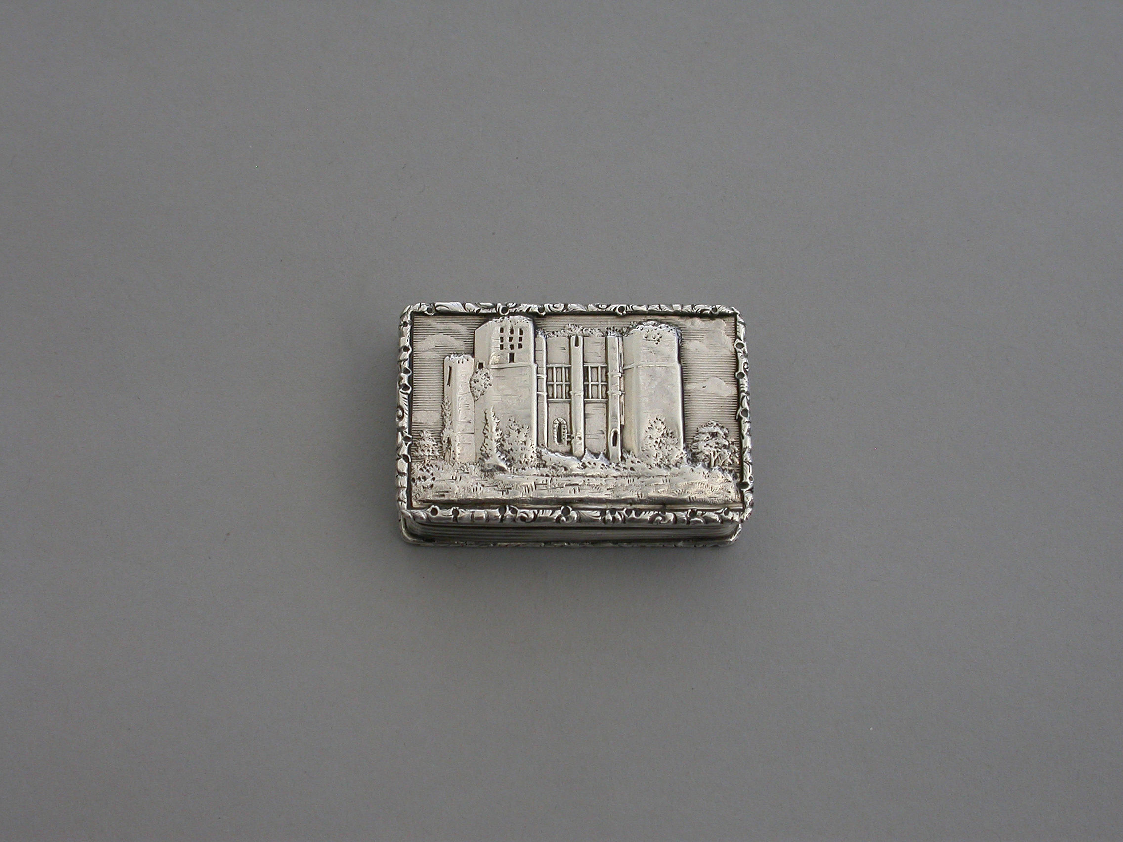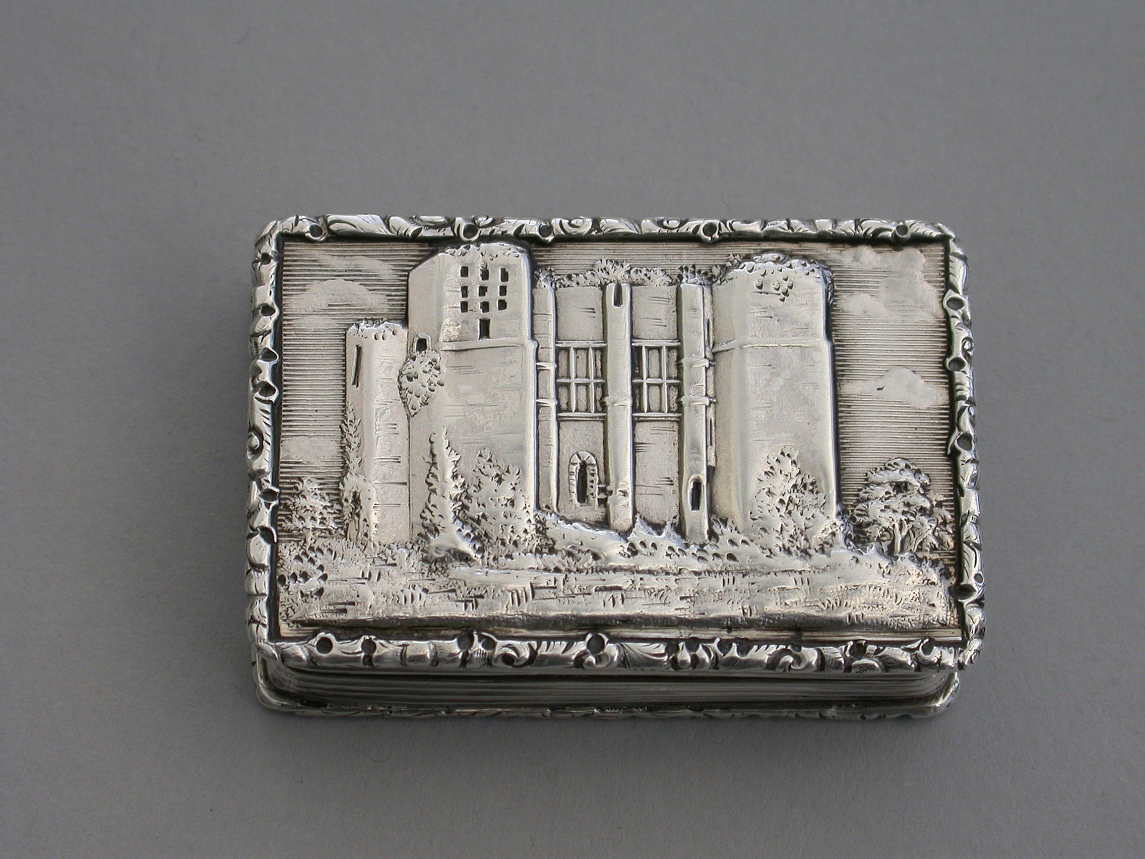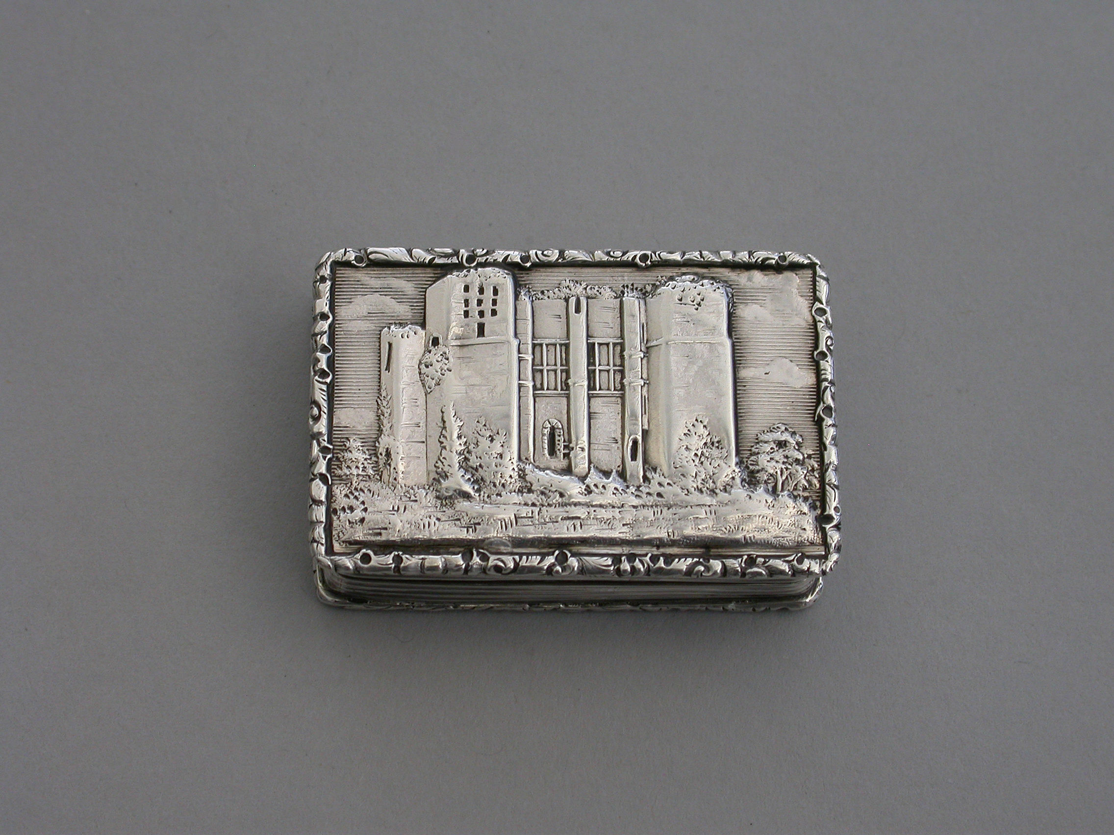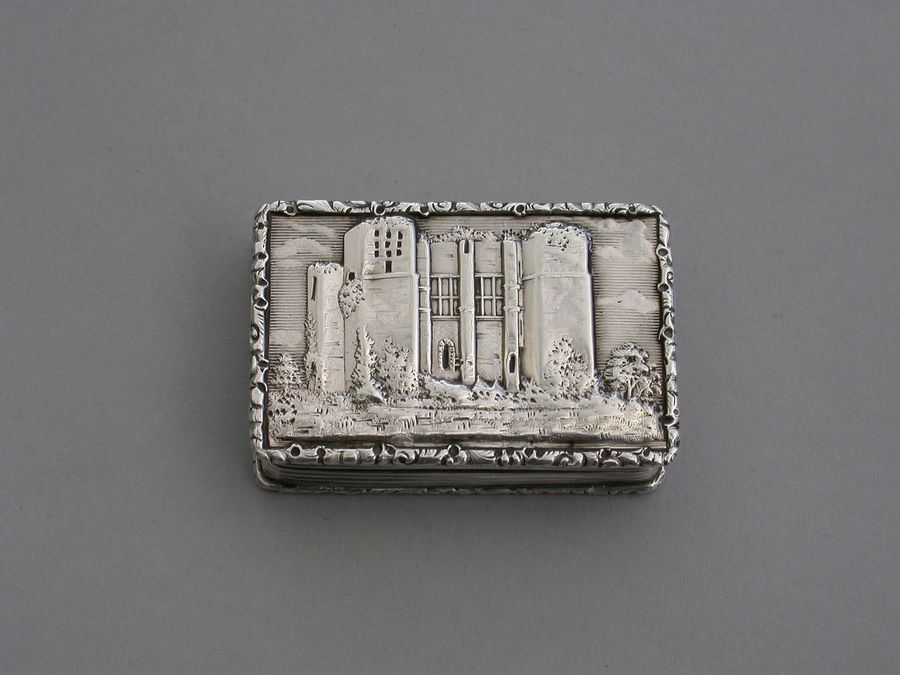 A rare Victorian silver “Castle Top” Vinaigrette of shaped rectangular form, the base engraved with engine turned decoration and a shield shaped cartouche engraved with contemporary initials, the lid decorated with a scene depicting Kenilworth Castle Keep in high relief. The silver gilt interior with foliate scroll pierced grille.