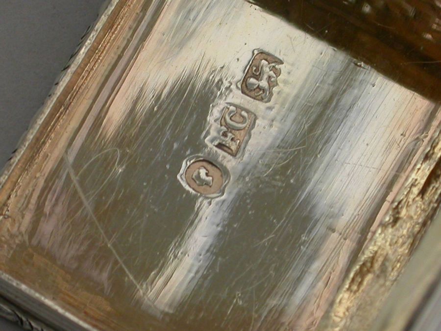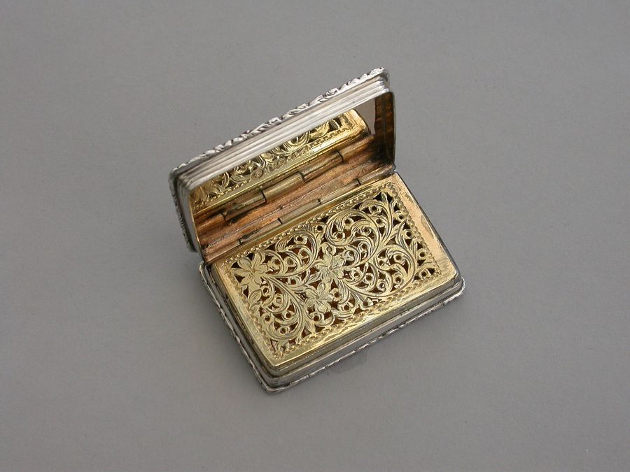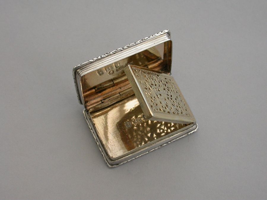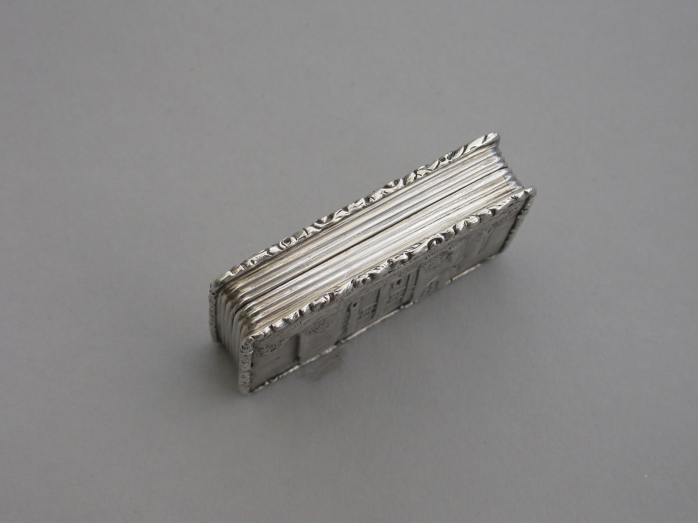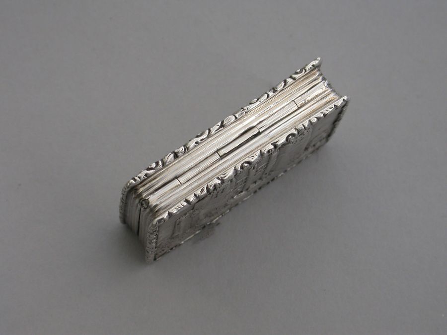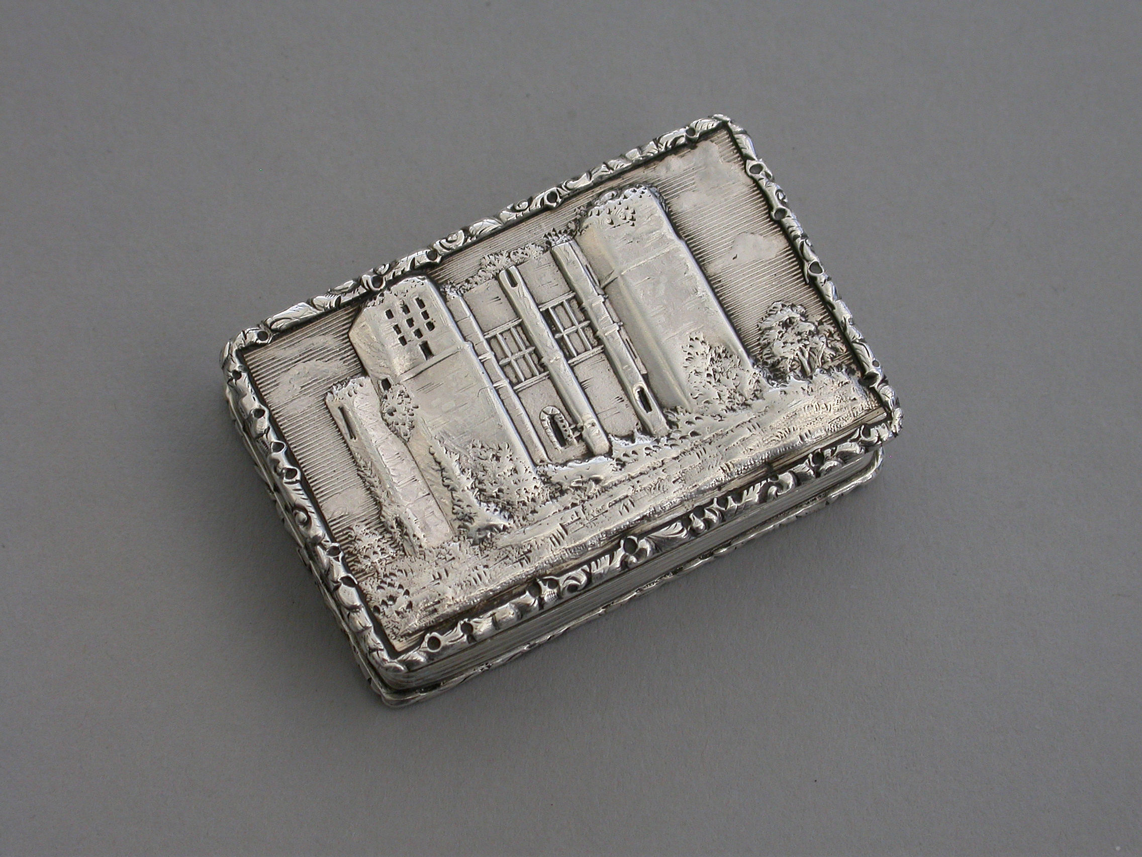 A rare Victorian silver “Castle Top” Vinaigrette of shaped rectangular form, the base engraved with engine turned decoration and a shield shaped cartouche engraved with contemporary initials, the lid decorated with a scene depicting Kenilworth Castle Keep in high relief. The silver gilt interior with foliate scroll pierced grille.