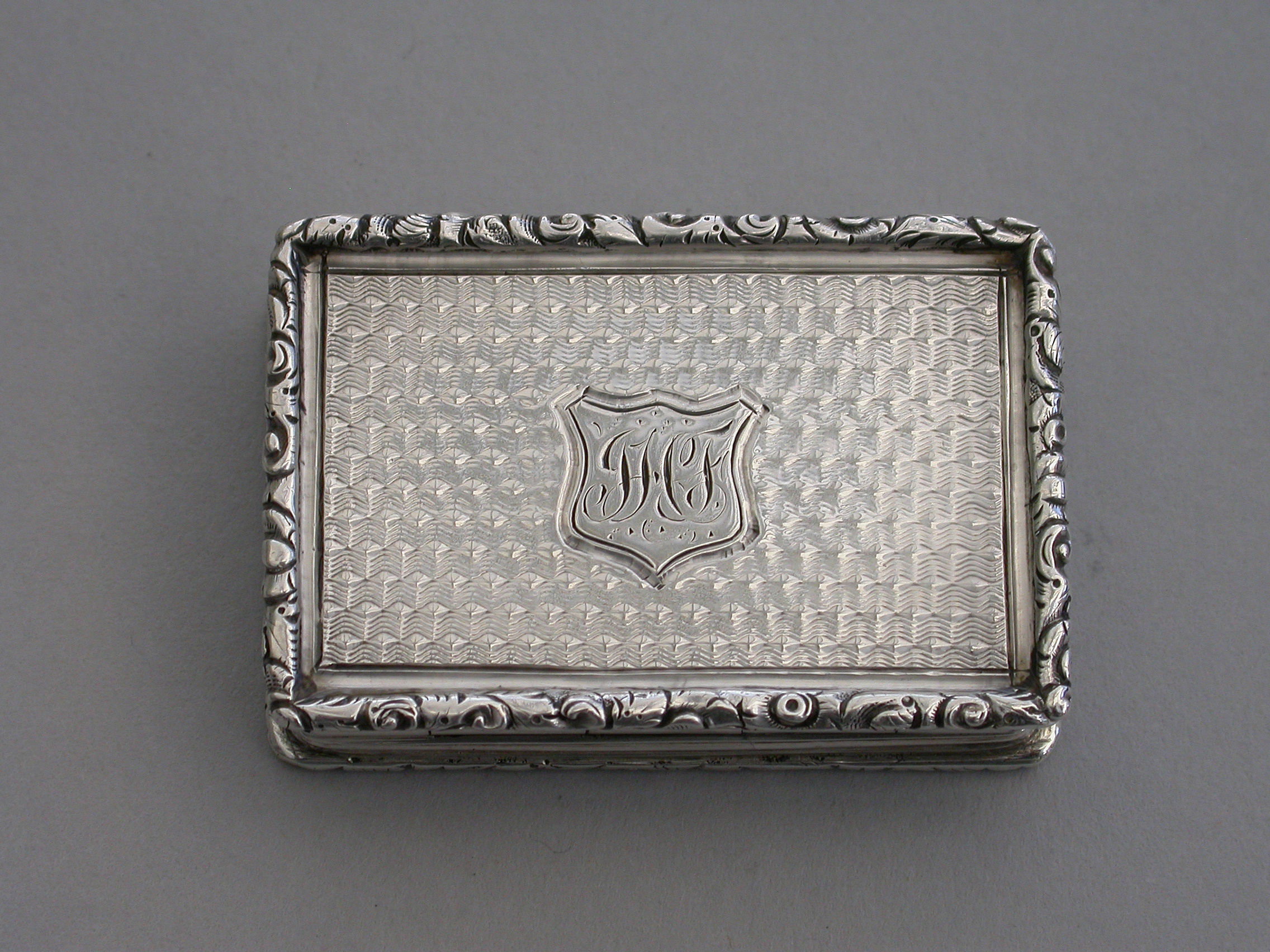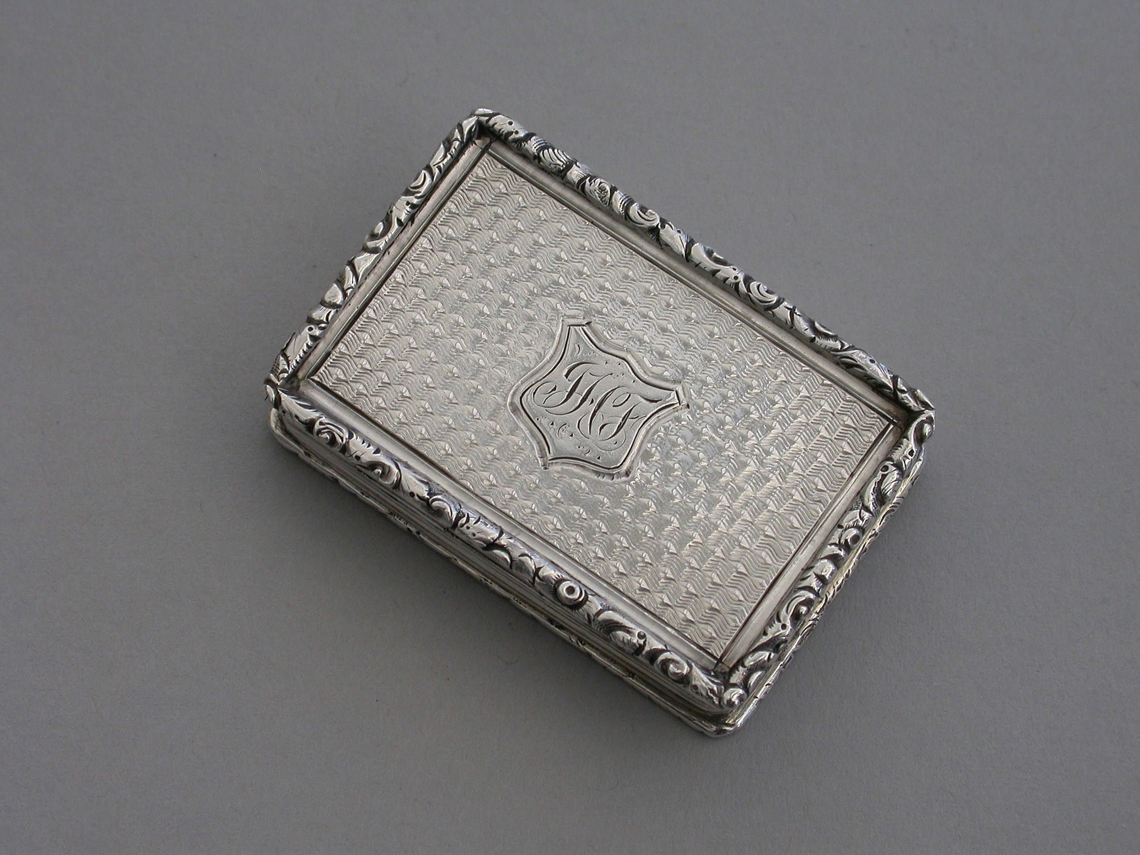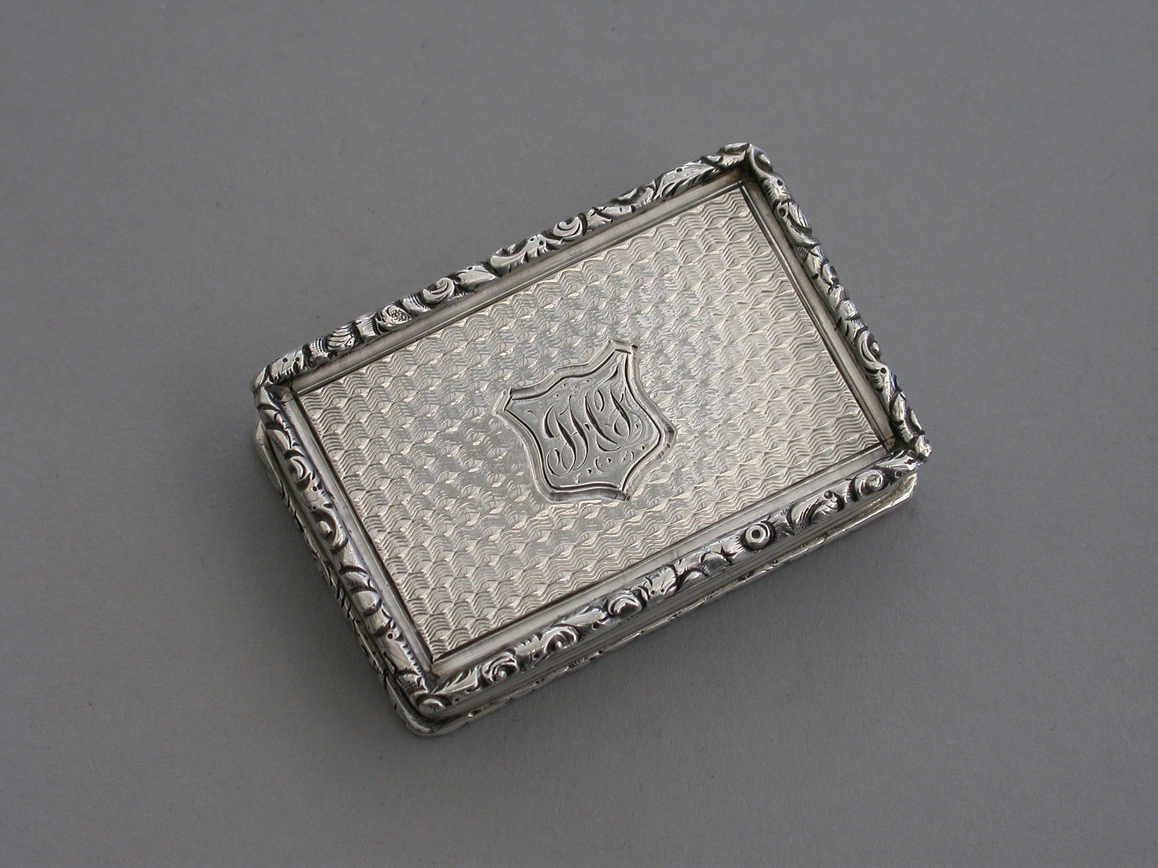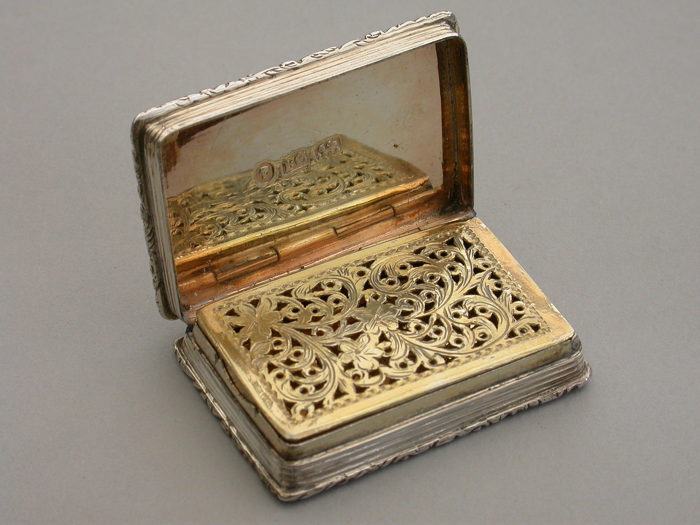 A rare Victorian silver “Castle Top” Vinaigrette of shaped rectangular form, the base engraved with engine turned decoration and a shield shaped cartouche engraved with contemporary initials, the lid decorated with a scene depicting Kenilworth Castle Keep in high relief. The silver gilt interior with foliate scroll pierced grille.
