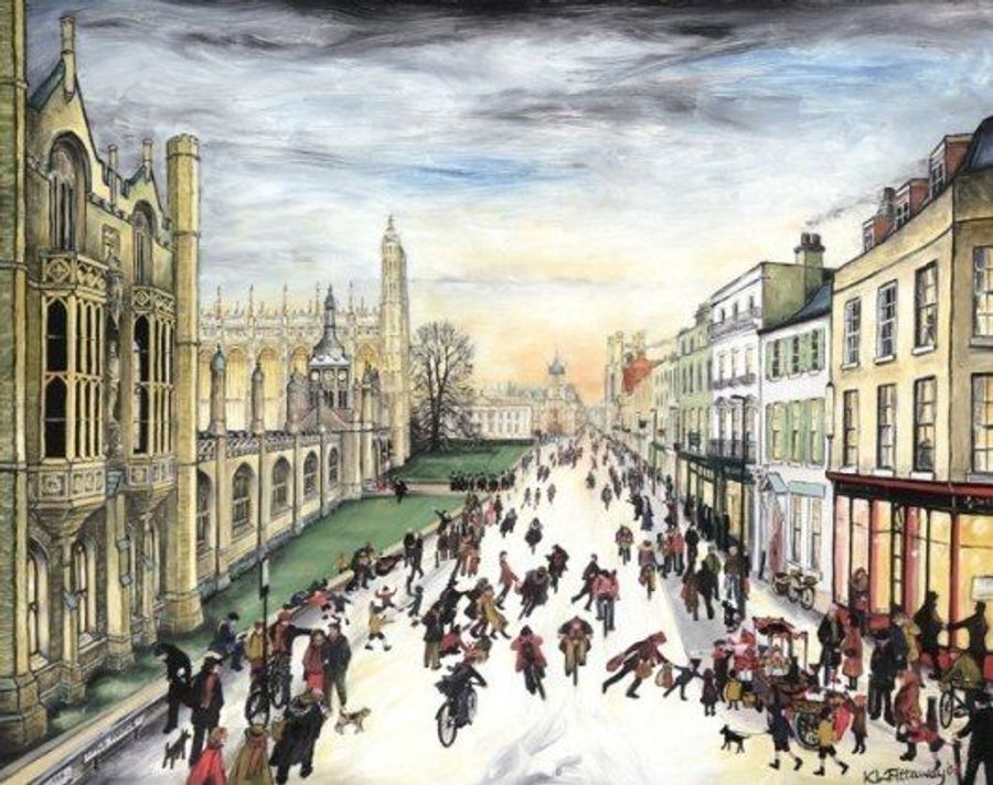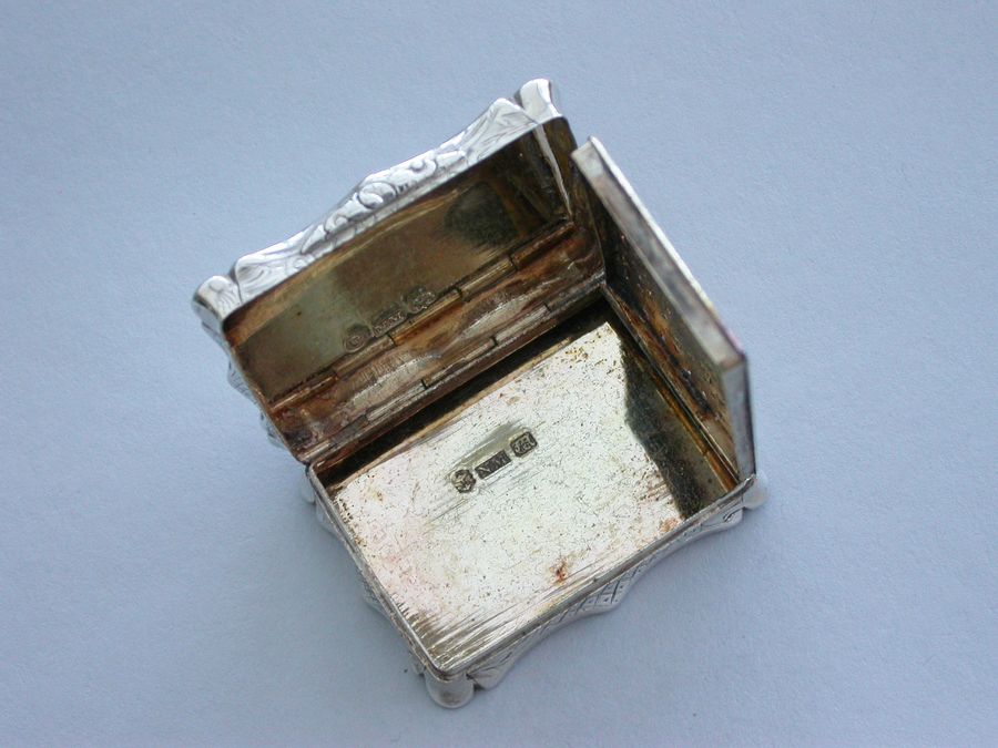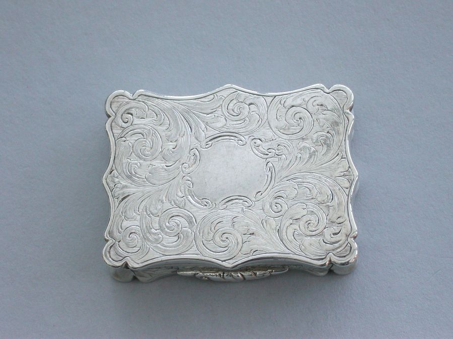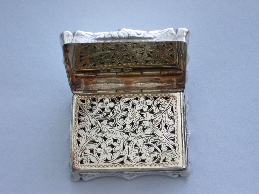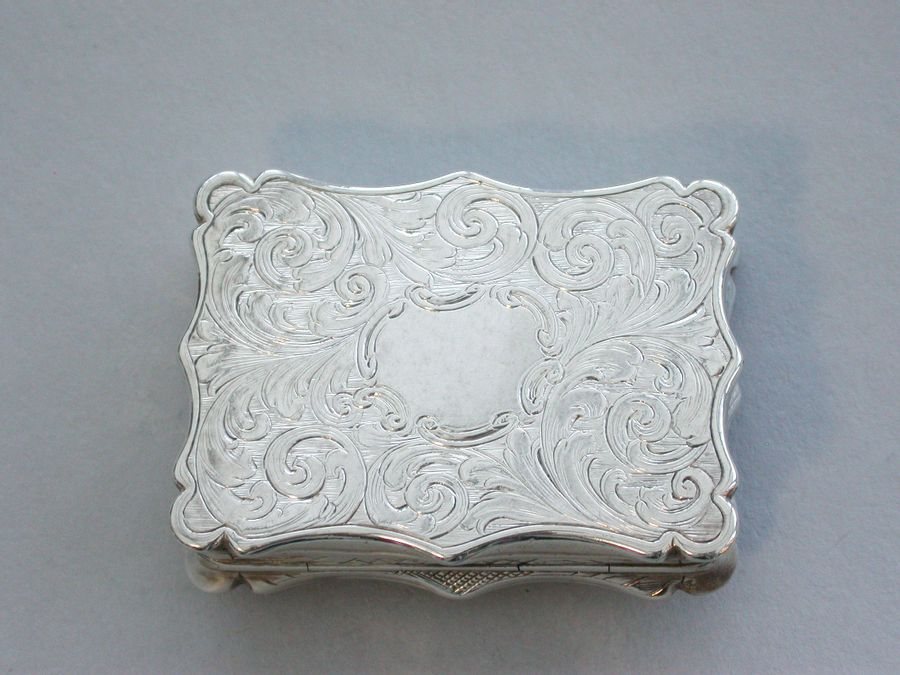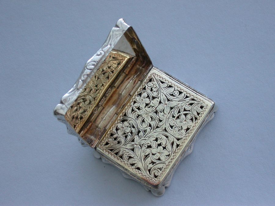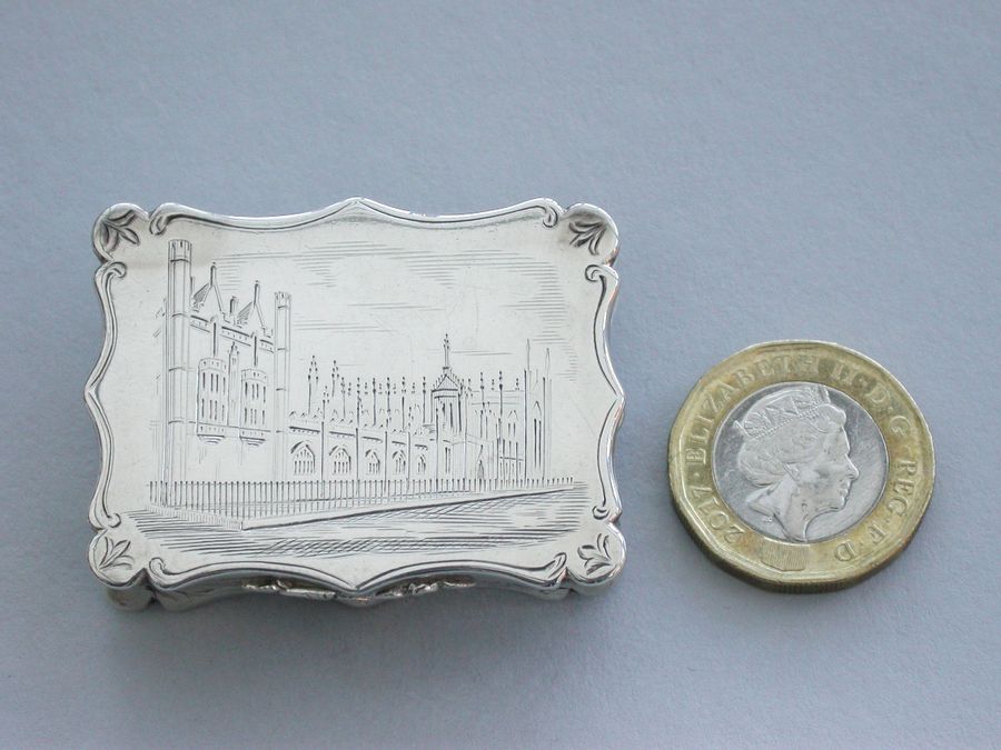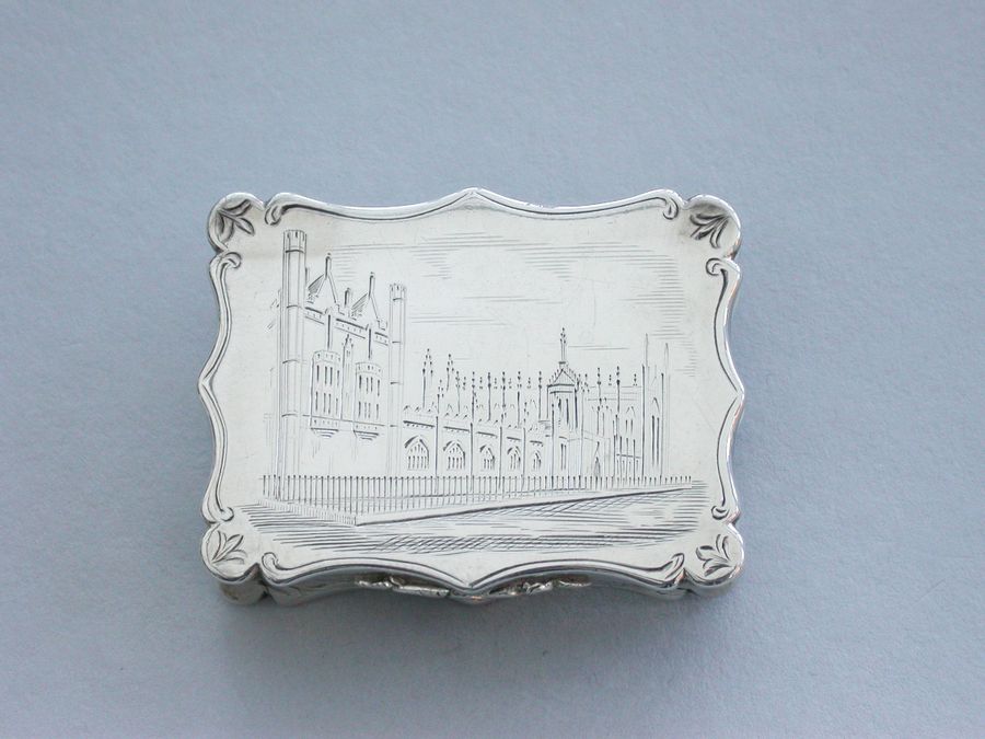 An extremely rare and previously unrecorded large Victorian silver castle-top Vinaigrette of shaped rectangular form, the base and sides engraved with foliate scrolls and a vacant cartouche. The cover engraved with a scene depicting The Kings Parade in Cambridge with Kings College and Chapel on the left, within a border with stylised leaves to each corner. The silver gilt grille pierced with flowers and foliage.