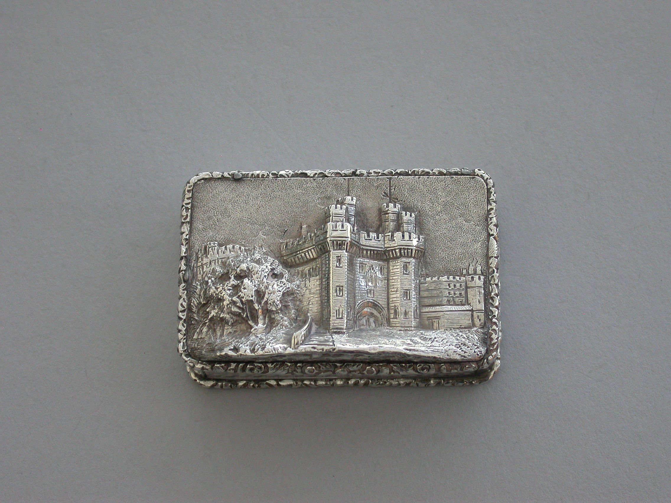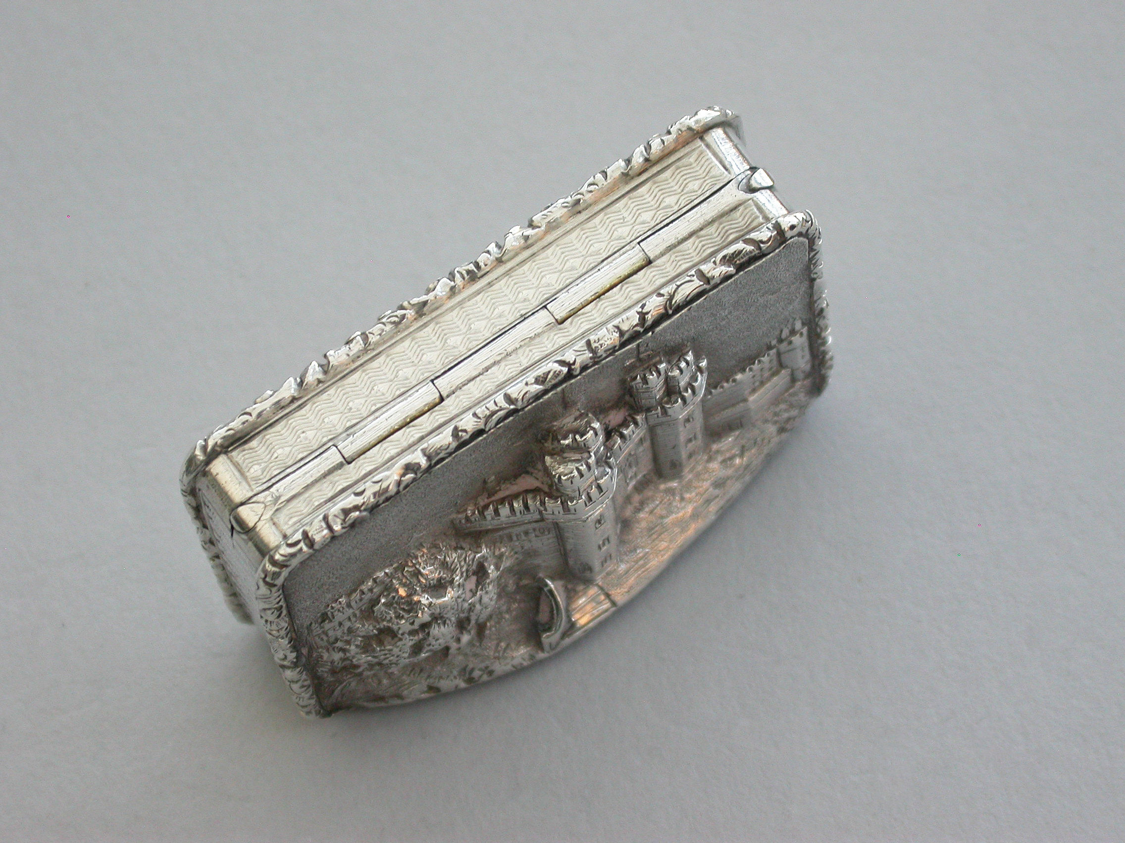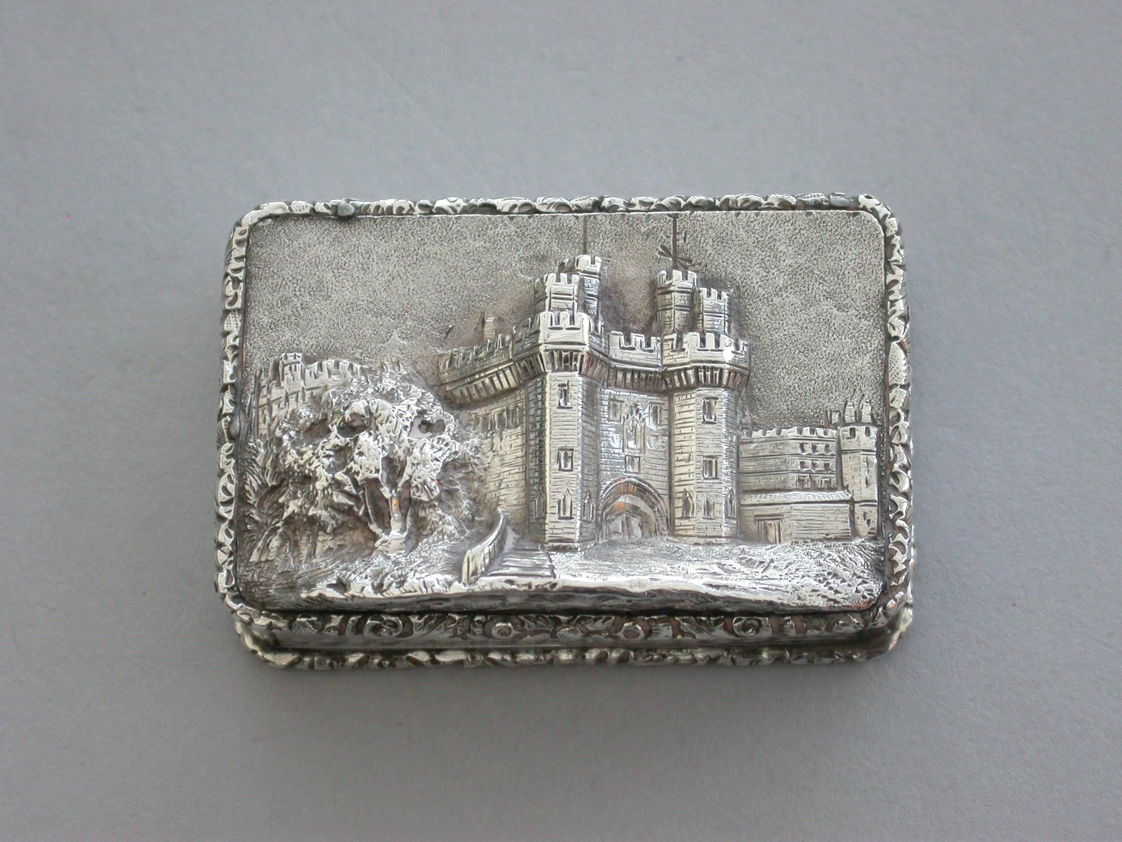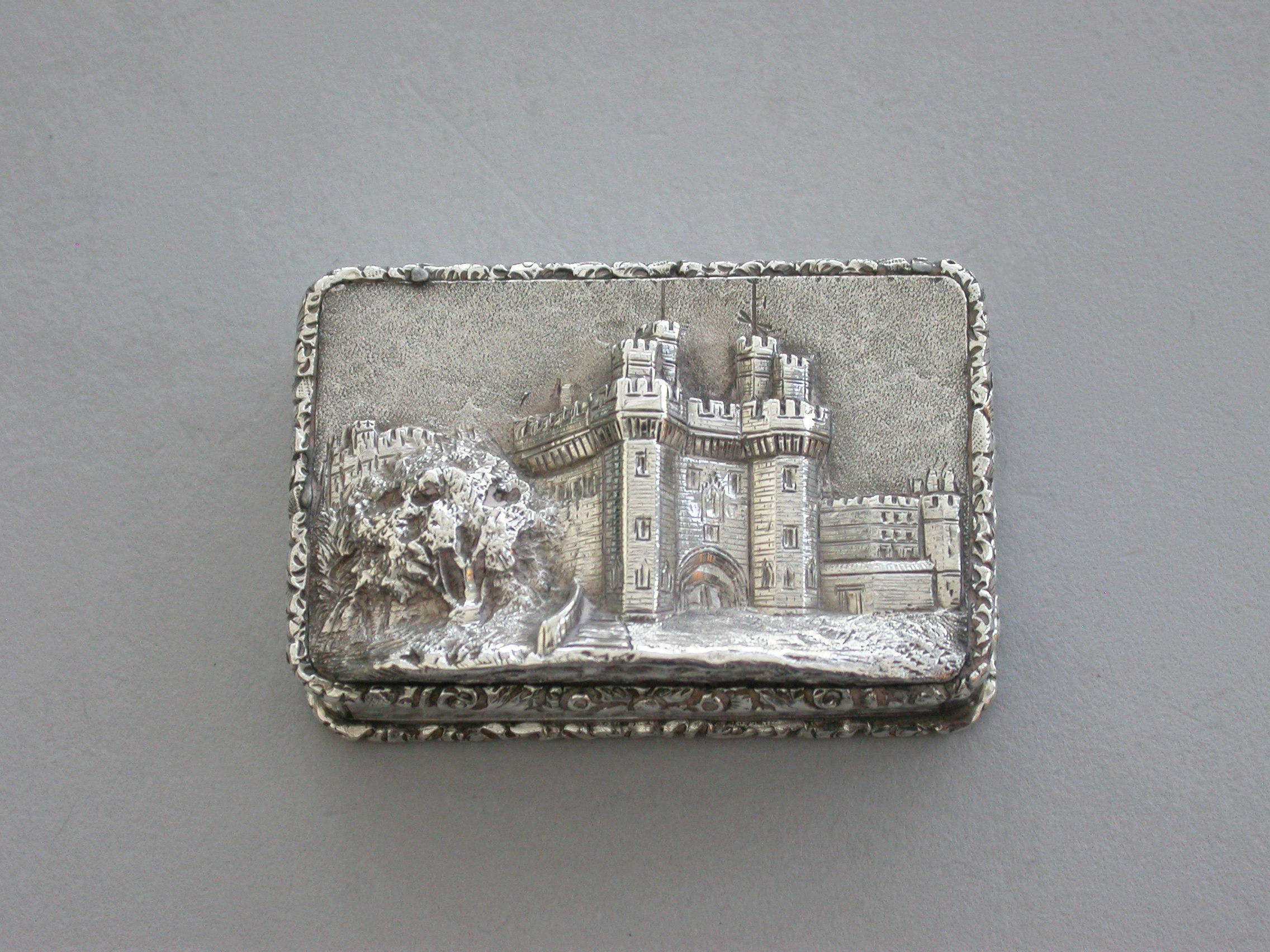 An extremely rare Victorian silver castle-top Vinaigrette of rectangular form with engine turned base and sides with a vacant cartouche, the lid with a high relief scene depicting The Gate House at Lancaster Castle on a textured ground. The silver gilt grille pierced with a central flower stem and scrolling leaf fronds to either side.