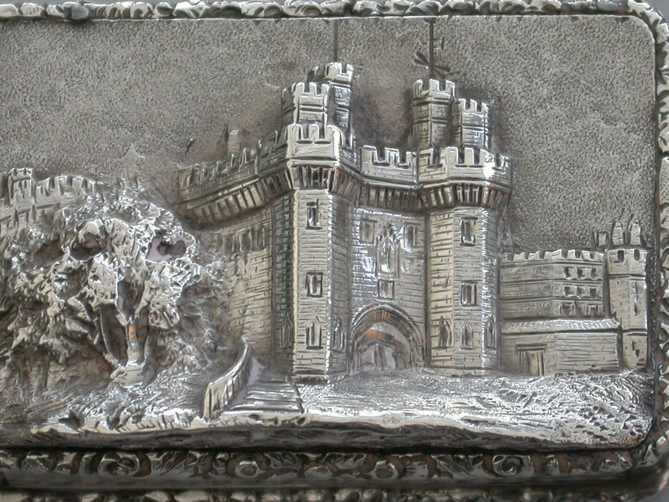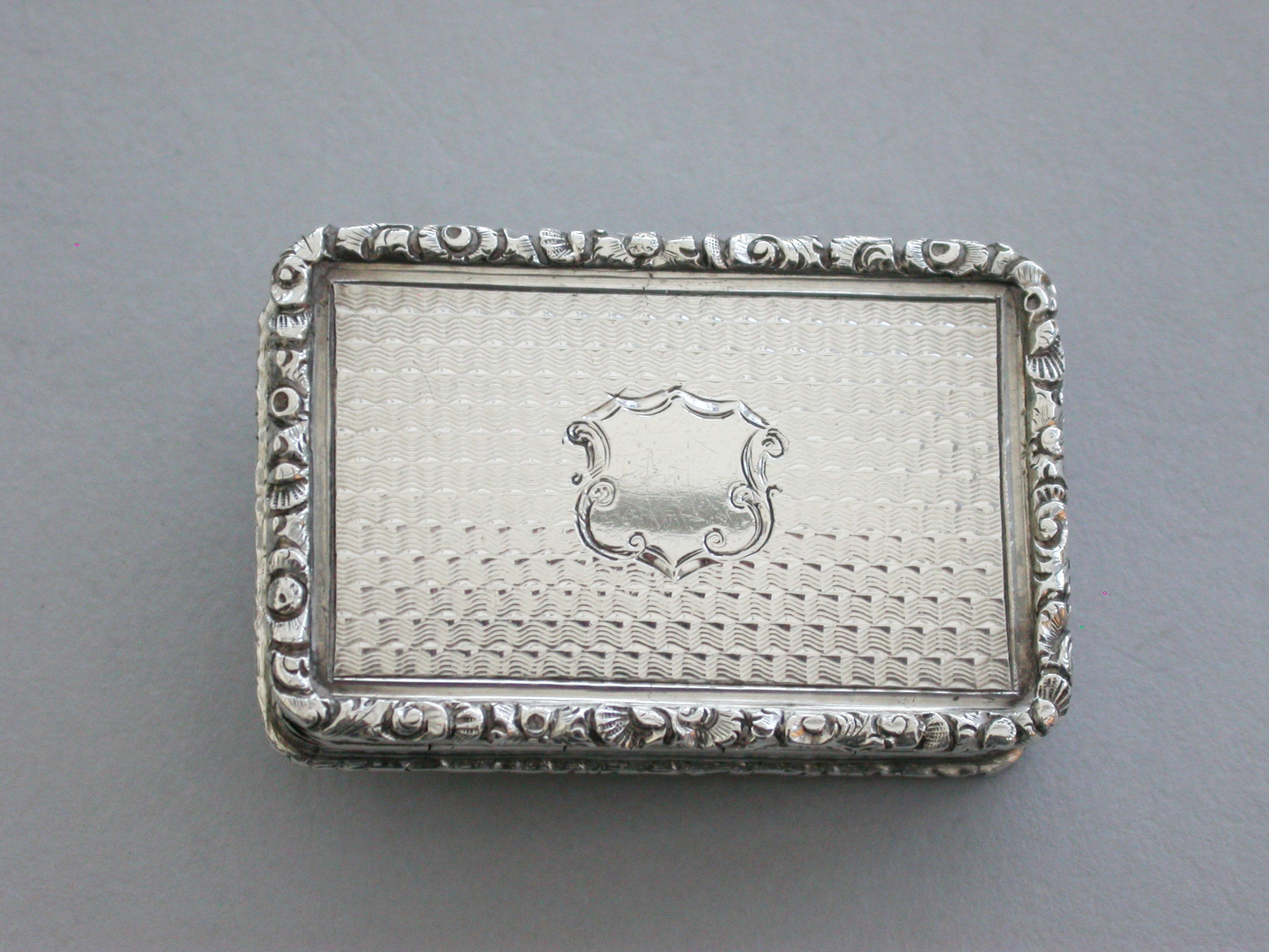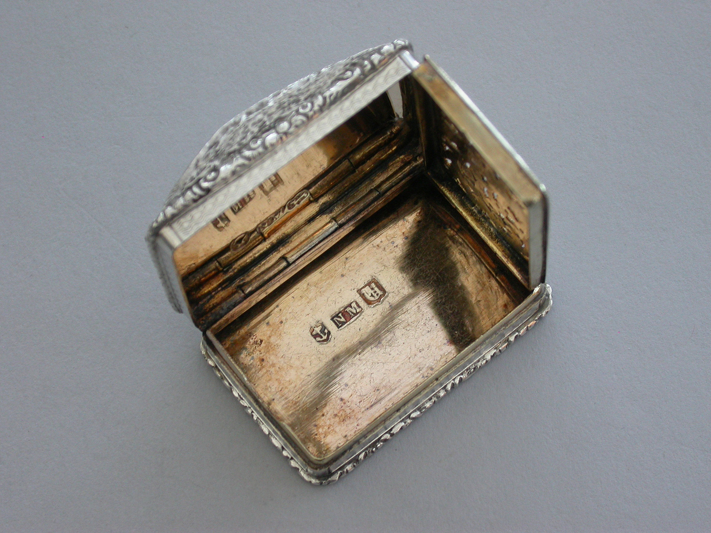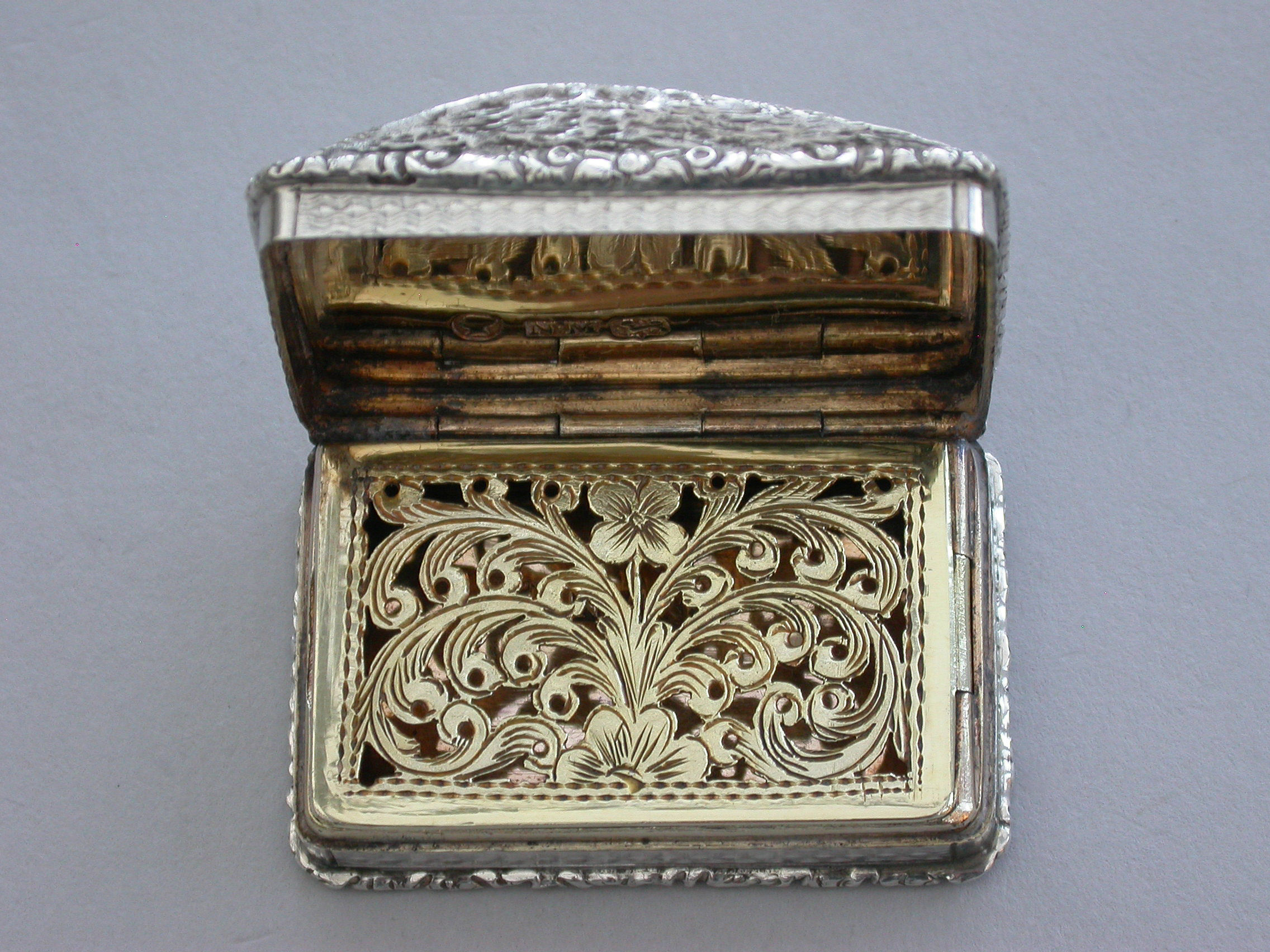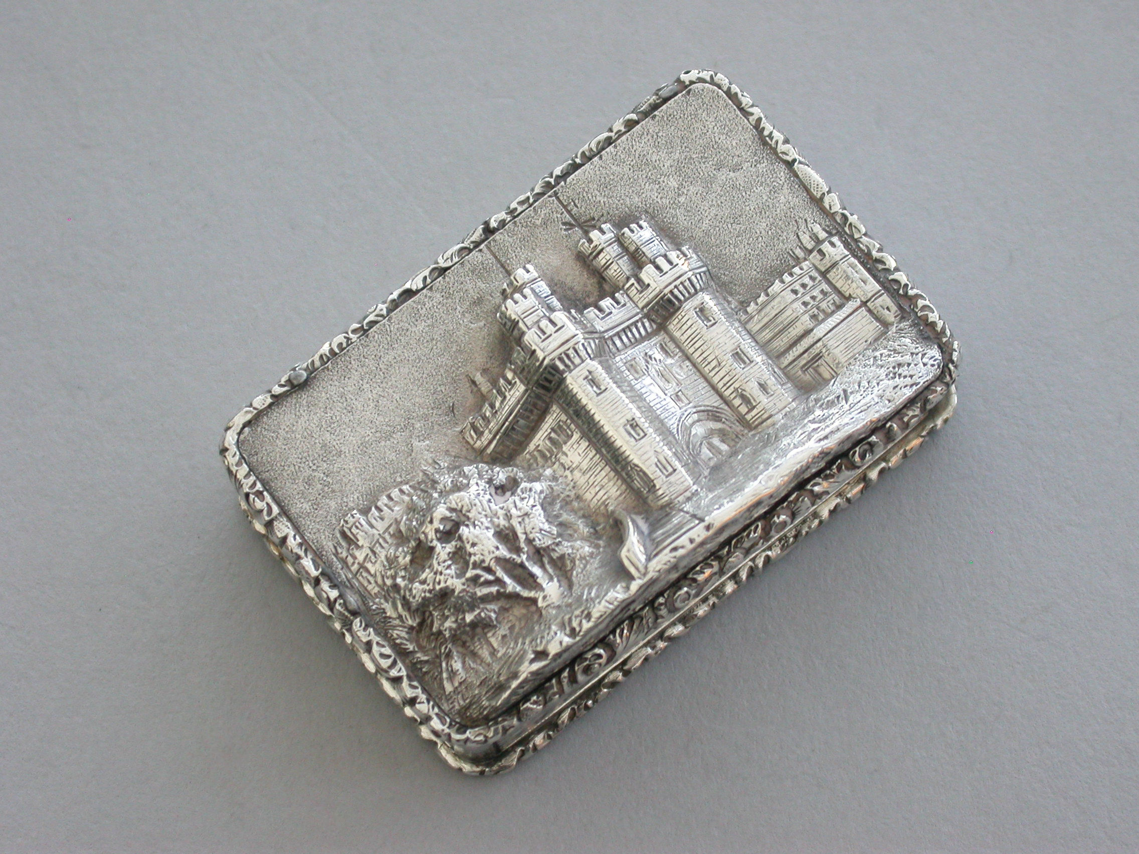 An extremely rare Victorian silver castle-top Vinaigrette of rectangular form with engine turned base and sides with a vacant cartouche, the lid with a high relief scene depicting The Gate House at Lancaster Castle on a textured ground. The silver gilt grille pierced with a central flower stem and scrolling leaf fronds to either side.