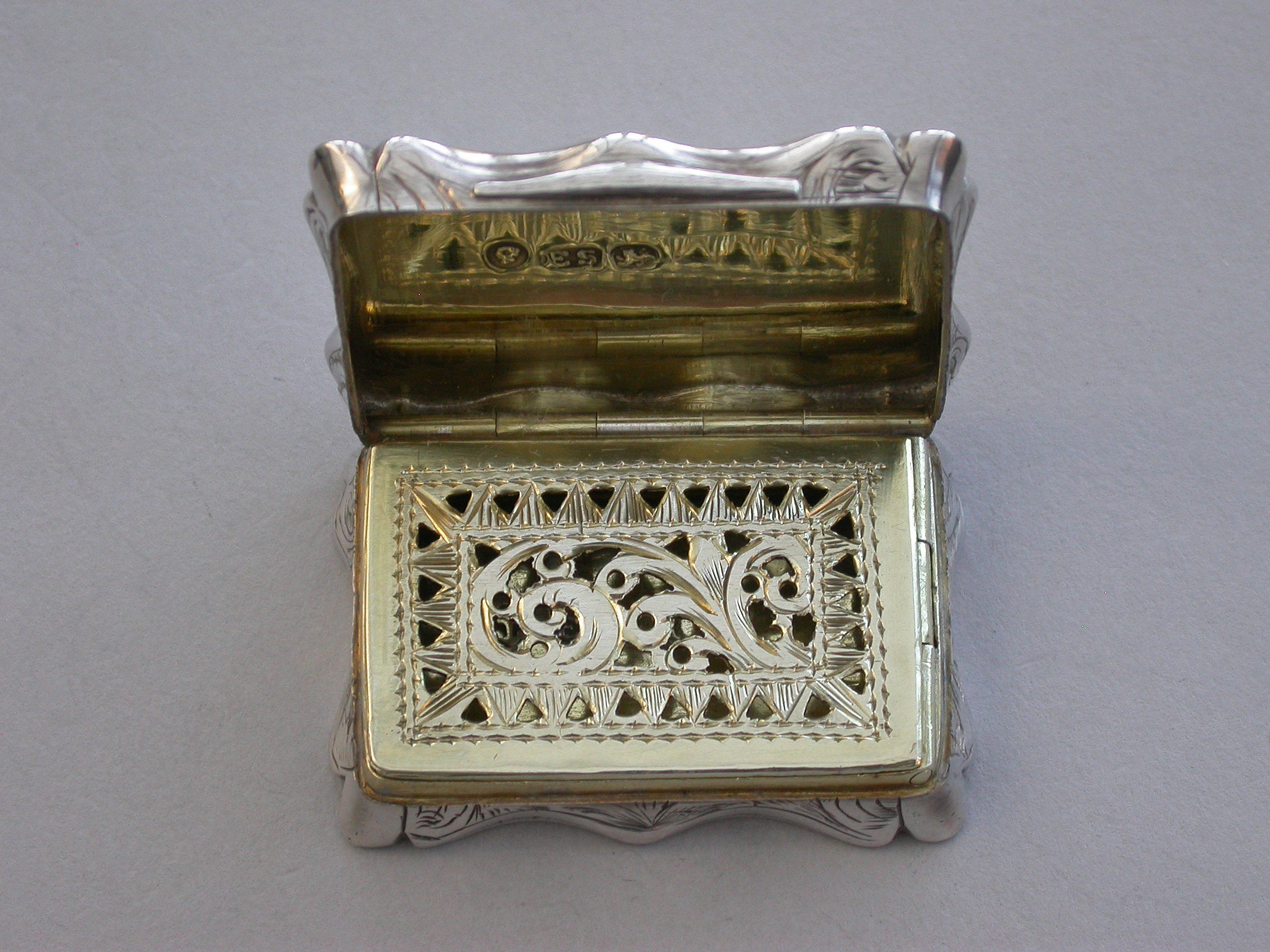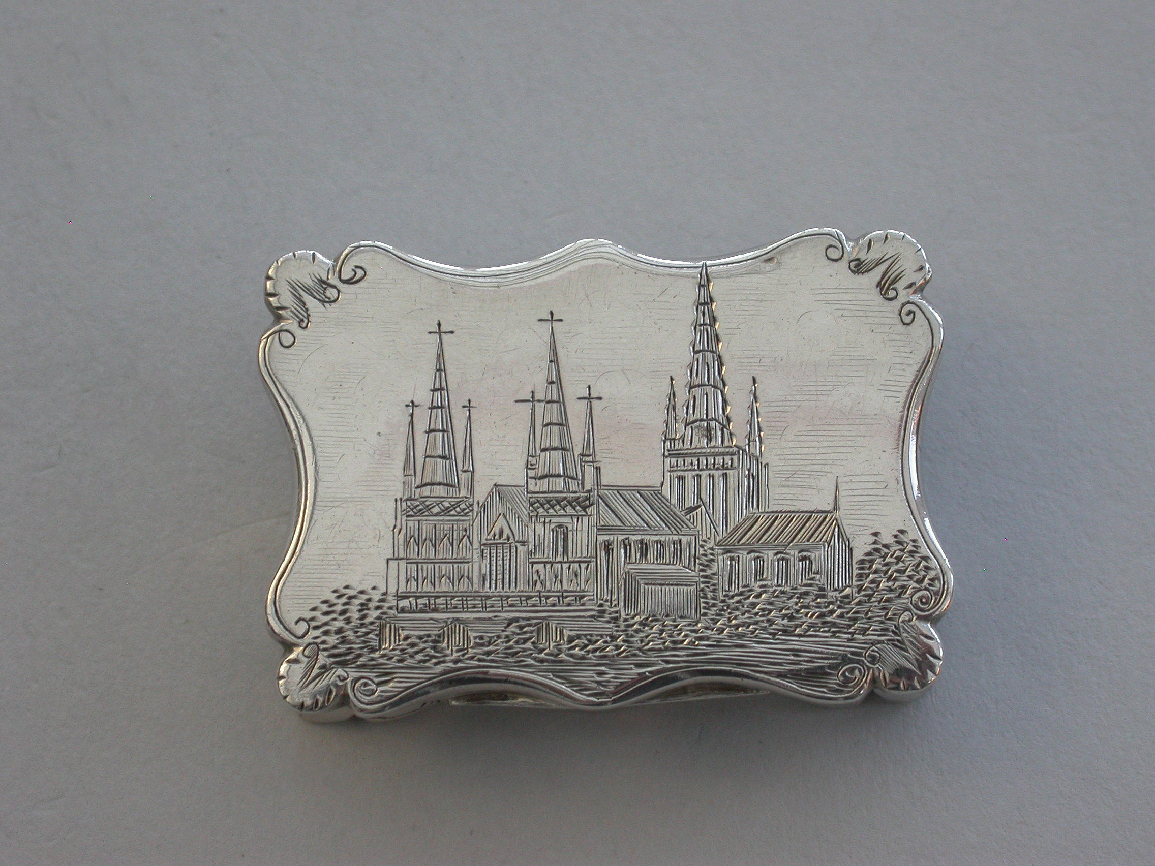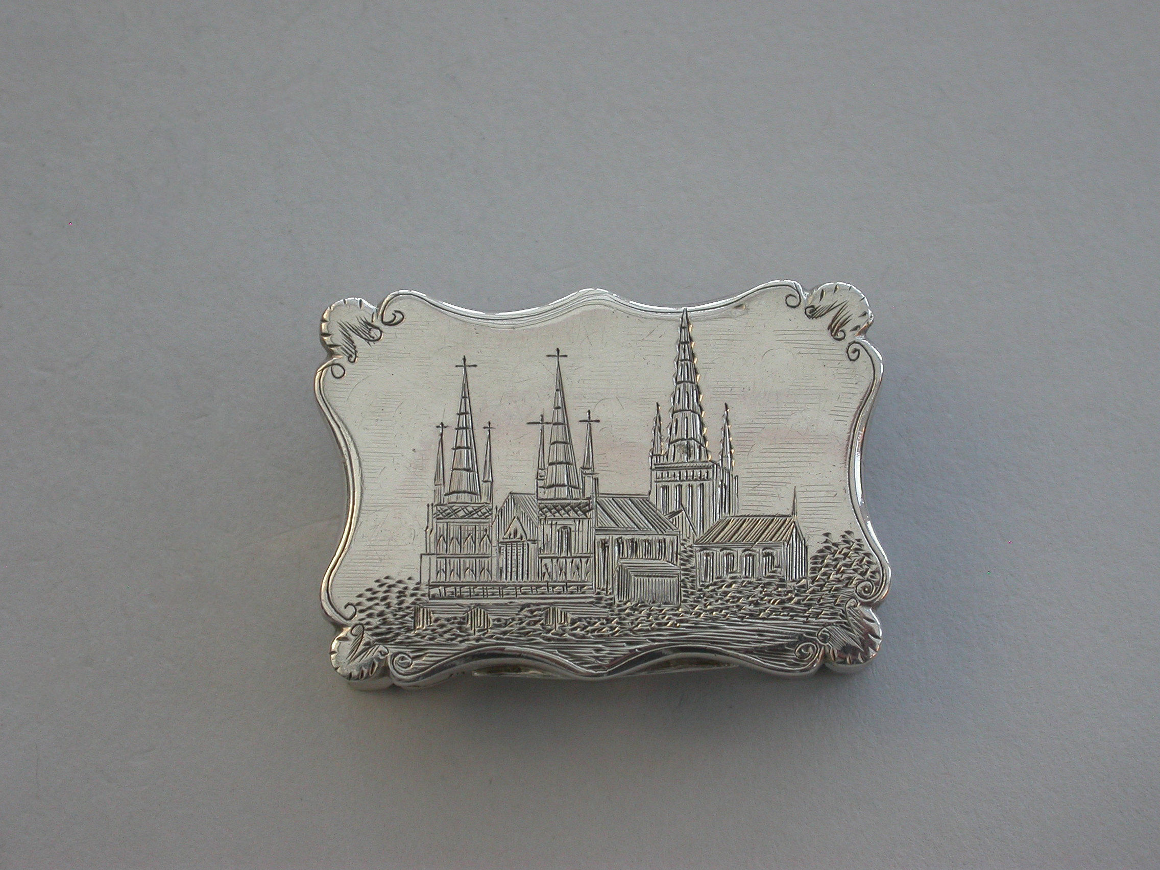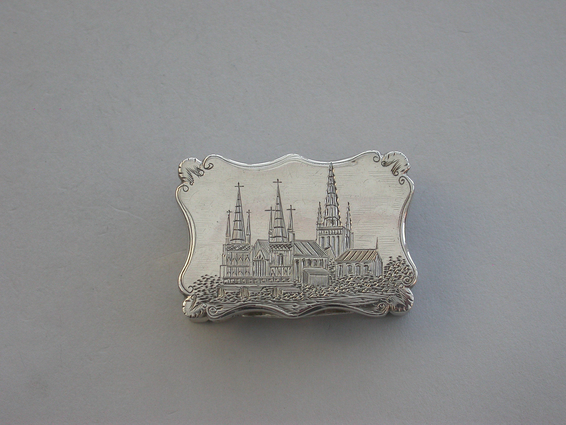 An extremely rare Victorian silver Castle-top Vinaigrette of shaped rectangular form, the base engraved with folaite scroll decoration and a vacant cartouche. The cover engraved with a scene depicting Lichfield Cathedral. The silver gilt grille pierced with leaf scrolls within a pierced zigzag border.