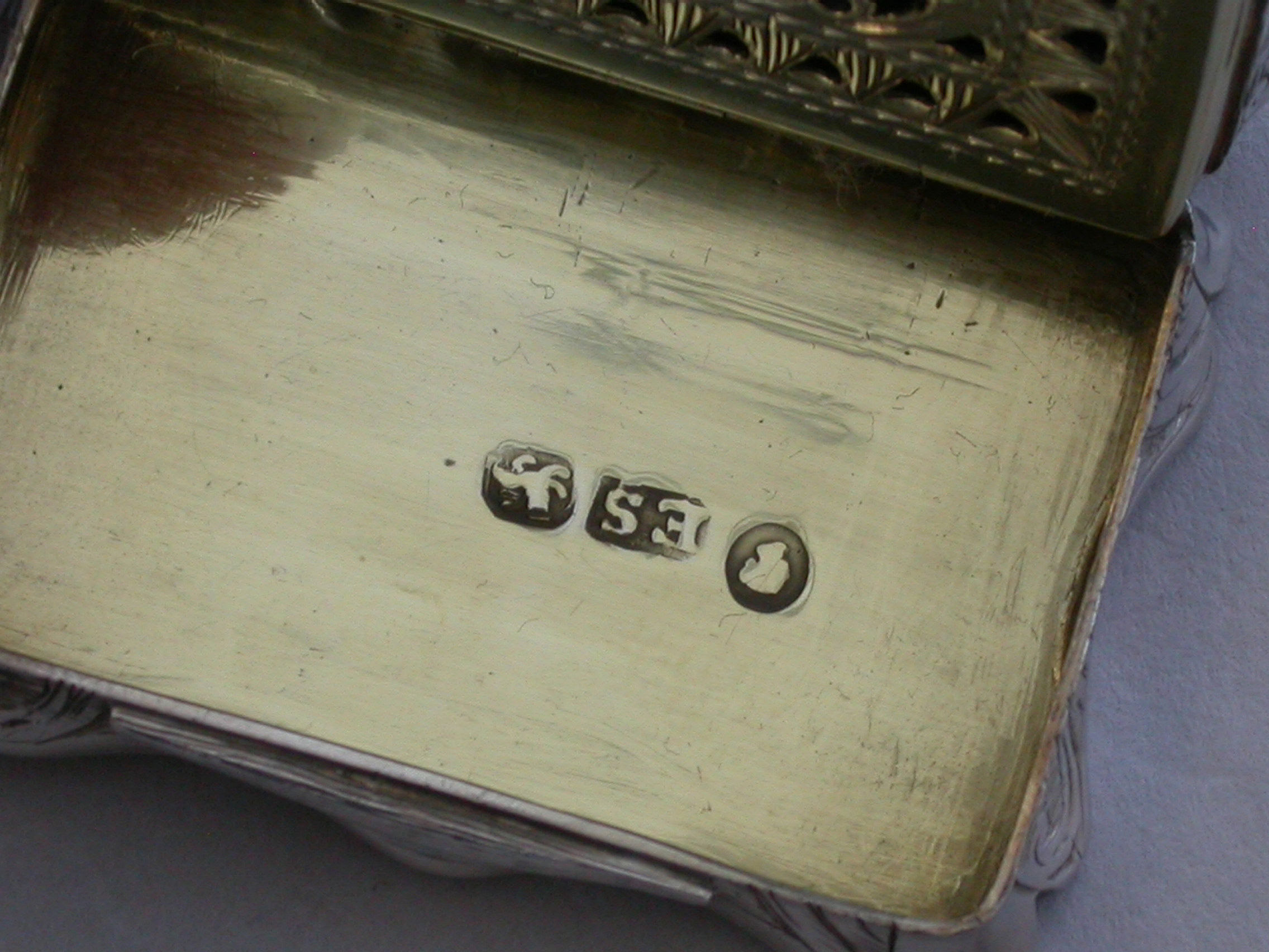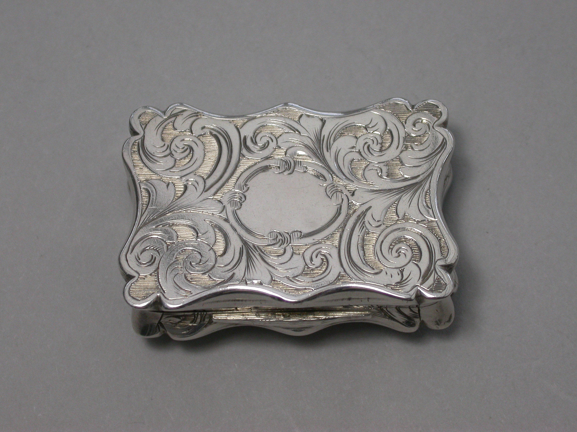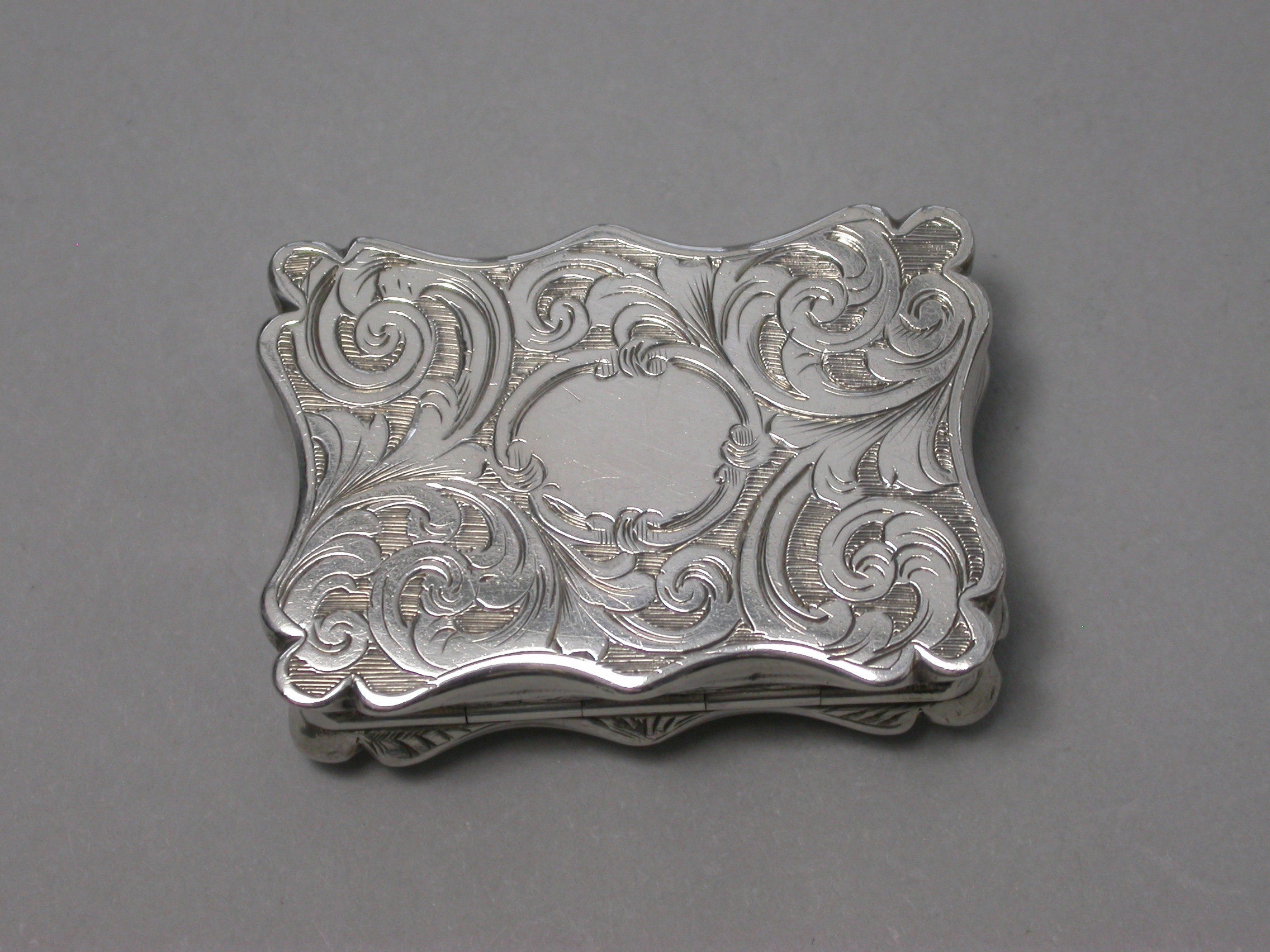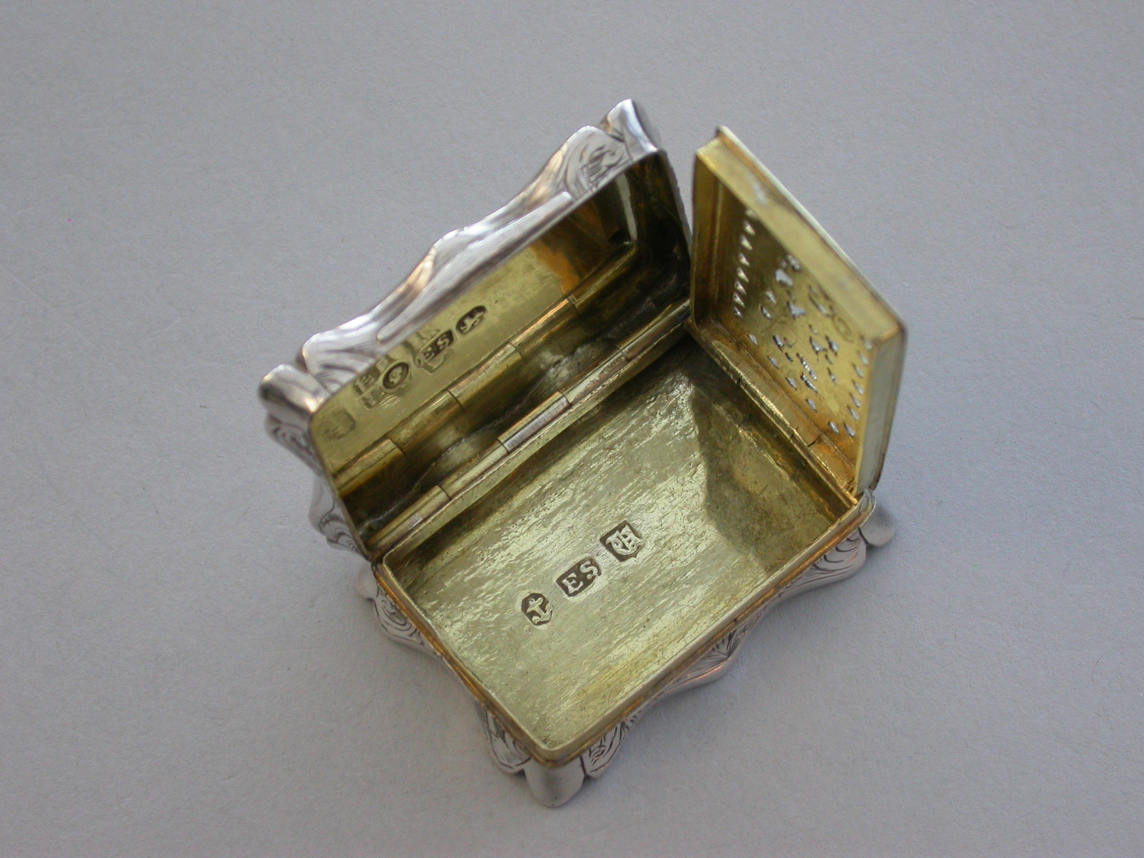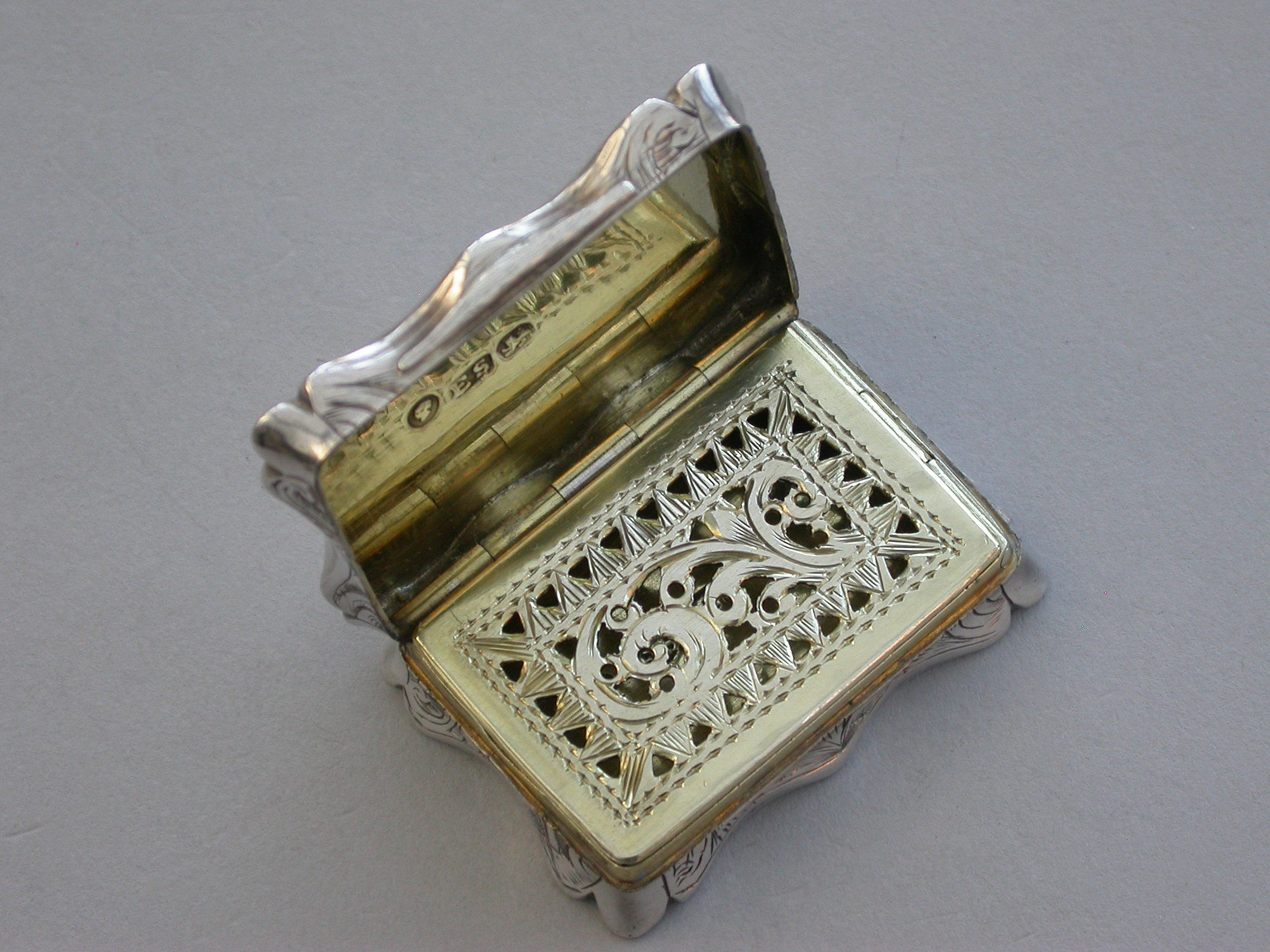 An extremely rare Victorian silver Castle-top Vinaigrette of shaped rectangular form, the base engraved with folaite scroll decoration and a vacant cartouche. The cover engraved with a scene depicting Lichfield Cathedral. The silver gilt grille pierced with leaf scrolls within a pierced zigzag border.