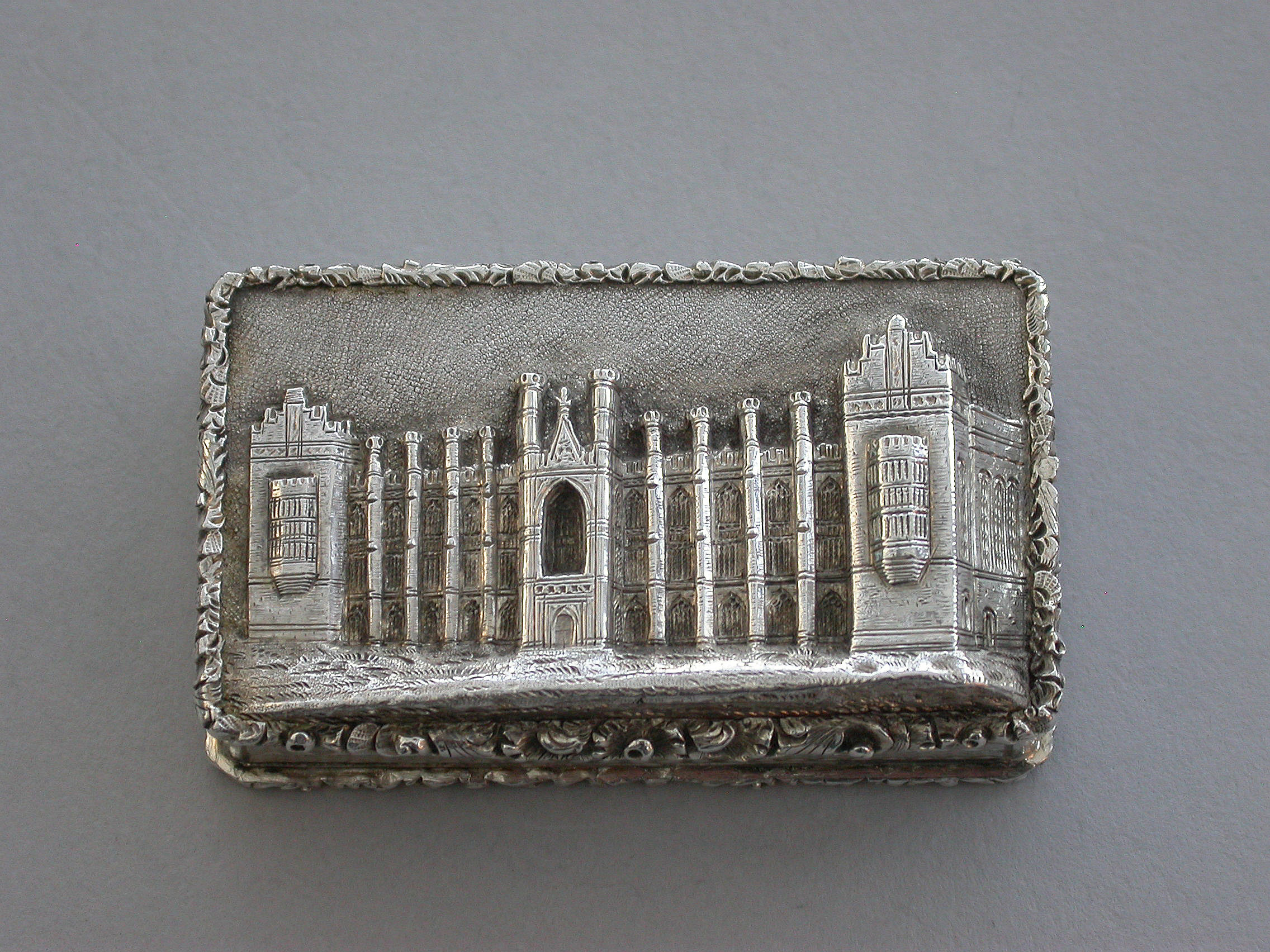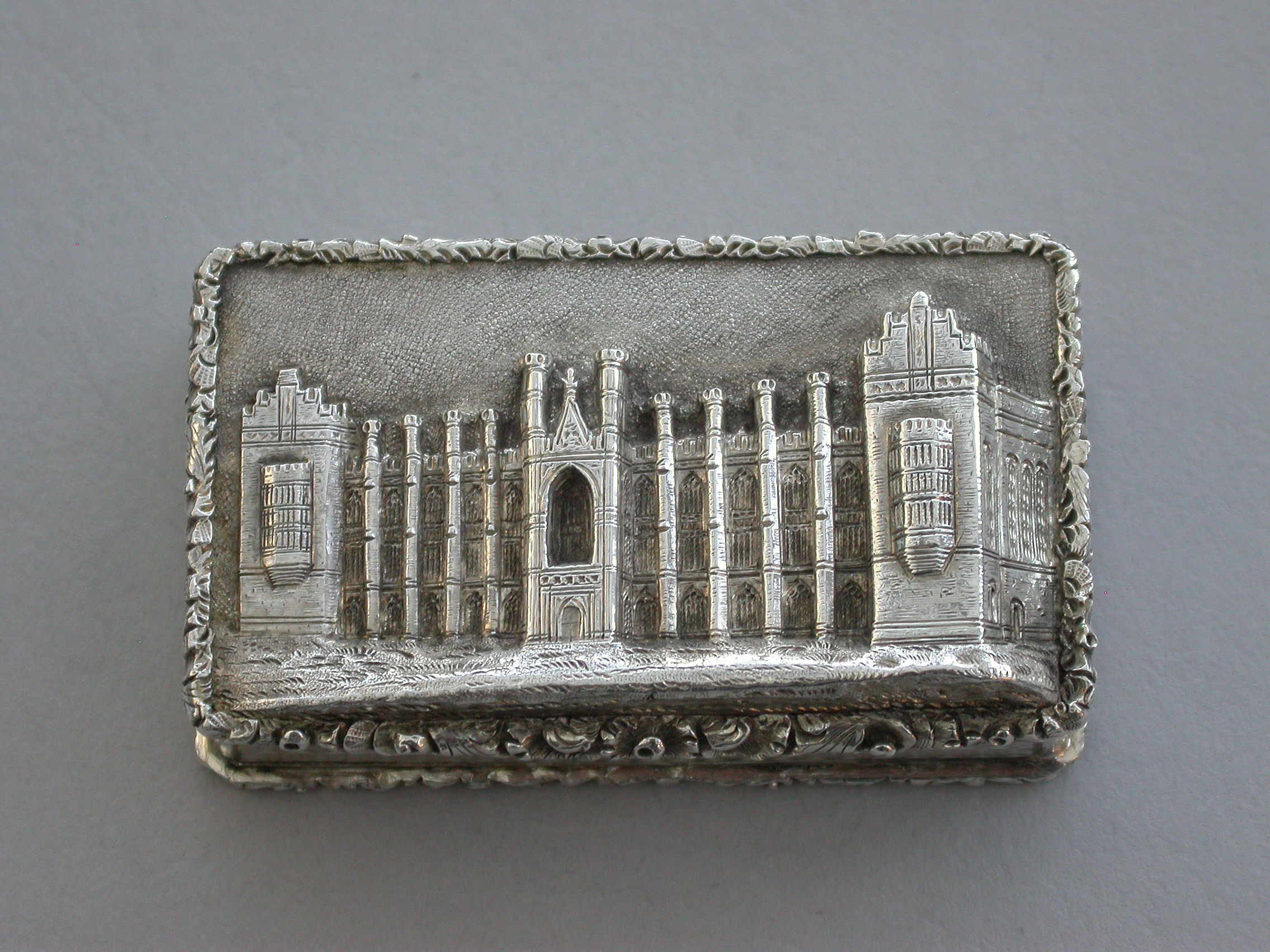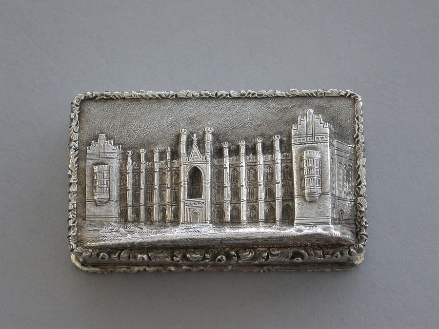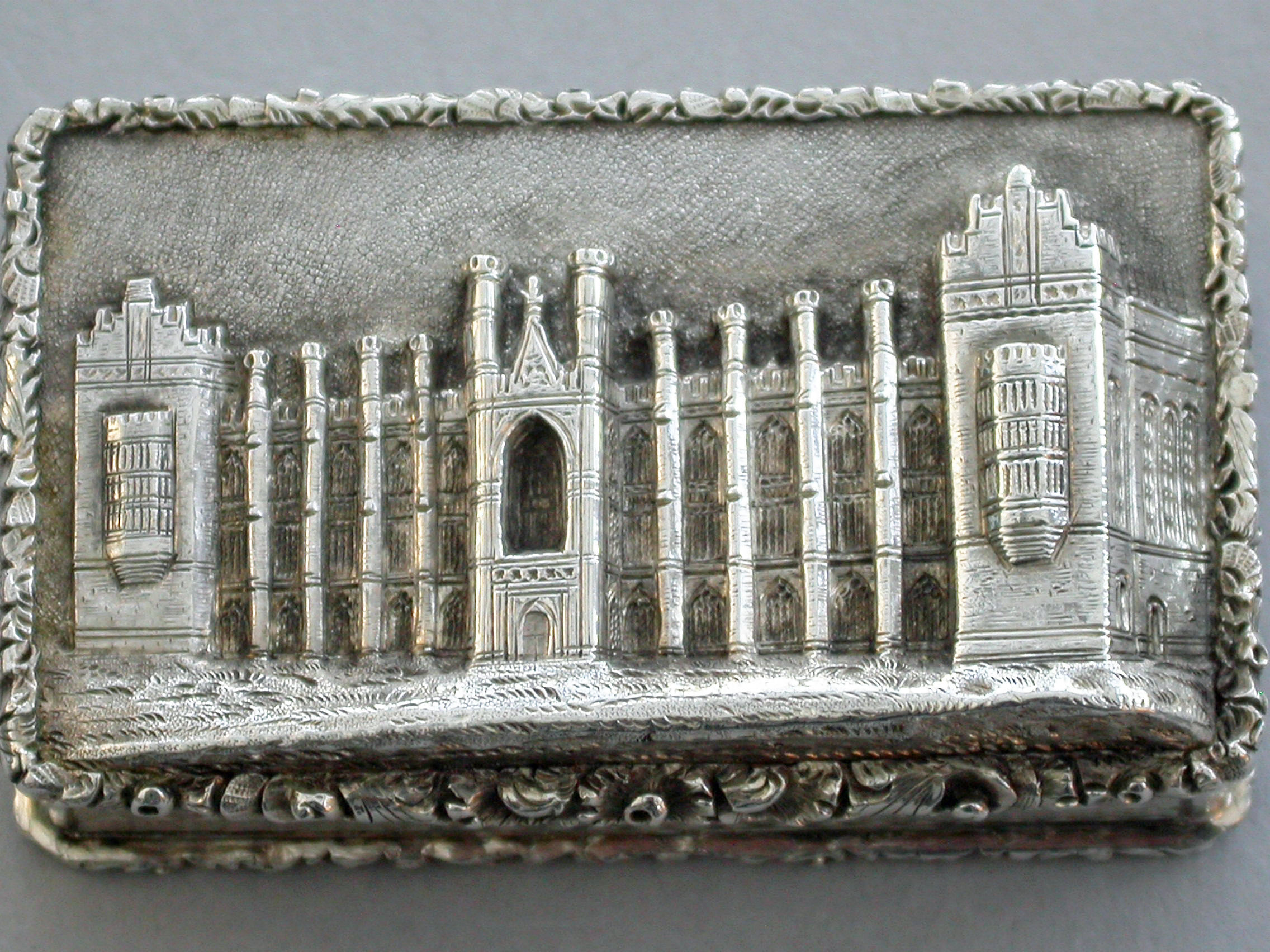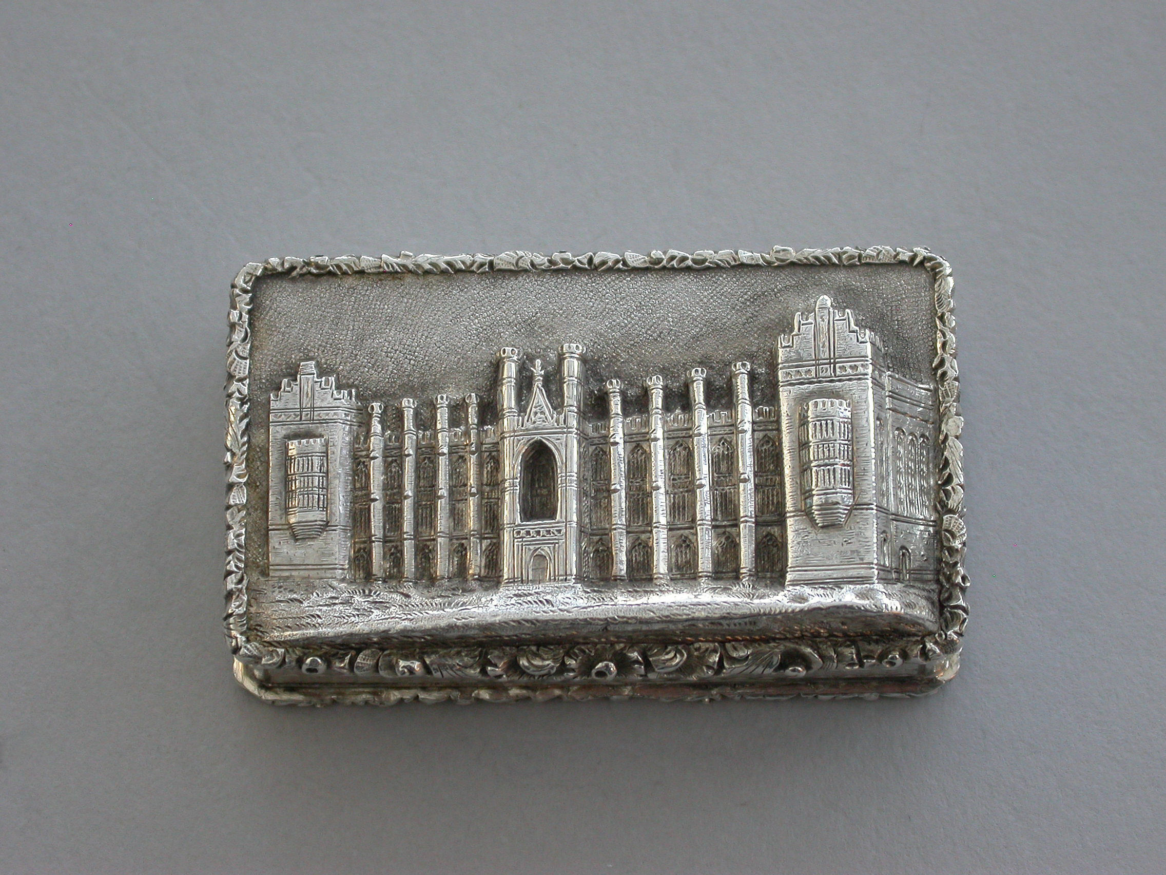 A fine and rare Victorian silver Castle-Top Vinaigrette, the base and sides with engine turned decoration and a shield-shaped vacant cartouche, the lid with raised scene depicting Liverpool Collegiate College in high relief on a textured ground. The silver gilt interior with hinged grille pierced with floral scrolls around a central flower head.