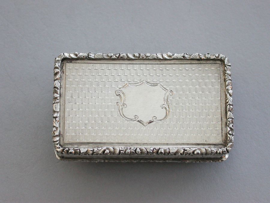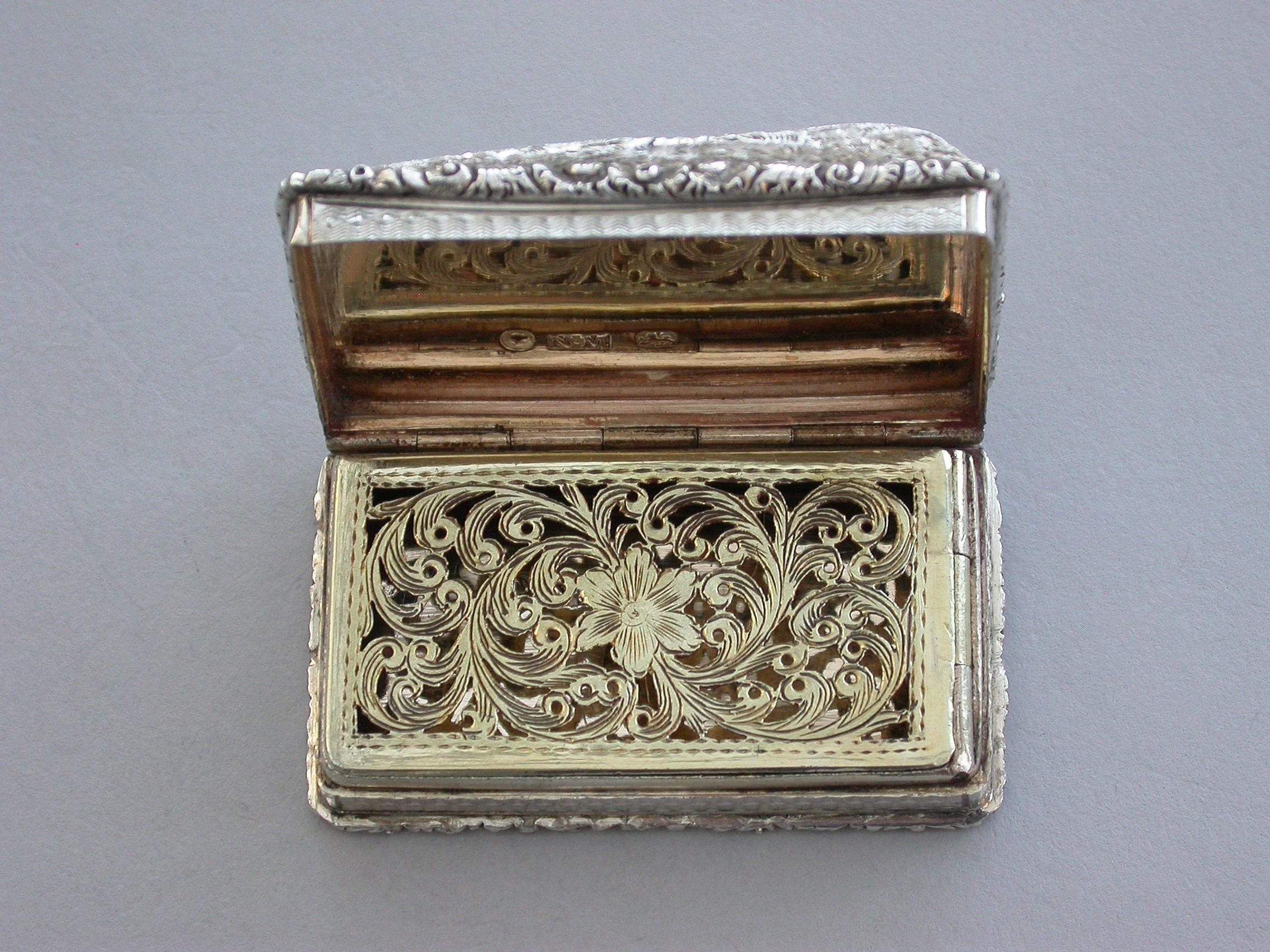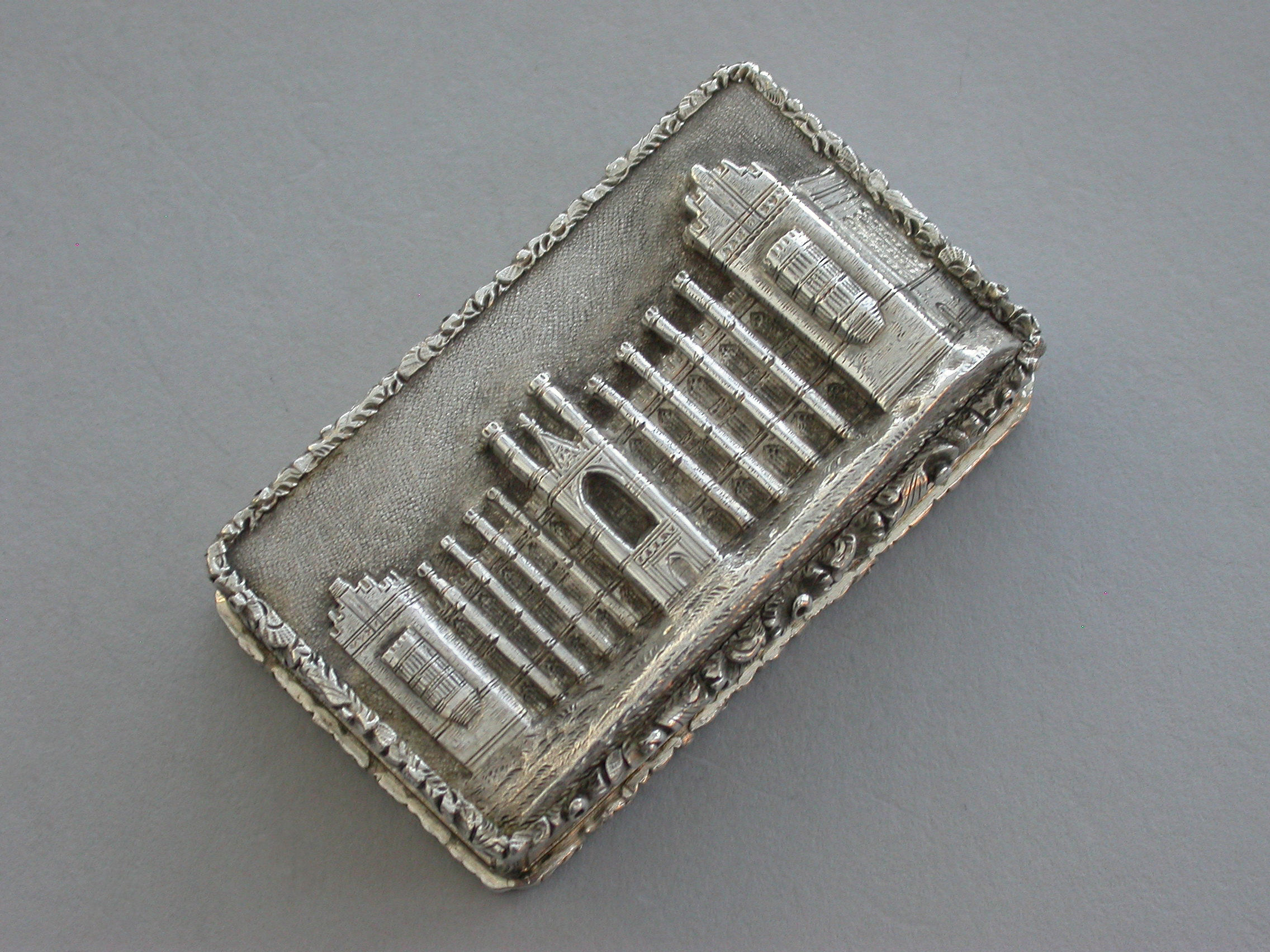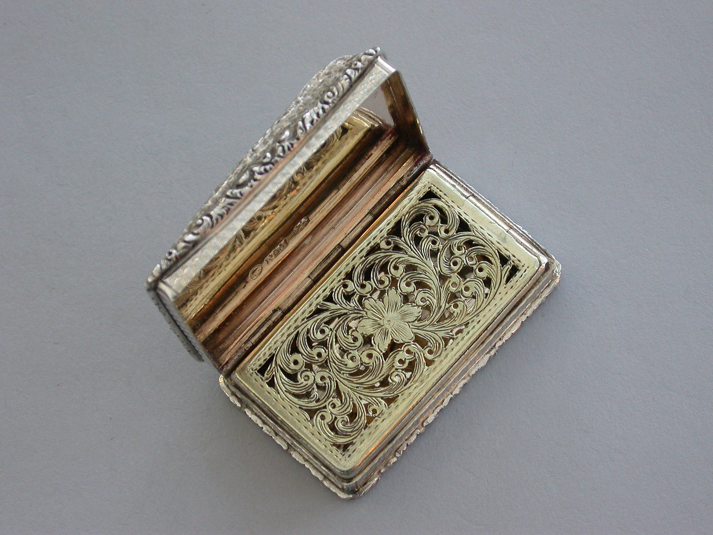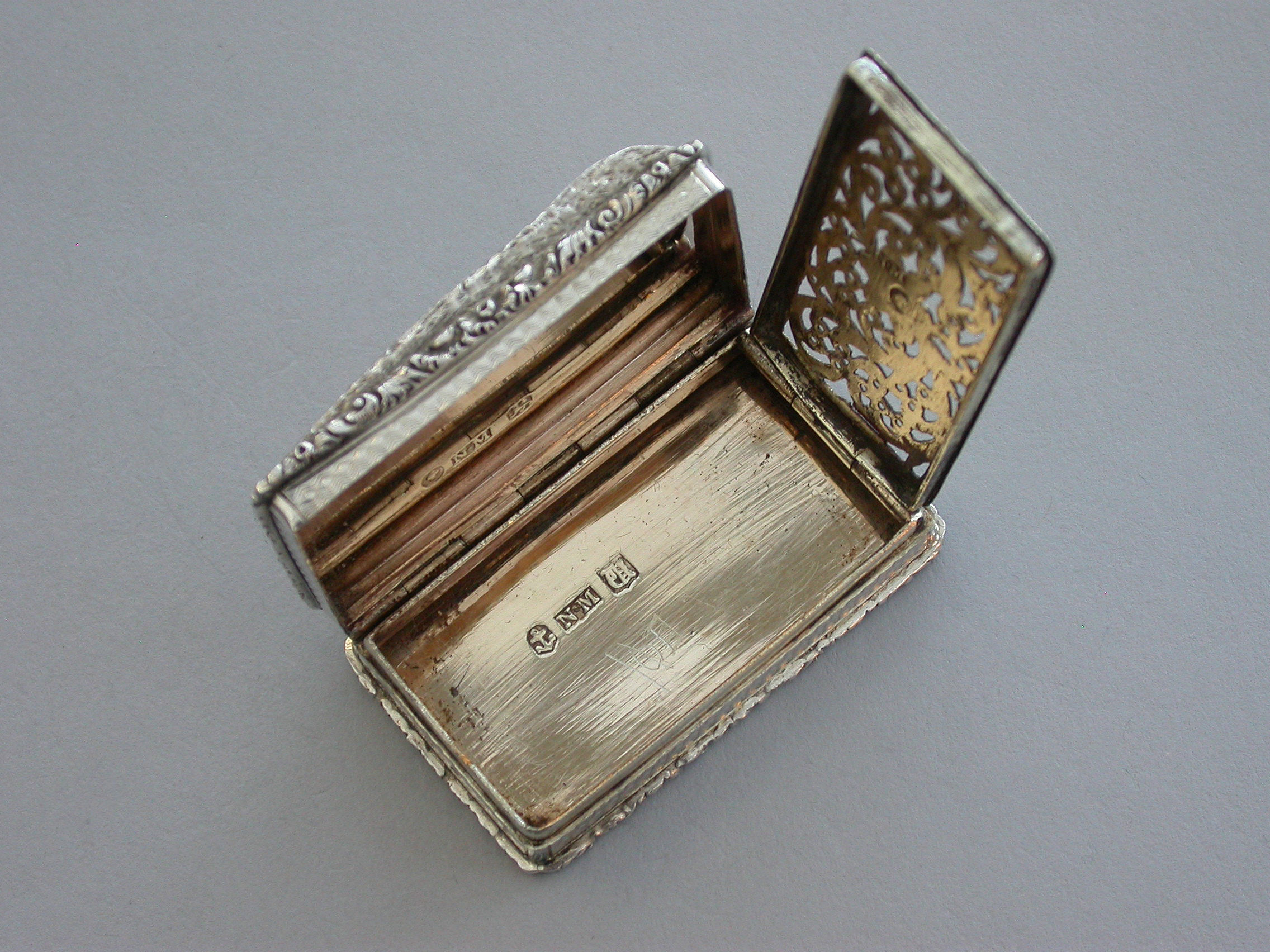 A fine and rare Victorian silver Castle-Top Vinaigrette, the base and sides with engine turned decoration and a shield-shaped vacant cartouche, the lid with raised scene depicting Liverpool Collegiate College in high relief on a textured ground. The silver gilt interior with hinged grille pierced with floral scrolls around a central flower head.