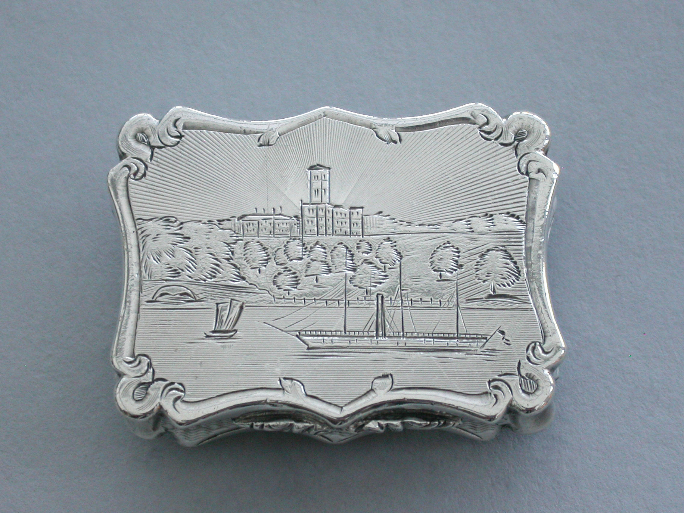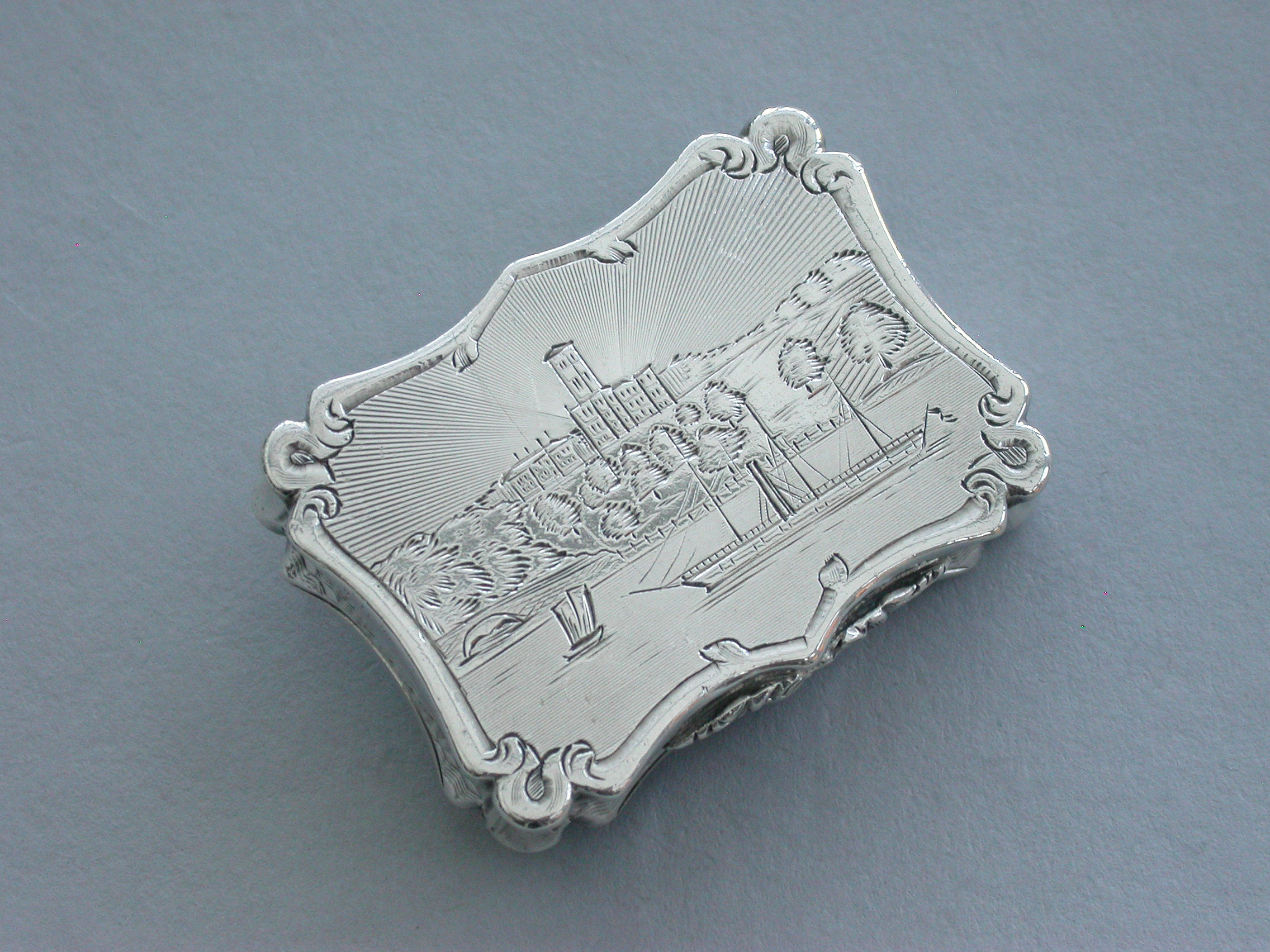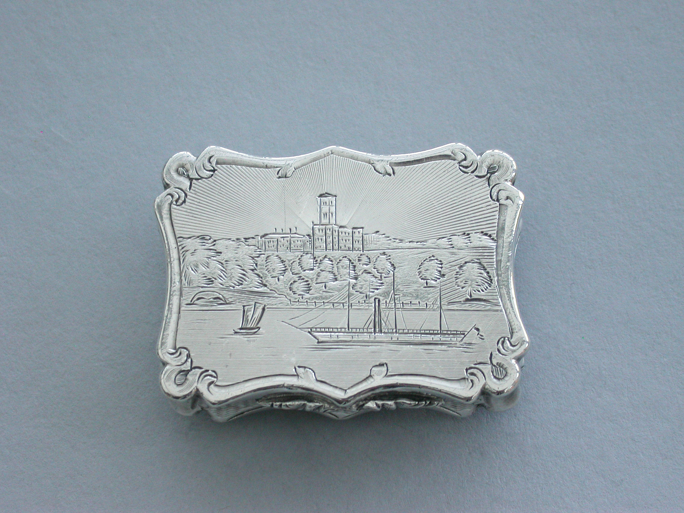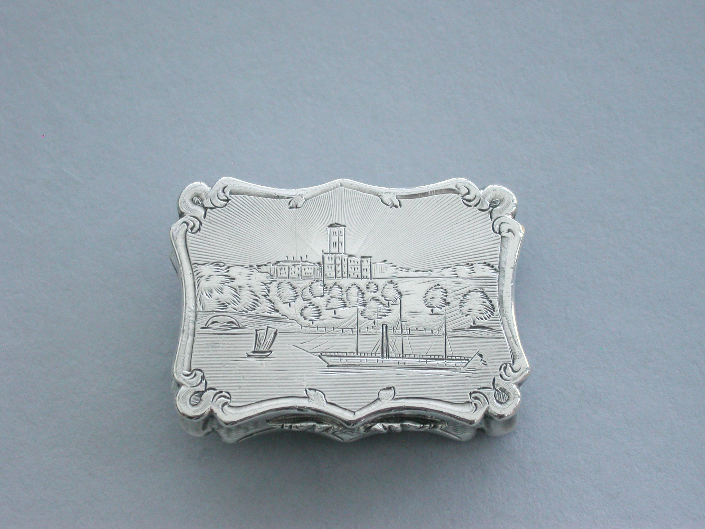 An extremely rare Victorian silver castle-top Vinaigrette of shaped rectangular form, the base with bands of engine turned decoration surrounding a shield shaped cartouche engraved with contemporary initials. The cover engraved with a scene depicting Osborne House in the Isle of Wight with the Royal Yacht Victoria and Albert at anchor in the foreground. The silver gilt grille pierced with scrolls.