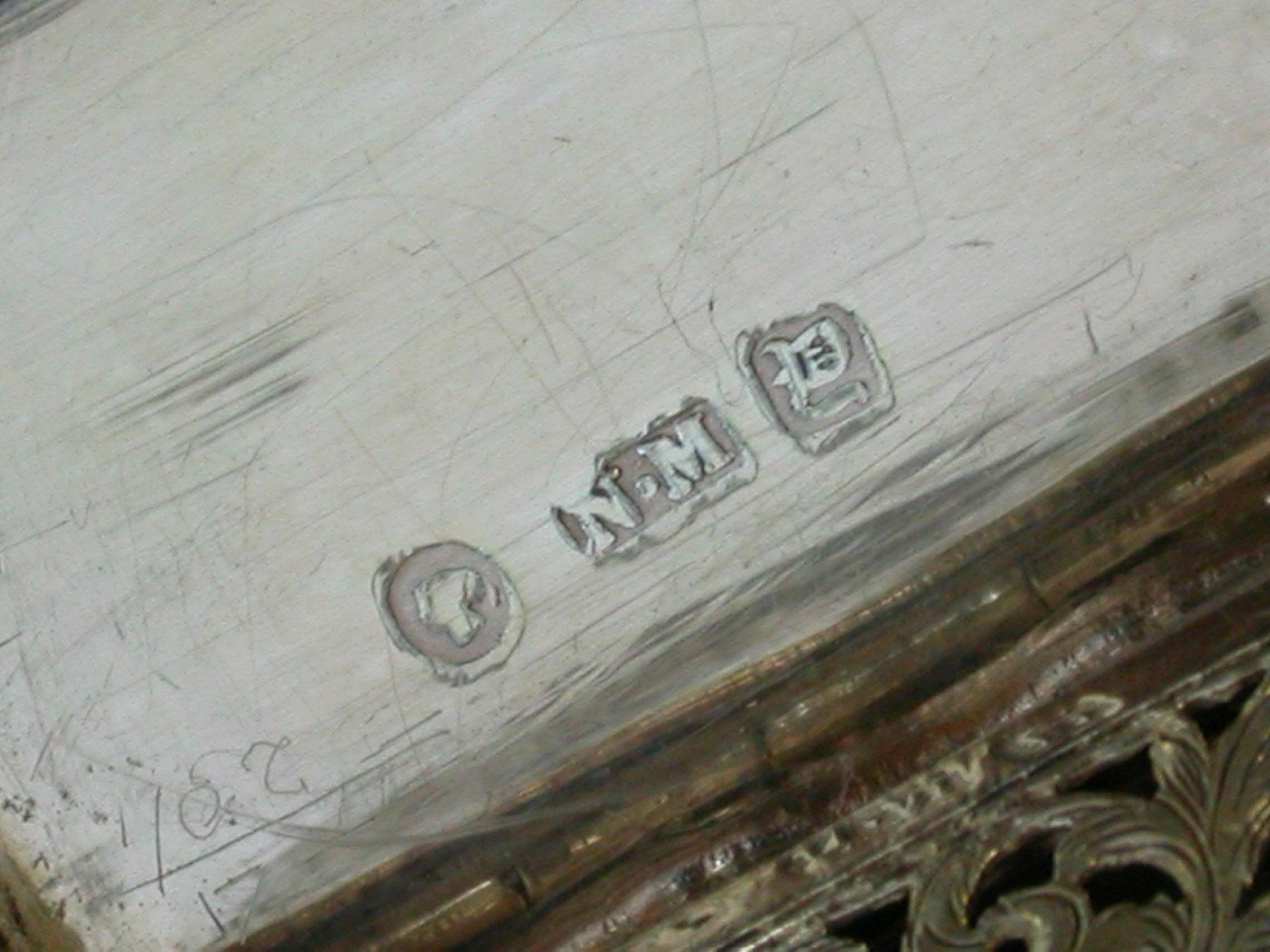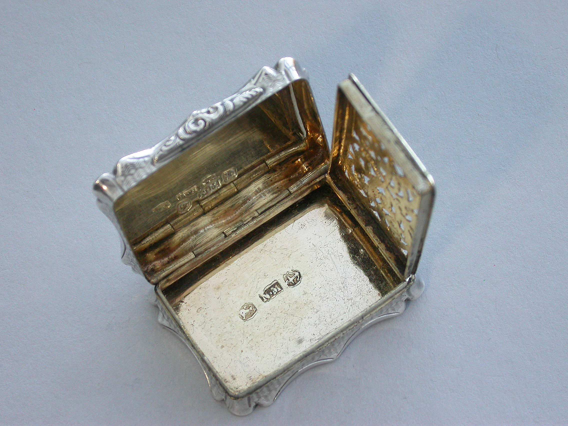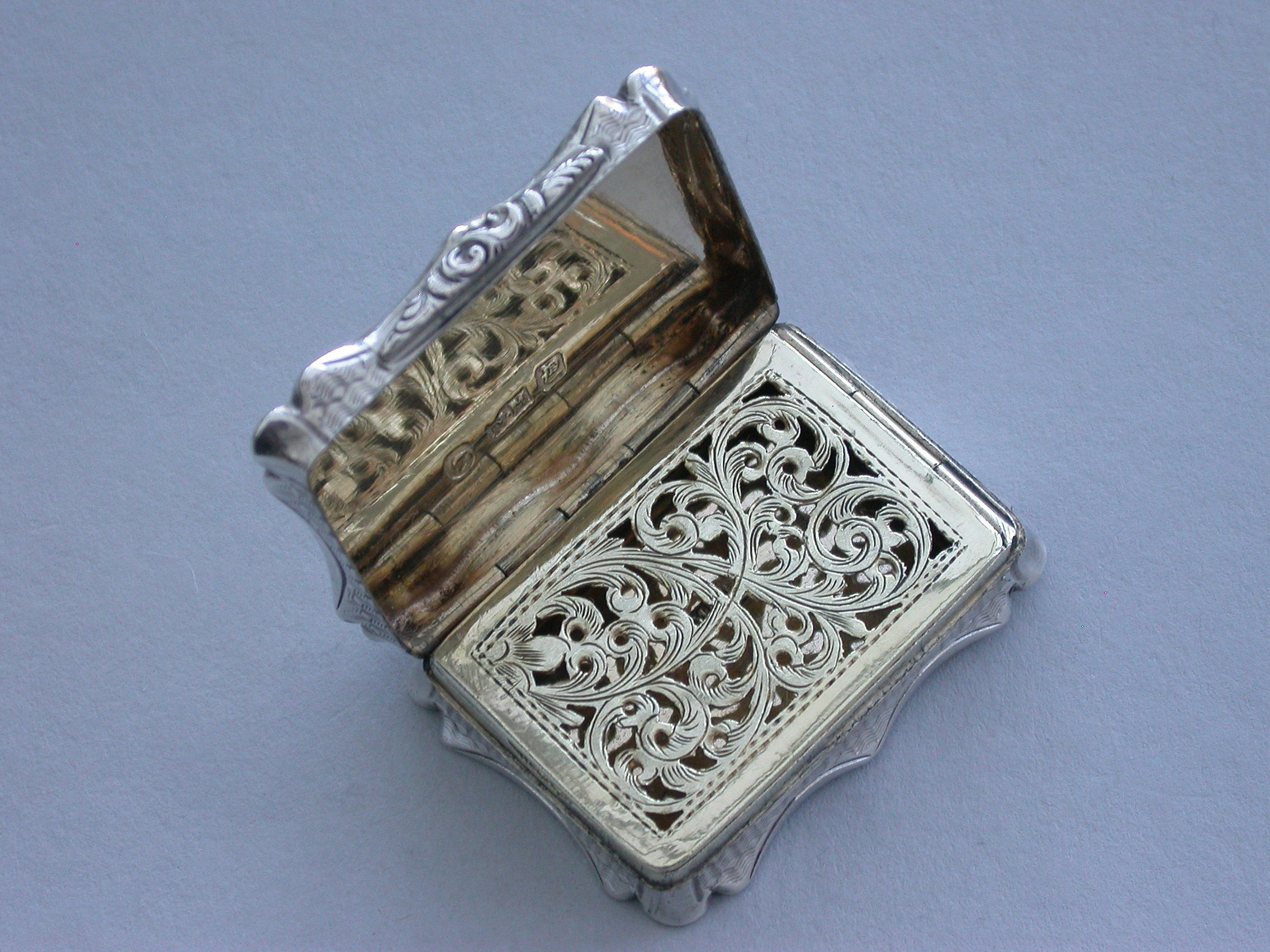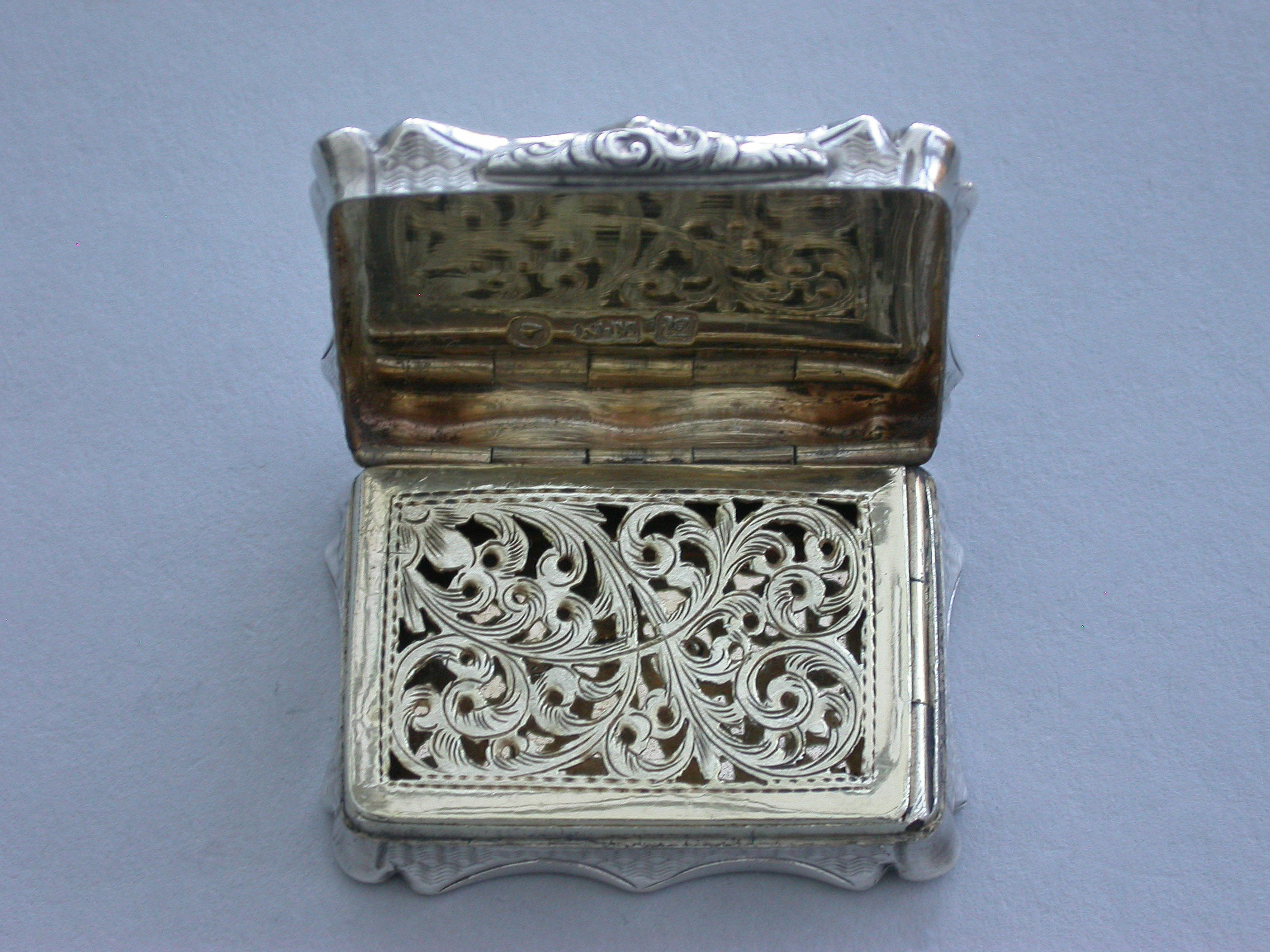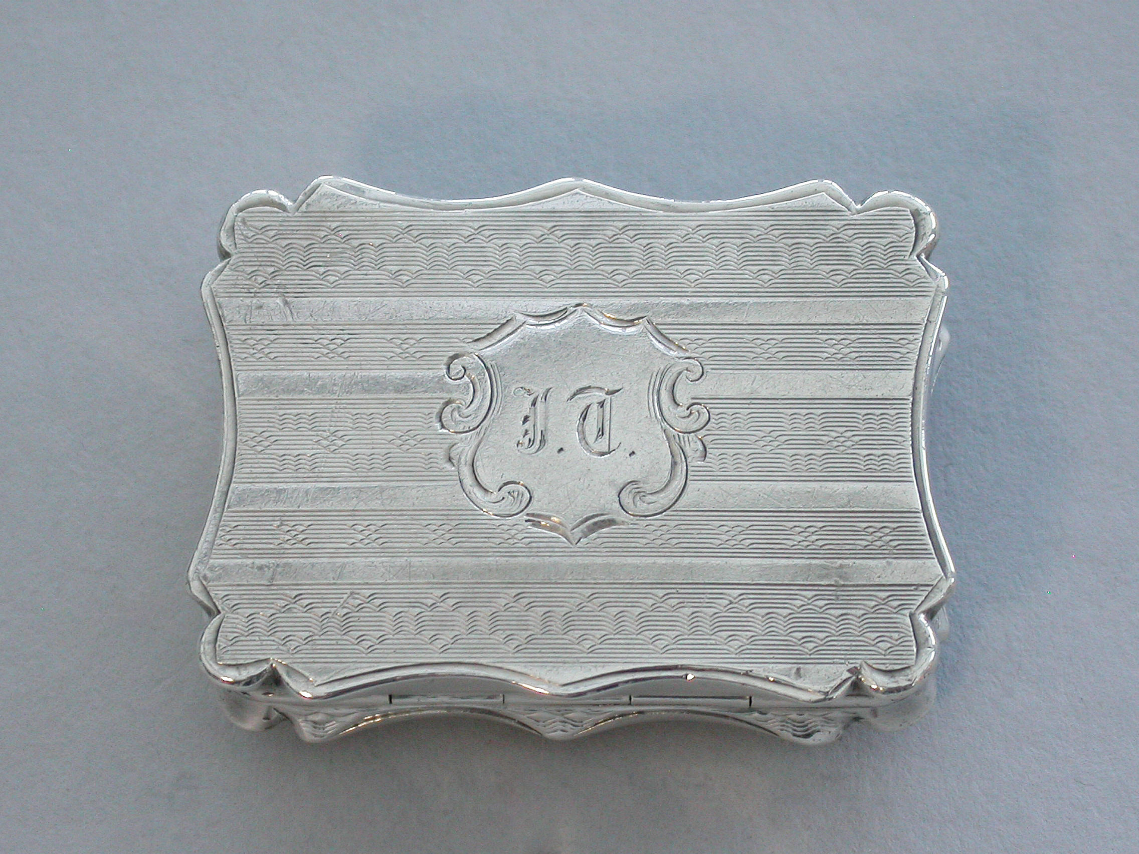 An extremely rare Victorian silver castle-top Vinaigrette of shaped rectangular form, the base with bands of engine turned decoration surrounding a shield shaped cartouche engraved with contemporary initials. The cover engraved with a scene depicting Osborne House in the Isle of Wight with the Royal Yacht Victoria and Albert at anchor in the foreground. The silver gilt grille pierced with scrolls.
