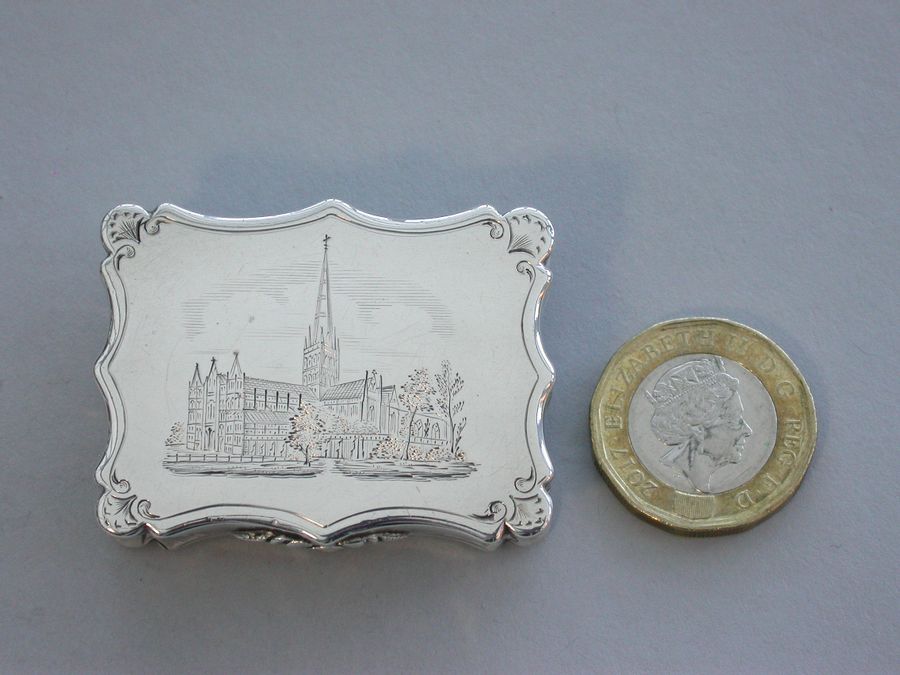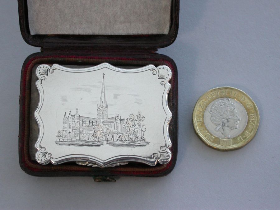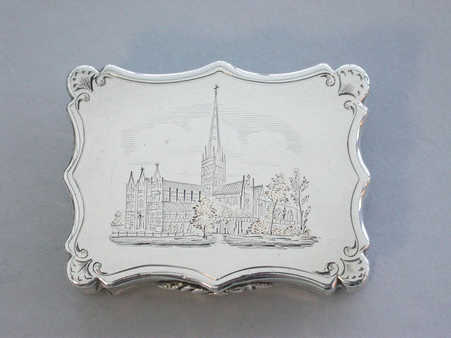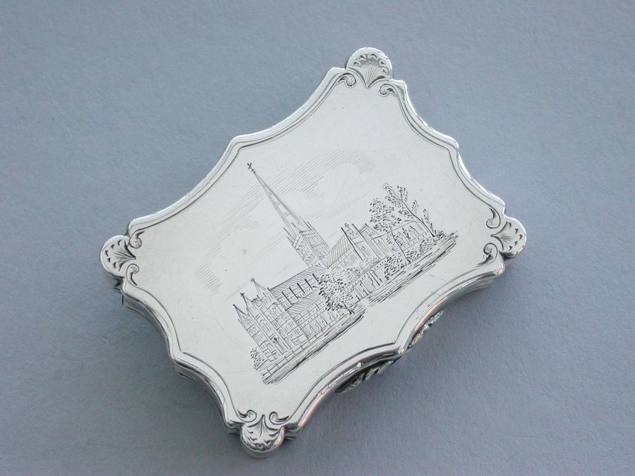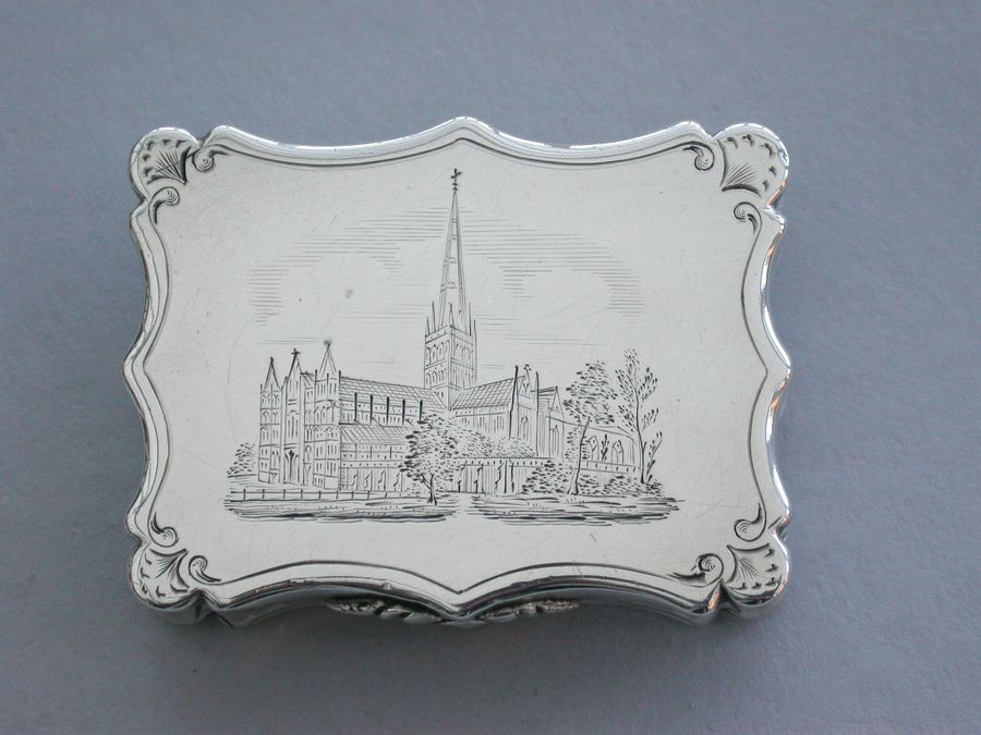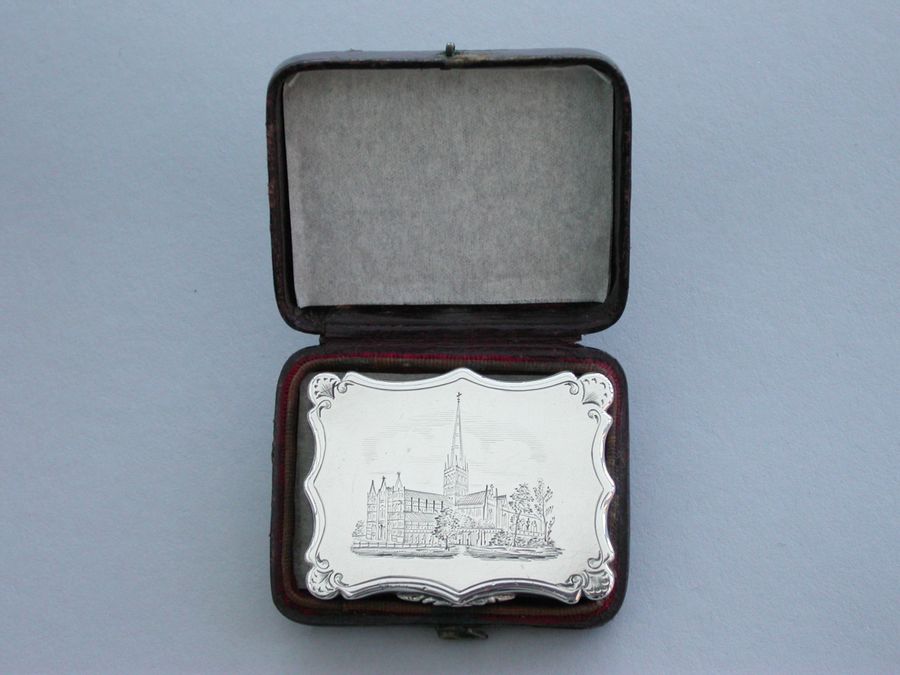 A rare Victorian silver castle-top Vinaigrette of large size and complete with original Morocco leather fitted case, of shaped rectangular form with engine turned decoration and a vacant cartouch to the base, the cover engraved with a view of Salisbury Cathedral within a border with stylised leaves at each corner. The silver gilt grille pierced with a flower head surrounded by scrolling leaves.