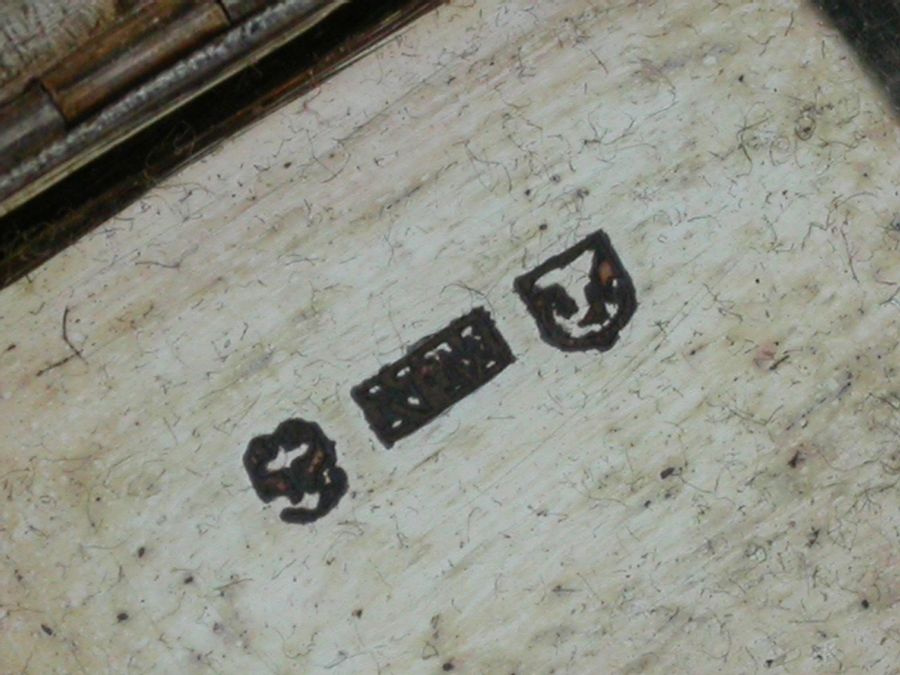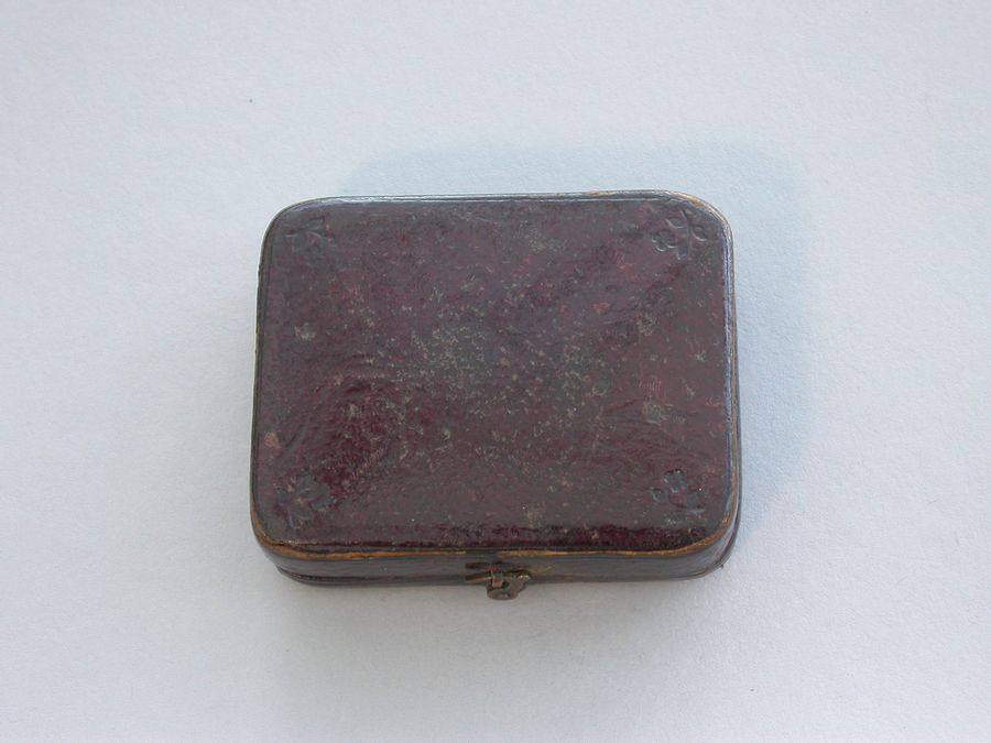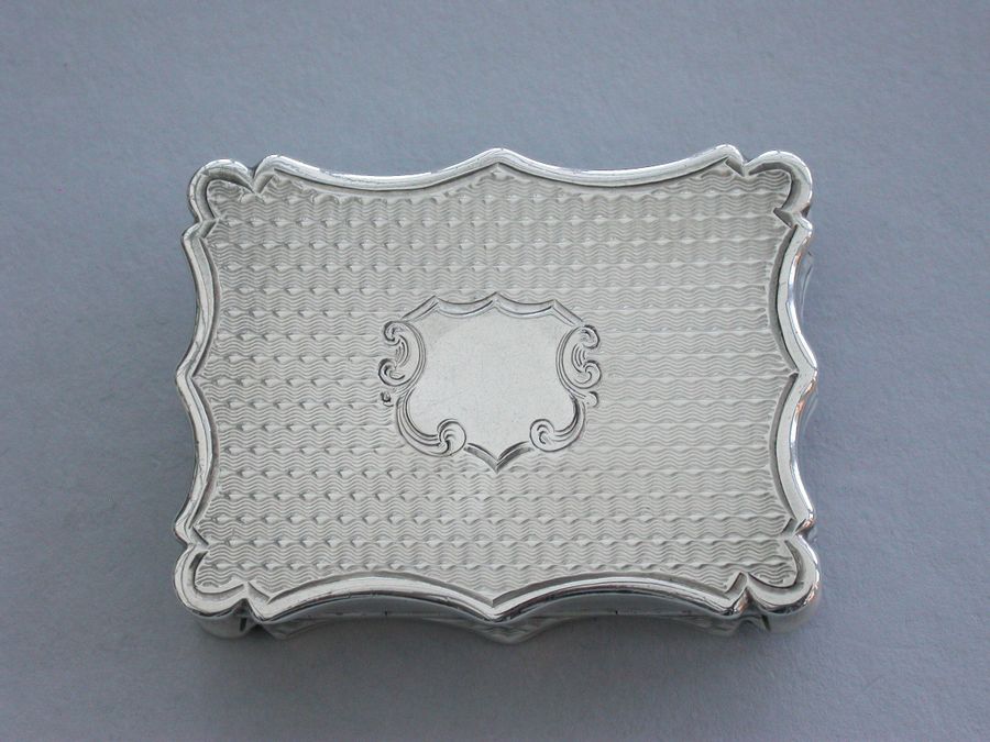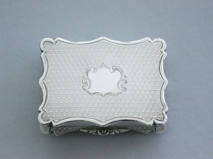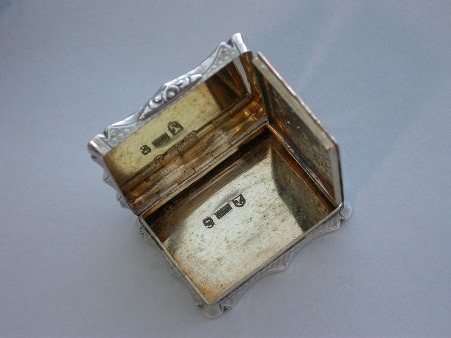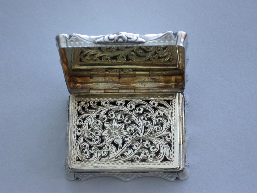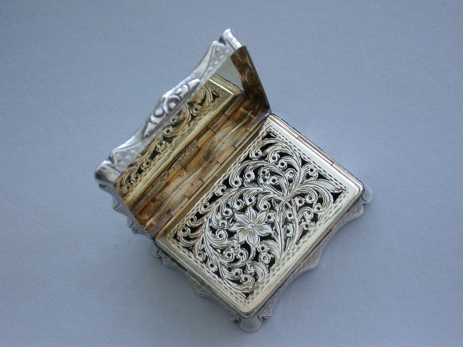 A rare Victorian silver castle-top Vinaigrette of large size and complete with original Morocco leather fitted case, of shaped rectangular form with engine turned decoration and a vacant cartouch to the base, the cover engraved with a view of Salisbury Cathedral within a border with stylised leaves at each corner. The silver gilt grille pierced with a flower head surrounded by scrolling leaves.